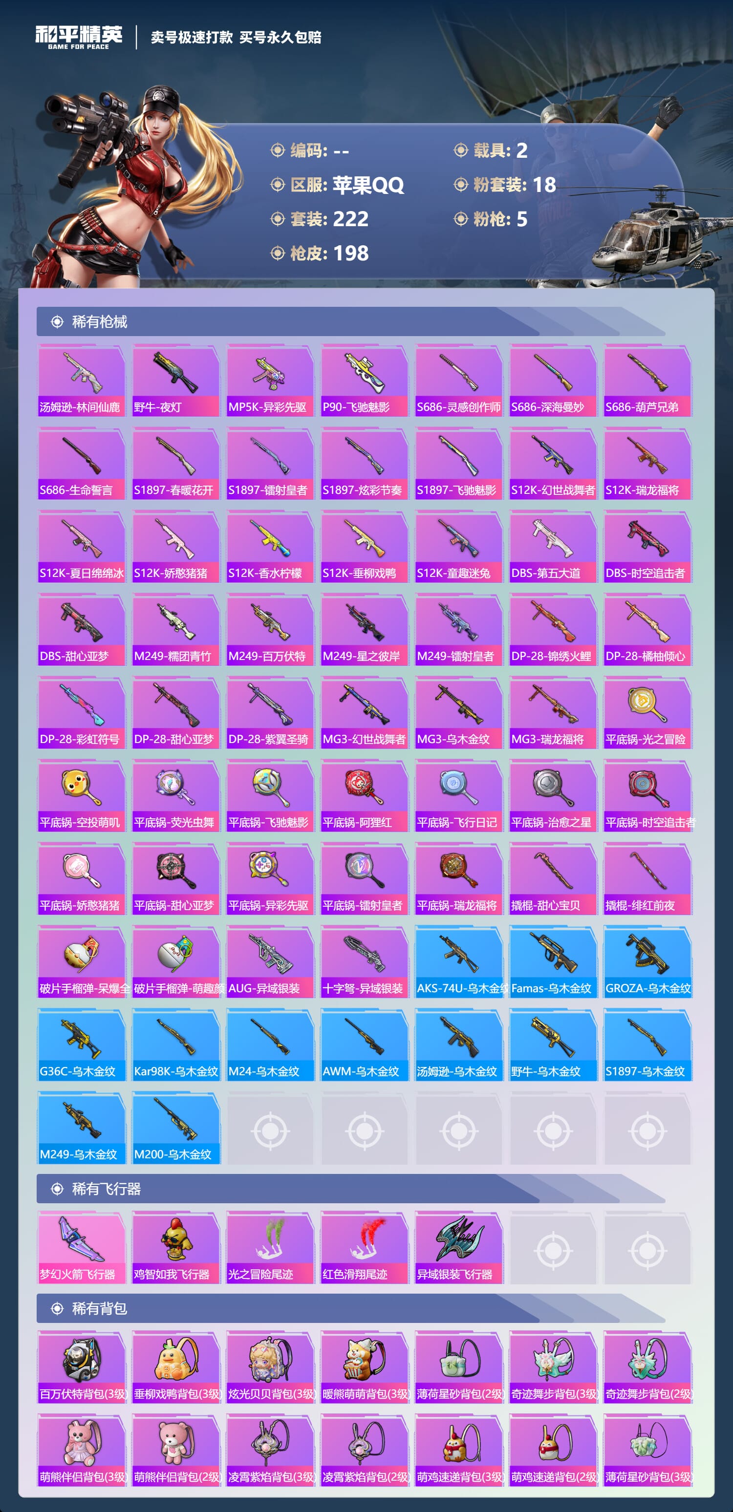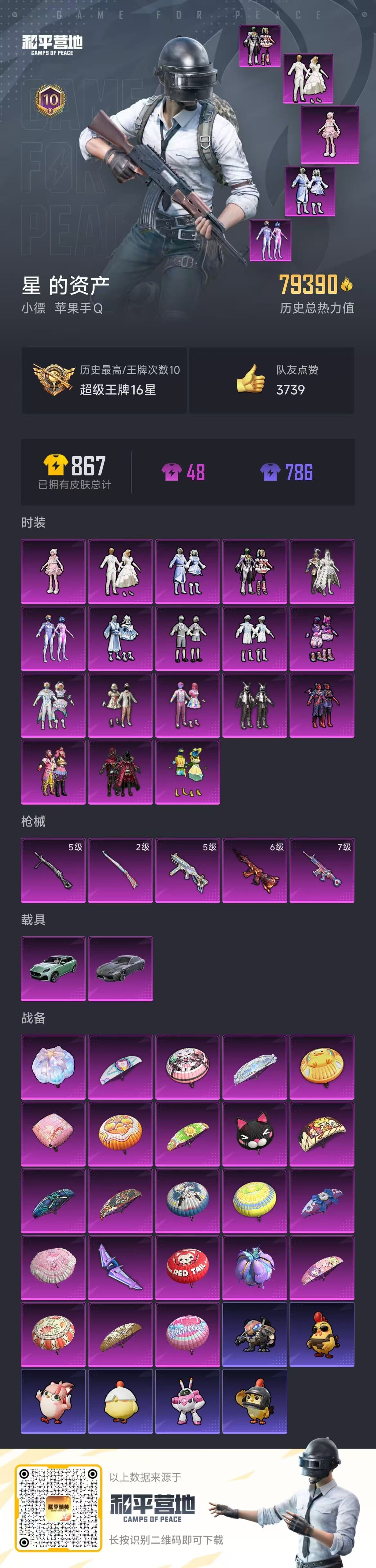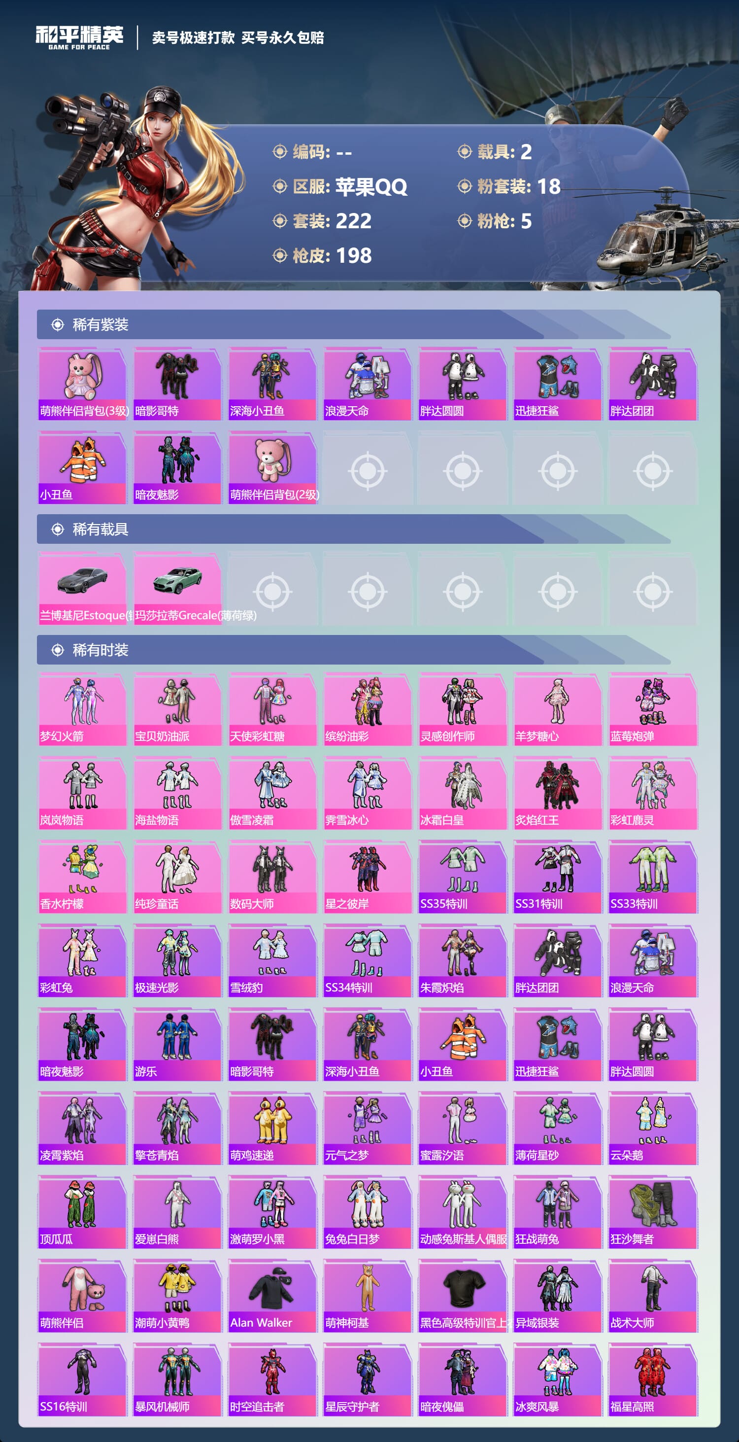 实名: 不可修改 时装数: 854 载具数: 2 呛械数: 199 战备数: 153 热门装扮: 梦幻火箭新101数码大师深海小丑鱼宝贝奶油派天使彩虹糖迅捷狂鲨鹰眼刺客缤纷油彩王子的夏天萌熊伴侣爱崽白熊香水柠檬炙焰红王冰霜白皇星之彼岸彩虹鹿灵蓝莓炮弹岚岚物语海