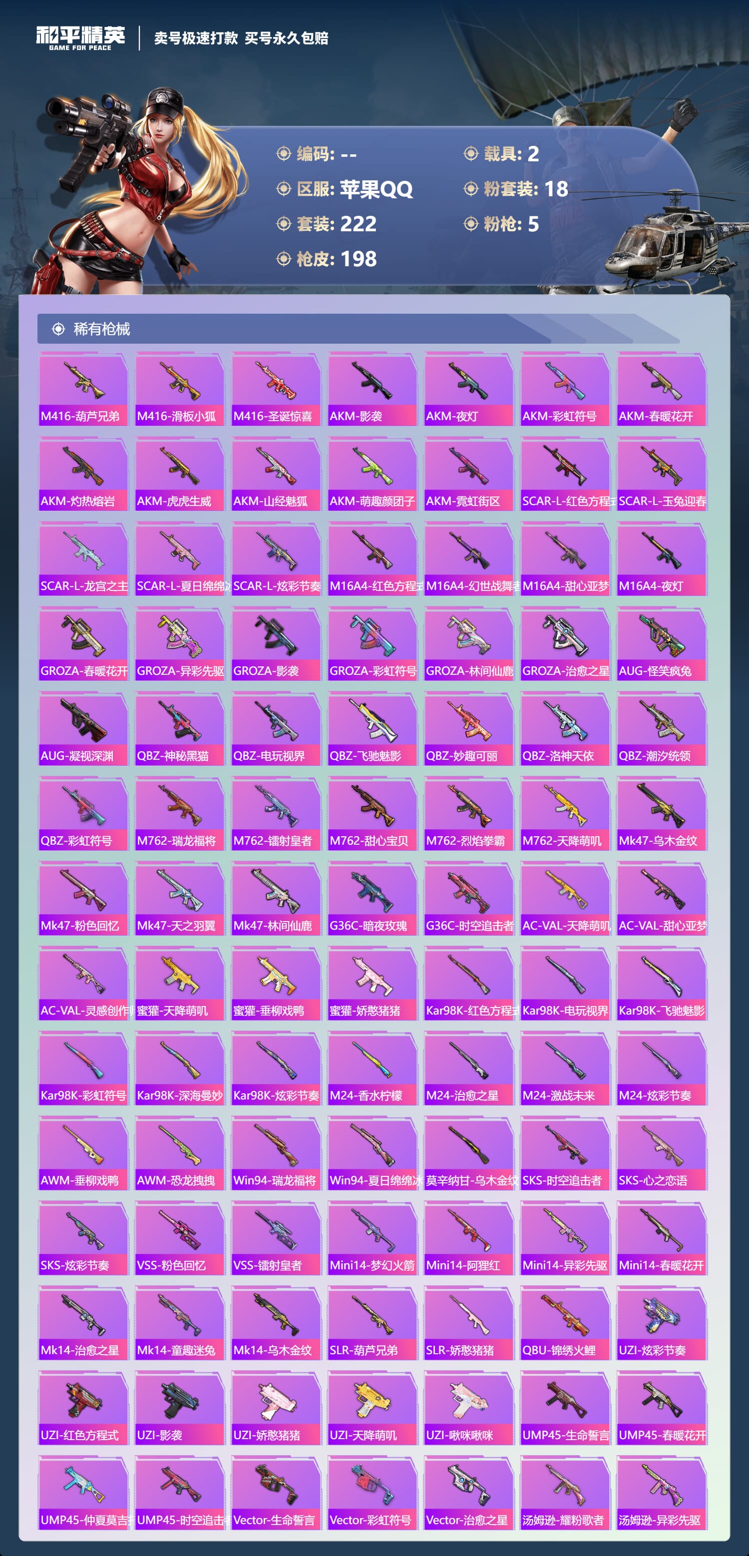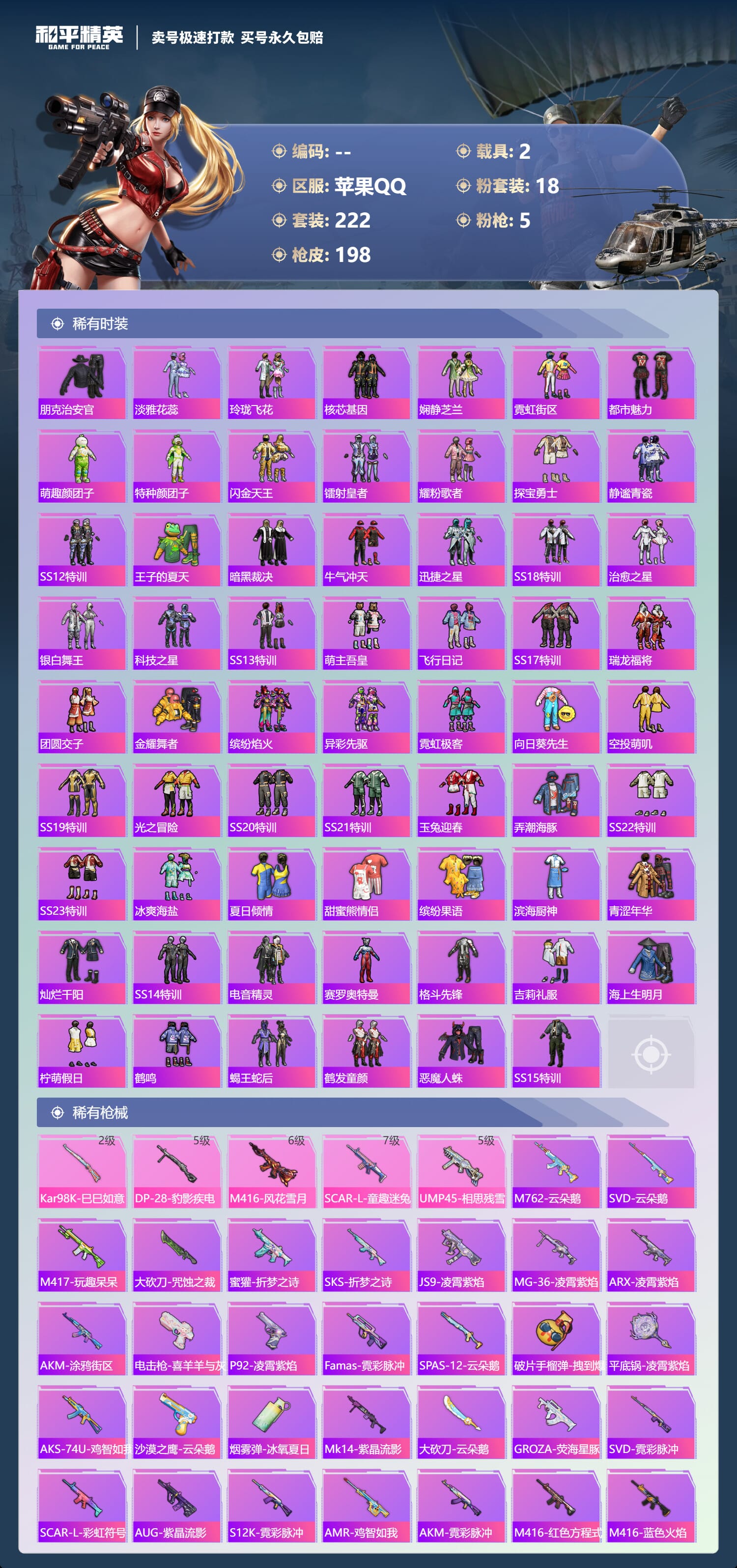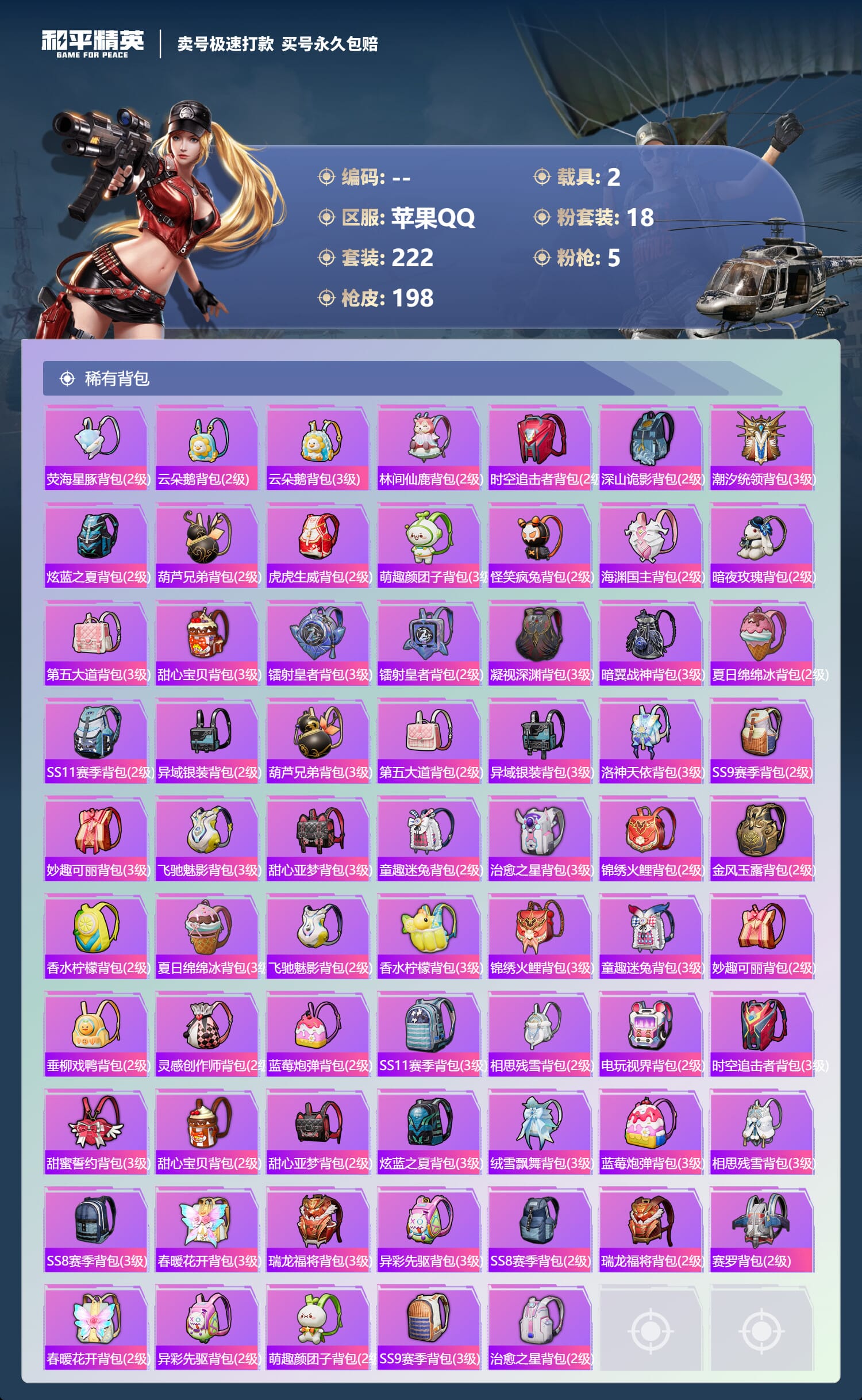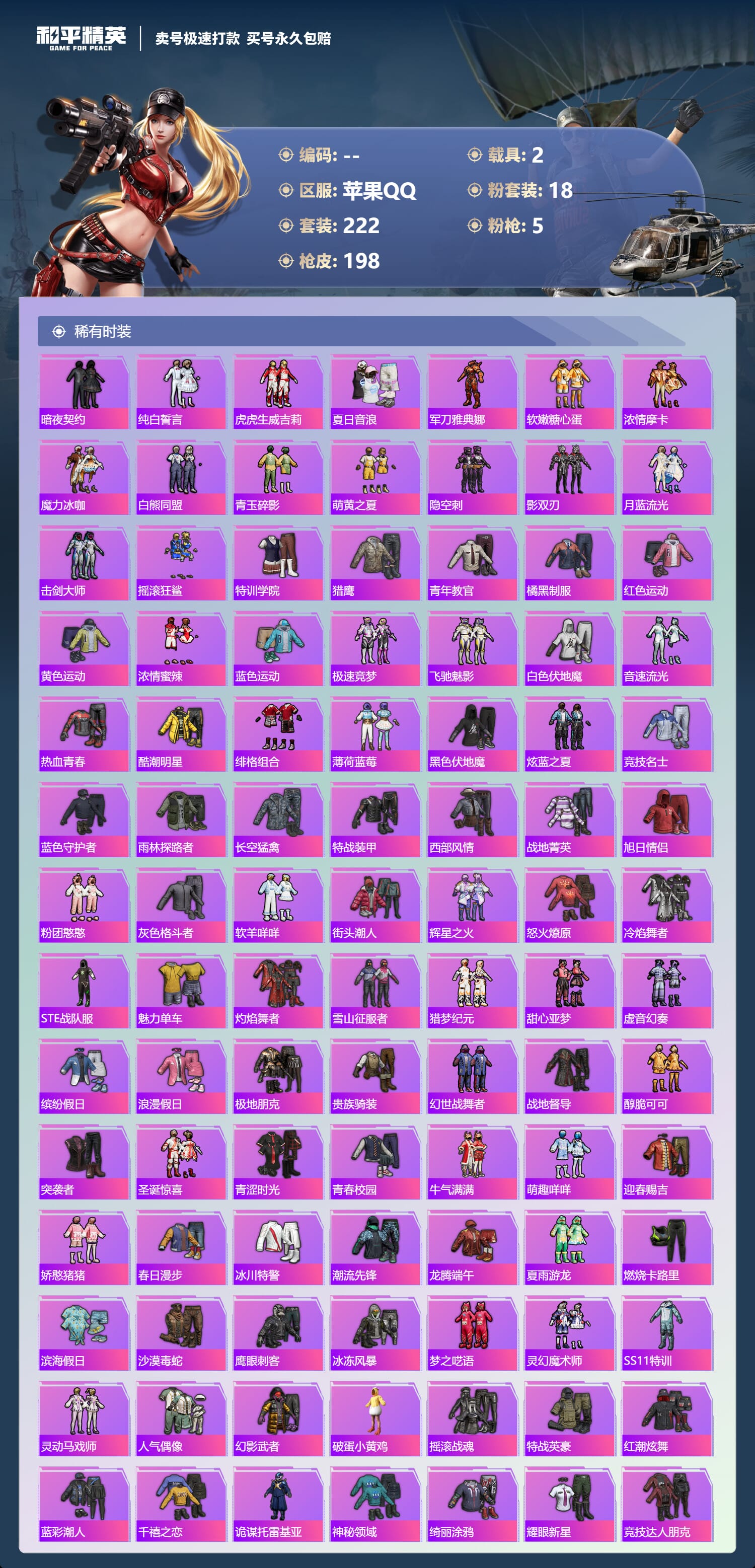 实名: 不可修改 时装数: 854 载具数: 2 呛械数: 199 战备数: 153 热门装扮: 梦幻火箭新101数码大师深海小丑鱼宝贝奶油派天使彩虹糖迅捷狂鲨鹰眼刺客缤纷油彩王子的夏天萌熊伴侣爱崽白熊香水柠檬炙焰红王冰霜白皇星之彼岸彩虹鹿灵蓝莓炮弹岚岚物语海