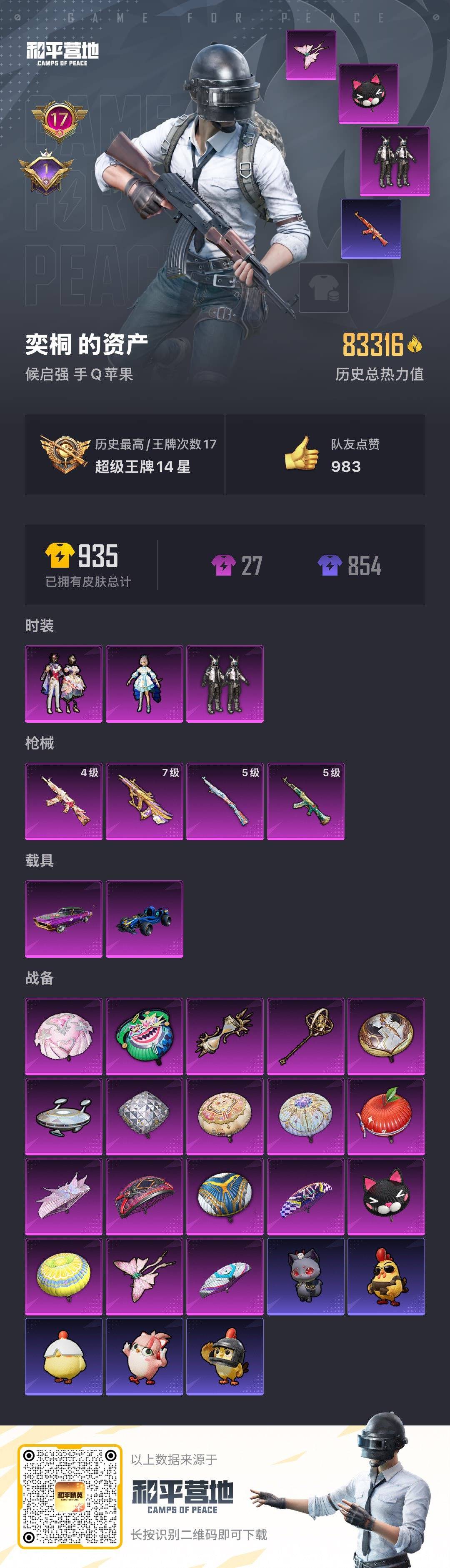 3粉装 4特效呛 2载具 17印记 可二次 可修改实名 【热门装扮】:奇异狩猎者星穹咏叹调洛天依数码大师神秘黑猫激萌罗小黑大橘为重梦魇先生暗夜魅影 【载具】:虚妄之影炫耀紫合金龙骨(蓝) 【稀有呛皮】:aug-圣斗士星矢aks-74u-星穹咏叹调kar98k-巳巳如意a
