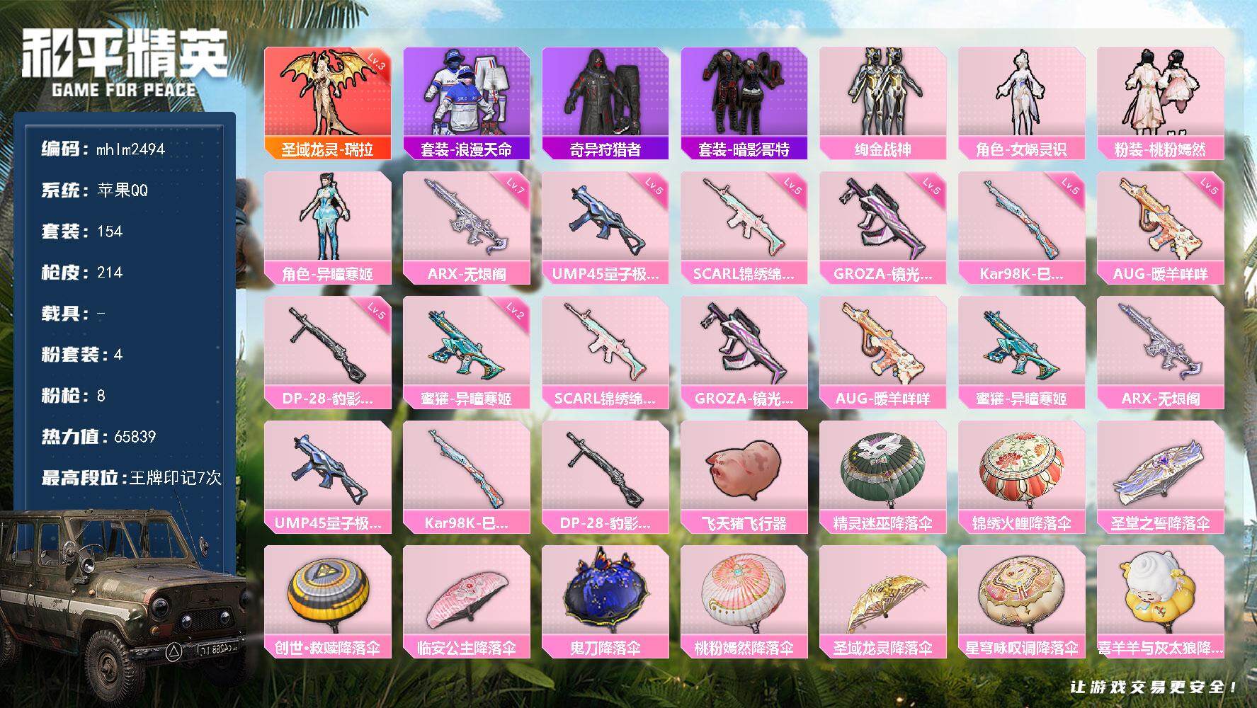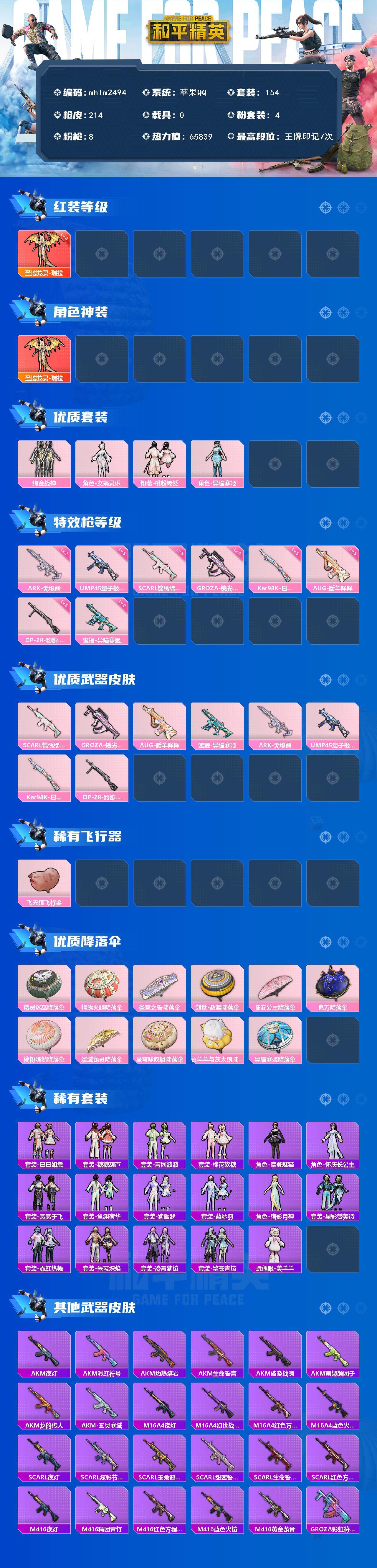 [14447770]【mhlm2494】苹果 手q-1神装-4粉装-8特效呛-0载具-2粉色飞行器-65839热力值-7王牌印记-154套装-214呛皮 【红色神装等级】:圣域龙灵-瑞拉三级 【红色角色神装】:圣域龙灵-瑞拉 【热门品类】:套装-浪漫天命,套装-奇异狩猎者,套装-暗影哥特 【粉色套装】:粉装-绚金战神,角色-女娲灵识,粉装-桃粉嫣然,角色-异瞳寒姬 【粉色呛皮等级】:scar-l-锦绣绵绵五级,groza-镜光银凌五级,aug-暖羊咩咩五级,蜜獾-异瞳寒姬二级,arx-无垠阁七级,ump45-量子极限五级,kar98k-巳巳如意五级,dp-28-豹影疾电五级 【粉色呛皮】:scar-l-锦绣绵绵,groza-镜光银凌,aug-暖羊咩咩,蜜獾-异瞳寒姬,arx-无垠阁,ump45-量子极限,kar98k-巳巳如意,dp-28-豹影疾电 【粉色飞行器】:飞天猪飞行器 【粉色降落伞】:精灵迷巫降落伞,锦绣火鲤降落伞,圣堂之誓降落伞,创世·救赎降落伞,临安公主降落伞,鬼刀降落伞,桃粉嫣然降落伞,圣域龙灵降落伞,星穹咏叹调降落伞,喜羊羊与灰太狼降落伞,异瞳寒姬降落伞 【稀有套装】:套装-巳巳如意,套装-糖糖葫芦,套装-青团波波,套装-棉花软糖,角色-摩登魅猫,角色-怀庆长公主,套装-燕燕于飞,套装-鱼渊荷华,套装-紫幽梦,套装-蓝冰羽,角色-猎影月神,套装-星影赞美诗,套装-霓虹热舞,套装-朱霞炽焰,套装-凌霄紫焰,套装-擎苍青焰,玩偶服-美羊羊,套装-炫彩糖果 【稀有呛皮】:aug-冰晶雪宝,akm-夜灯,akm-彩虹符号,akm-灼热熔岩,akm-生命誓言,akm-破晓战魂,akm-萌趣颜团子,akm-龙的传人,akm-玄冥寒域,m16a4-夜灯,m16a4-幻世战舞者,m16a4-红色方程式,m16a4-蓝色火焰,scar-l-夜灯,scar-l-炫彩节奏,scar-l-玉兔迎春,scar-l-甜蜜誓约,scar-l-生命誓言,scar-l-红色方程式,m416-夜灯,m416-糯团青竹,m416-红色方程式,m416-蓝色火焰,m416-黄金龙骨,groza-彩虹符号,groza-影袭,aug-天降萌叽,aug-耀粉歌者,aug-青春冒险家,q-彩虹符号,m762-天降萌叽,m762-牛气冲天,m762-镭射皇者,g36c-桃粉嫣
