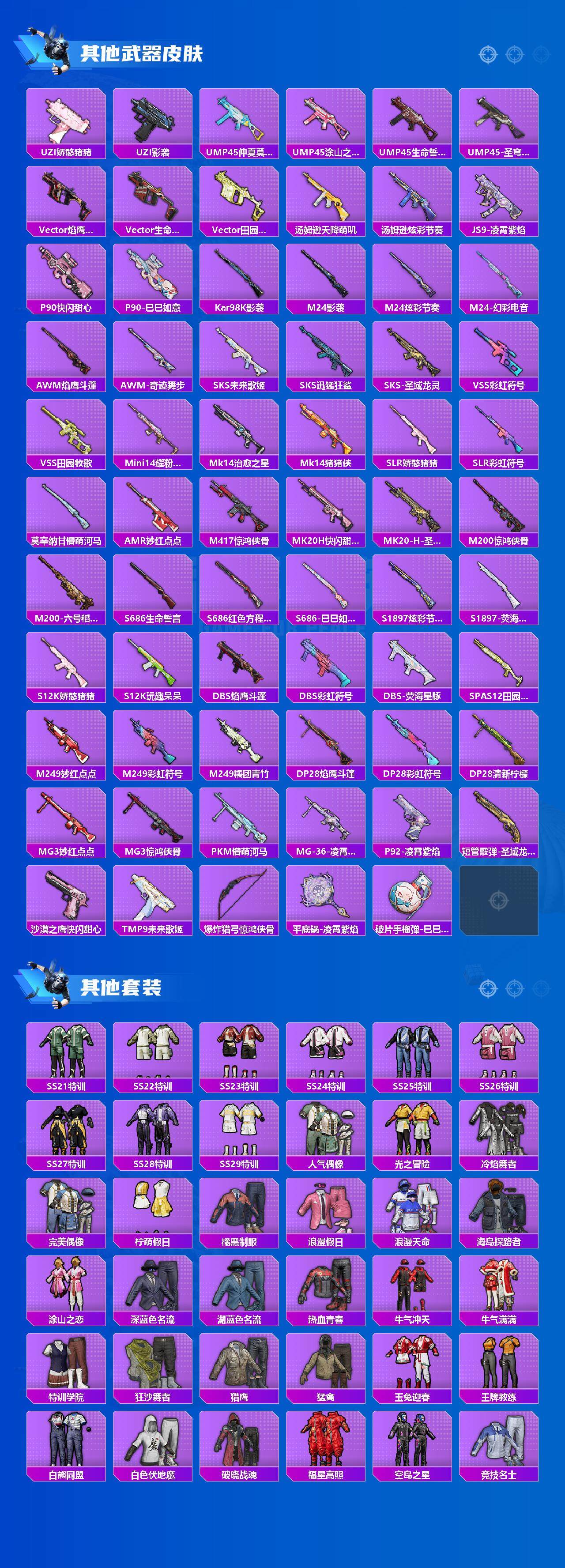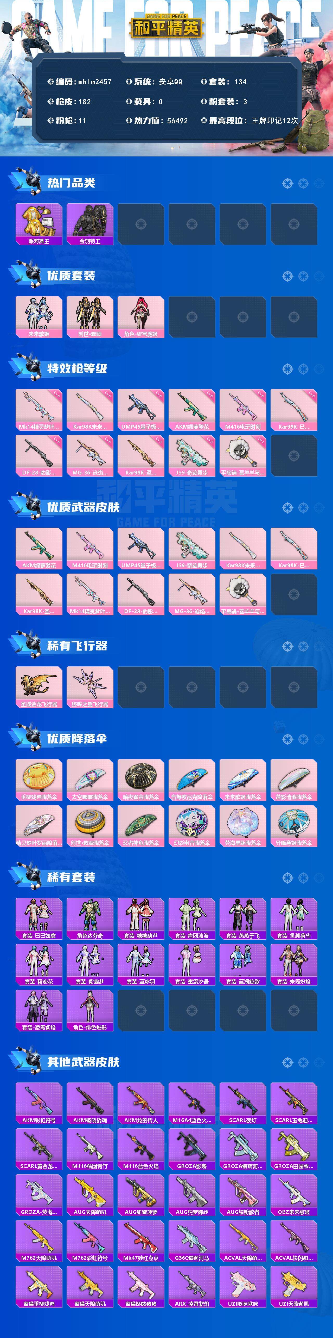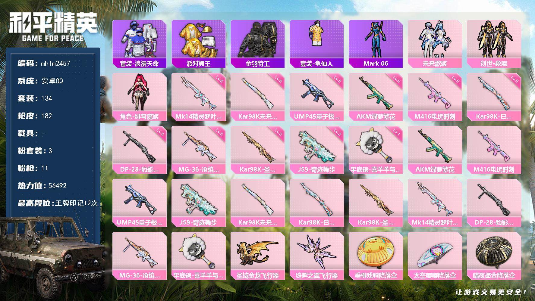 [14270033]【mhlm2457】安卓 手q-3粉装-11特效呛-0载具-2粉色飞行器-56492热力值-12王牌印记-134套装-182呛皮 【热门品类】:套装-浪漫天命,套装-派对舞王,套装-金羽特工,套装-龟仙人,角色-mark.06 【粉色套装】:粉装-未来歌姬,套装-创世·救赎,角色-绯穹魔姬 【粉色呛皮等级】:akm-绿萝繁花五级,m416-电玩时刻五级,ump45-量子极限五级,js9-奇迹舞步三级,kar98k-未来歌姬六级,kar98k-巳巳如意五级,kar98k-圣域龙灵三级,mk14-精灵梦叶罗丽六级,dp-28-豹影疾电五级,mg-36-沧焰双生五级,平底锅-喜羊羊与灰太狼一级 【粉色呛皮】:akm-绿萝繁花,m416-电玩时刻,ump45-量子极限,js9-奇迹舞步,kar98k-未来歌姬,kar98k-巳巳如意,kar98k-圣域龙灵,mk14-精灵梦叶罗丽,dp-28-豹影疾电,mg-36-沧焰双生,平底锅-喜羊羊与灰太狼 【粉色飞行器】:圣域金龙飞行器,终晖之翼飞行器 【粉色降落伞】:垂柳戏鸭降落伞,太空嘟嘟降落伞,暗夜鎏金降落伞,音爆索尼克降落伞,未来歌姬降落伞,莲影清波降落伞,精灵梦叶罗丽降落伞,创世·救赎降落伞,忍者神龟降落伞,幻彩电音降落伞,荧海星豚降落伞,异瞳寒姬降落伞 【稀有套装】:套装-龟仙人,套装-巳巳如意,角色-达芬奇,套装-糖糖葫芦,套装-青团波波,套装-燕燕于飞,套装-鱼渊荷华,套装-粉恋花,套装-紫幽梦,套装-蓝冰羽,套装-蜜露汐语,套装-蓝海鲸歌,套装-朱霞炽焰,套装-凌霄紫焰,角色-绯色魅影 【稀有呛皮】:akm-彩虹符号,akm-破晓战魂,akm-龙的传人,m16a4-蓝色火焰,scar-l-夜灯,scar-l-玉兔迎春,scar-l-黄金龙骨,m416-糯团青竹,m416-蓝色火焰,groza-影袭,groza-懵萌河马,groza-田园牧歌,groza-荧海星豚,aug-天降萌叽,aug-甜蜜菠萝,aug-纯梦嫁纱,aug-耀粉歌者,q-未来歌姬,m762-天降萌叽,m762-彩虹符号,mk47-妙红点点,g36c-懵萌河马,ac-val-天降萌叽,ac-val-快闪甜心,蜜獾-垂柳戏鸭,蜜獾-天降萌叽,蜜獾-娇憨猪猪,arx-凌霄紫焰,uzi-啾咪啾咪,uzi-天