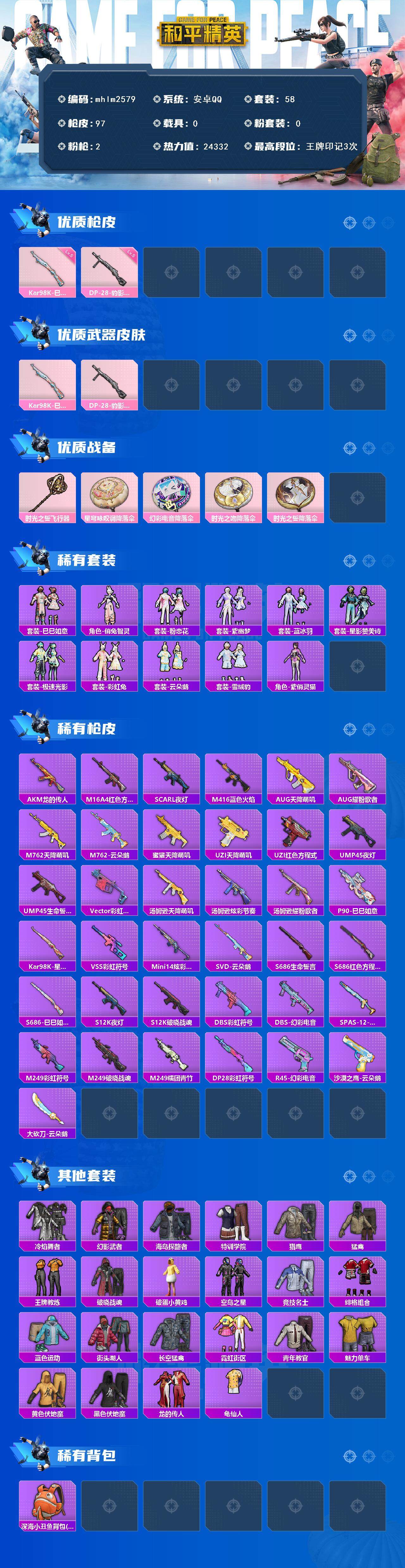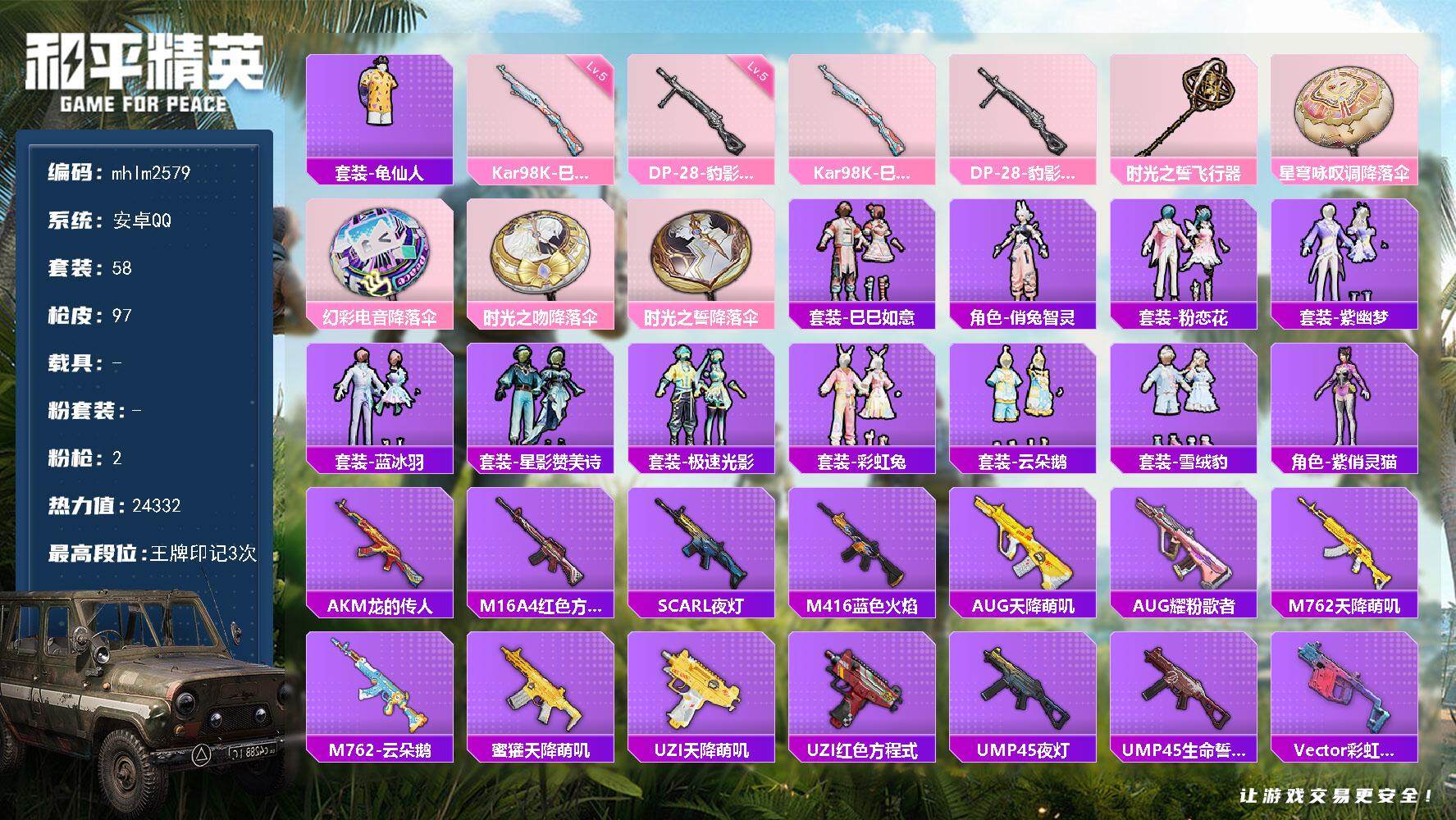 [14475123]【mhlm2579】安卓 手q-0粉装-2特效呛-0载具-1粉色飞行器-24332热力值-3王牌印记-58套装-97呛皮 【热门品类】:套装-龟仙人 【粉色呛皮等级】:kar98k-巳巳如意五级,dp-28-豹影疾电五级 【粉色呛皮】:kar98k-巳巳如意,dp-28-豹影疾电 【粉色飞行器】:时光之誓飞行器 【粉色降落伞】:星穹咏叹调降落伞,幻彩电音降落伞,时光之吻降落伞,时光之誓降落伞 【稀有套装】:套装-龟仙人,套装-巳巳如意,角色-俏兔智灵,套装-粉恋花,套装-紫幽梦,套装-蓝冰羽,套装-星影赞美诗,套装-极速光影,套装-彩虹兔,套装-云朵鹅,套装-雪绒豹,角色-紫俏灵猫 【稀有呛皮】:akm-龙的传人,m16a4-红色方程式,scar-l-夜灯,m416-蓝色火焰,aug-天降萌叽,aug-耀粉歌者,m762-天降萌叽,m762-云朵鹅,蜜獾-天降萌叽,uzi-天降萌叽,uzi-红色方程式,ump45-夜灯,ump45-生命誓言,vect-彩虹符号,汤姆逊-天降萌叽,汤姆逊-炫彩节奏,汤姆逊-耀粉歌者,p90-巳巳如意,kar98k-星穹咏叹调,vss-彩虹符号,mini14-炫彩节奏,svd-云朵鹅,s686-生命誓言,s686-红色方程式,s686-巳巳如意,s12k-破晓战魂,s12k-夜灯,dbs-彩虹符号,dbs-幻彩电音,spas-12-云朵鹅,m249-彩虹符号,m249-破晓战魂,m249-糯团青竹,dp-28-彩虹符号,r45-幻彩电音,沙墨之鹦-云朵鹅,大砍刀-云朵鹅 【其他套装】:套装-冷焰舞者,套装-幻影武者,套装-海岛探路者,套装-特训学院,套装-猎鹰,套装-猛禽,套装-王牌教练,套装-破晓战魂,套装-破蛋小黄鸡,套装-空岛之星,套装-竞技名士,套装-绯格组合,套装-蓝色运动,套装-街头潮人,套装-长空猛禽,套装-霓虹街区,套装-青年教官,套装-魅力单车,套装-黄色伏地魔,套装-黑色伏地魔,套装-龙的传人,套装-龟仙人 【稀有背包】:深海小丑鱼背包3级 【营地id】:1006752597