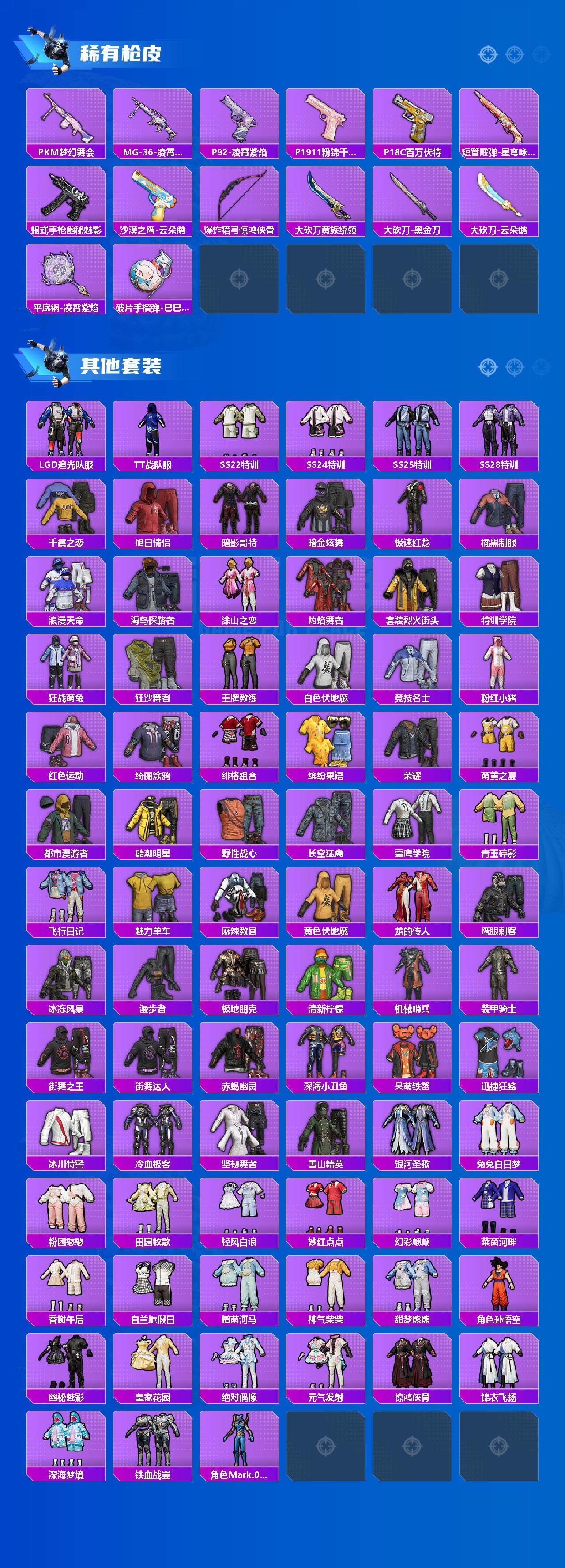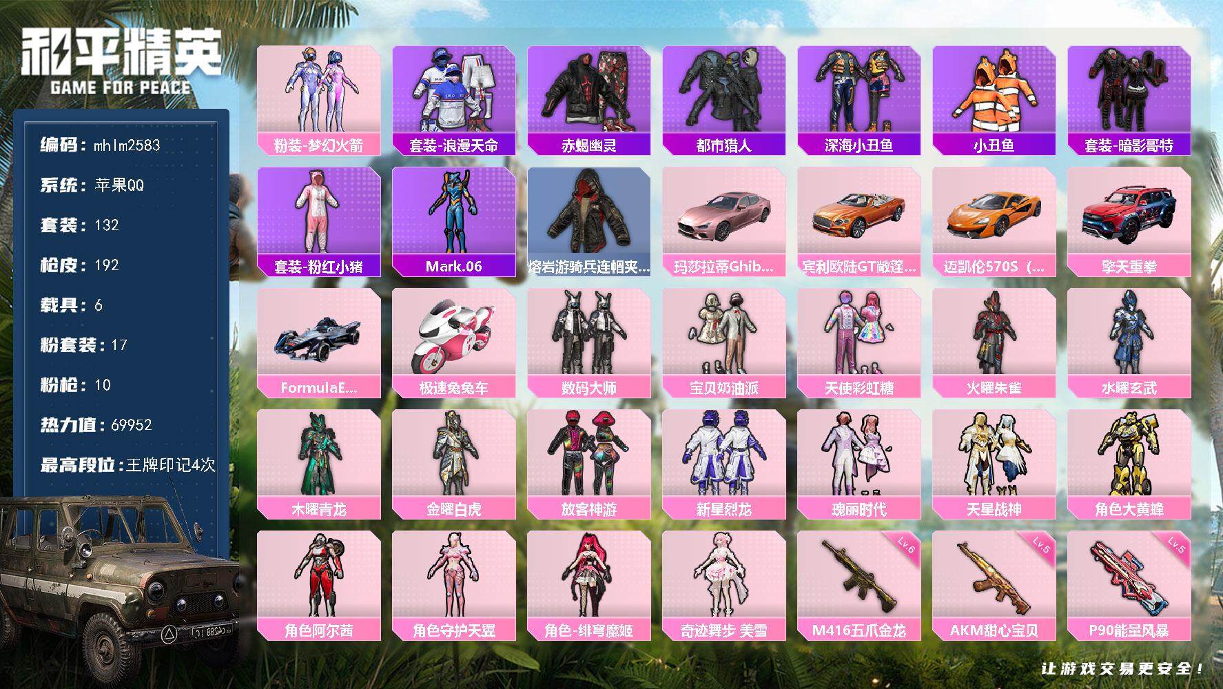 [14475217]【mhlm2583】苹果 手q-17粉装-10特效呛-6载具-5粉色飞行器-69952热力值-4王牌印记-132套装-192呛皮 【热门品类】:粉装-梦幻火箭,套装-浪漫天命,套装-赤蝎幽灵,套装-都市猎人,套装-深海小丑鱼,套装-小丑鱼,套装-暗影哥特,套装-粉红小猪,角色-mark.06,熔岩游骑兵连帽夹克 【粉色载具】:玛莎拉蒂ghibli(粉),宾利欧陆gt敞篷(火焰橘),迈凯伦570s(旭日黄),擎天重拳,fmula e gen2(幽光蓝),极速兔兔车 【粉色套装】:粉装-数码大师,粉装-宝贝奶油派,粉装-天使彩虹糖,粉装-火曜朱雀,粉装-水曜玄武,粉装-木曜青龙,粉装-金曜白虎,粉装-梦幻火箭,粉装-放客神游,粉装-新星烈龙,粉装-瑰丽时代,粉装-天星战神,角色-大黄蜂,角色-阿尔茜,角色-守护天翼,角色-绯穹魔姬,角色-奇迹舞步 美雪 【粉色呛皮等级】:akm-甜心宝贝五级,scar-l-梦幻火箭四级,m416-五爪金龙六级,aug-暖羊咩咩五级,p90-能量风暴五级,kar98k-巳巳如意五级,dp-28-豹影疾电五级,mg3-梦幻舞会五级,燃点复合弓-时空协奏四级,破片手留单-瓶中星球四级 【粉色呛皮】:akm-甜心宝贝,scar-l-梦幻火箭,m416-五爪金龙,aug-暖羊咩咩,p90-能量风暴,kar98k-巳巳如意,dp-28-豹影疾电,mg3-梦幻舞会,燃点复合弓-时空协奏,破片手留单-瓶中星球 【粉色飞行器】:春暖花开飞行器,梦幻火箭飞行器,变形金刚飞行器,终晖之翼飞行器,灵珠游龙飞行器 【粉色降落伞】:快乐主宰降落伞,百万伏特降落伞,甜心宝贝降落伞,春暖花开降落伞,梦幻火箭降落伞,星之信仰降落伞,神秘黑猫降落伞,第五大道降落伞,南国舞曲降落伞,璀璨巨星降落伞,镜域双华降落伞,金丰海韵降落伞,千金淑猫降落伞,冷漠罗丽降落伞,无垠阁降落伞,魔童闹海 哪吒降落伞 【稀有套装】:套装-绒宝小鹅,套装-巳巳如意,角色-都市丽猫,套装-燕燕于飞,套装-鱼渊荷华,角色-海琴烟,套装-新风雅兰,套装-紫幽梦,套装-蓝冰羽,套装-云朵鹅,套装-雪绒豹,套装-朱霞炽焰,套装-凌霄紫焰 【稀有呛皮】:akm-小鹦鹉bebe,akm-彩虹符号,akm-影袭,akm-春暖花开,akm-百万伏特,akm-破晓战魂,a