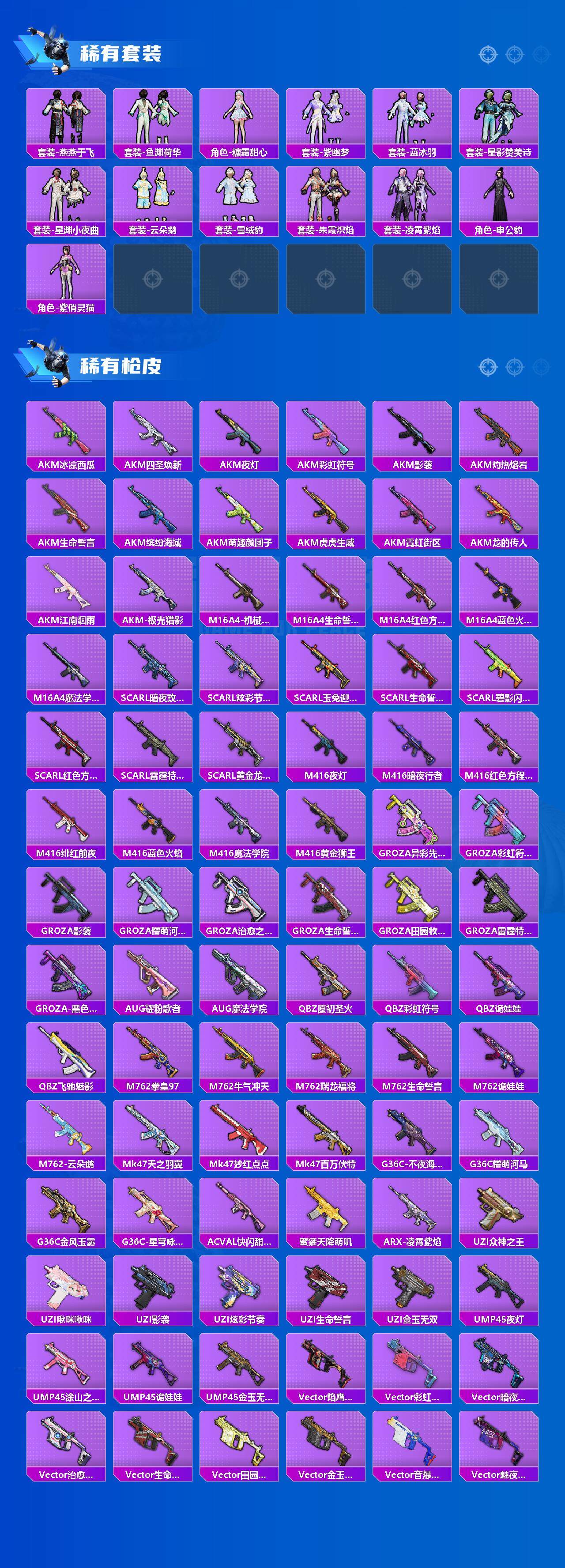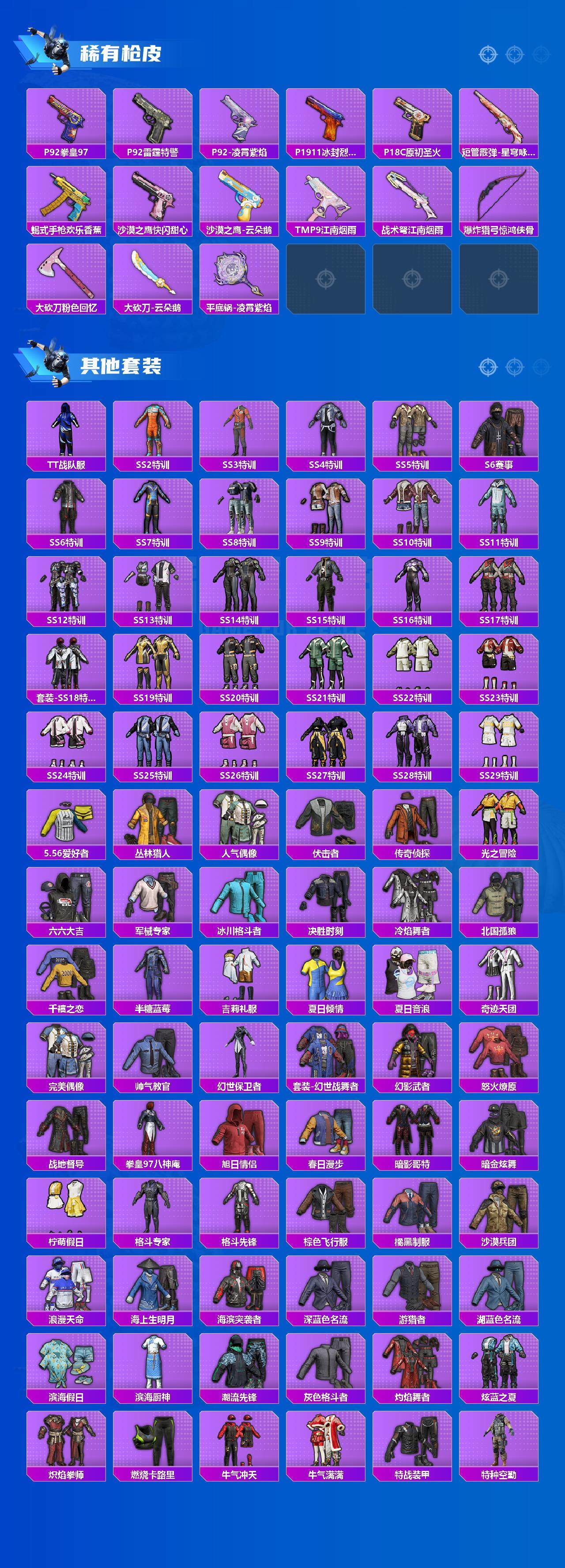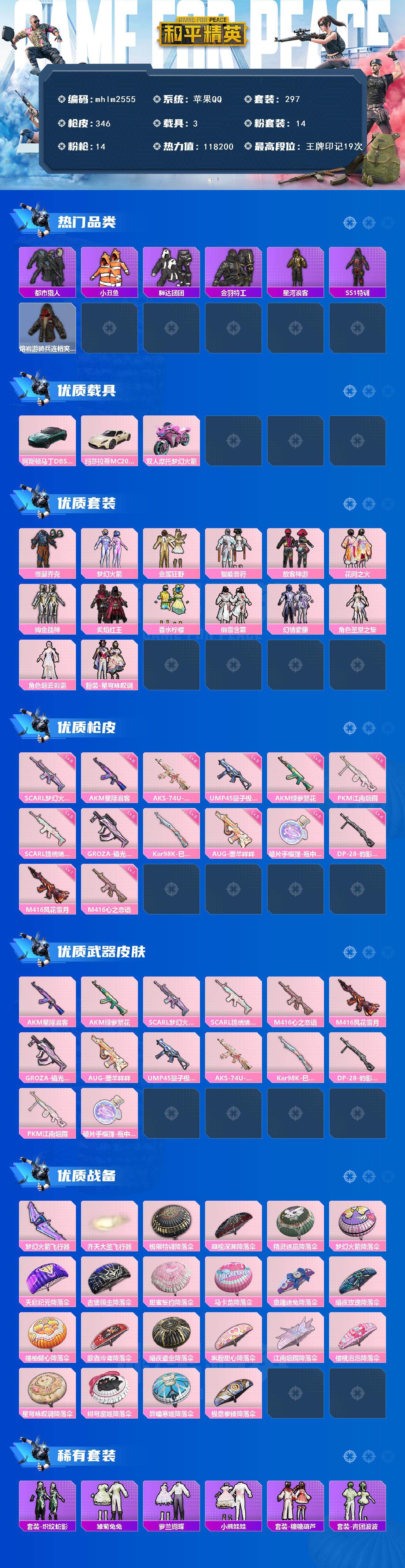 [14475521]【mhlm2555】苹果 手q-14粉装-14特效呛-3载具-3粉色飞行器-118200热力值-19王牌印记-297套装-346呛皮 【热门品类】:粉装-怪诞乔克,粉装-梦幻火箭,套装-浪漫天命,套装-都市猎人,套装-深海小丑鱼,套装-小丑鱼,套装-胖达团团,套装-黄金大亨,套装-金羽特工,套装-星河浪客,套装-ss1特训,套装-暗夜之虎,套装-龟仙人,套装-潮萌小黄鸭,套装-暗影哥特,熔岩游骑兵连帽夹克 【粉色载具】:阿斯顿马丁dbs(绿),玛莎拉蒂mc20(星石白),双人摩托-梦幻火箭 【粉色套装】:粉装-怪诞乔克,粉装-梦幻火箭,粉装-金属狂野,粉装-智能音符,粉装-放客神游,粉装-花间之火,粉装-绚金战神,粉装-炙焰红王,粉装-香水柠檬,粉装-俏雪含霜,粉装-幻情紫藤,角色-圣堂之誓,角色-烟云彩露,粉装-星穹咏叹调 【粉色呛皮等级】:akm-星际浪客六级,akm-绿萝繁花五级,scar-l-梦幻火箭六级,scar-l-锦绣绵绵五级,m416-心之恋语一级,m416-风花雪月一级,groza-镜光银凌五级,aug-暖羊咩咩五级,ump45-量子极限五级,aks-74u-星穹咏叹调六级,kar98k-巳巳如意五级,dp-28-豹影疾电四级,pkm-江南烟雨五级,破片手留单-瓶中星球五级 【粉色呛皮】:akm-星际浪客,akm-绿萝繁花,scar-l-梦幻火箭,scar-l-锦绣绵绵,m416-心之恋语,m416-风花雪月,groza-镜光银凌,aug-暖羊咩咩,ump45-量子极限,aks-74u-星穹咏叹调,kar98k-巳巳如意,dp-28-豹影疾电,pkm-江南烟雨,破片手留单-瓶中星球 【粉色飞行器】:梦幻火箭飞行器,齐天大圣飞行器 【粉色降落伞】:极限特训降落伞,凝视深渊降落伞,精灵迷巫降落伞,梦幻火箭降落伞,天启纪元降落伞,古堡领主降落伞,甜蜜誓约降落伞,马卡龙降落伞,童趣迷兔降落伞,暗夜玫瑰降落伞,橘柚倾心降落伞,歌者泠鸢降落伞,暗夜鎏金降落伞,飒粉甜心降落伞,江南烟雨降落伞,樱桃泡泡降落伞,星穹咏叹调降落伞,绯穹魔姬降落伞,异瞳寒姬降落伞,极意拳锋降落伞 【稀有套装】:套装-龟仙人,套装-炽纹蛇影,套装-雏菊兔兔,套装-萝兰蝴蝶,套装-小熊娃娃,套装-糖糖葫芦,套装-青团波波,套装-燕燕