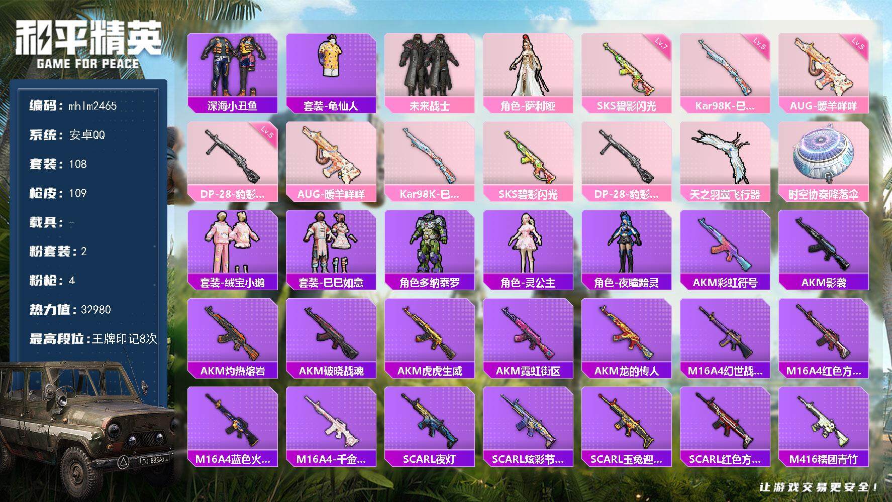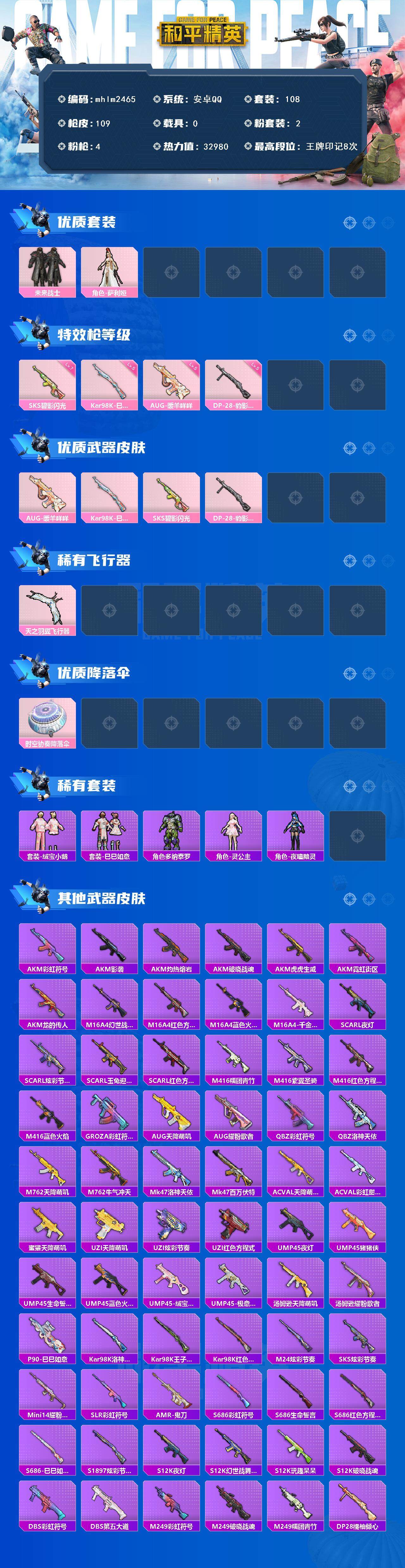 [14297449]【mhlm2465】安卓 手q-2粉装-4特效呛-0载具-1粉色飞行器-32980热力值-8王牌印记-108套装-109呛皮 【热门品类】:套装-深海小丑鱼,套装-龟仙人 【粉色套装】:粉装-未来战士,角色-萨利娅 【粉色呛皮等级】:aug-暖羊咩咩五级,kar98k-巳巳如意五级,sks-碧影闪光七级,dp-28-豹影疾电五级 【粉色呛皮】:aug-暖羊咩咩,kar98k-巳巳如意,sks-碧影闪光,dp-28-豹影疾电 【粉色飞行器】:天之羽翼飞行器 【粉色降落伞】:时空协奏降落伞 【稀有套装】:套装-龟仙人,套装-绒宝小鹅,套装-巳巳如意,角色-多纳泰罗,角色-灵公主,角色-夜瞳黯灵 【稀有呛皮】:akm-彩虹符号,akm-影袭,akm-灼热熔岩,akm-破晓战魂,akm-虎虎生威,akm-霓虹街区,akm-龙的传人,m16a4-幻世战舞者,m16a4-红色方程式,m16a4-蓝色火焰,m16a4-千金淑猫,scar-l-夜灯,scar-l-炫彩节奏,scar-l-玉兔迎春,scar-l-红色方程式,m416-糯团青竹,m416-紫翼圣骑,m416-红色方程式,m416-蓝色火焰,groza-彩虹符号,aug-天降萌叽,aug-耀粉歌者,q-彩虹符号,q-洛神天依,m762-天降萌叽,m762-牛气冲天,mk47-洛神天依,mk47-百万伏特,ac-val-天降萌叽,ac-val-彩虹甜喵,蜜獾-天降萌叽,uzi-天降萌叽,uzi-炫彩节奏,uzi-红色方程式,ump45-夜灯,ump45-猪猪侠,ump45-生命誓言,ump45-蓝色火焰,ump45-绒宝小鹅,ump45-极意拳锋,汤姆逊-天降萌叽,汤姆逊-耀粉歌者,p90-巳巳如意,kar98k-洛神天依,kar98k-王子的夏天,kar98k-红色方程式,m24-炫彩节奏,sks-炫彩节奏,mini14-耀粉歌者,slr-彩虹符号,amr-鬼刀,s686-彩虹符号,s686-生命誓言,s686-红色方程式,s686-巳巳如意,s1897-炫彩节奏,s12k-玩趣呆呆,s12k-破晓战魂,s12k-夜灯,s12k-幻世战舞者,dbs-彩虹符号,dbs-第五大道,m249-彩虹符号,m249-破晓战魂,m249-糯团青竹,dp-28-橘柚倾心,mg3-幻世战舞者,破片手留单-巳巳如
