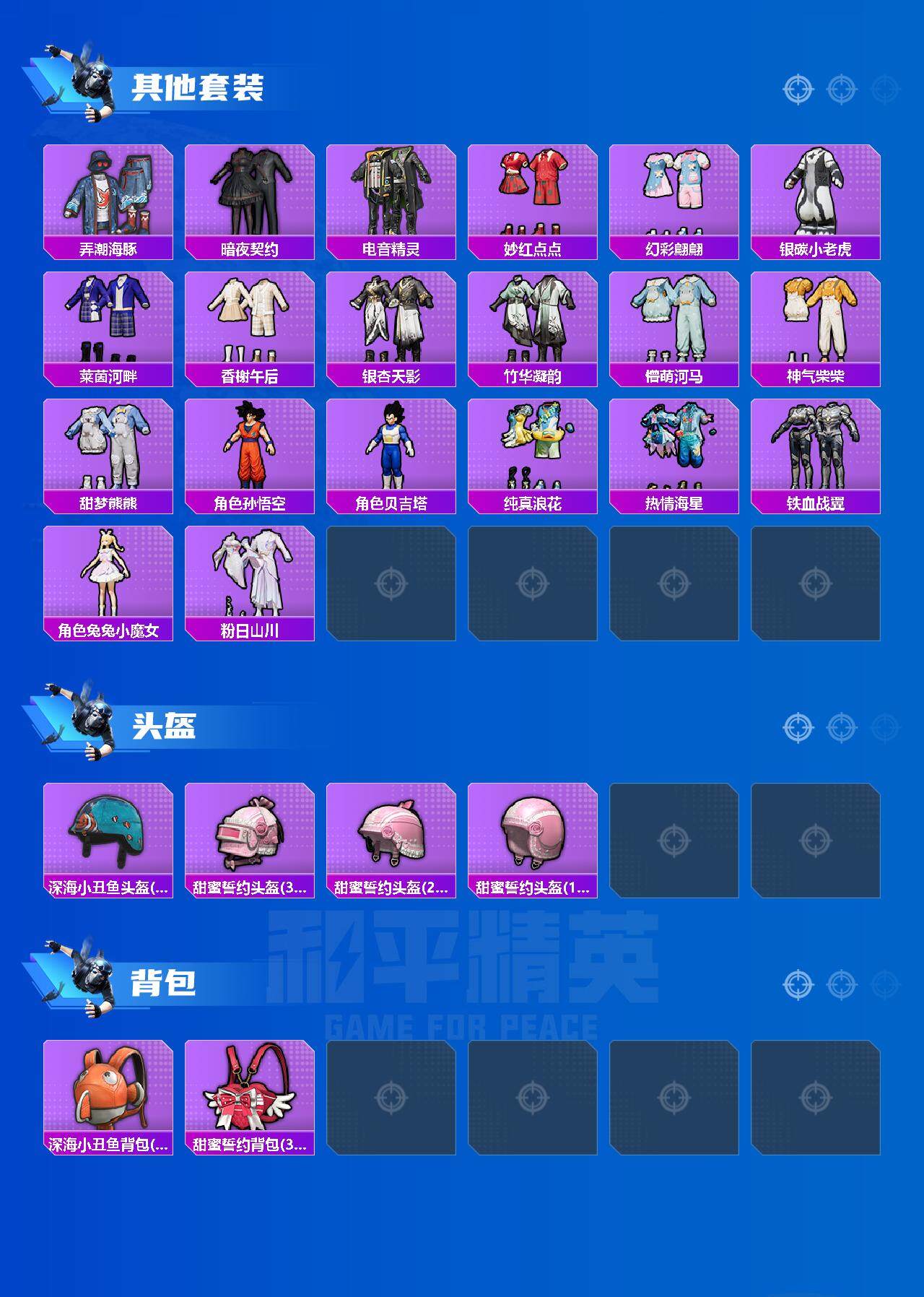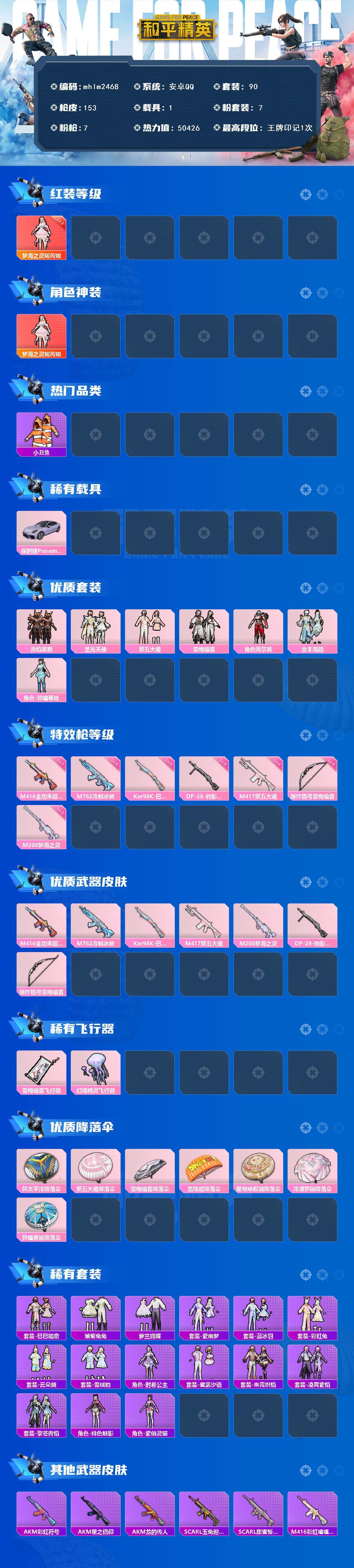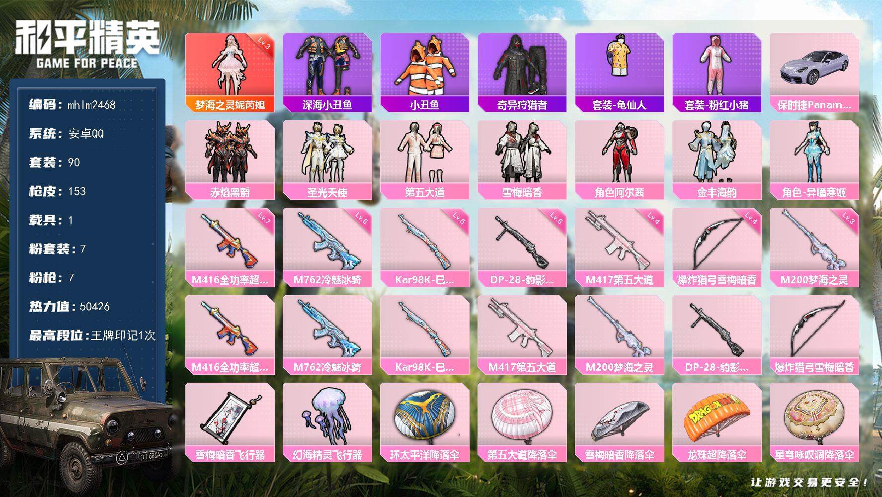 [14297630]【mhlm2468】安卓 手q-1神装-7粉装-7特效呛-1载具-3粉色飞行器-50426热力值-1王牌印记-90套装-153呛皮 【红色神装等级】:梦海之灵-妮芮妲三级 【红色角色神装】:梦海之灵-妮芮妲 【热门品类】:套装-深海小丑鱼,套装-小丑鱼,套装-奇异狩猎者,套装-龟仙人,套装-粉红小猪 【粉色载具】:保时捷panamera(星辰紫) 【粉色套装】:粉装-赤焰黑爵,粉装-圣光天使,粉装-第五大道,粉装-雪梅暗香,角色-阿尔茜,粉装-金丰海韵,角色-异瞳寒姬 【粉色呛皮等级】:m416-全功率超战七级,m762-冷魅冰骑五级,kar98k-巳巳如意五级,m417-第五大道四级,m200-梦海之灵三级,dp-28-豹影疾电五级,爆炸猎弓-雪梅暗香四级 【粉色呛皮】:m416-全功率超战,m762-冷魅冰骑,kar98k-巳巳如意,m417-第五大道,m200-梦海之灵,dp-28-豹影疾电,爆炸猎弓-雪梅暗香 【粉色飞行器】:雪梅暗香飞行器,幻海精灵飞行器 【粉色降落伞】:环太平洋降落伞,第五大道降落伞,雪梅暗香降落伞,龙珠超降落伞,星穹咏叹调降落伞,冷漠罗丽降落伞,异瞳寒姬降落伞 【稀有套装】:套装-龟仙人,套装-巳巳如意,套装-雏菊兔兔,套装-萝兰蝴蝶,套装-紫幽梦,套装-蓝冰羽,套装-彩虹兔,套装-云朵鹅,套装-雪绒豹,角色-时希公主,套装-蜜露汐语,套装-朱霞炽焰,套装-凌霄紫焰,套装-擎苍青焰,角色-绯色魅影,角色-紫俏灵猫 【稀有呛皮】:aug-冰晶雪宝,akm-彩虹符号,akm-星之信仰,akm-龙的传人,scar-l-玉兔迎春,scar-l-甜蜜誓约,m416-彩虹嘻嘻猴,m416-糯团青竹,groza-懵萌河马,aug-天降萌叽,aug-耀粉歌者,q-银碳小老虎,m762-天降萌叽,m762-第五大道,m762-云朵鹅,mk47-妙红点点,mk47-洛神天依,g36c-懵萌河马,ac-val-天降萌叽,arx-凌霄紫焰,uzi-啾咪啾咪,uzi-红色方程式,uzi-诡夜天鹅,ump45-涂山之恋,vect-生命誓言,vect-音爆索尼克,汤姆逊-天降萌叽,汤姆逊-奇异狩猎者,汤姆逊-炫彩节奏,mp5k-甜蜜誓约,js9-凌霄紫焰,p90-巳巳如意,m24-仲夏莫吉托,m24-奇异狩猎者,awm-