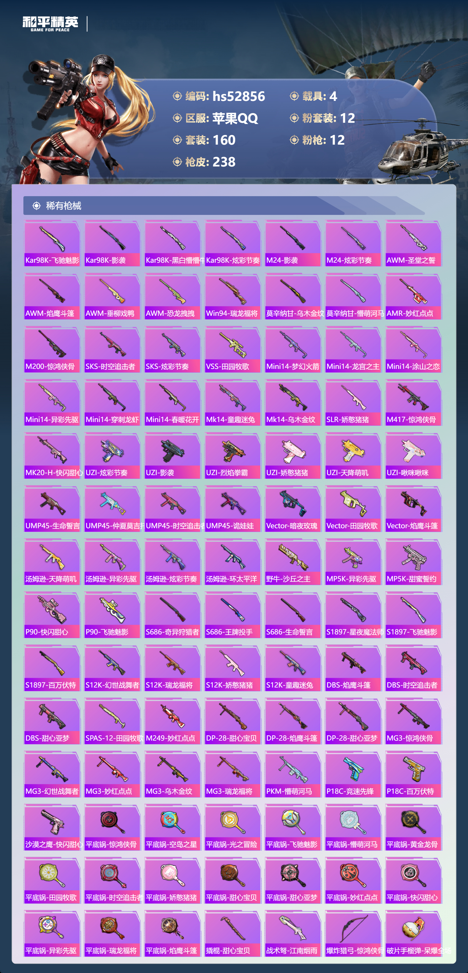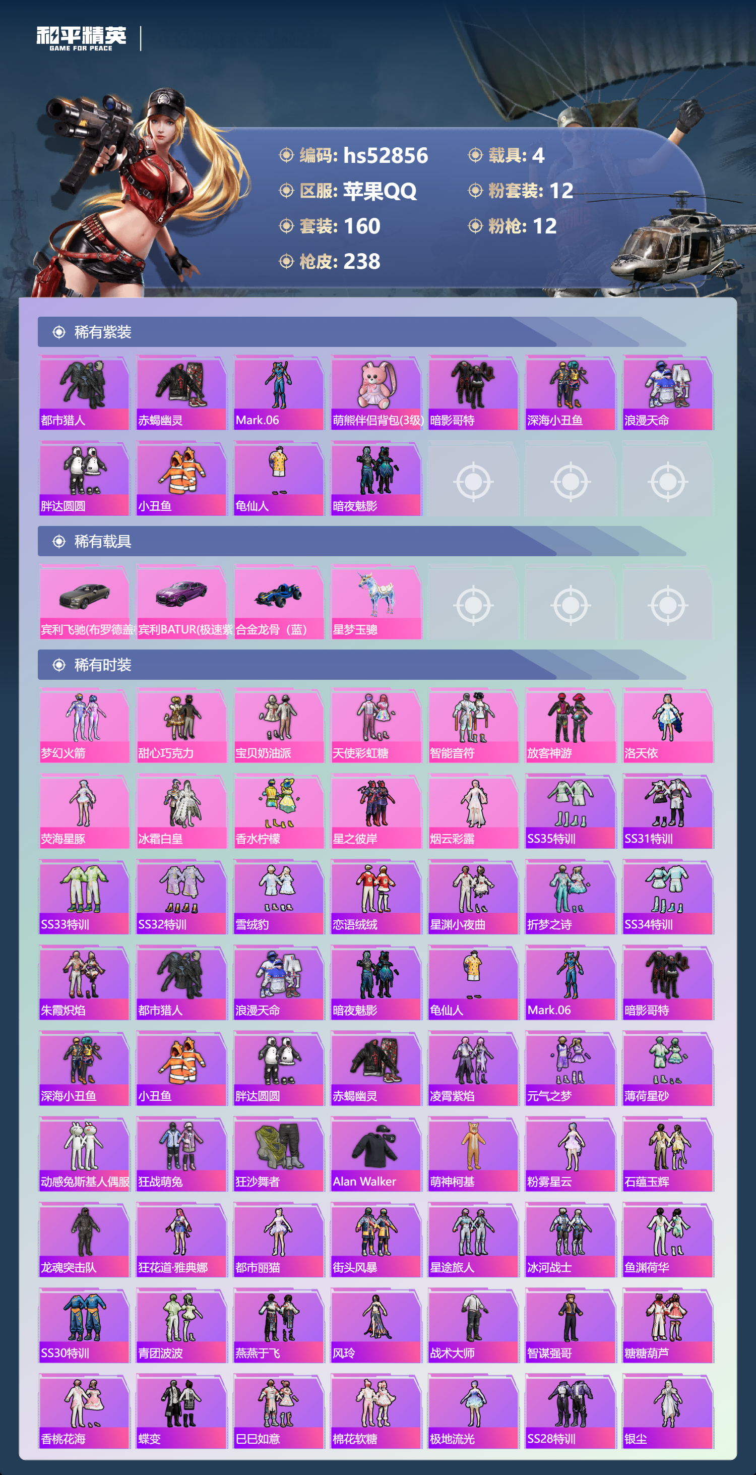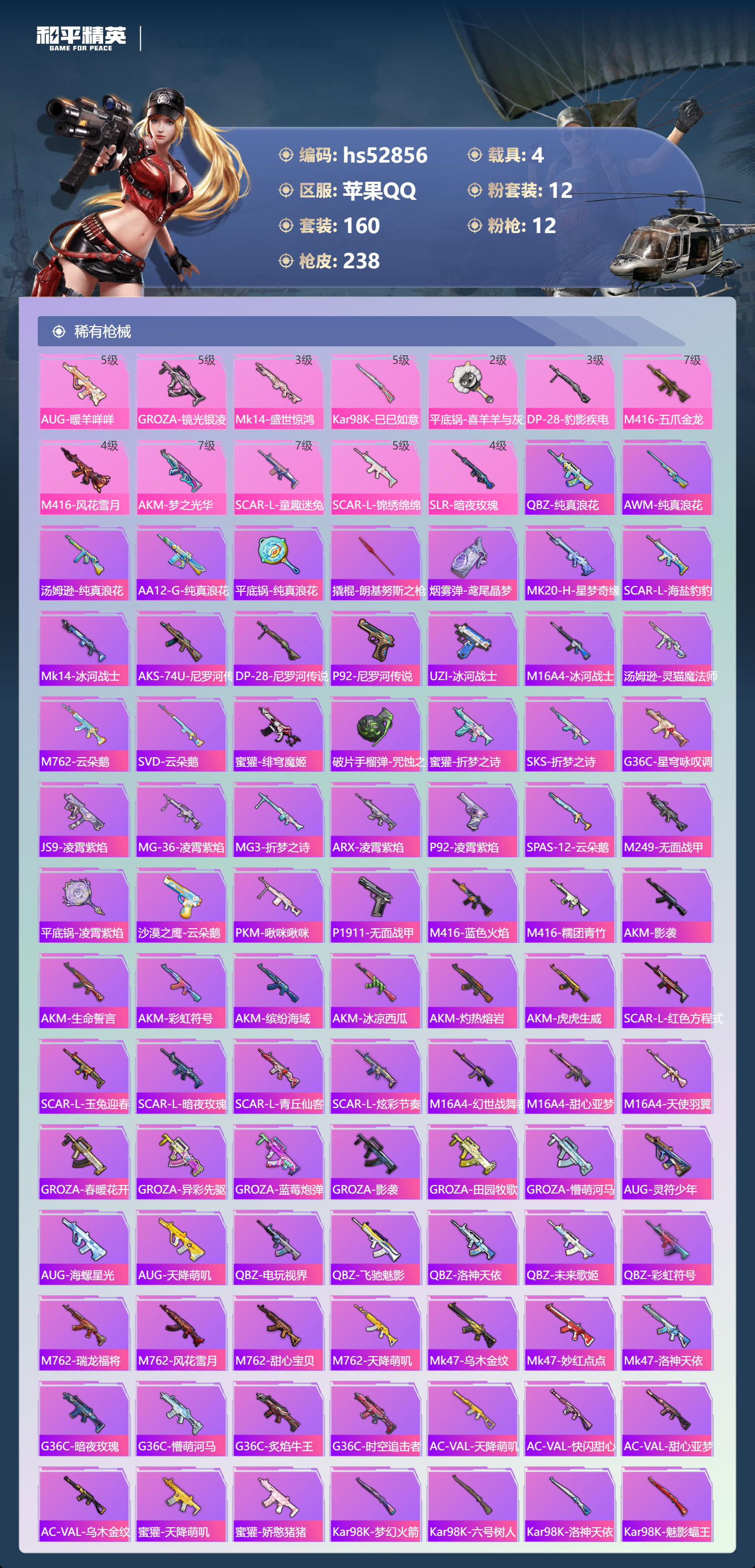 hs52856 苹果手q-16王牌印记-12粉装-12特效呛-4载具-86565热力值-160套装-238呛皮-1卓越印记-1传奇印记【12粉装】套装-智能音符套装-星之彼岸套装-甜心巧克力套装-宝贝奶油派套装-香水柠檬套装-天使彩虹糖套装-梦幻火箭角色-洛天依角色-烟云彩露套装-冰霜白皇角色-荧海星豚套装-放客神游【12特效呛】aug-暖羊咩咩/5级groza-镜光银