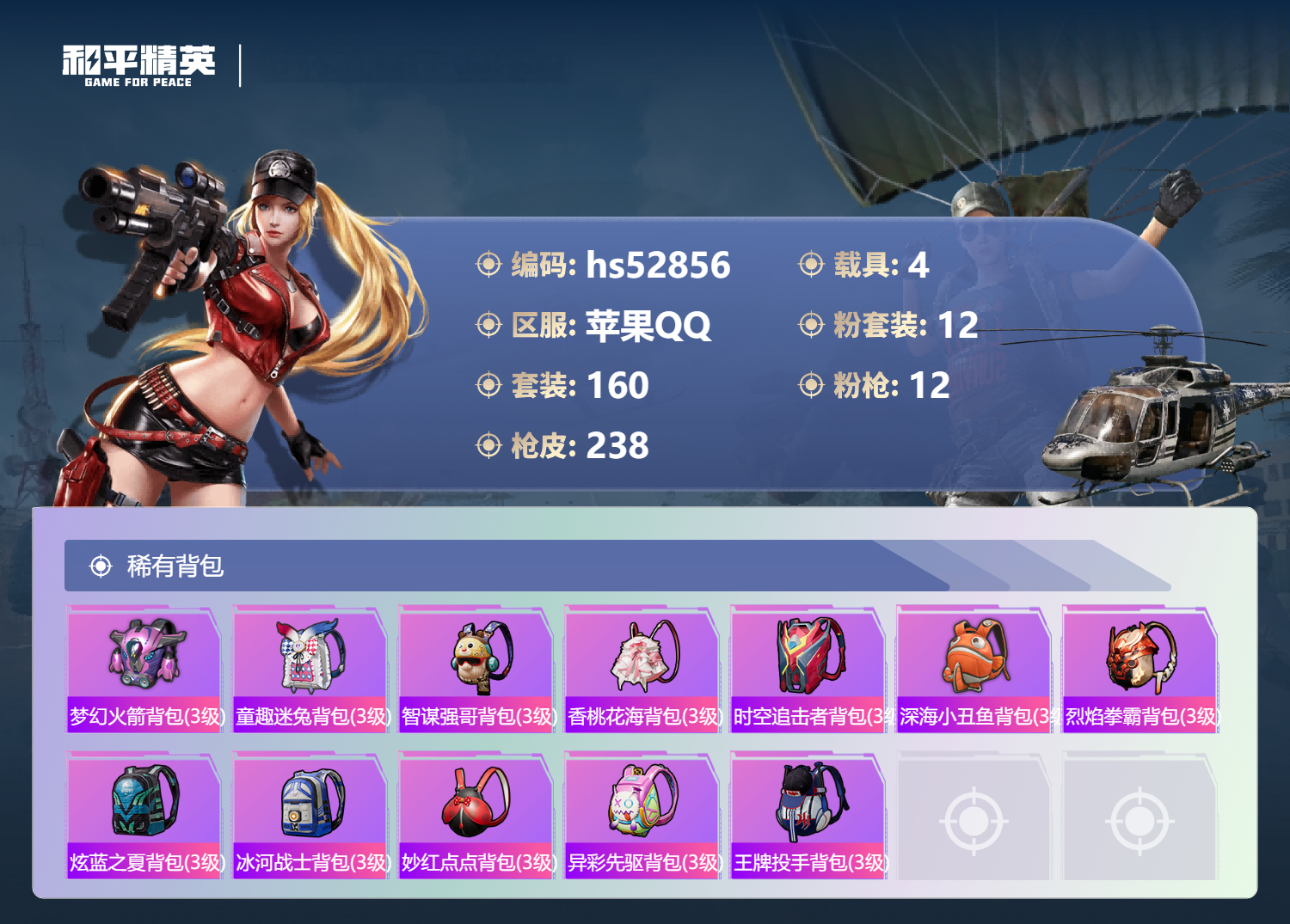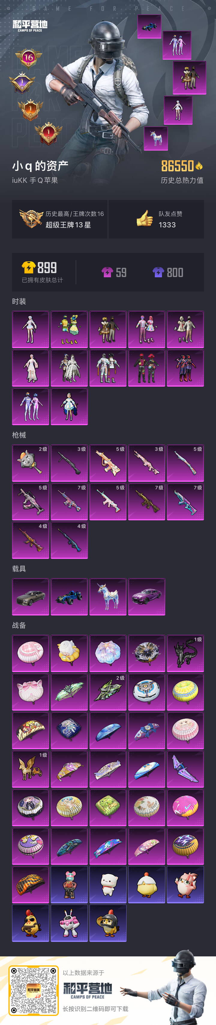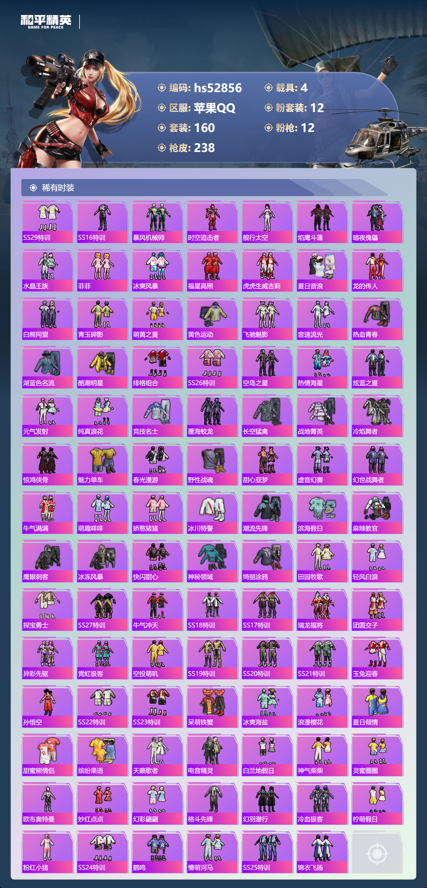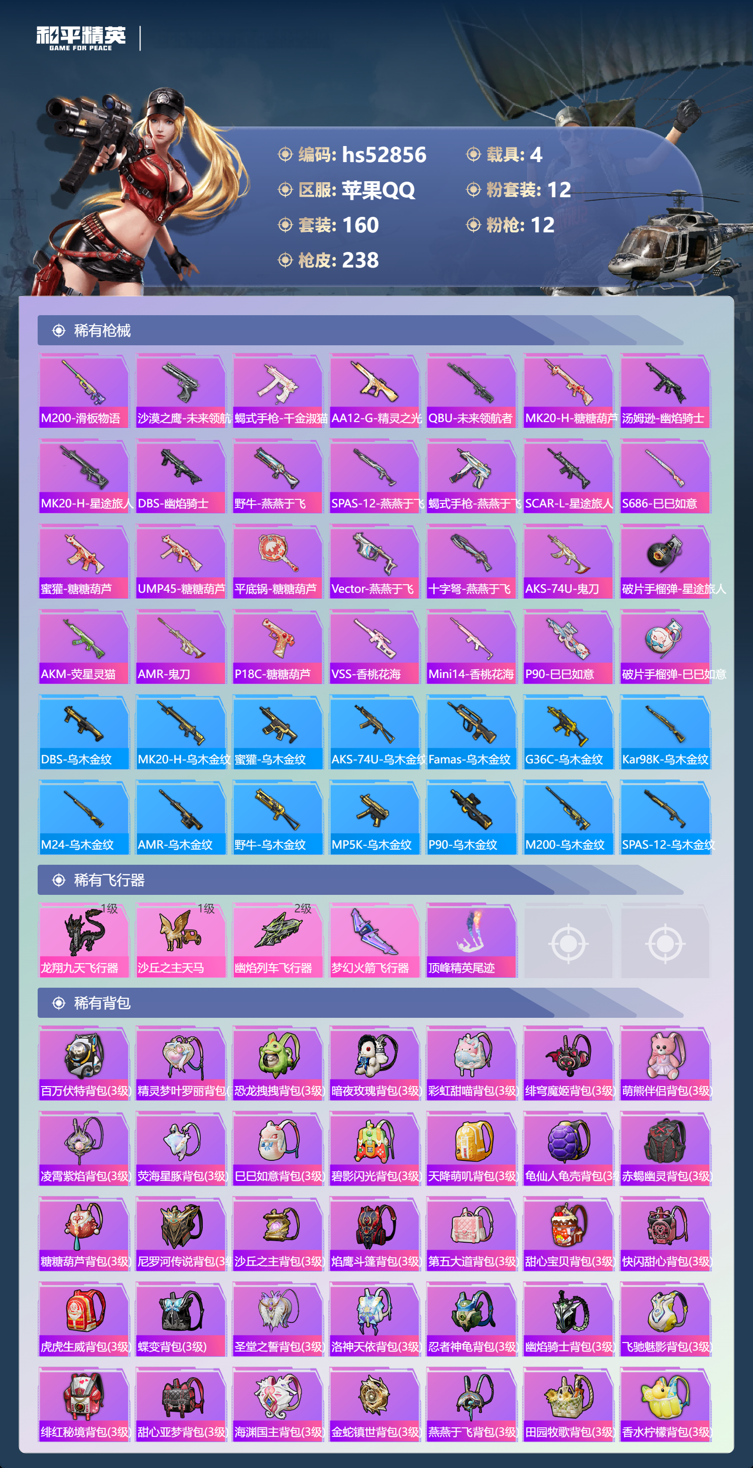 hs52856 苹果手q-16王牌印记-12粉装-12特效呛-4载具-86565热力值-160套装-238呛皮-1卓越印记-1传奇印记【12粉装】套装-智能音符套装-星之彼岸套装-甜心巧克力套装-宝贝奶油派套装-香水柠檬套装-天使彩虹糖套装-梦幻火箭角色-洛天依角色-烟云彩露套装-冰霜白皇角色-荧海星豚套装-放客神游【12特效呛】aug-暖羊咩咩/5级groza-镜光银