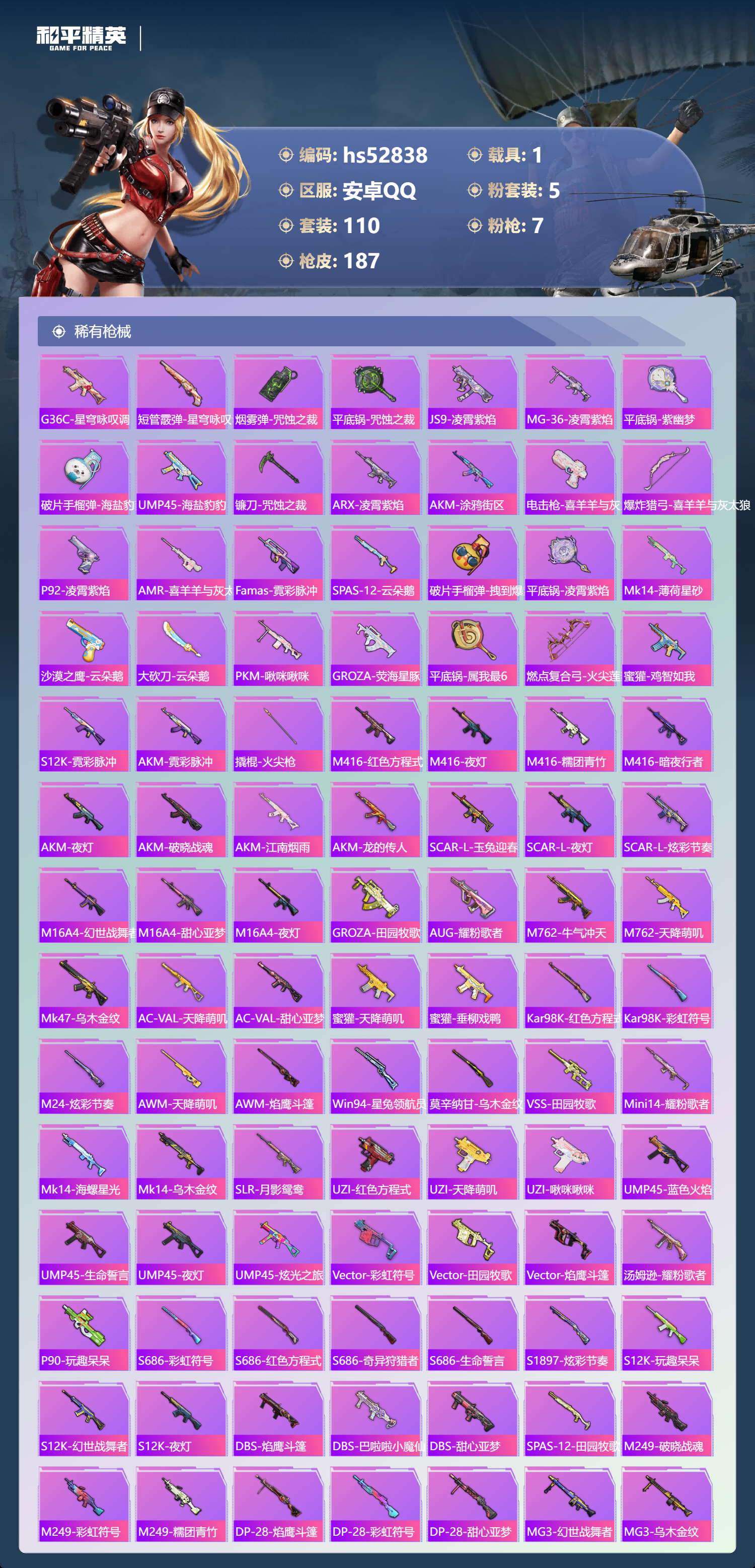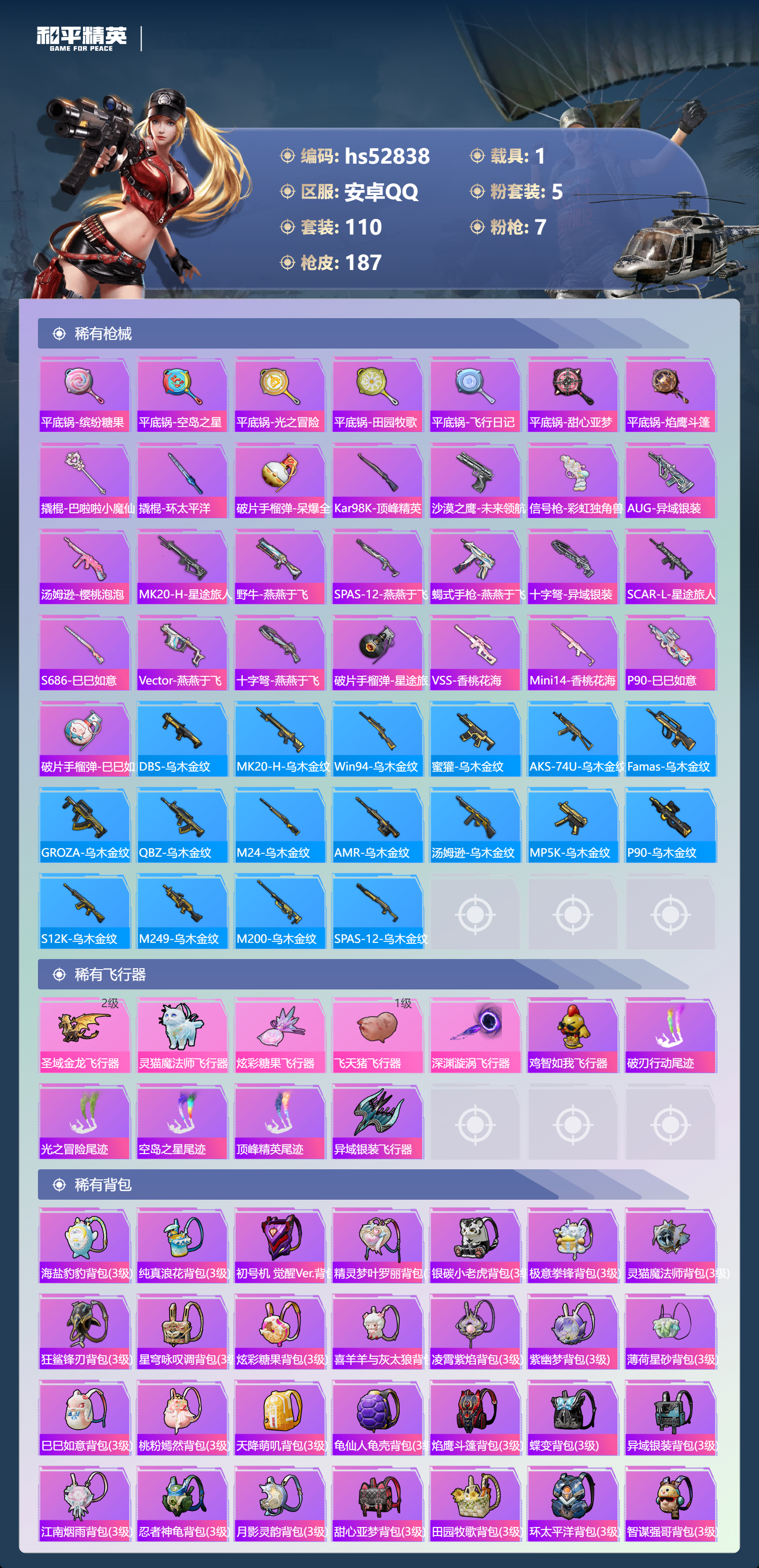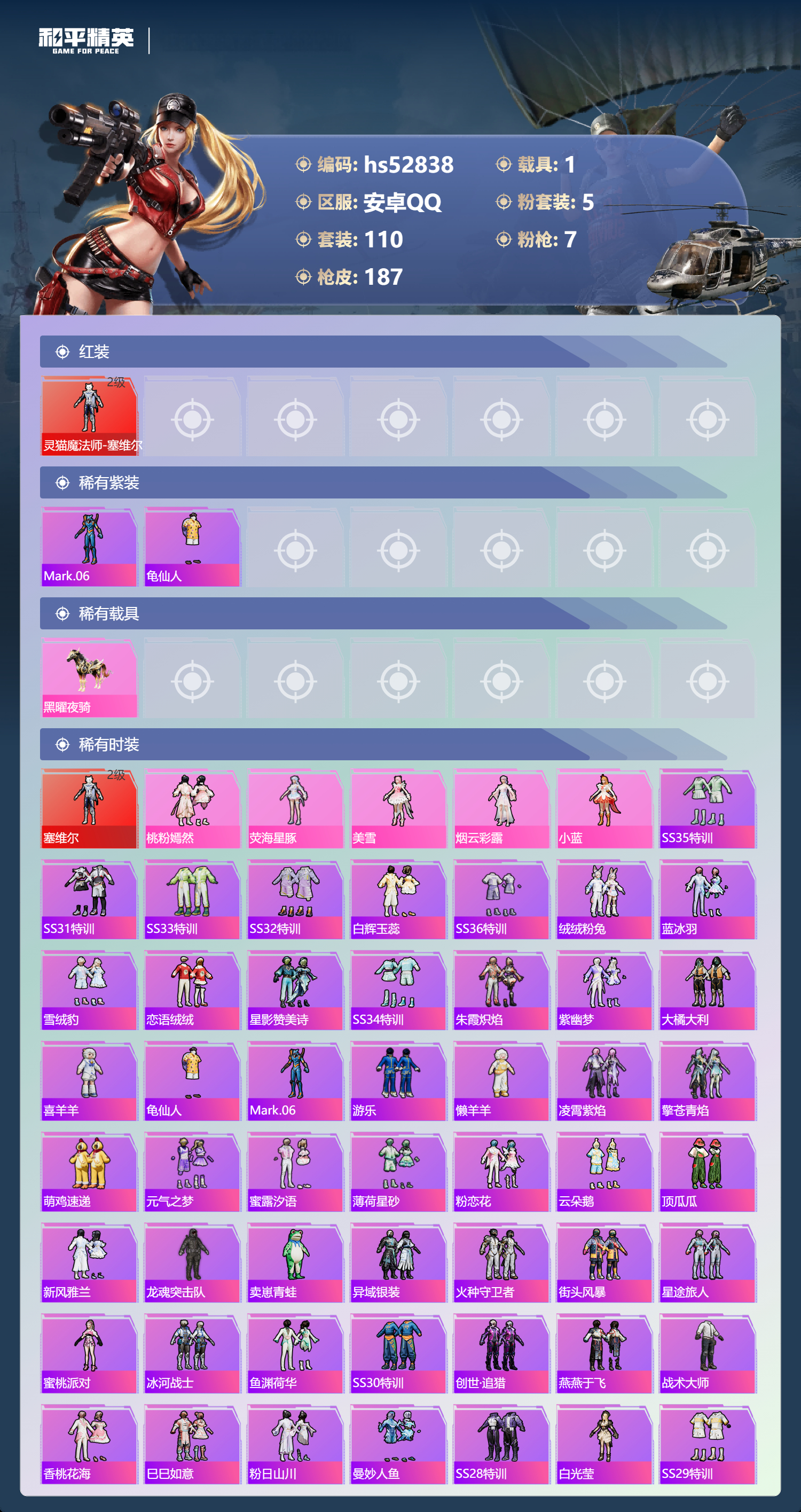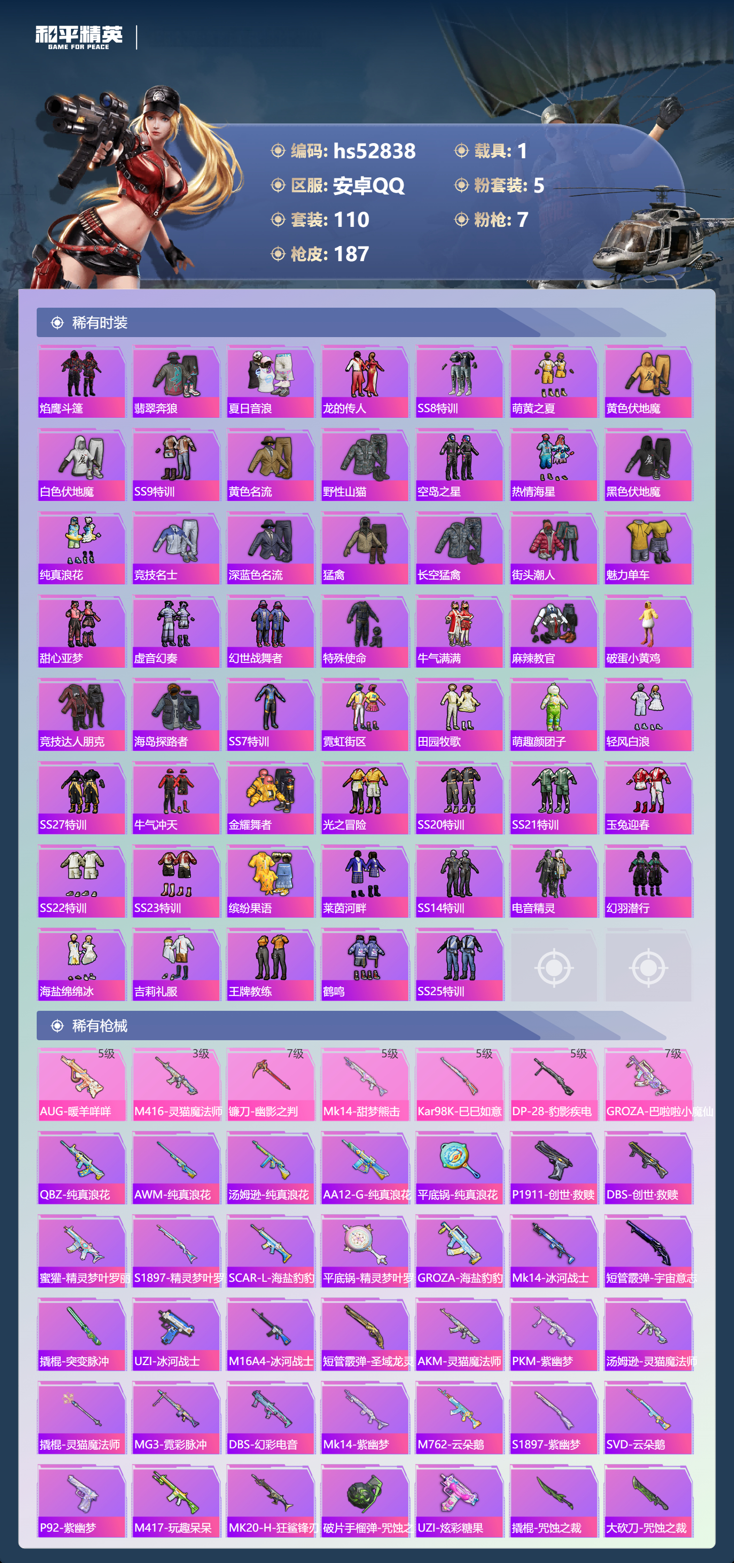hs52838 安卓手q-3王牌印记-1红装-5粉装-7特效呛-1载具-57041热力值-110套装-187呛皮-1卓越印记【1红装】灵猫魔法师-塞维尔/2级【5粉装】角色-烟云彩露角色-小蓝角色-美雪套装-桃粉嫣然角色-荧海星豚【7特效呛】m416-灵猫魔法师/3级镰刀-幽影之判/7级mk14-甜梦熊击/5级groza-巴啦啦小魔仙/7级kar98k-巳巳如意/5级aug