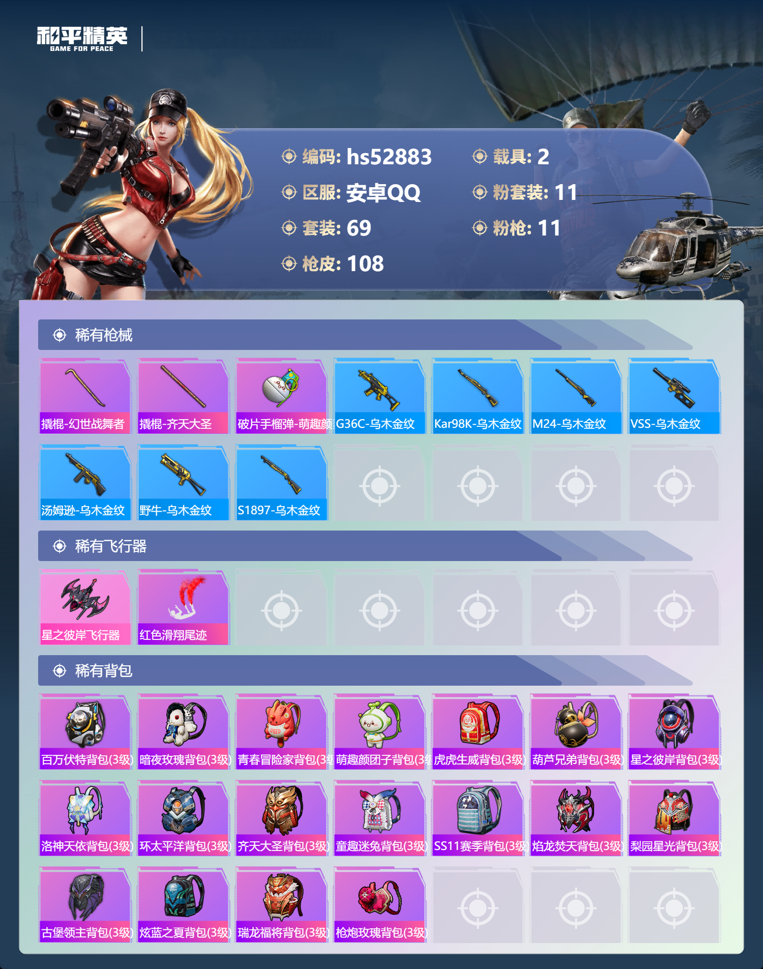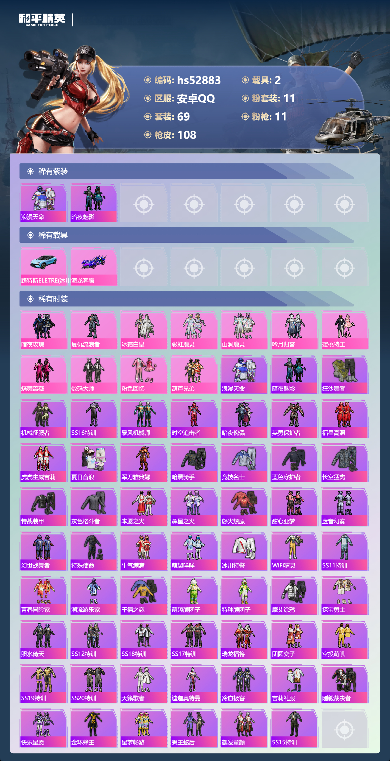 hs52883 安卓手q-2王牌印记-11粉装-11特效呛-2载具-41702热力值-69套装-108呛皮【11粉装】套装-彩虹鹿灵套装-暗夜玫瑰套装-吟月归客套装-数码大师套装-山涧鹿灵套装-蜜桃特工角色-复仇流浪者套装-蝶舞蔷薇套装-粉色回忆套装-葫芦兄弟套装-冰霜白皇【11特效呛】平底锅-林间仙鹿/1级awm-花间之火/2级akm-梦之光华/4级scar-l-童