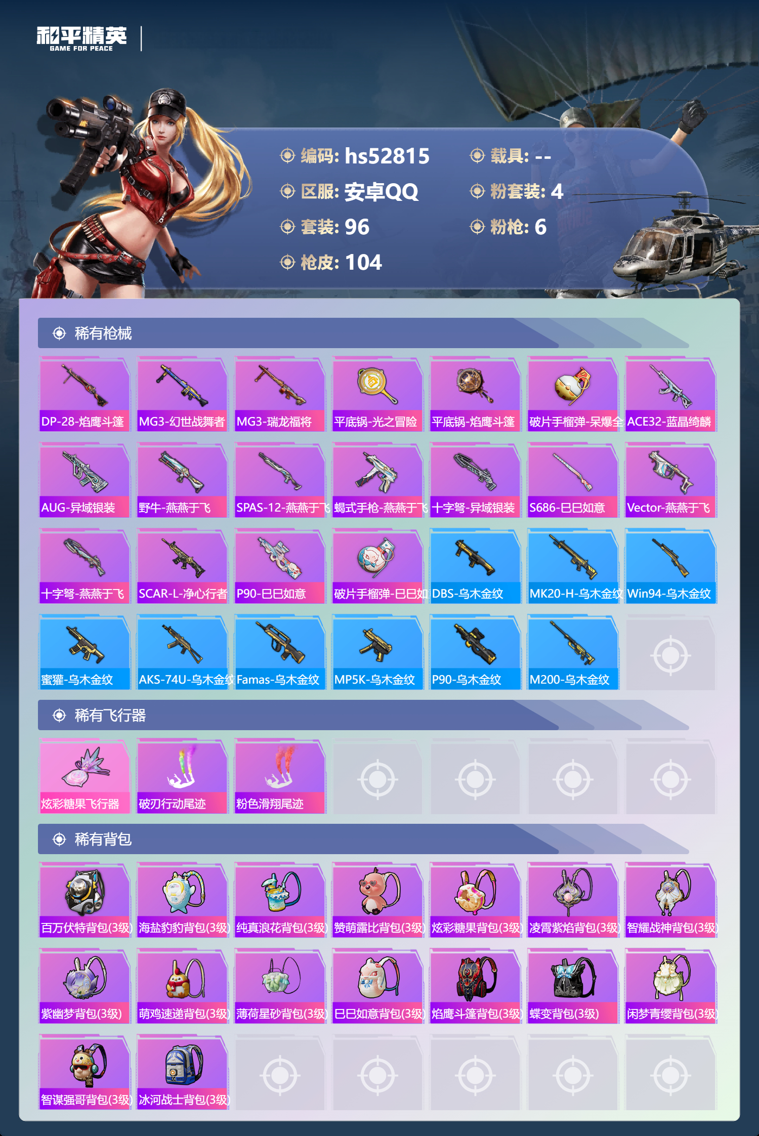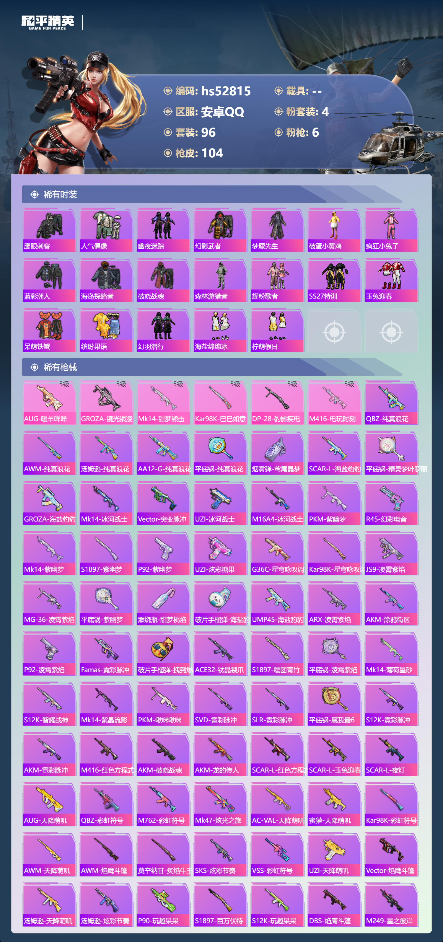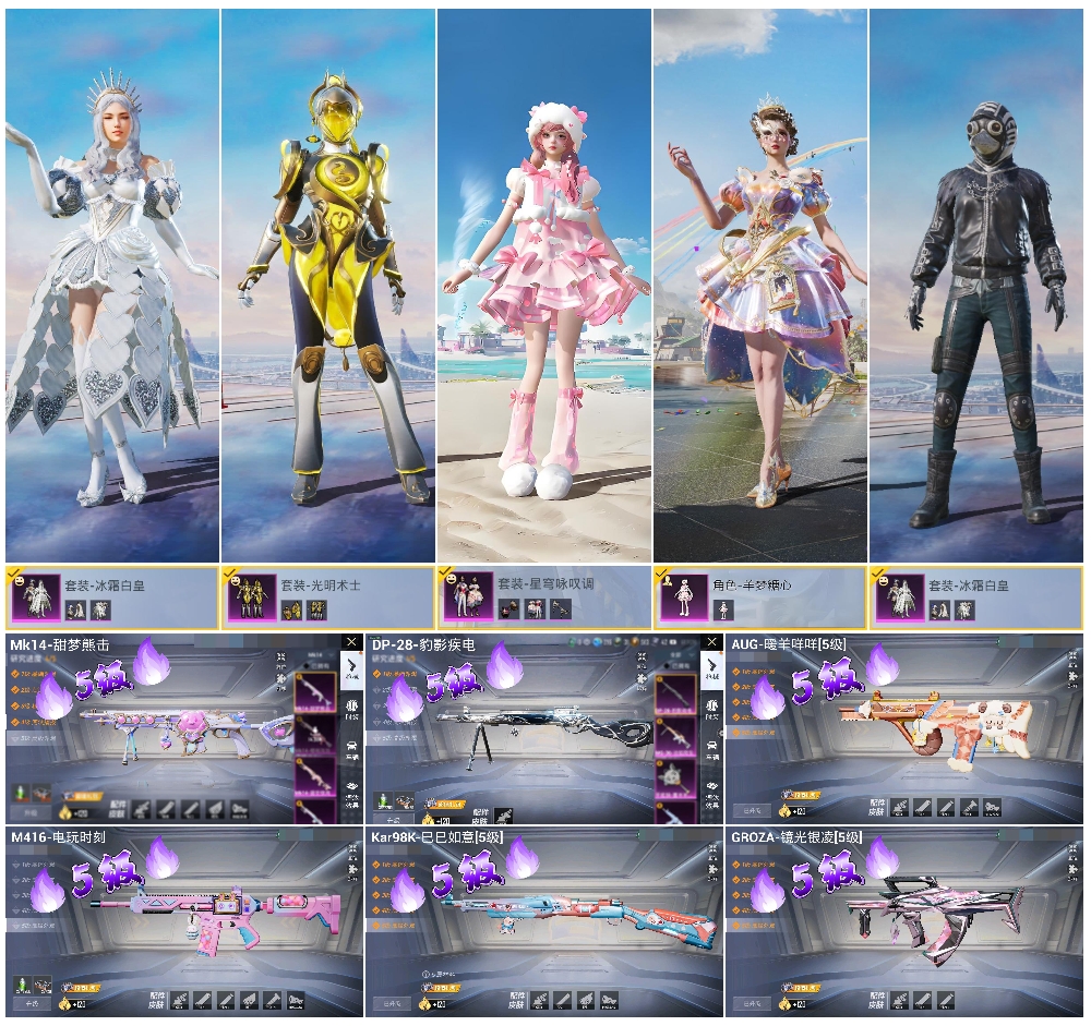 hs52815 安卓手q-2王牌印记-4粉装-6特效呛-30702热力值-96套装-104呛皮-1卓越印记【4粉装】套装-光明术士角色-羊梦糖心套装-冰霜白皇套装-星穹咏叹调【6特效呛】m416-电玩时刻/5级dp-28-豹影疾电/5级kar98k-巳巳如意/5级mk14-甜梦熊击/5级groza-镜光银凌/5级aug-暖羊咩咩/5级【1稀有紫装】龟仙人【96稀有时装】星穹
