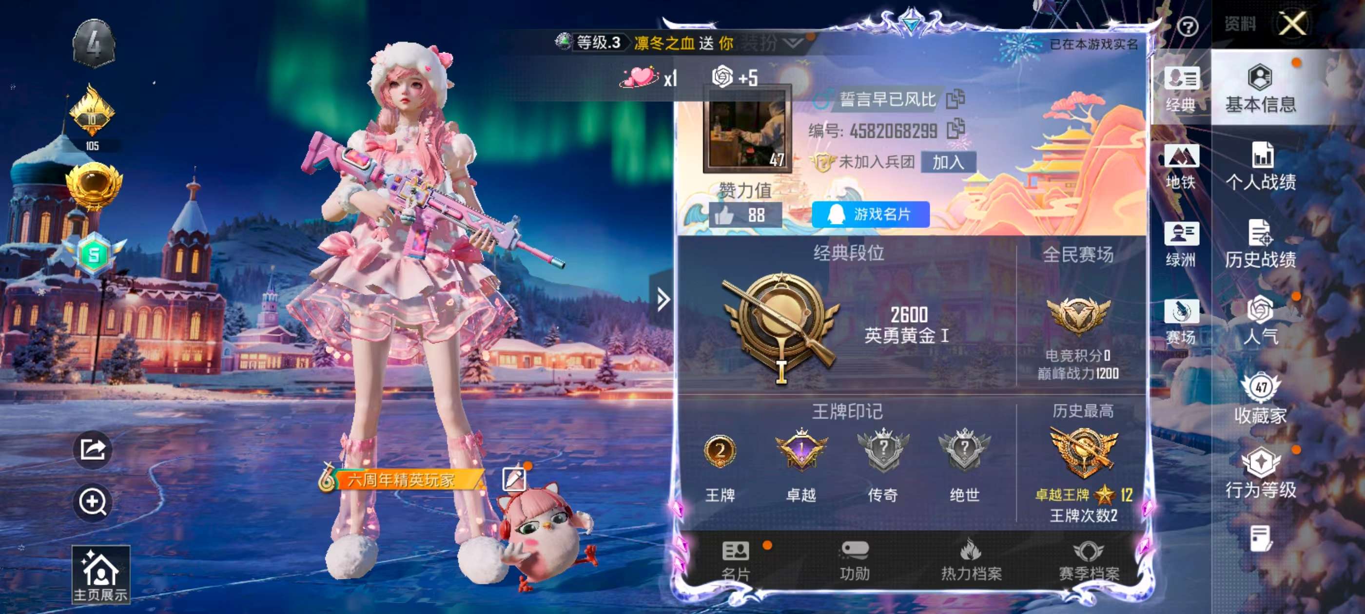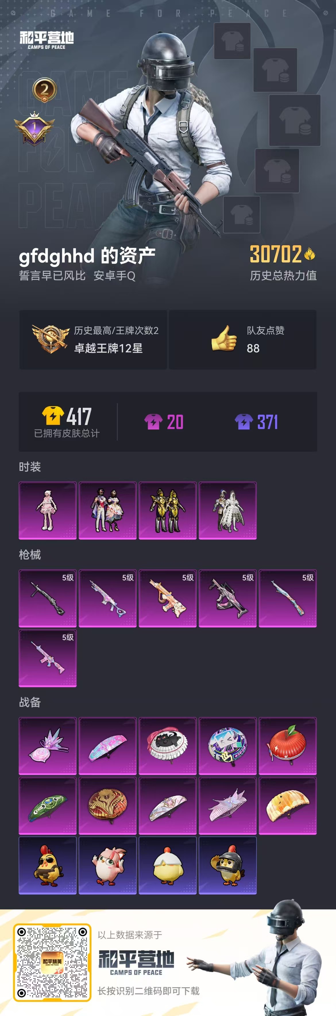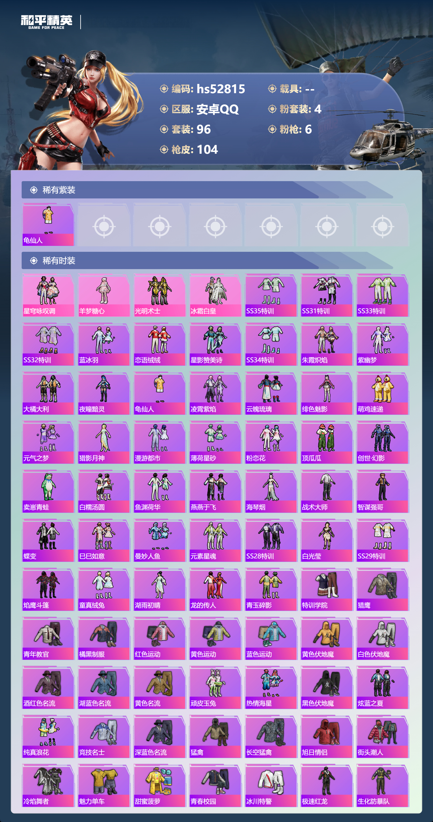 hs52815 安卓手q-2王牌印记-4粉装-6特效呛-30702热力值-96套装-104呛皮-1卓越印记【4粉装】套装-光明术士角色-羊梦糖心套装-冰霜白皇套装-星穹咏叹调【6特效呛】m416-电玩时刻/5级dp-28-豹影疾电/5级kar98k-巳巳如意/5级mk14-甜梦熊击/5级groza-镜光银凌/5级aug-暖羊咩咩/5级【1稀有紫装】龟仙人【96稀有时装】星穹