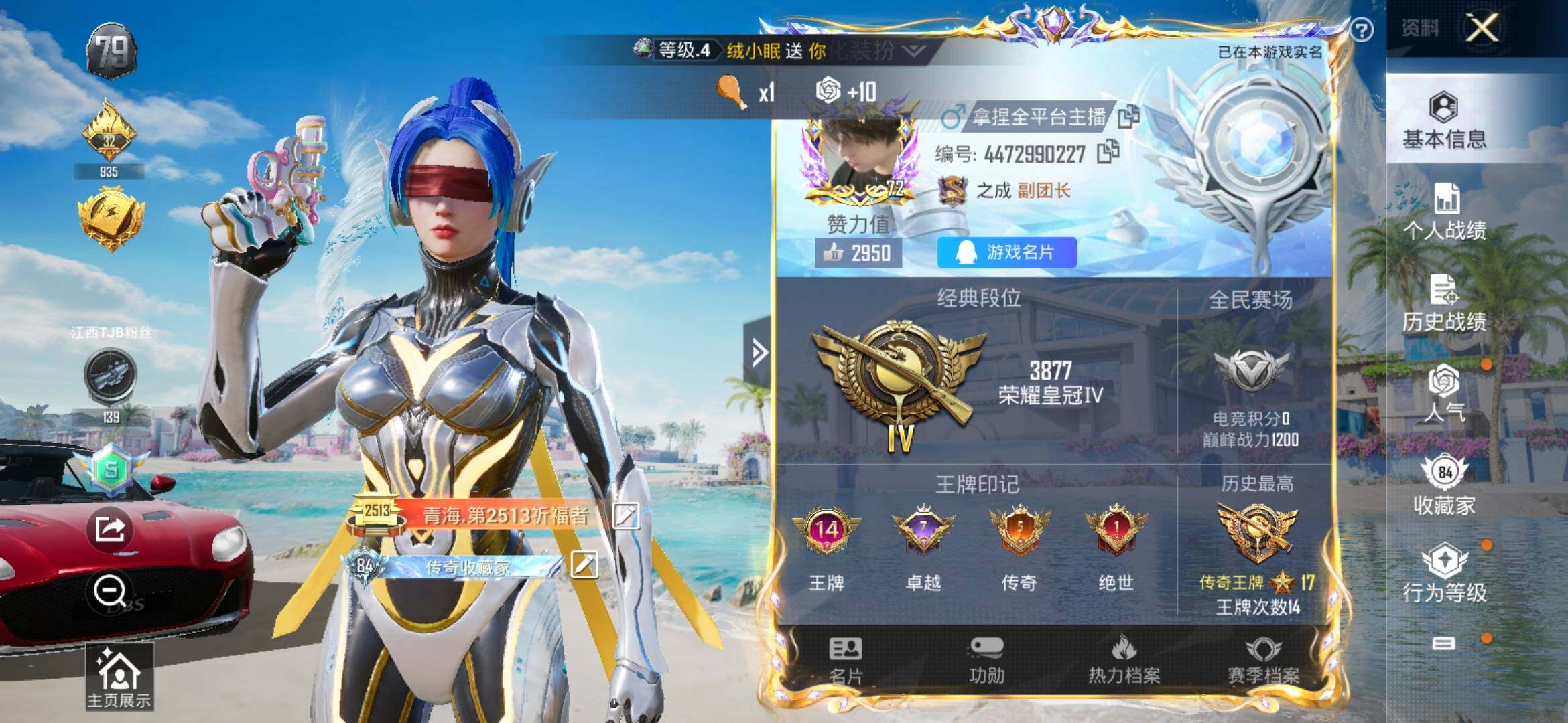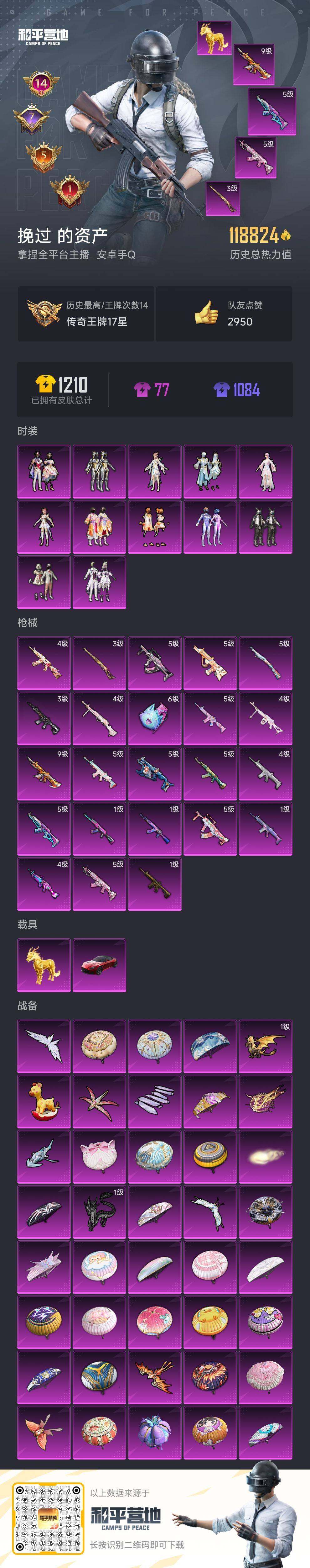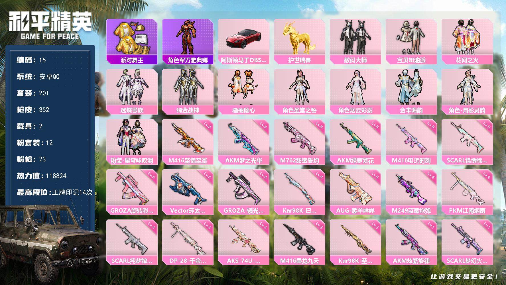 [14559876]连体王者10传说3珍品安卓 手q-12粉装-23特效呛-2载具-118824热力值-14印记-201套装-352呛皮 【稀有载具】:阿斯顿马丁dbs(红),护世瑞兽 【特效呛等级】:akm-炫紫旋律一级,akm-梦之光华五级,akm-星际浪客一级,akm-绿萝繁花五级,scar-l-梦幻火箭一级,scar-l-纯梦嫁纱四级,scar-l-锦绣绵绵五级,m416-五爪金龙一级,m416-至情至圣九级,m416-电玩时刻五级,m416-墨龙九天三级,groza-旋转彩虹五级,groza-镜光银凌五级,aug-暖羊咩咩五级,m762-甜蜜誓约五级,vect-环太平洋五级,aks-74u-星穹咏叹调四级,kar98k-巳巳如意五级,kar98k-圣域龙灵三级,m249-蓝莓炮弹四级,dp-28-千金淑猫四级,pkm-江南烟雨四级 【优质套装】:粉装-数码大师,粉装-宝贝奶油派,粉装-梦幻火箭,粉装-花间之火,粉装-迷蝶贵族,粉装-绚金战神,粉装-橘柚倾心,角色-圣堂之誓,角色-烟云彩露,粉装-金丰海韵,角色-月影灵韵,粉装-星穹咏叹调 【稀有套装】:套装-龟仙人,套装-巳巳如意,套装-雏菊兔兔,套装-萝兰蝴蝶,套装-小熊娃娃,套装-火种守卫者,套装-糖糖葫芦,套装-青团波波,套装-棉花软糖,角色-都市丽猫,角色-摩登魅猫,套装-燕燕于飞,套装-鱼渊荷华,套装-闪电轻猫,套装-新风雅兰,套装-粉恋花,套装-紫幽梦,套装-蓝冰羽,角色-猎影月神,套装-星影赞美诗,套装-彩虹兔,套装-云朵鹅,套装-雪绒豹,套装-蓝海鲸歌 【优质武器皮肤】:akm-炫紫旋律,akm-梦之光华,akm-星际浪客,akm-绿萝繁花,scar-l-梦幻火箭,scar-l-纯梦嫁纱,scar-l-锦绣绵绵,m416-五爪金龙,m416-至情至圣,m416-电玩时刻,m416-墨龙九天,groza-旋转彩虹,groza-镜光银凌,aug-暖羊咩咩,m762-甜蜜誓约,vect-环太平洋,aks-74u-星穹咏叹调,kar98k-巳巳如意,kar98k-圣域龙灵,m249-蓝莓炮弹,dp-28-千金淑猫,pkm-江南烟雨,破片手留单-粉粉猫爪 【稀有武器皮肤】:akm-冰凉西瓜,akm-四圣焕新,akm-夜灯,a