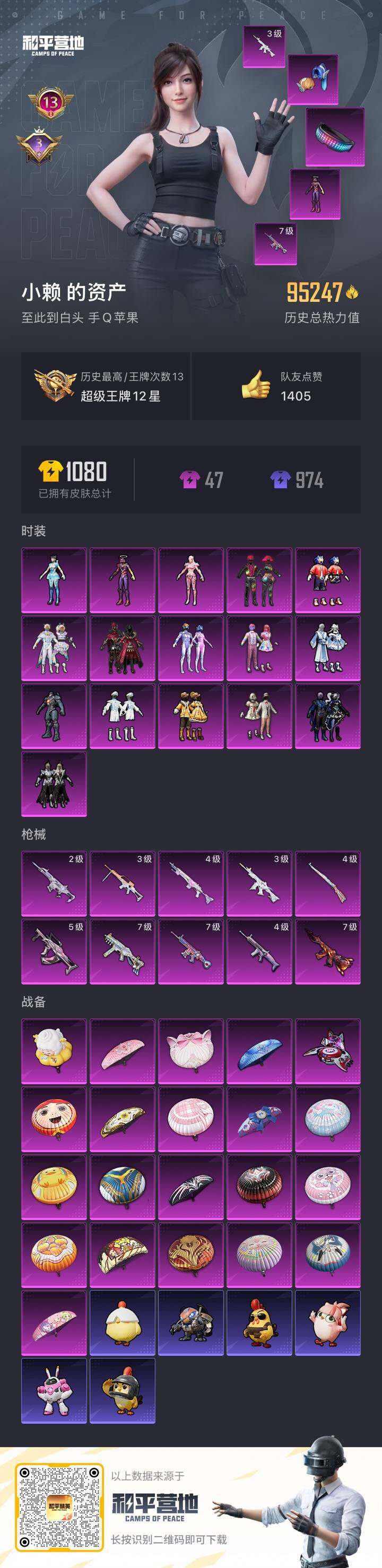 [14559901]苹果 手q-16粉装-10特效呛-0载具-1粉色飞行器-95247热力值-13王牌印记-219套装-278呛皮 【热门品类】:粉装-梦幻火箭,粉装-音爆索尼克,套装-浪漫天命,套装-奇异狩猎者,套装-胖达团团,套装-动感兔斯基人偶服,套装-龟仙人,套装-暗影哥特,角色-8号机,角色-mark.06 【粉色套装】:粉装-宝贝奶油派,粉装-天使彩虹糖,粉装-梦幻火箭,粉装-放客神游,粉装-炙焰红王,粉装-骨龙祭渊,粉装-暗夜玫瑰,粉装-彩虹鹿灵,粉装-黄伞悠悠,粉装-海盐物语,角色-复仇流浪者,粉装-傲雪凌霜,粉装-音爆索尼克,角色-守护天翼,角色-初号机 觉醒ver.,角色-异瞳寒姬 【粉色呛皮等级】:scar-l-梦幻火箭四级,scar-l-童趣迷兔七级,m416-风花雪月七级,m416-女娲灵识三级,groza-镜光银凌五级,arx-无垠阁二级,ump45-相思残雪七级,kar98k-巳巳如意四级,mk14-甜梦熊击四级,mg-36-沧焰双生三级 【粉色呛皮】:scar-l-梦幻火箭,scar-l-童趣迷兔,m416-风花雪月,m416-女娲灵识,groza-镜光银凌,arx-无垠阁,ump45-相思残雪,kar98k-巳巳如意,mk14-甜梦熊击,mg-36-沧焰双生 【粉色飞行器】:花傲天飞行器 【粉色降落伞】:甜心宝贝降落伞,夏日绵绵冰降落伞,银刃赛罗降落伞,童趣迷兔降落伞,林间仙鹿降落伞,齐天大圣降落伞,橘柚倾心降落伞,甜梦小狐降落伞,炙焰牛王降落伞,闪光银龙降落伞,环太平洋降落伞,垂柳戏鸭降落伞,彩虹甜喵降落伞,第五大道降落伞,拂晓神骑降落伞,猪猪侠降落伞,星梦奇缘降落伞,千金淑猫降落伞,临安公主降落伞,喜羊羊与灰太狼降落伞 【稀有套装】:套装-龟仙人,套装-绒宝小鹅,套装-巳巳如意,角色-多纳泰罗,套装-糖糖葫芦,套装-青团波波,套装-棉花软糖,角色-摩登魅猫,角色-许七安,角色-临安公主,套装-鱼渊荷华,玩偶服-美羊羊,角色-紫俏灵猫 【稀有呛皮】:akm-夜灯,akm-彩虹符号,akm-破晓战魂,akm-萌趣颜团子,akm-虎虎生威,akm-龙的传人,m16a4-幻世战舞者,m16a4-快乐主宰,m16a4-机械英豪,m16a4-甜心亚梦,m16a4-生命誓言,m16a4-蓝色火焰,scar-l-夜灯,sc