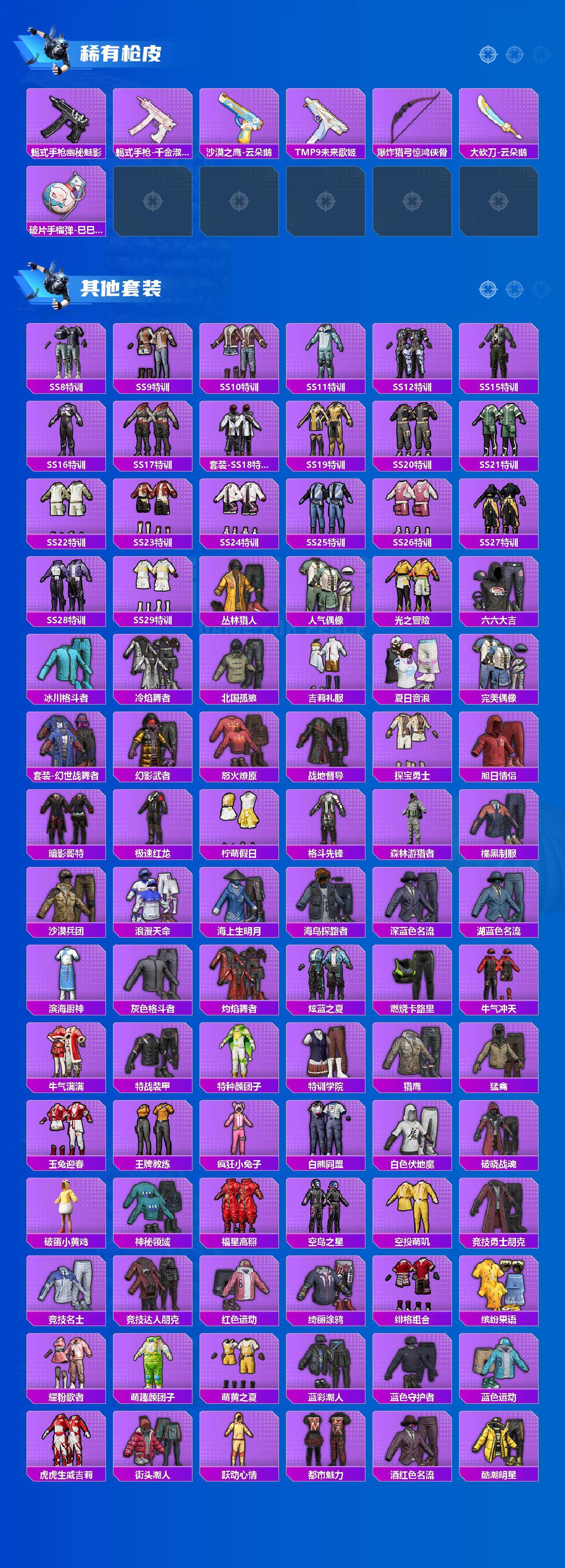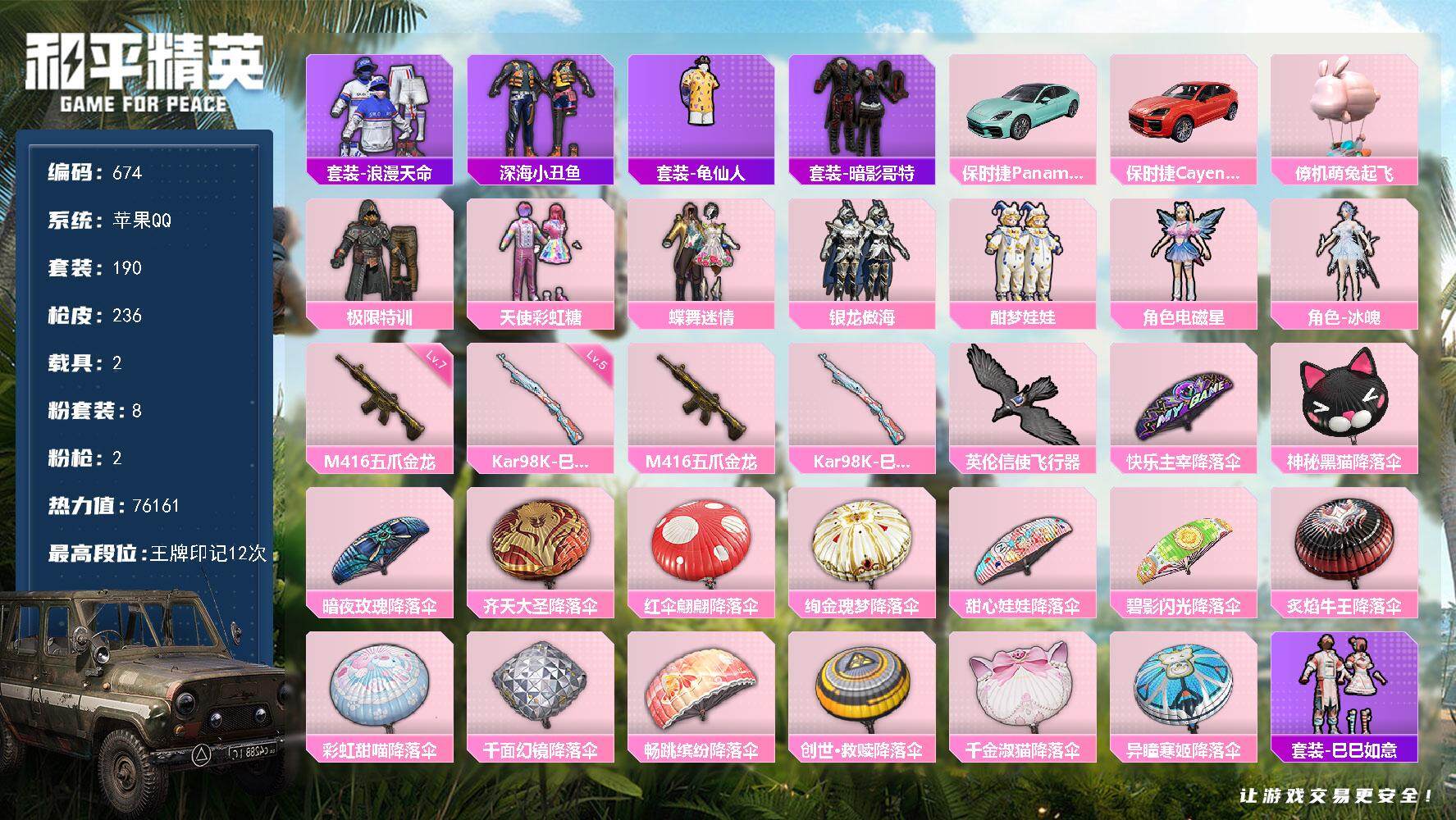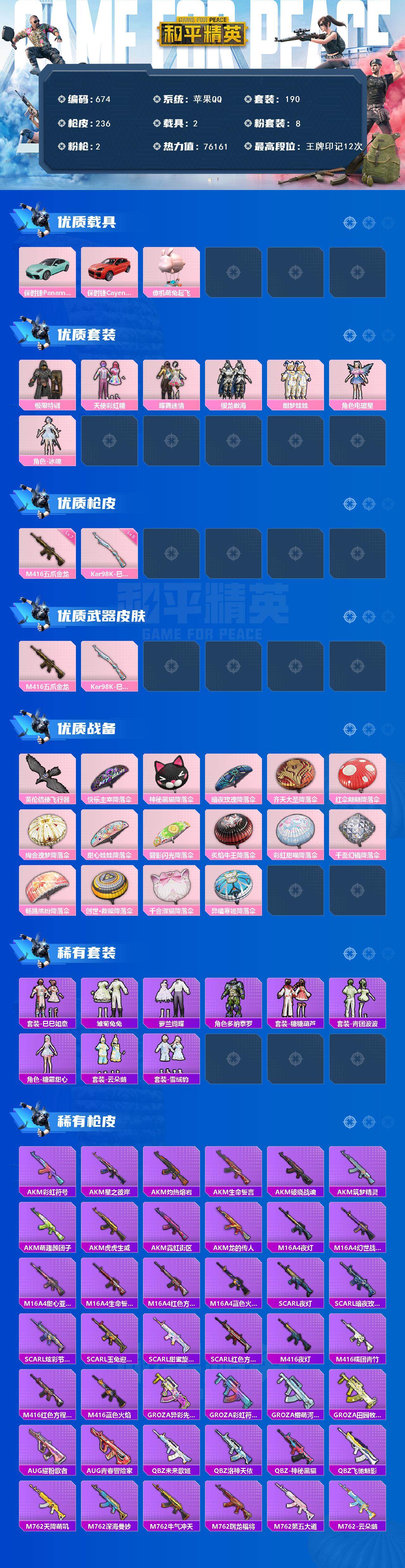 [14559904]苹果 手q-8粉装-2特效呛-2载具-2粉色飞行器-76161热力值-12王牌印记-190套装-236呛皮 【热门品类】:套装-浪漫天命,套装-深海小丑鱼,套装-龟仙人,套装-暗影哥特 【粉色载具】:保时捷panamera(梦幻青),保时捷cayenne(激情红),僚机-萌兔起飞 【粉色套装】:粉装-极限特训,粉装-天使彩虹糖,粉装-蝶舞迷情,粉装-银龙傲海,粉装-酣梦娃娃,角色-电磁星,角色-冰魄 【粉色呛皮等级】:m416-五爪金龙七级,kar98k-巳巳如意五级 【粉色呛皮】:m416-五爪金龙,kar98k-巳巳如意 【粉色飞行器】:英伦信使飞行器 【粉色降落伞】:快乐主宰降落伞,神秘黑猫降落伞,暗夜玫瑰降落伞,齐天大圣降落伞,红伞翩翩降落伞,绚金瑰梦降落伞,甜心娃娃降落伞,碧影闪光降落伞,炙焰牛王降落伞,彩虹甜喵降落伞,千面幻镜降落伞,畅跳缤纷降落伞,创世·救赎降落伞,千金淑猫降落伞,异瞳寒姬降落伞 【稀有套装】:套装-龟仙人,套装-巳巳如意,套装-雏菊兔兔,套装-萝兰蝴蝶,角色-多纳泰罗,套装-糖糖葫芦,套装-青团波波,角色-糖霜甜心,套装-云朵鹅,套装-雪绒豹,套装-炫彩糖果 【稀有呛皮】:aug-冰晶雪宝,akm-彩虹符号,akm-星之彼岸,akm-灼热熔岩,akm-生命誓言,akm-破晓战魂,akm-筑梦精灵,akm-萌趣颜团子,akm-虎虎生威,akm-霓虹街区,akm-龙的传人,m16a4-夜灯,m16a4-幻世战舞者,m16a4-甜心亚梦,m16a4-生命誓言,m16a4-红色方程式,m16a4-蓝色火焰,scar-l-夜灯,scar-l-暗夜玫瑰,scar-l-炫彩节奏,scar-l-玉兔迎春,scar-l-甜蜜旋律,scar-l-红色方程式,m416-夜灯,m416-糯团青竹,m416-红色方程式,m416-蓝色火焰,groza-异彩先驱,groza-彩虹符号,groza-懵萌河马,groza-田园牧歌,aug-耀粉歌者,aug-青春冒险家,q-未来歌姬,q-洛神天依,q-神秘黑猫,q-飞驰魅影,m762-天降萌叽,m762-深海曼妙,m762-牛气冲天,m762-瑞龙福将,m762-第五大道,m762-云朵鹅,mk47-妙红点点,mk47-青春冒险家,g36c-懵萌河马,g36c-时空追击者,g36c-暗夜玫瑰