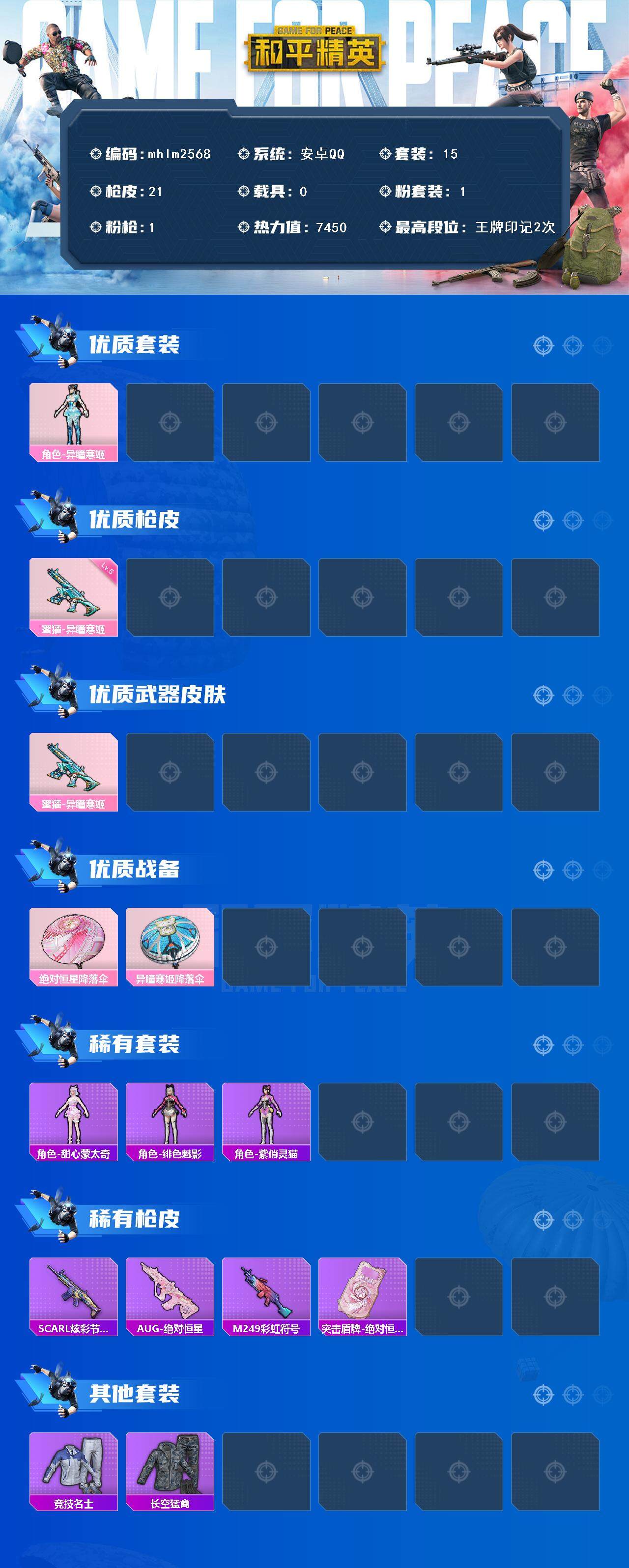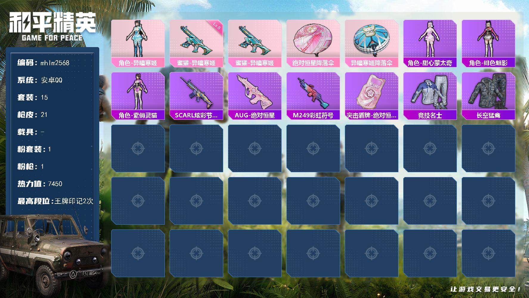 [14567721]【mhlm2568】安卓 手q-1粉装-1特效呛-0载具-1粉色飞行器-7450热力值-2王牌印记-15套装-21呛皮 【粉色套装】:角色-异瞳寒姬 【粉色呛皮等级】:蜜獾-异瞳寒姬五级 【粉色呛皮】:蜜獾-异瞳寒姬 【粉色降落伞】:绝对恒星降落伞,异瞳寒姬降落伞 【稀有套装】:角色-甜心蒙太奇,角色-绯色魅影,角色-紫俏灵猫,套装-炫彩糖果 【稀有呛皮】:aug-冰晶雪宝,scar-l-炫彩节奏,aug-绝对恒星,m249-彩虹符号,突击盾牌-绝对恒星 【其他套装】:套装-竞技名士,套装-长空猛禽 【营地id】:1029315875