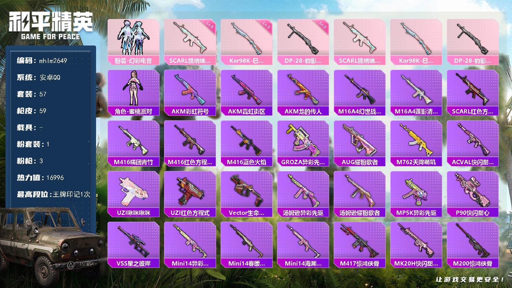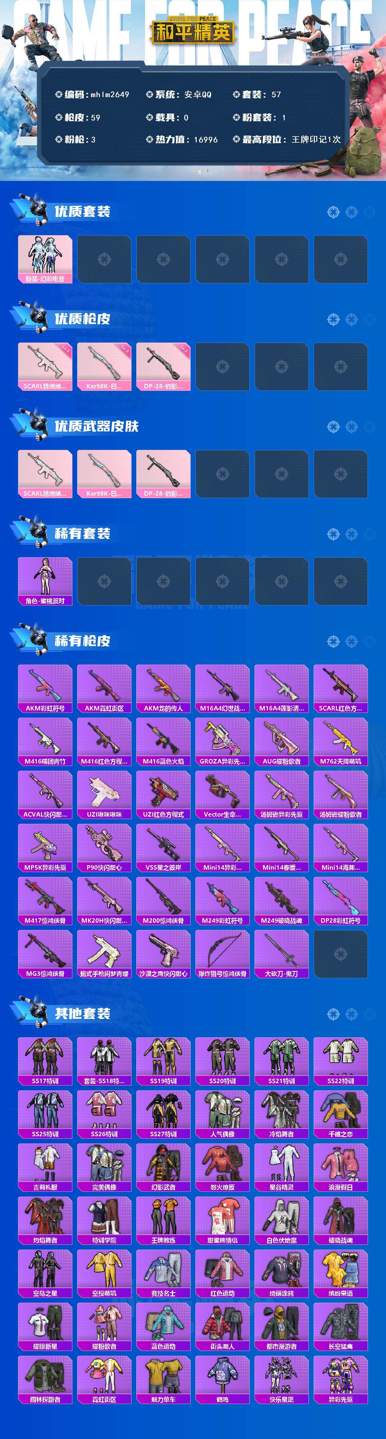 [14572735]【mhlm2649】安卓 手q-1粉装-3特效呛-0载具-0粉色飞行器-16996热力值-1王牌印记-57套装-59呛皮 【粉色套装】:粉装-幻彩电音 【粉色呛皮等级】:scar-l-锦绣绵绵五级,kar98k-巳巳如意三级,dp-28-豹影疾电二级 【粉色呛皮】:scar-l-锦绣绵绵,kar98k-巳巳如意,dp-28-豹影疾电 【稀有套装】:角色-蜜桃派对 【稀有呛皮】:akm-彩虹符号,akm-霓虹街区,akm-龙的传人,m16a4-幻世战舞者,m16a4-莲影清波,scar-l-红色方程式,m416-糯团青竹,m416-红色方程式,m416-蓝色火焰,groza-异彩先驱,aug-耀粉歌者,m762-天降萌叽,ac-val-快闪甜心,uzi-啾咪啾咪,uzi-红色方程式,vect-生命誓言,汤姆逊-异彩先驱,汤姆逊-耀粉歌者,mp5k-异彩先驱,p90-快闪甜心,vss-星之彼岸,mini14-异彩先驱,mini14-春暖花开,mini14-海渊国主,m417-惊鸿侠骨,mk20-h-快闪甜心,m200-惊鸿侠骨,m249-彩虹符号,m249-破晓战魂,dp-28-彩虹符号,mg3-惊鸿侠骨,蝎式手呛-闲梦青缨,沙墨之鹦-快闪甜心,爆炸猎弓-惊鸿侠骨,大砍刀-鬼刀 【其他套装】:套装-ss17特训,套装-ss18特训,套装-ss19特训,套装-ss20特训,套装-ss21特训,套装-ss22特训,套装-ss25特训,套装-ss26特训,套装-ss27特训,套装-人气偶像,套装-冷焰舞者,套装-千禧之恋,套装-吉莉礼服,套装-完美偶像,套装-幻影武者,套装-怒火燎原,套装-星谷精灵,套装-浪漫假日,套装-灼焰舞者,套装-特训学院,套装-王牌教练,套装-甜蜜熊情侣,套装-白色伏地魔,套装-破晓战魂,套装-空岛之星,套装-空投萌叽,套装-竞技名士,套装-红色运动,套装-绮丽涂鸦,套装-缤纷果语,套装-耀眼新星,套装-耀粉歌者,套装-蓝色运动,套装-街头潮人,套装-都市漫游者,套装-长空猛禽,套装-雨林探路者,套装-霓虹街区,套装-魅力单车,套装-鹤鸣,套装-快乐星愿,套装-异彩先驱,套装-霓虹极客,套装-惊鸿侠骨,套装-锦衣飞扬,套装-快闪甜心,套装-春光漫游,套装-贝斯之夜 【稀有背包】:深海小丑鱼背包2级 【营地id】:92779257