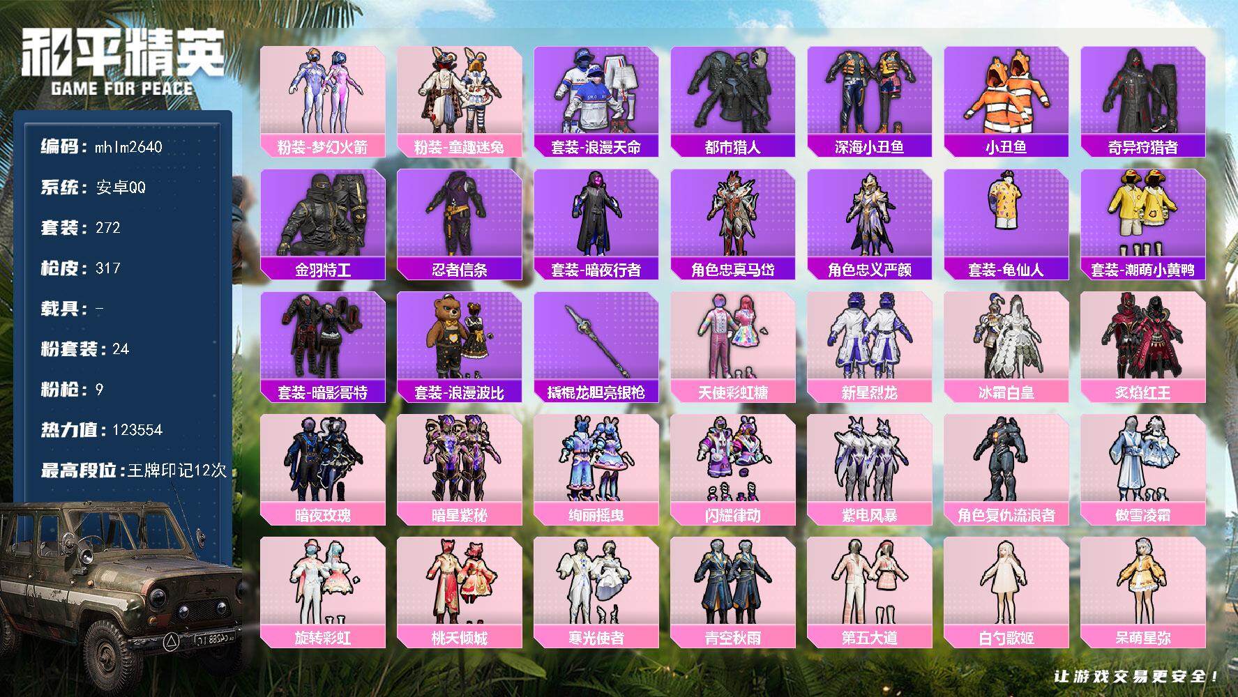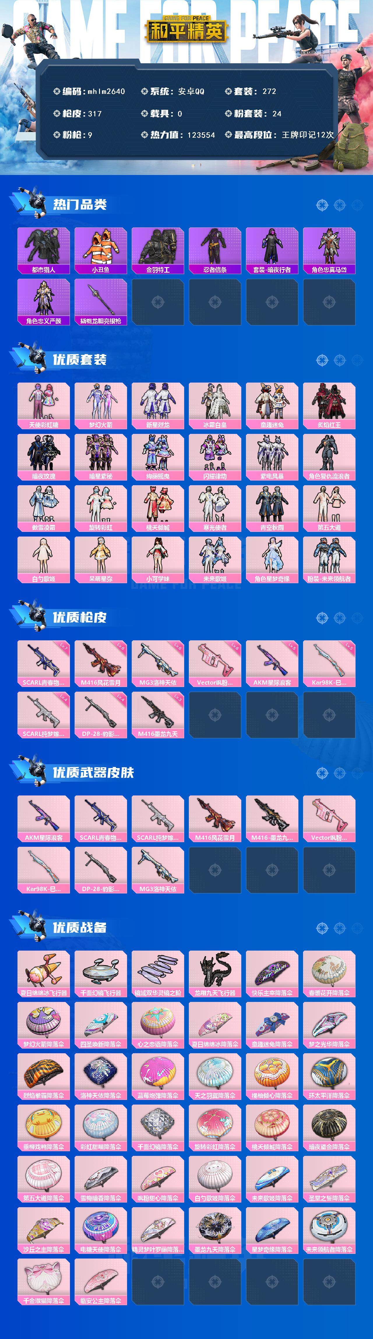[14573592]【mhlm2640】安卓 手q-24粉装-9特效呛-0载具-4粉色飞行器-123554热力值-12王牌印记-272套装-317呛皮 【热门品类】:粉装-梦幻火箭,粉装-童趣迷兔,套装-浪漫天命,套装-都市猎人,套装-深海小丑鱼,套装-小丑鱼,套装-奇异狩猎者,套装-金羽特工,套装-忍者信条,套装-暗夜行者,角色-忠真马岱,角色-忠义严颜,套装-龟仙人,套装-潮萌小黄鸭,套装-暗影哥特,套装-浪漫波比,撬棍-龙胆亮银呛 【粉色套装】:粉装-天使彩虹糖,粉装-梦幻火箭,粉装-新星烈龙,粉装-冰霜白皇,粉装-童趣迷兔,粉装-炙焰红王,粉装-暗夜玫瑰,粉装-暗星紫秘,粉装-绚丽摇曳,粉装-闪耀律动,粉装-紫电风暴,角色-复仇流浪者,粉装-傲雪凌霜,粉装-旋转彩虹,粉装-桃夭倾城,粉装-寒光使者,粉装-青空秋雨,粉装-第五大道,角色-白勺歌姬,角色-呆萌星弥,角色-小可学妹,粉装-未来歌姬,角色-星梦奇缘,粉装-未来领航者 【粉色呛皮等级】:akm-星际浪客五级,scar-l-青春物语七级,scar-l-纯梦嫁纱四级,m416-风花雪月六级,m416-墨龙九天三级,vect-飒粉甜心六级,kar98k-巳巳如意五级,dp-28-豹影疾电四级,mg3-洛神天依六级 【粉色呛皮】:akm-星际浪客,scar-l-青春物语,scar-l-纯梦嫁纱,m416-风花雪月,m416-墨龙九天,vect-飒粉甜心,kar98k-巳巳如意,dp-28-豹影疾电,mg3-洛神天依 【粉色飞行器】:夏日绵绵冰飞行器,千面幻镜飞行器,镜域双华-灵镜之阶,龙翔九天飞行器 【粉色降落伞】:快乐主宰降落伞,春暖花开降落伞,梦幻火箭降落伞,四圣焕新降落伞,心之恋语降落伞,夏日绵绵冰降落伞,童趣迷兔降落伞,梦之光华降落伞,烈焰拳霸降落伞,洛神天依降落伞,蓝莓炮弹降落伞,天之羽翼降落伞,橘柚倾心降落伞,环太平洋降落伞,垂柳戏鸭降落伞,彩虹甜喵降落伞,千面幻镜降落伞,旋转彩虹降落伞,桃夭倾城降落伞,暗夜鎏金降落伞,第五大道降落伞,雪梅暗香降落伞,飒粉甜心降落伞,白勺歌姬降落伞,未来歌姬降落伞,圣堂之誓降落伞,沙丘之主降落伞,电糖天使降落伞,精灵梦叶罗丽降落伞,墨龙九天降落伞,星梦奇缘降落伞,未来领航者降落伞,千金淑猫降落伞,临安公主降落伞 【稀有套装】:套装-龟仙人