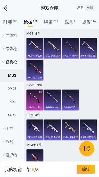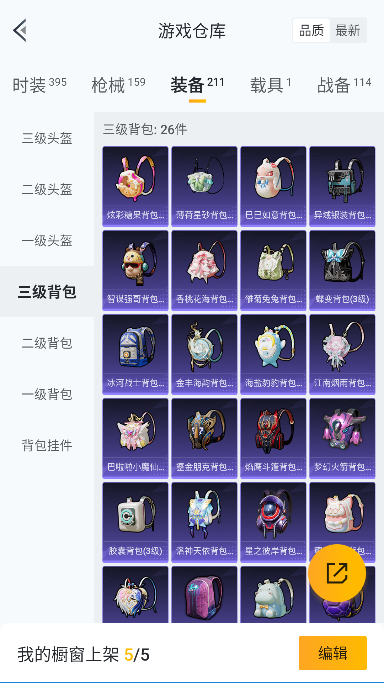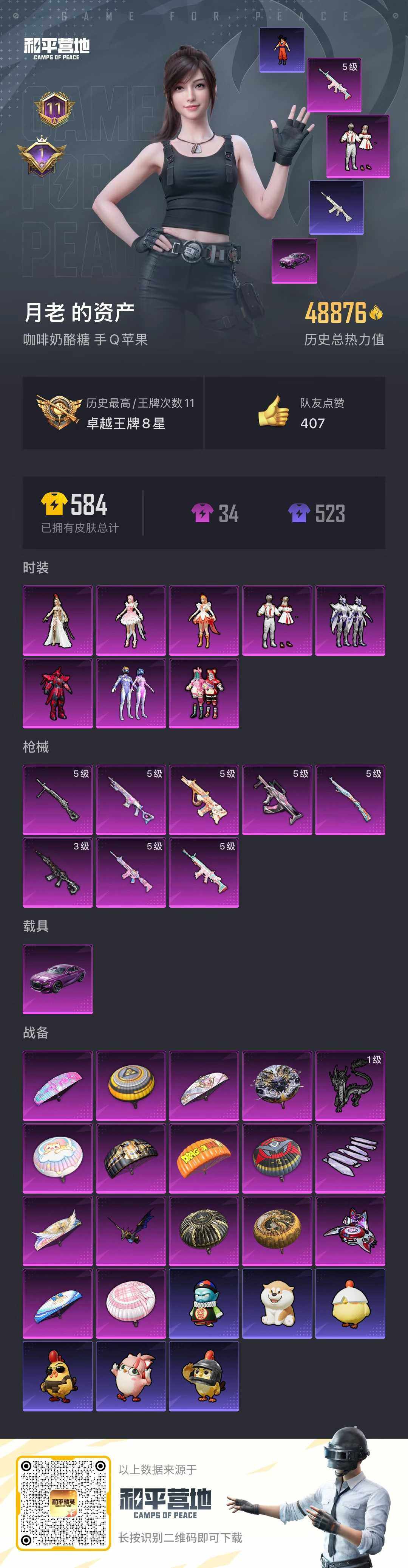 [14581321]实名: 可修改 时装数: 106 载具数: 1 呛械数: 159 战备数: 114 热门装扮: 俏皮狐尾炙焰赤龙紫电风暴冰川红玫美雪小蓝萨利娅 载具: 宾利batur极速紫 稀有呛皮: scar-l-锦绣绵绵五级,m416-电玩时刻五级,m416-墨龙九天三级,groza-镜光银凌五级,aug-暖羊咩咩五级,kar98k-巳巳如意五级,mk14-甜梦熊击五级,dp-28-豹影疾电五级
