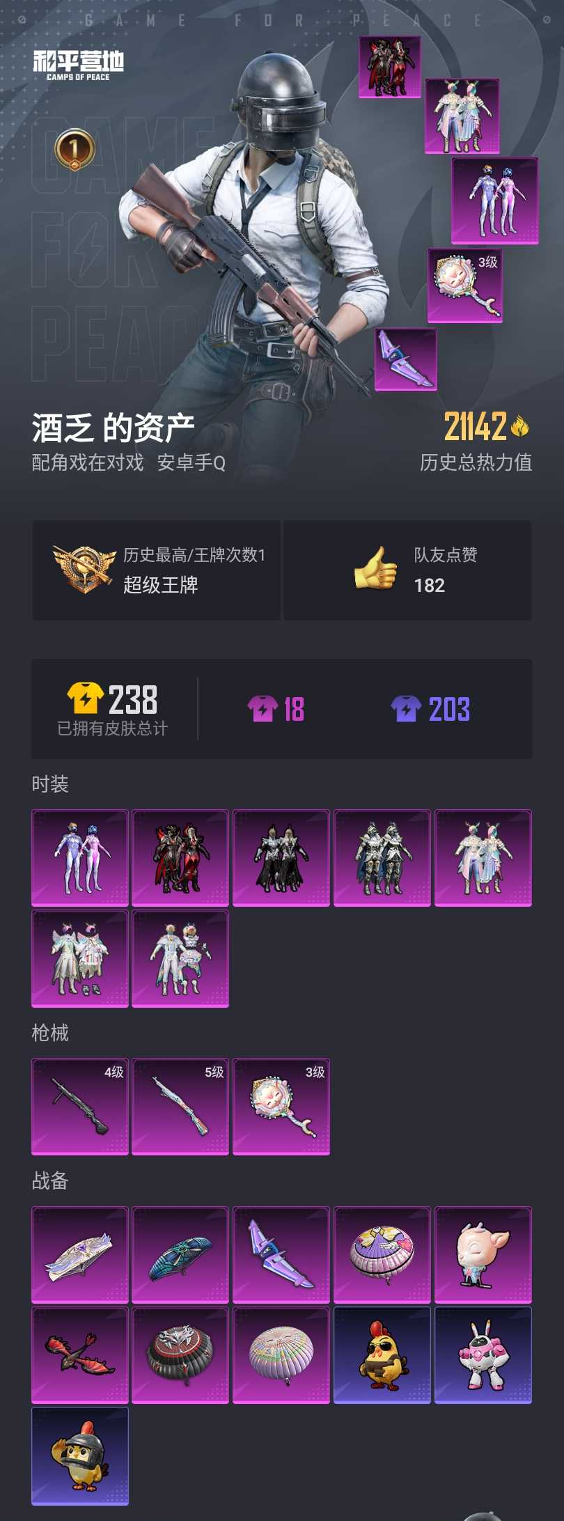 【和平精英】【lyhp17862】7粉装3特效呛 梦幻火箭 彩虹鹿灵 7粉装,3特效呛,0载具,历史最高段位:超级王牌 王牌印记1次 热力值:21142,45套装,67呛械,75装备,40战备;套装:套装-梦幻火箭,套装-林间仙鹿,套装-彩虹鹿灵,套装-山涧鹿灵,套装-焰龙焚天,套装-银龙傲海,套装-骨龙祭渊,套装-特训学院,套装-竞技名士,套装-猛禽,套装-长空猛禽,套装-特殊使命,套装-甜蜜告白,套装-魅力单车,套装-绮丽涂鸦,套装-耀眼新星,套装-竞技达人朋克,套装-野性战心,套装-金耀舞者,套装-龙魂突击队,套装-冰川特警,套装-战术大师,套装-飞行日记,角色-迪迦奥特曼,套装-ss17特训,套装-醒狮腾龙,套装-瑞龙福将,套装-团圆交子,套装-福星高照,套装-虎虎生威吉莉,套装-ss22特训,套装-光之冒险,套装-ss23特训,套装-王牌教练,套装-ss24特训,套装-空岛之星,套装-恋语绒绒,套装-海盐绵绵冰,套装-异域银装,套装-ss31特训,套装-智谋强哥,套装-ss33特训,套装-ss32特训,套装-星渊小夜曲,套装-薄荷星砂;呛皮:scar-l-暗夜玫瑰,scar-l-星途旅人,m762-瑞龙福将,m762-天降萌叽,aug-焰龙焚天,aug-异域银装,aug-紫晶流影,mk47-林间仙鹿,famas-乌木金纹,akm-生命誓言,akm-破晓战魂,akm-彩虹符号,akm-虎虎生威,m416-蓝色火焰,groza-林间仙鹿,蜜獾-天降萌叽,蜜獾-鸡智如我,蜜獾-乌木金纹,m16a4-凝视深渊,g36c-乌木金纹,q-电玩视界,win94-瑞龙福将,5级kar98k-巳巳如意,kar98k-梦幻火箭,kar98k-电玩视界,m200-乌木金纹,m24-奇异狩猎者,莫辛纳甘-乌木金纹,amr-鬼刀,mini14-梦幻火箭,mini14-林间仙鹿,mini14-香桃花海,sks-炫彩节奏,vss-香桃花海,m417-玩趣呆呆,汤姆逊-林间仙鹿,uzi-炫彩节奏,uzi-天降萌叽,uzi-冰河战士,ump45-蓝色火焰,ump45-海盐豹豹,mp5k-焰龙焚天,aks-74u-鸡智如我,vect-暗夜玫瑰,p90-巳巳如意,spas-12-乌木金纹,dbs-圣堂之誓,dbs-乌木金纹,s12k-瑞龙福将,s12k-玩趣呆呆,s686-红色方程式,mg3-瑞龙福将,mg3-乌木金纹,pkm-啾咪啾咪,4级dp-28-豹影疾电,dp-28-齐天大圣,m249-焰龙焚天,m249-糯团青竹,蝎式手呛-焰龙焚天,3级平底锅-林间仙鹿,平底锅-瑞龙福将,平底锅-光之冒险,平底锅-空岛之星,平底锅-属我最6,十子怒-异域银装,盐雾蛋-冰氧夏日,破片手留单-呆爆全场;降落伞:梦幻火箭飞行器,林间仙鹿飞行器,焰龙焚天飞行器,异域银装飞行器,顶峰精英尾迹; 详情看图