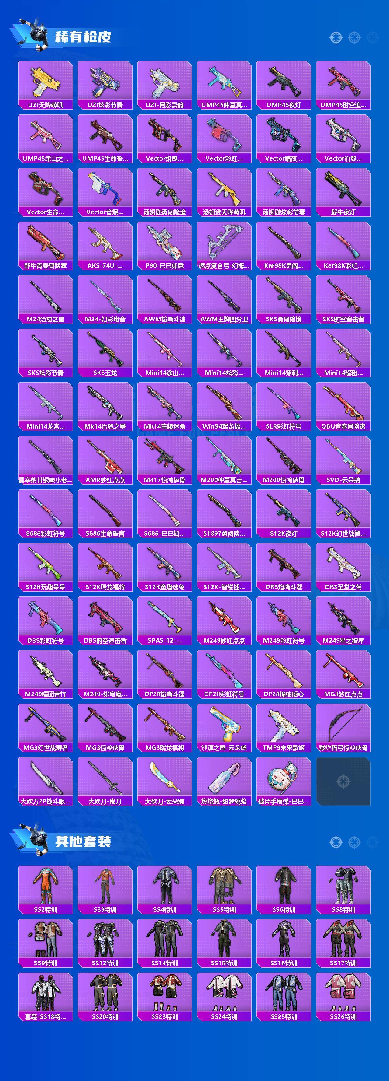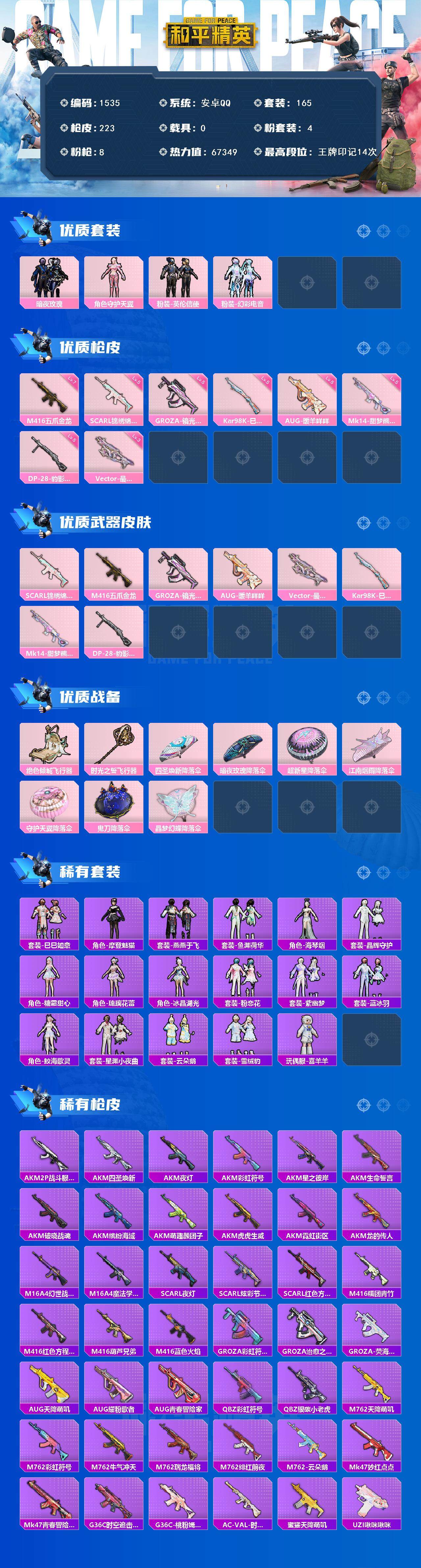 0载具-165套装-223呛皮-165套装/呛械8/装备290/战备164/王牌印记14/热力值67349/五级scar-l-锦绣绵绵/七级m416-五爪金龙/五级groza-镜光银凌/五级aug-暖羊咩咩/三级vect-最终圣卫者/五级kar98k-巳巳如意/五级mk14-甜梦熊击/五级dp-28-豹影疾电/套装-龟仙人/角色-mark.06/暗夜玫瑰/守护天翼/粉装-英伦信使/粉装-幻彩电音/scar-l-锦绣绵绵/