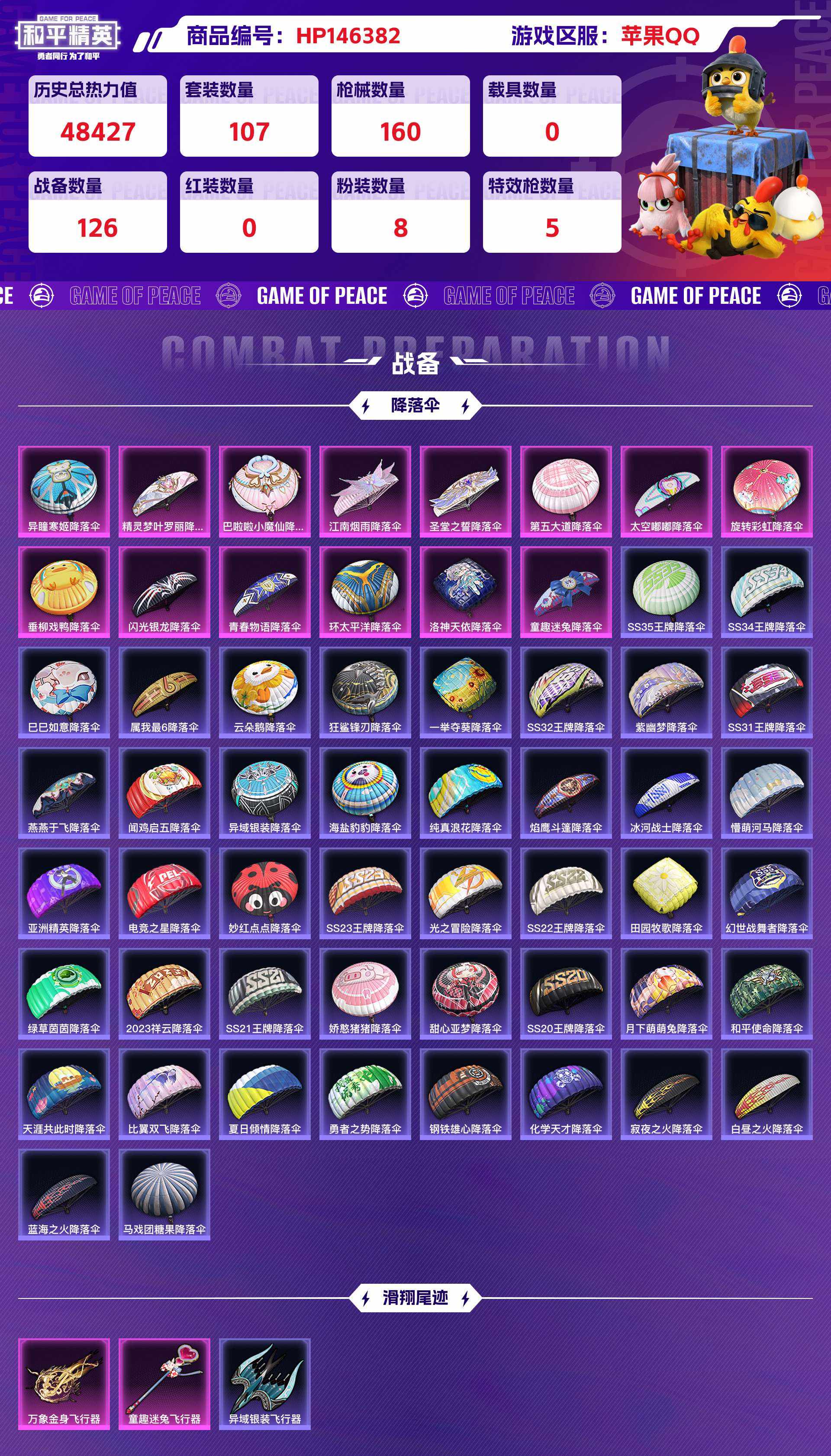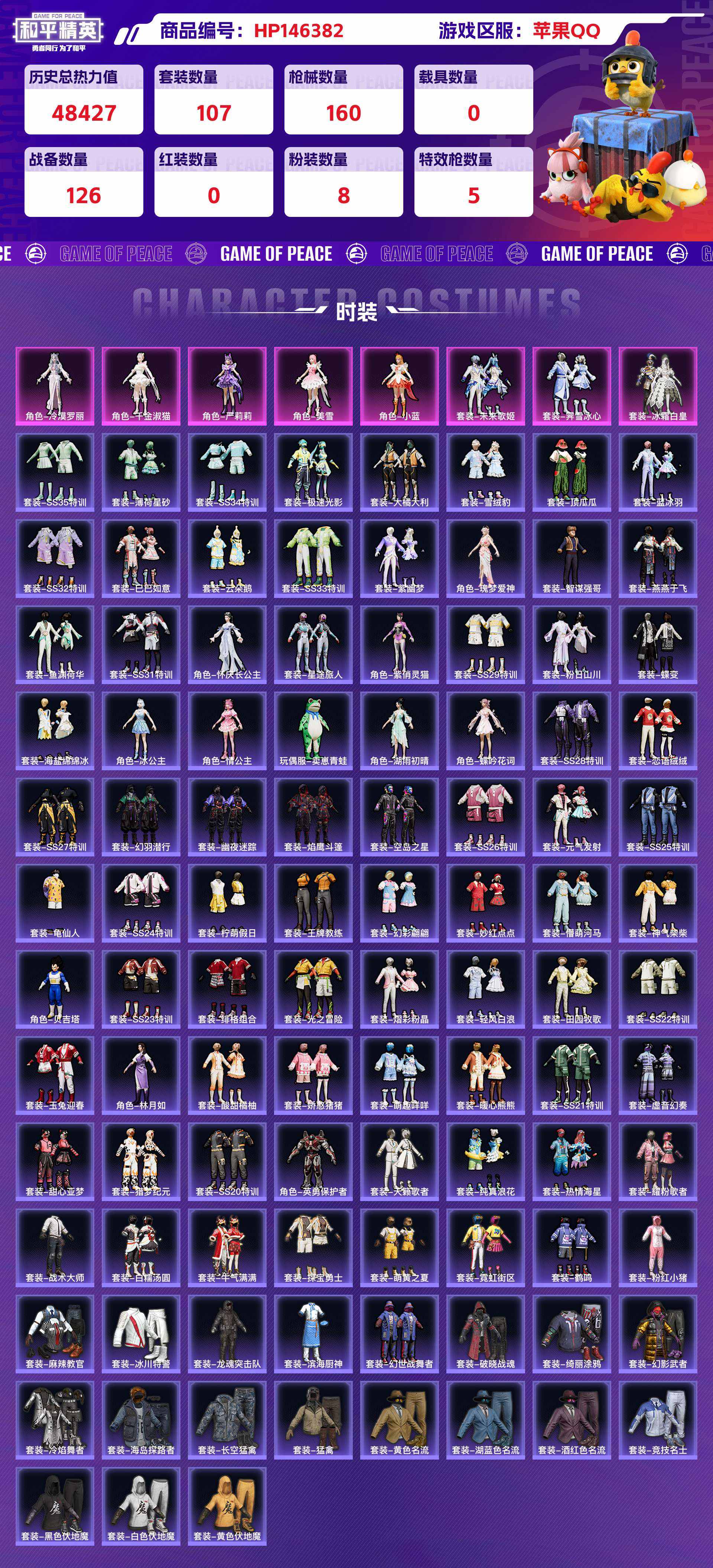hp146382|精品和平脱坑号低价出 苹果qq8粉装(冷漠罗丽 午金淑猫严莉莉 美雪小蓝未来歌姬霁雪冰心冰霜白皇) 5粉呛(m416-电玩时刻 kar98k-巳巳如意 pkm-江南烟雨dp-28-豹影疾电) 1个七级(groza-巴啦啦)