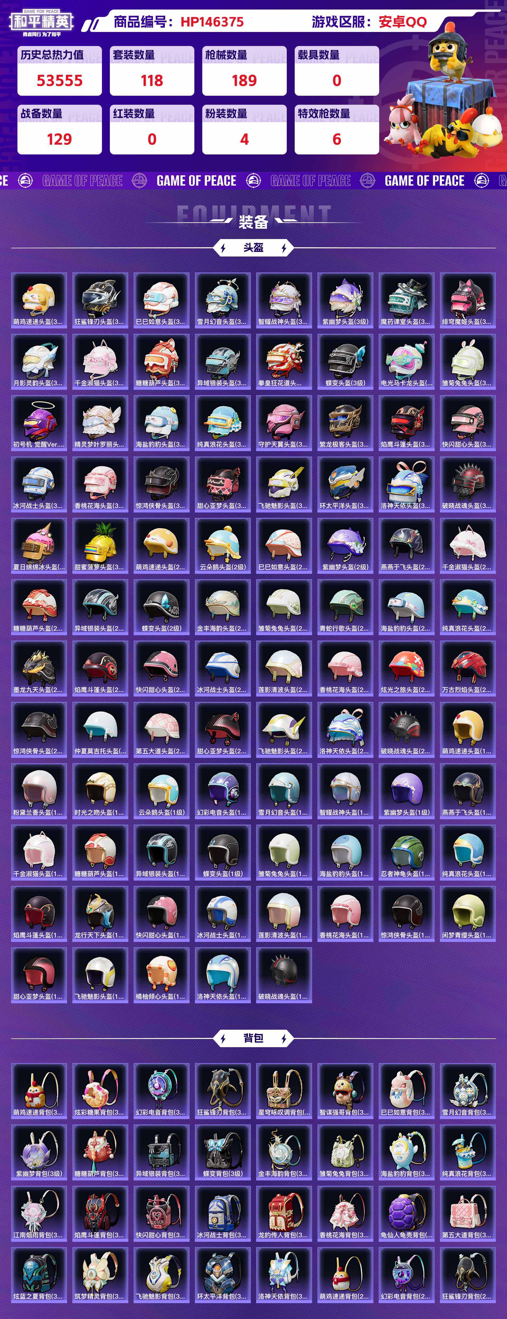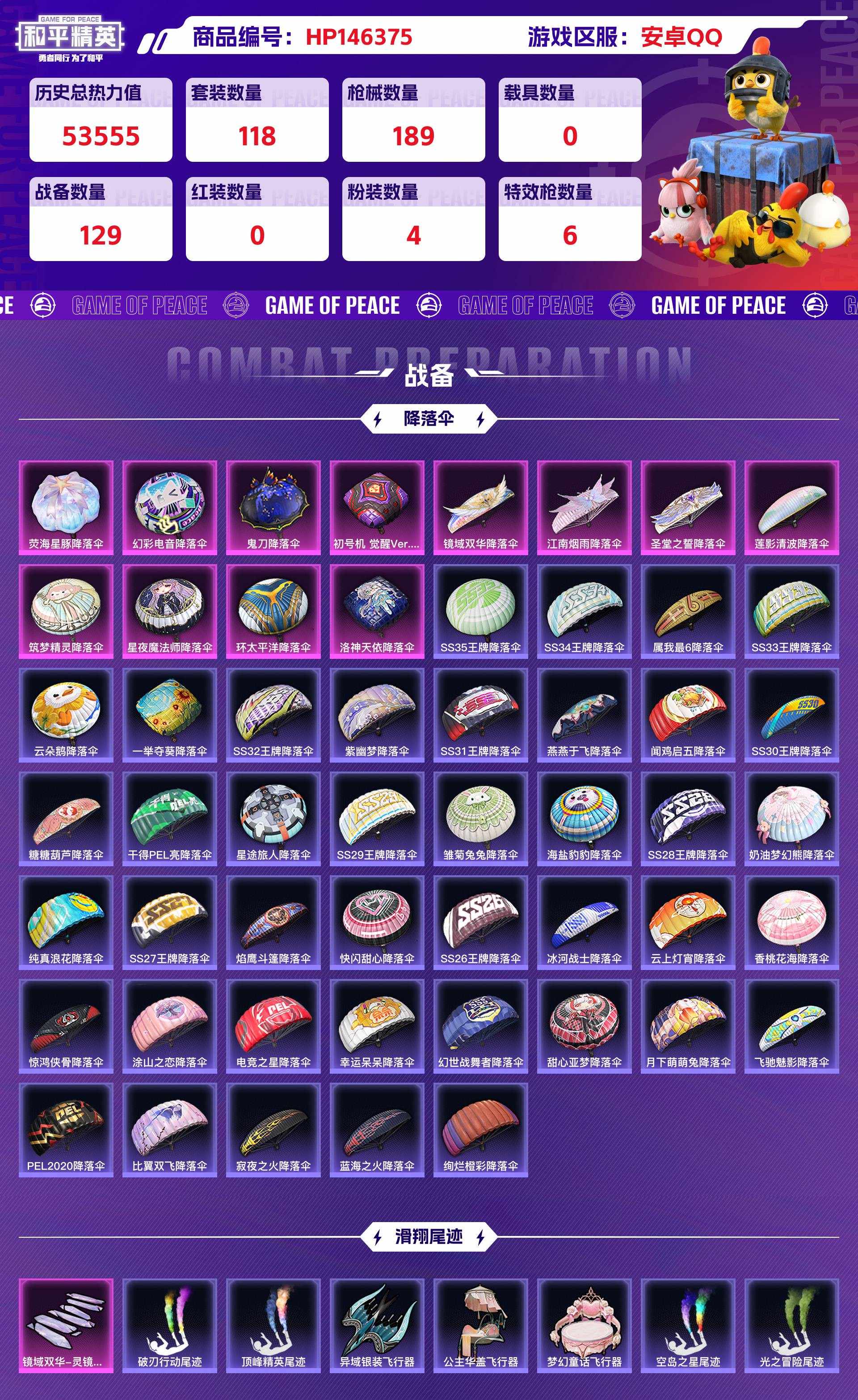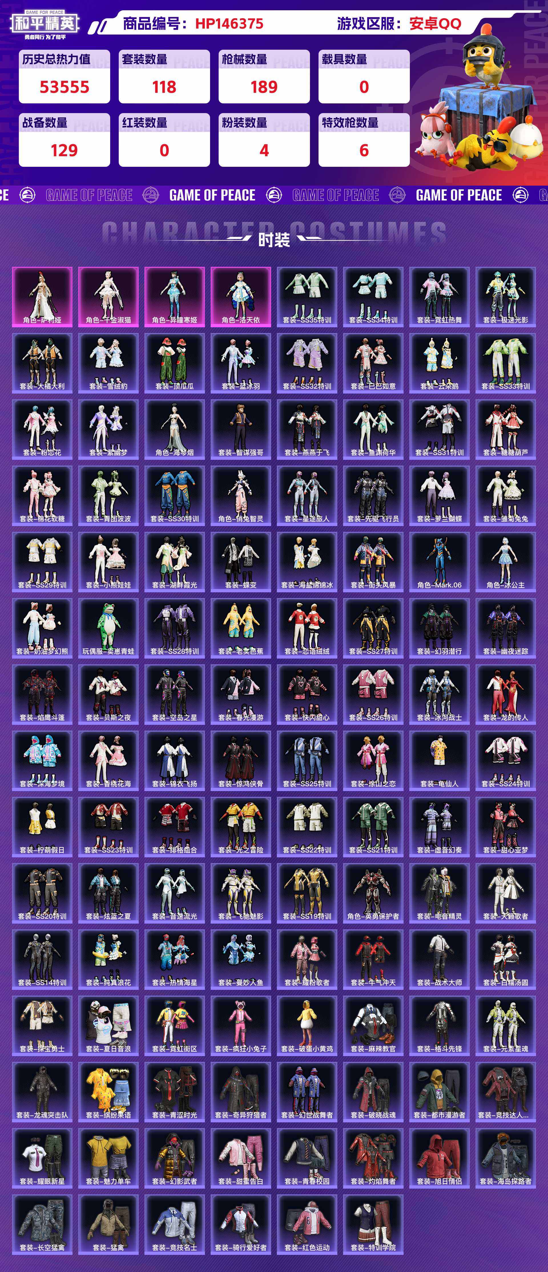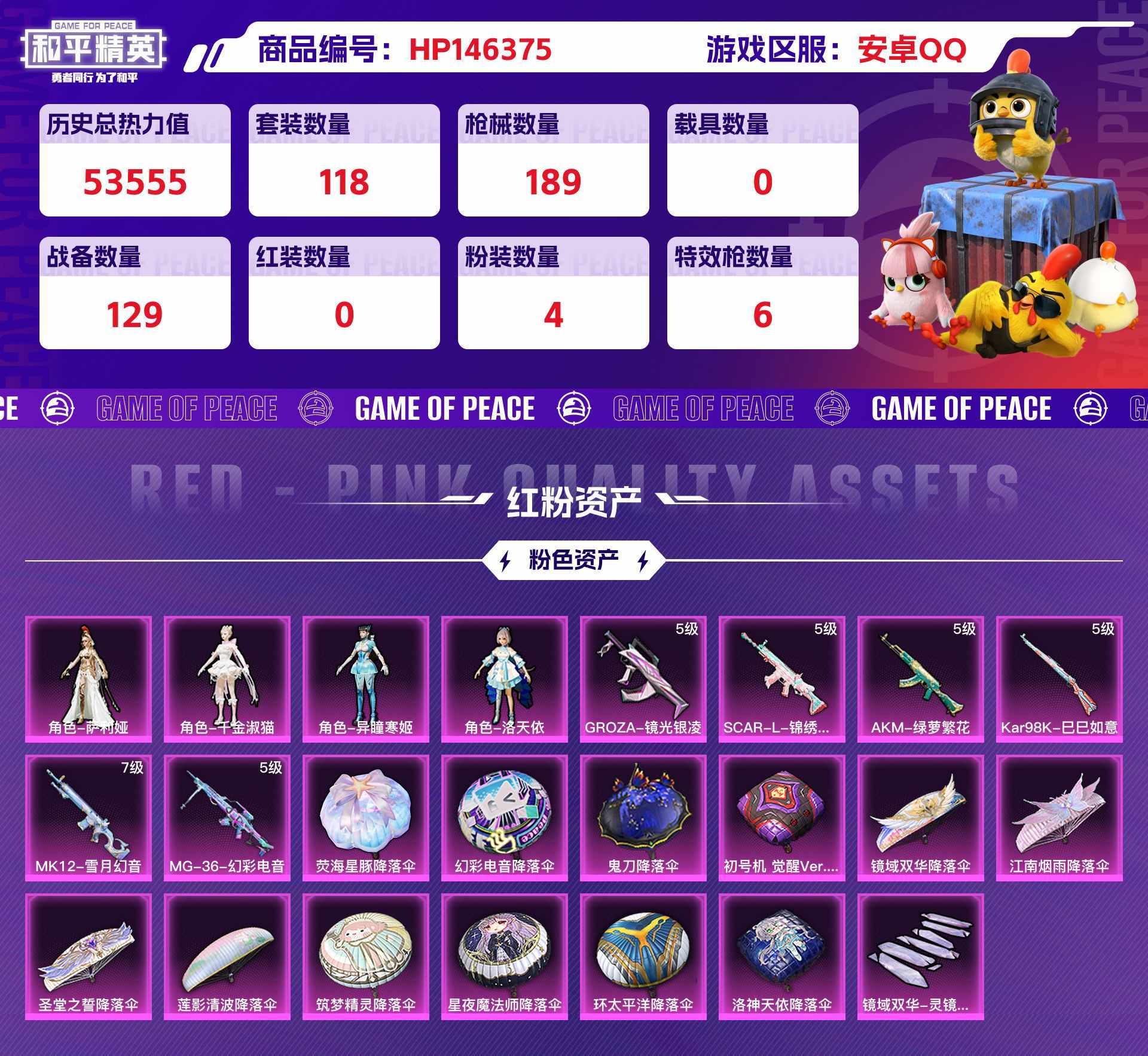 hp146375|精品和平脱坑号低价出 安卓qq 4粉装(萨莉娅 午金淑猫 异瞳寒姬 洛天依) 6粉呛 (kar98k-巳巳如意 mk12-雪月幻音 mg-36-幻彩电音groza-镜光银凌 scar-l-锦绣akm-绿萝繁花)1个七级(mk12-雪月幻音)