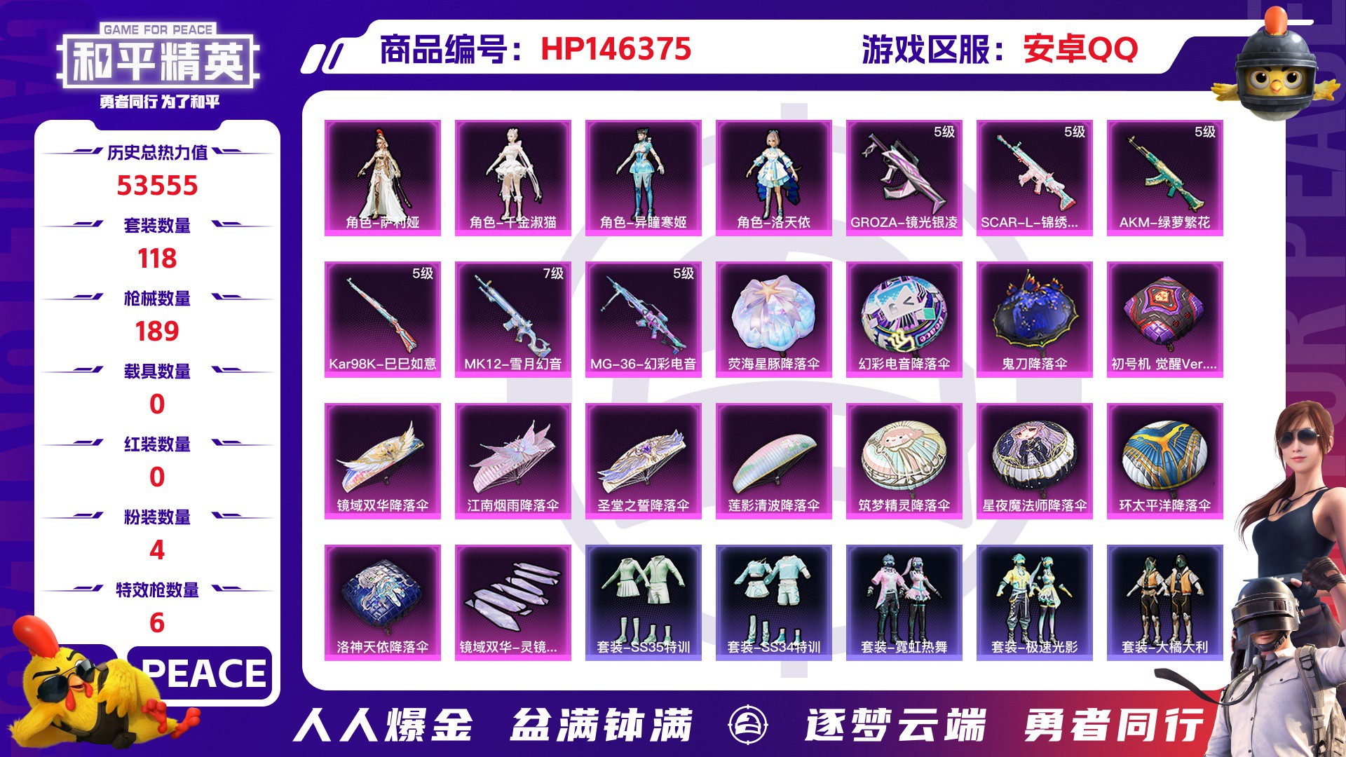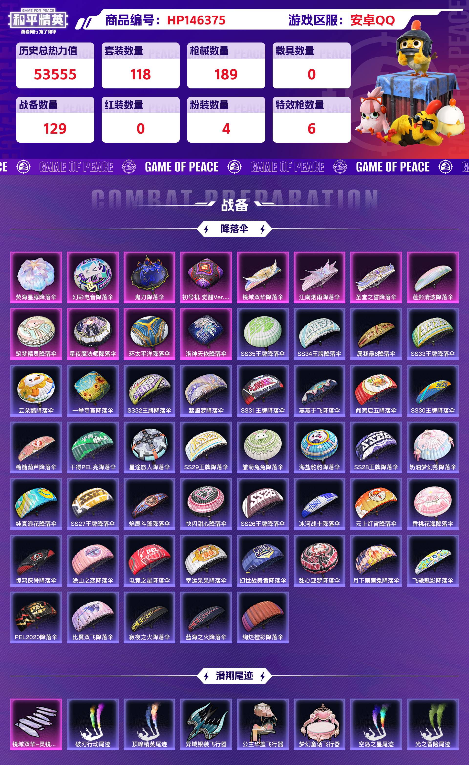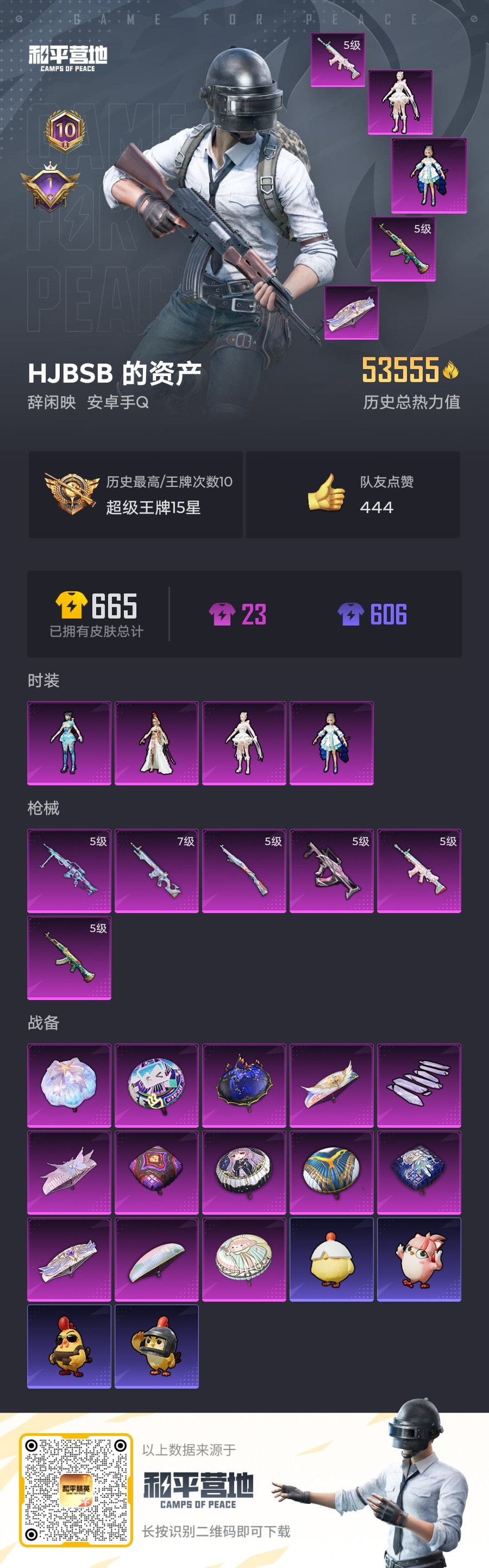 _2306869-安卓qq历史总热力值:53555粉装数量:4特效呛数量:6王牌印记:10历史最高段位:超级王牌15星套装数量:118时装数量:420呛械数量:189战备数量:129装备数量:229时装:角色-千金淑猫角色-异瞳寒姬角色-洛天依角色-萨利娅套装-ss14特训套装-ss19特训套装-ss20特训套装-ss21特训套装-ss22特训套装-ss23特训套装-ss24特训套装-ss25特训套装-ss26特训套装-ss27特训套装-ss28特训套装-ss29特训套装-ss30特训套装-ss31特训套装-ss32特训套装-ss33特训套装-ss34特训套装-ss35特训套装-云朵鹅套装-元素星魂套装-先驱飞行员套装-光之冒险套装-冰河战士套装-夏日音浪套装-大橘大利套装-天籁歌者套装-奇异狩猎者套装-奶油梦幻熊套装-小熊娃娃套装-巳巳如意套装-幻世战舞者套装-幻影武者套装-幻羽潜行套装-幽夜迷踪套装-快闪甜心套装-恋语绒绒套装-惊鸿侠骨套装-战术大师套装-探宝勇士套装-旭日情侣套装-星途旅人套装-春光漫游套装-智谋强哥套装-曼妙人鱼套装-极速光影套装-柠萌假日套装-格斗先锋套装-棉花软糖套装-海岛探路者套装-海盐绵绵冰套装-涂山之恋套装-深海梦境套装-湖畔霞光套装-灼焰舞者套装-炫蓝之夏套装-热情海星套装-焰鹰斗篷套装-燕燕于飞套装-牛气冲天套装-特训学院套装-猛禽套装-甜心亚梦套装-甜蜜告白套装-电音精灵套装-疯狂小兔子套装-白糯汤圆套装-破晓战魂套装-破蛋小黄鸡套装-空岛之星套装-竞技名士套装-竞技达人朋克套装-粉恋花套装-糖糖葫芦套装-紫幽梦套装-红色运动套装-纯真浪花套装-绯格组合套装-缤纷果语套装-耀眼新星套装-耀粉歌者套装-老实芭蕉套装-萝兰蝴蝶套装-蓝冰羽套装-虚音幻奏套装-蝶变套装-街头风暴套装-贝斯之夜套装-都市漫游者套装-锦衣飞扬套装-长空猛禽套装-雏菊兔兔套装-雪绒豹套装-霓虹热舞套装-霓虹街区套装-青团波波套装-青春校园套装-青涩时光套装-音速流光套装-顶瓜瓜套装-飞驰魅影套装-香桃花海套装-骑行爱好者套装-魅力单车套装-鱼渊荷华套装-麻辣教官套装-龙的传人套装-龙魂突击队套装-龟仙人玩偶服-卖崽青蛙角色-mark.06角色-俏兔智灵角色-冰公主角色-海琴烟角色-英勇保护者呛械:akm-绿萝繁花5级groza-镜光银凌5级scar-l-锦绣绵绵5级ac-val-乌木金纹ac-val-天降萌叽ac-val-快闪甜心ac-val-甜心亚梦akm-夜灯akm-江南烟雨akm-破晓战魂akm-龙的传人aug-天降萌叽aug-异域银装aug-甜蜜菠萝aug-耀粉歌者famas-霓彩脉冲g36c-星穹咏叹调g36c-炙焰牛王g36c-镜域双华groza-海盐豹豹m16a4-冰河战士m16a4-幻世战舞者m16a4-甜心亚梦m16a4-红色方程式m416-摩登王国m416-月影鸳鸯m416-红色方程式m762-云朵鹅m762-天降萌叽m762-雏菊兔兔mk47-乌木金纹mk47-摩登王国mk47-洛神天依q-彩虹符号q-洛神天依q-纯真浪花q-飞驰魅影scar-l-拳皇·狂花道scar-l-星途旅人scar-l-海盐豹豹scar-l-玉兔迎春scar-l-红色方程式蜜獾-天降萌叽蜜獾-糖糖葫芦kar98k-巳巳如意5级awm-恐龙拽拽awm-焰鹰斗篷awm-盛世惊鸿awm-纯真浪花kar98k-洛神天依kar98k-炫彩节奏kar98k-顶峰精英kar98k-飞驰魅影m200-惊鸿侠骨m24-幻彩电音m24-炫彩节奏svd-云朵鹅莫辛纳甘-乌木金纹莫辛纳甘-蜜语绒猫mk12-雪月幻音7级m417-惊鸿侠骨mk20-h-快闪甜心mk20-h-星途旅人mk20-h-白蛇盈舞mk20-h-糖糖葫芦mini14-耀粉歌者mini14-雏菊兔兔mini14-香桃花海mk14-乌木金纹mk14-冰河战士mk14-紫幽梦sks-天之羽翼sks-炫彩节奏slr-守护天翼slr-霓彩脉冲vss-彩虹符号vss-香桃花海aks-74u-鬼刀p90-巳巳如意p90-快闪甜心p90-玩趣呆呆p90-飞驰魅影ump45-海盐豹豹ump45-涂山之恋ump45-生命誓言ump45-糖糖葫芦ump45-蓝色火焰uzi-冰河战士uzi-啾咪啾咪uzi-天降萌叽uzi-红色方程式vect-彩虹符号vect-焰鹰斗篷vect-燕燕于飞vect-龙行天下汤姆逊-天降萌叽汤姆逊-樱桃泡泡汤姆逊-炫彩节奏汤姆逊-环太平洋汤姆逊-纯真浪花汤姆逊-耀粉歌者野牛-奶油梦幻熊野牛-燕燕于飞野牛-雏菊兔兔aa12-g-纯真浪花dbs-圣堂之誓dbs-月影灵韵dbs-焰鹰斗篷dbs-甜心亚梦s12k-幻世战舞者s12k-玩趣呆呆s1897-精灵梦叶罗丽s1897-糯团青竹s1897-紫幽梦s1897-飞驰魅影s686-巳巳如意s686-彩虹符号s686-生命誓言s686-红色方程式s686-蜜语绒猫s686-雪月幻音spas-12-云朵鹅spas-12-燕燕于飞mg-36-幻彩电音5级dp-28-彩虹符号dp-28-橘柚倾心dp-28-焰鹰斗篷dp-28-甜心亚梦m249-彩虹符号m249-破晓战魂m249-糯团青竹mg3-乌木金纹mg3-幻世战舞者mg3-惊鸿侠骨pkm-啾咪啾咪pkm-明月桂语pkm-紫幽梦p18c-糖糖葫芦p1911-创世·救赎p92-紫幽梦r1895-雏菊兔兔r45-幻彩电音tmp-9-江南烟雨沙墨之鹦-云朵鹅沙墨之鹦-快闪甜心沙墨之鹦-羲和光序短管霰弹-星穹咏叹调蝎式手呛-千金淑猫蝎式手呛-燕燕于飞蝎式手呛-金丰海韵蝎式手呛-闲梦青缨大砍刀-云朵鹅平底锅-光之冒险平底锅-快闪甜心平底锅-惊鸿侠骨平底锅-焰鹰斗篷平底锅-甜心亚梦平底锅-空岛之星平底锅-糖糖葫芦平底锅-紫幽梦平底锅-纯真浪花平底锅-雏菊兔兔平底锅-飞驰魅影撬棍-幻世战舞者撬棍-环太平洋十子怒-异域银装十子怒-燕燕于飞燃烧瓶-甜梦桃焰爆炸猎弓-惊鸿侠骨破片手留单-呆爆全场破片手留单-巳巳如意破片手留单-拽到爆炸破片手留单-星途旅人破片手留单-海盐豹豹战备:镜域双华-灵镜之阶光之冒险尾迹公主华盖飞行器异域银装飞行器梦幻童话飞行器破刃行动尾迹空岛之星尾迹顶峰精英尾迹初号机觉醒ver.降落伞圣堂之誓降落伞幻彩电音降落伞星夜魔法师降落伞江南烟雨降落伞洛神天依降落伞环