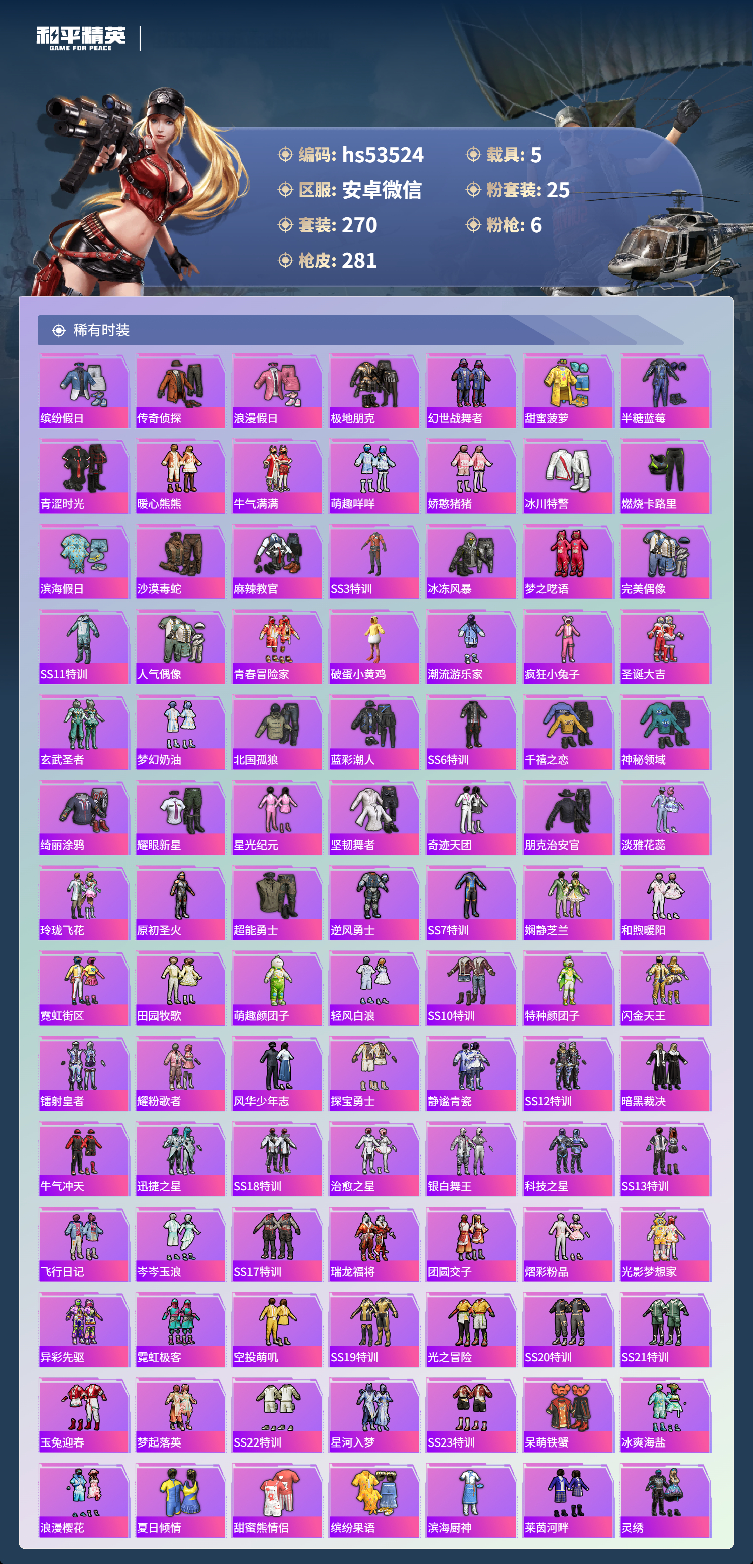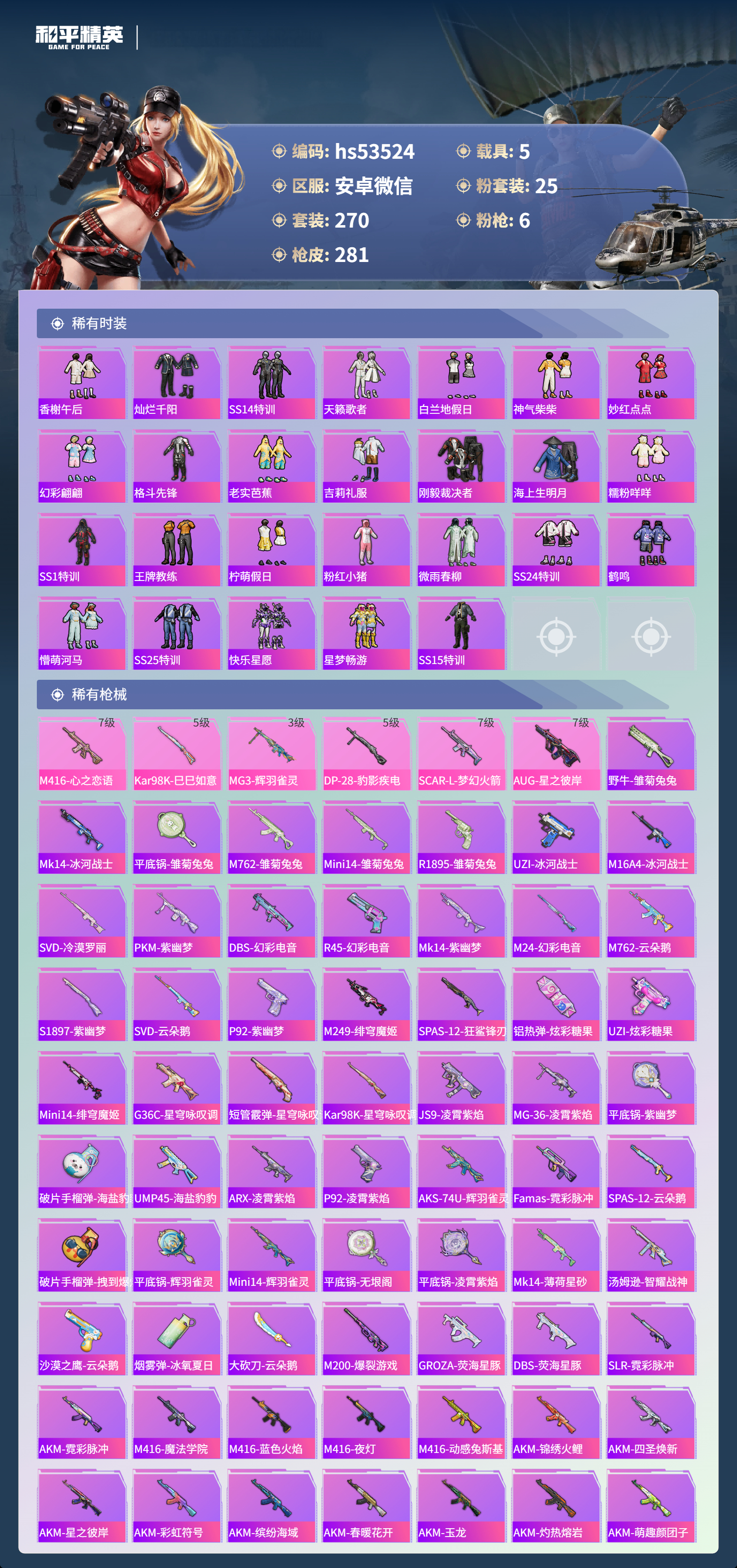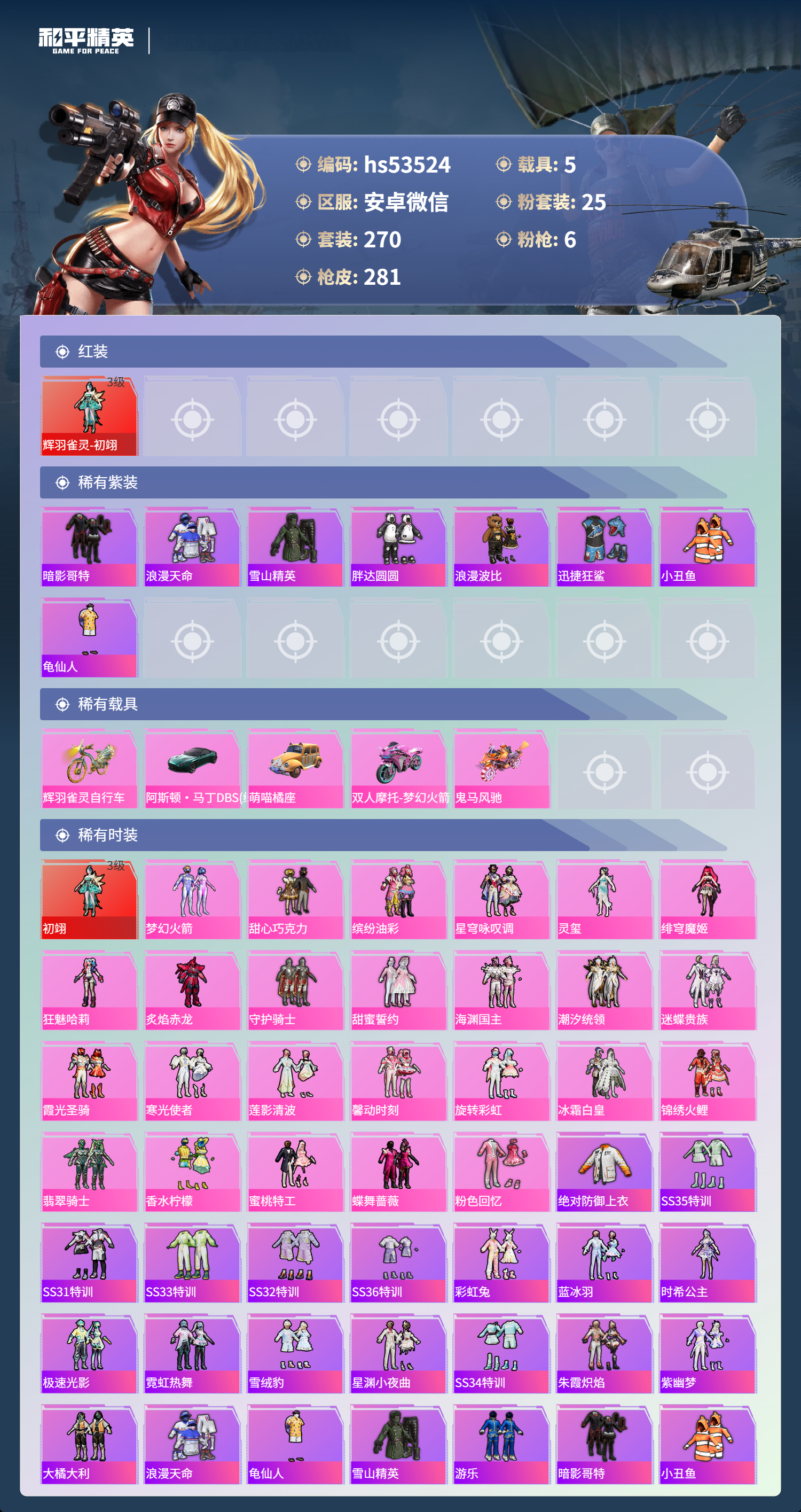 hs53524 安卓微信-19王牌印记-1红装-25粉装-6特效呛-5载具-热力值-270套装-281呛皮【1红装】辉羽雀灵-初翊/3级【25粉装】套装-旋转彩虹套装-潮汐统领套装-蜜桃特工角色-灵玺套装-莲影清波套装-海渊国主套装-香水柠檬套装-冰霜白皇角色-狂魅哈莉套装-缤纷油彩套装-寒光使者角色-绯穹魔姬套装-梦幻火箭套装-炙焰赤龙套装-粉色回忆