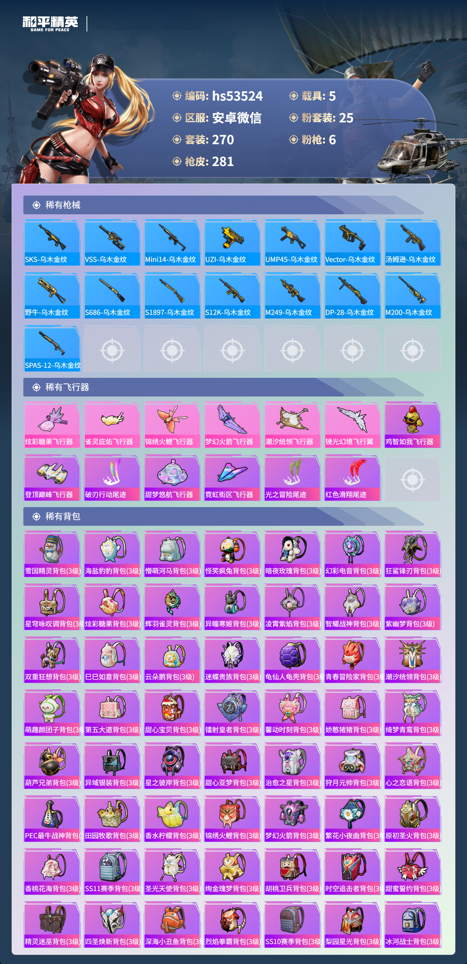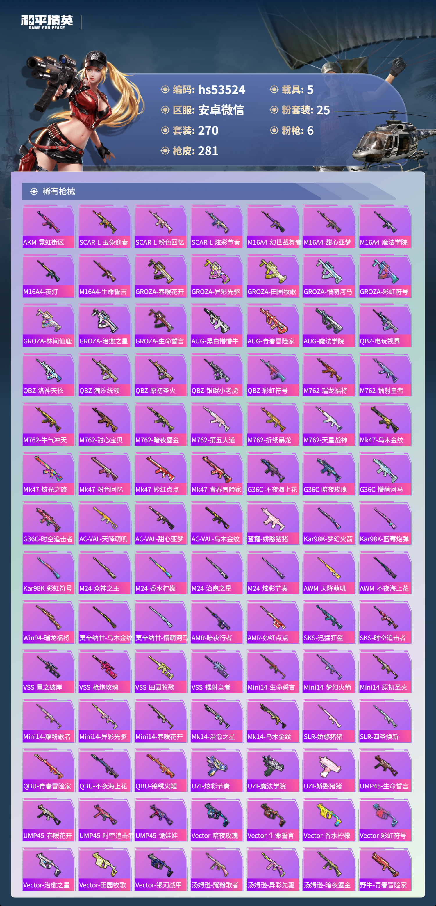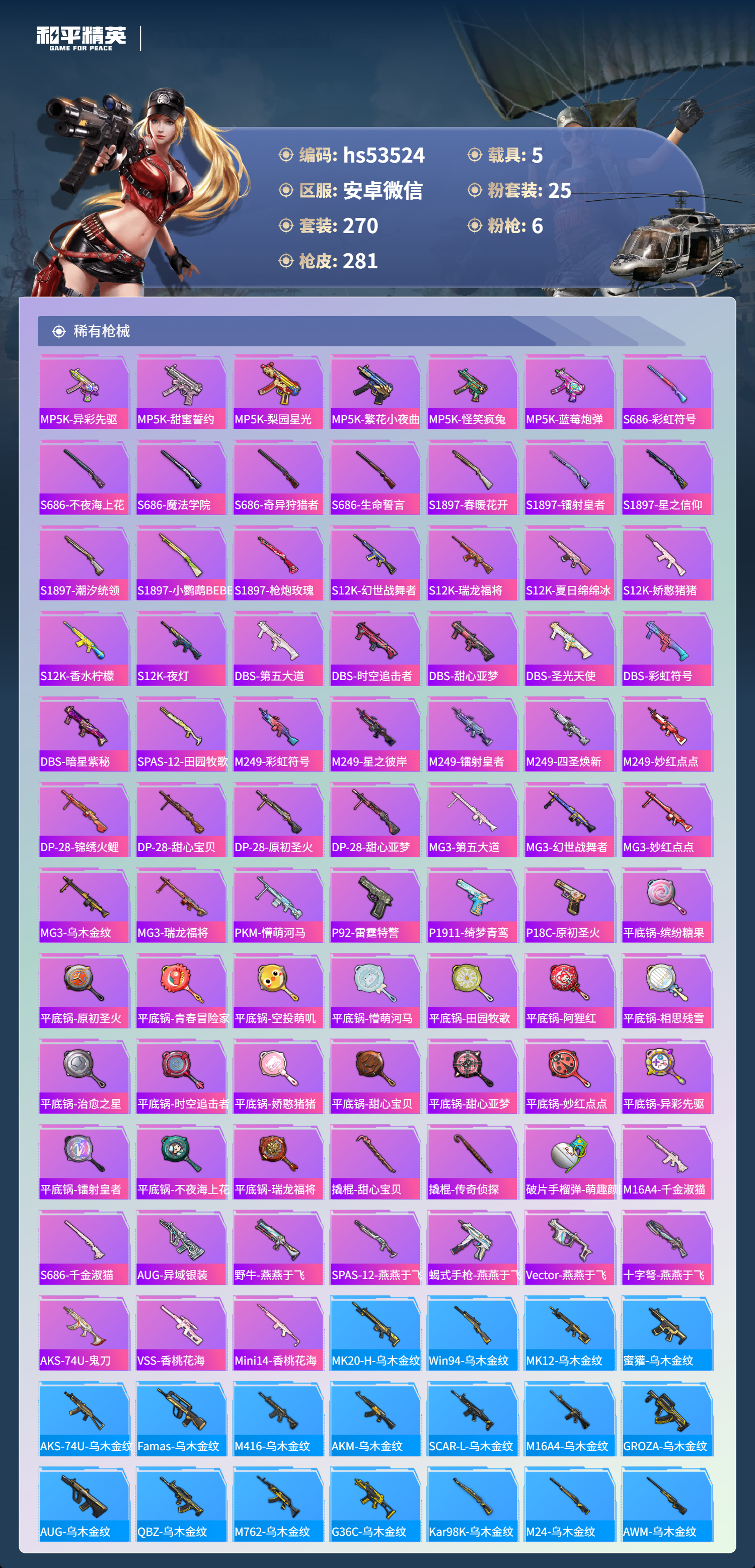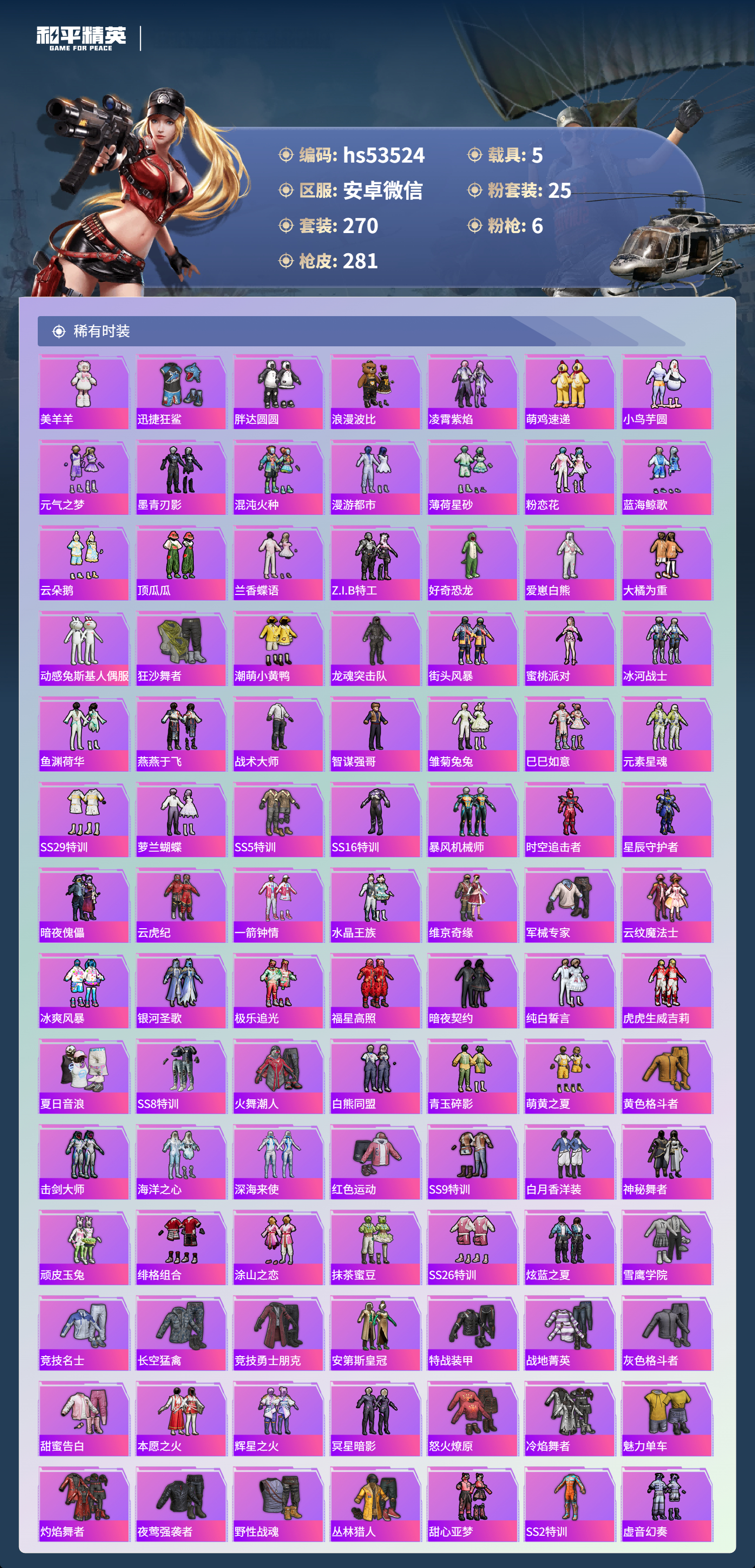 hs53524 安卓微信-19王牌印记-1红装-25粉装-6特效呛-5载具-热力值-270套装-281呛皮【1红装】辉羽雀灵-初翊/3级【25粉装】套装-旋转彩虹套装-潮汐统领套装-蜜桃特工角色-灵玺套装-莲影清波套装-海渊国主套装-香水柠檬套装-冰霜白皇角色-狂魅哈莉套装-缤纷油彩套装-寒光使者角色-绯穹魔姬套装-梦幻火箭套装-炙焰赤龙套装-粉色回忆