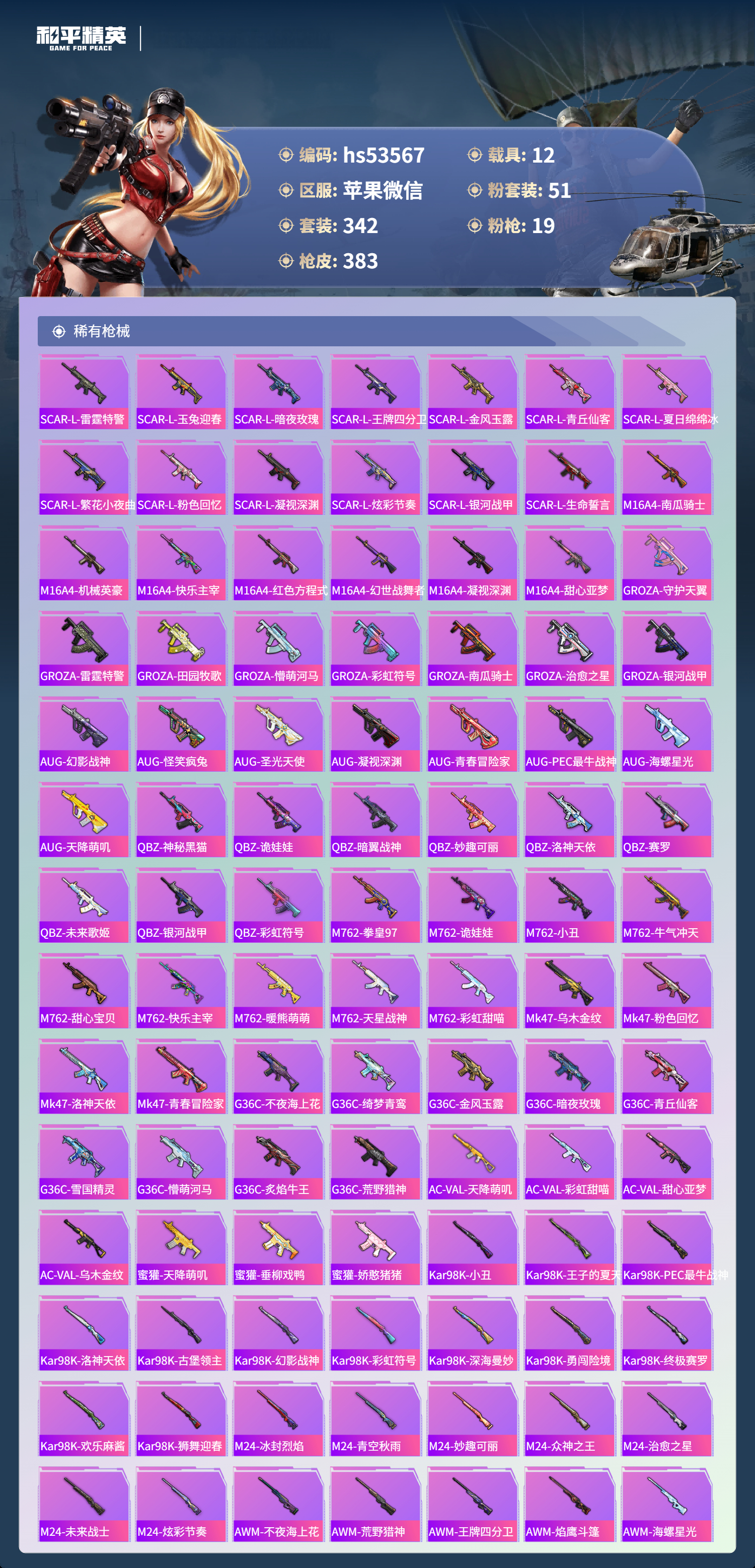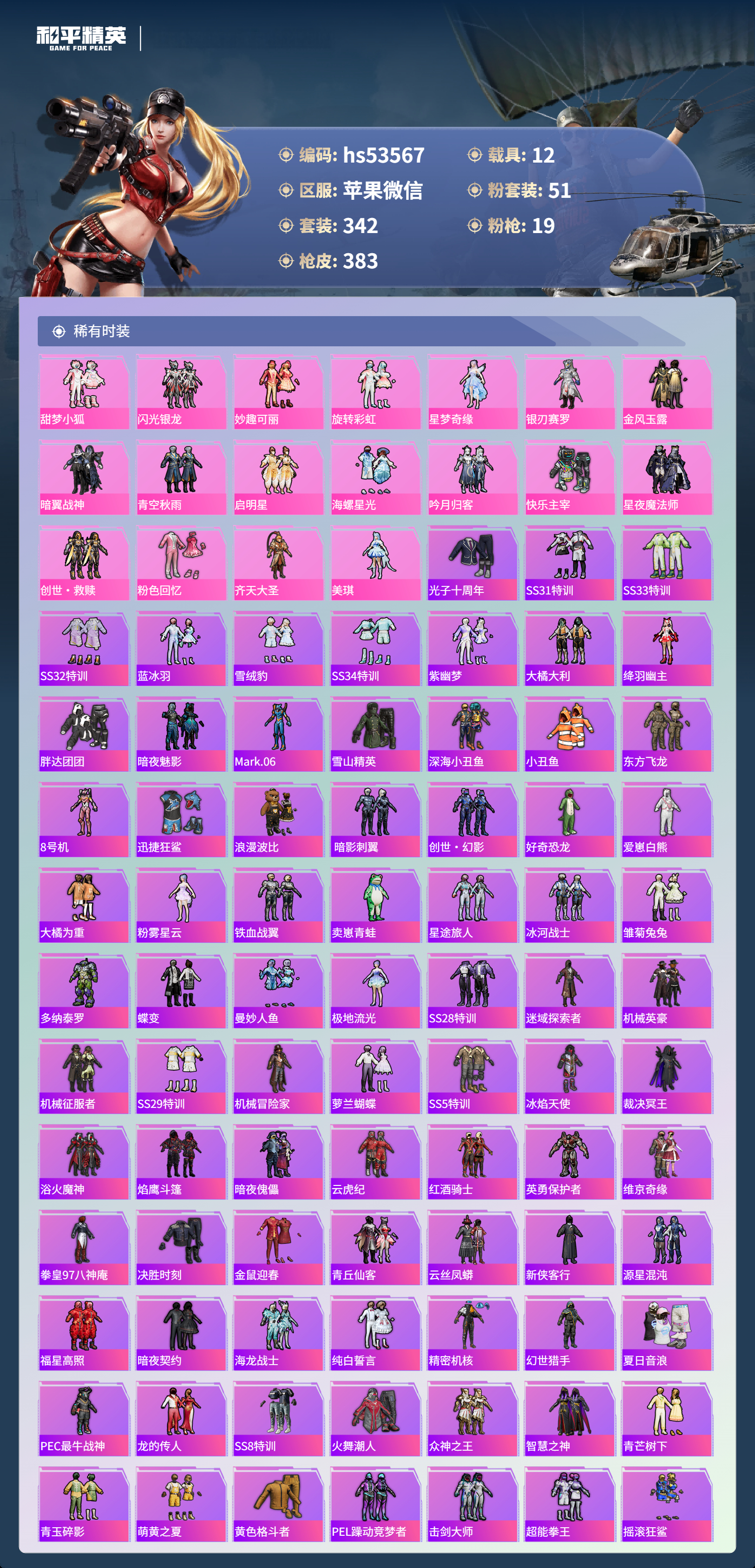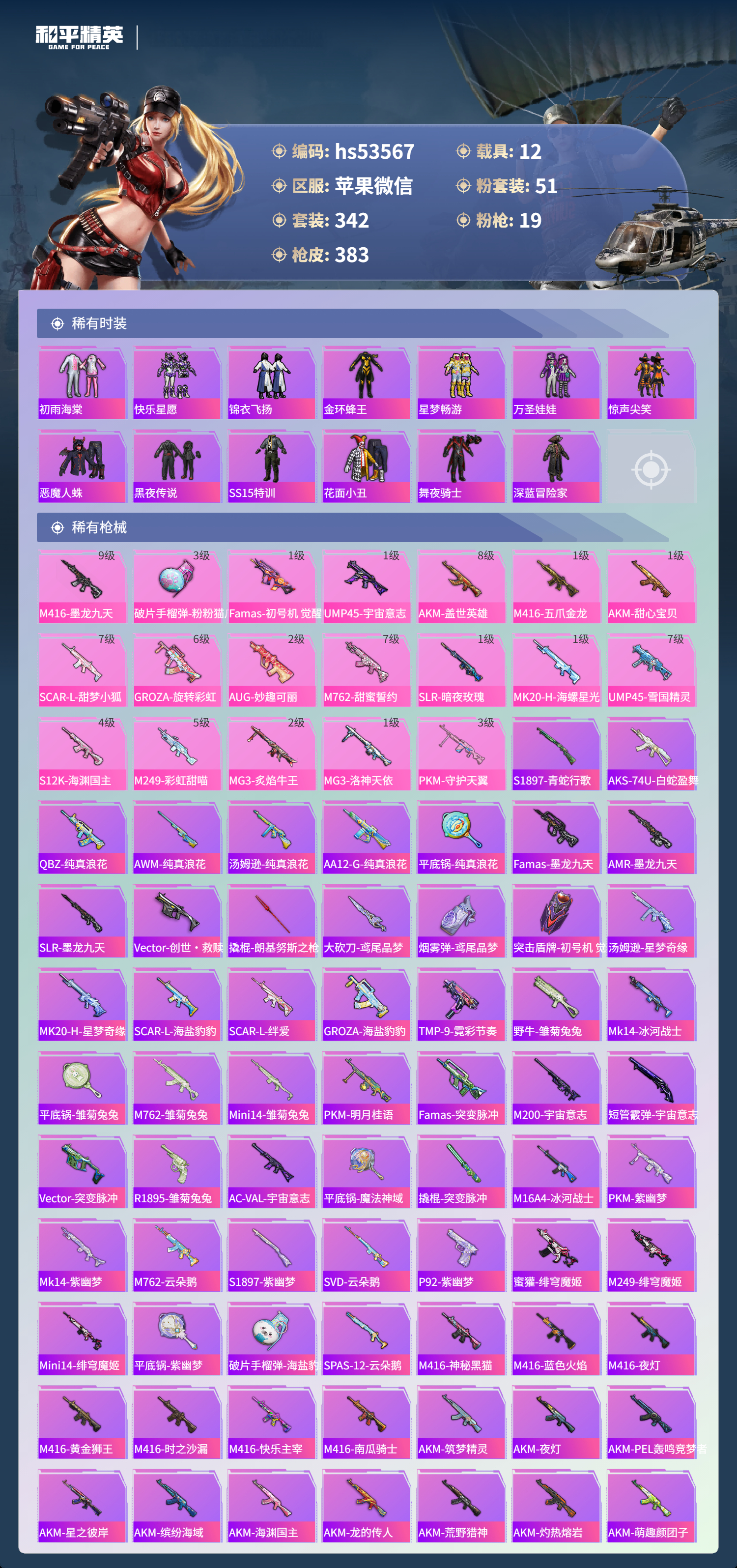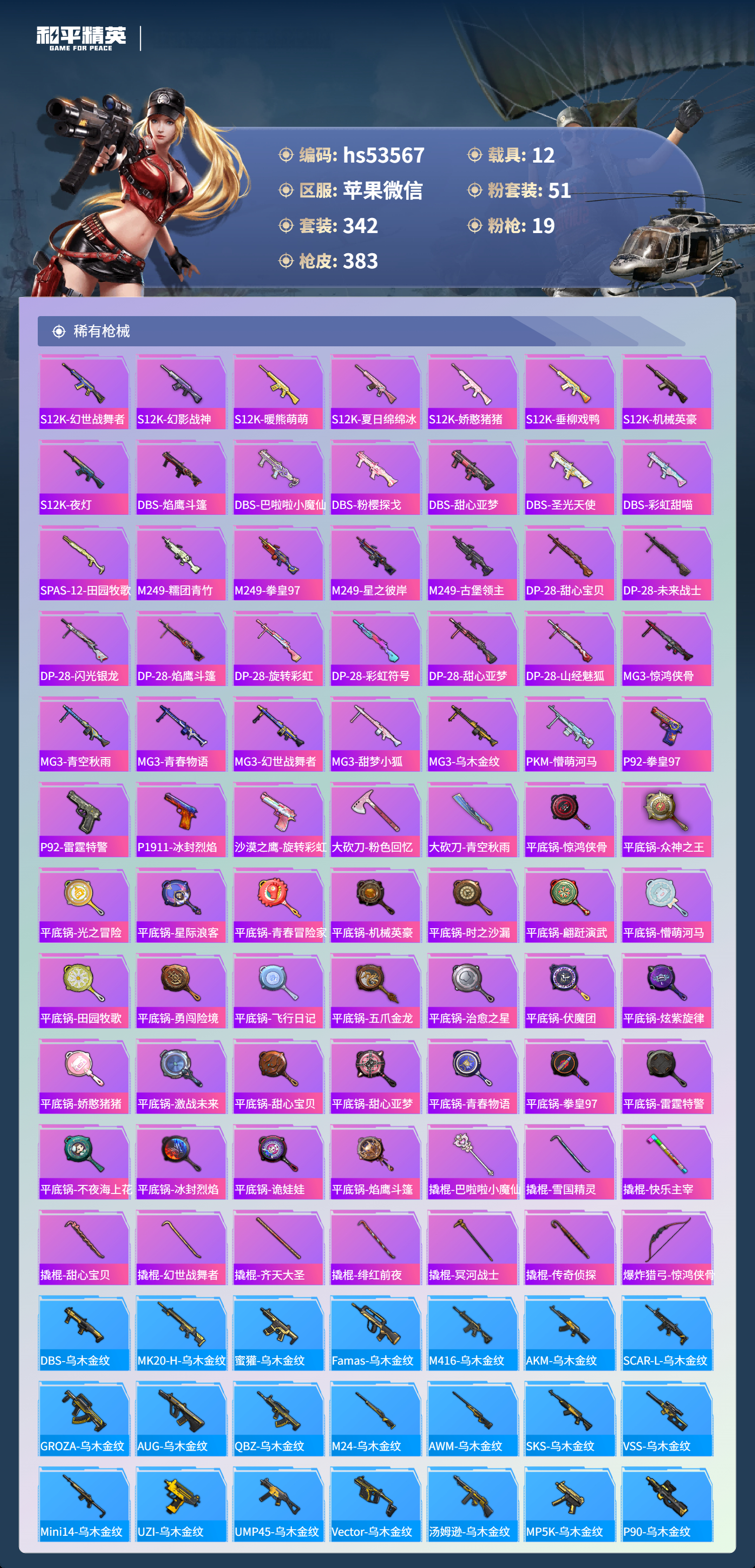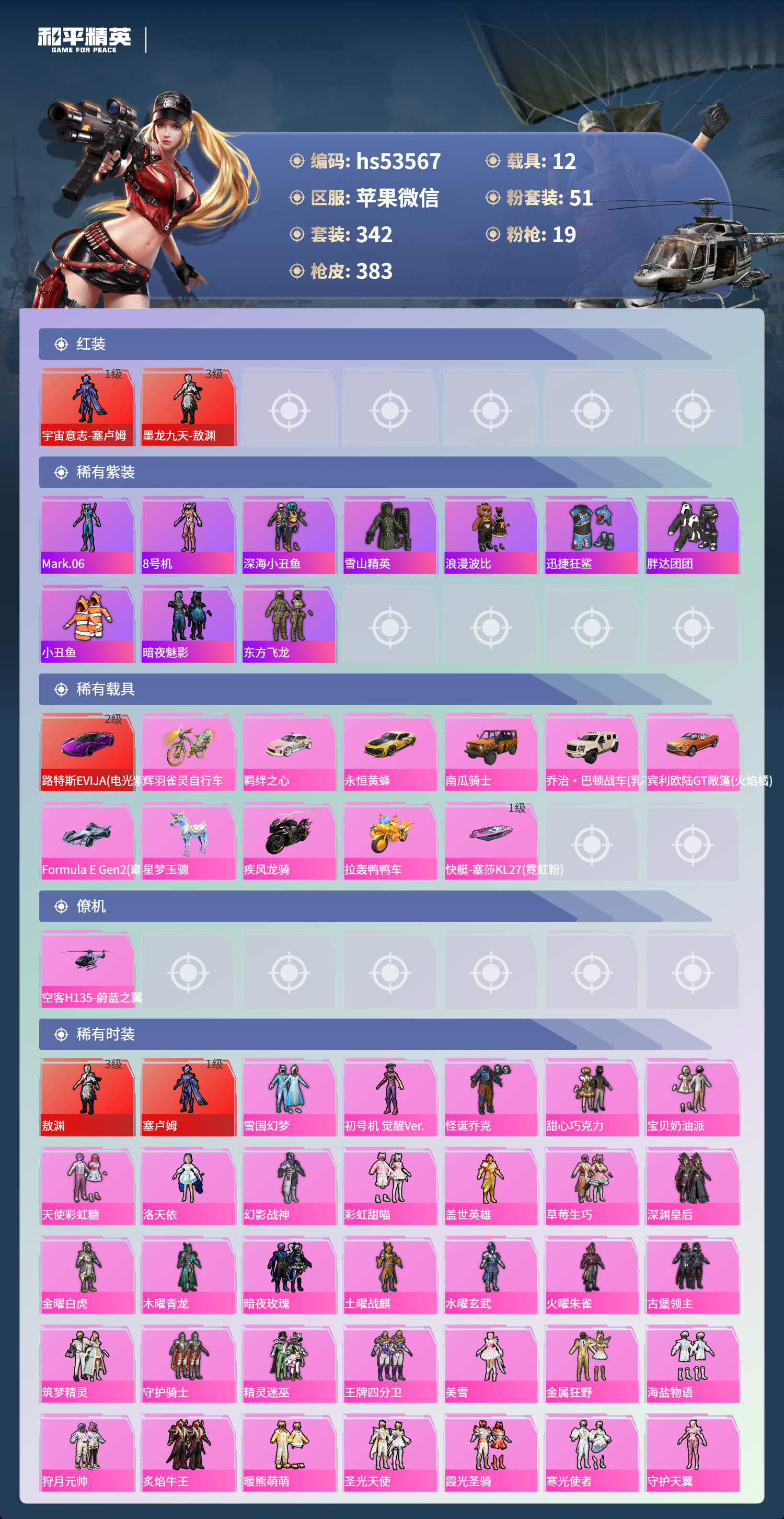 hs53567 苹果微信-18王牌印记-2红装-51粉装-19特效呛-12载具-热力值-342套装-383呛皮-2卓越印记-1传奇印记【2红装】墨龙九天-敖渊/3级宇宙意志-塞卢姆/1级【51粉装】套装-精灵迷巫套装-寒光使者角色-守护天翼套装-银刃赛罗套装-火曜朱雀套装-金属狂野套装-木曜青龙套装-齐天大圣套装-王牌四分卫套装-妙趣可丽套装-水曜玄武套装-