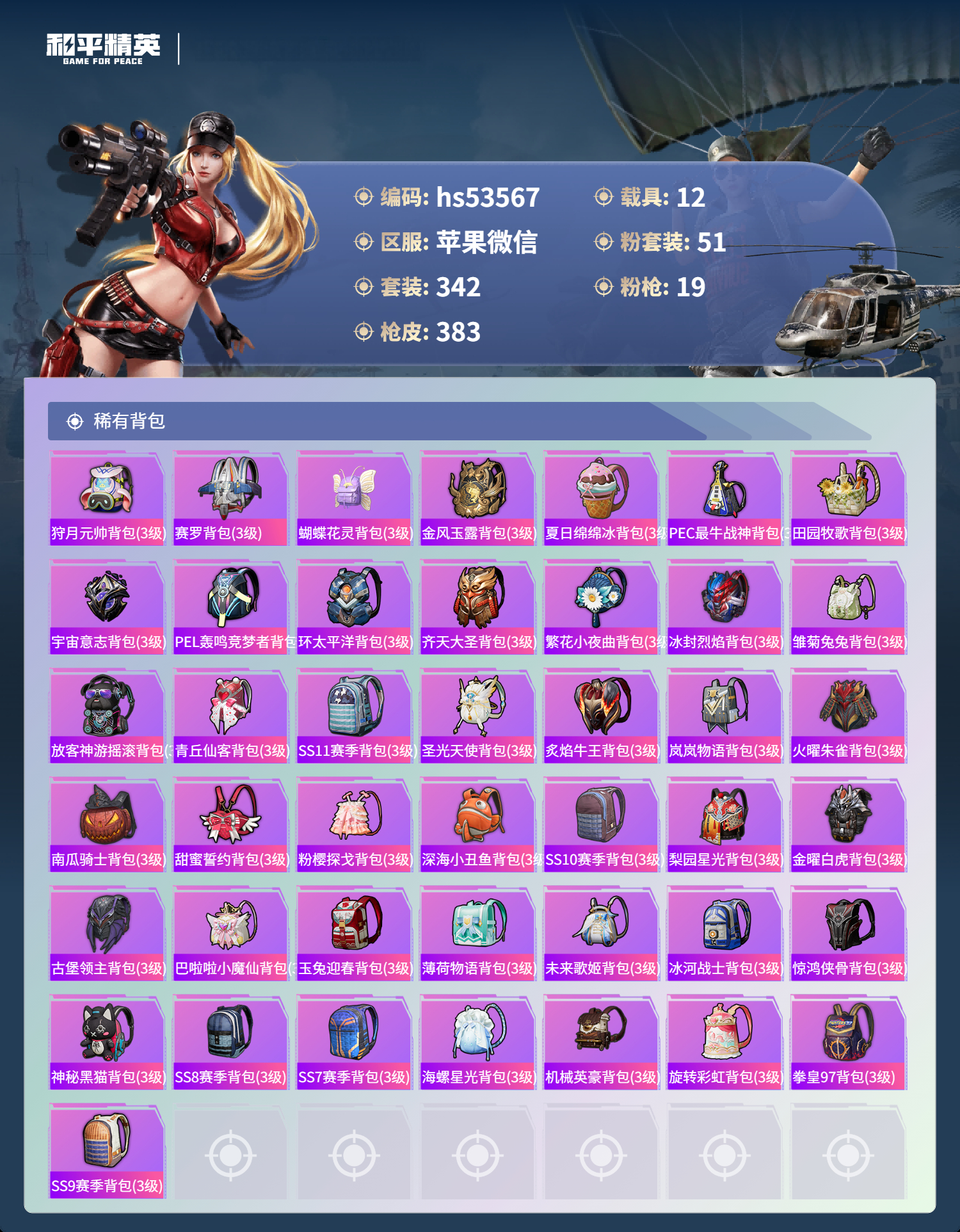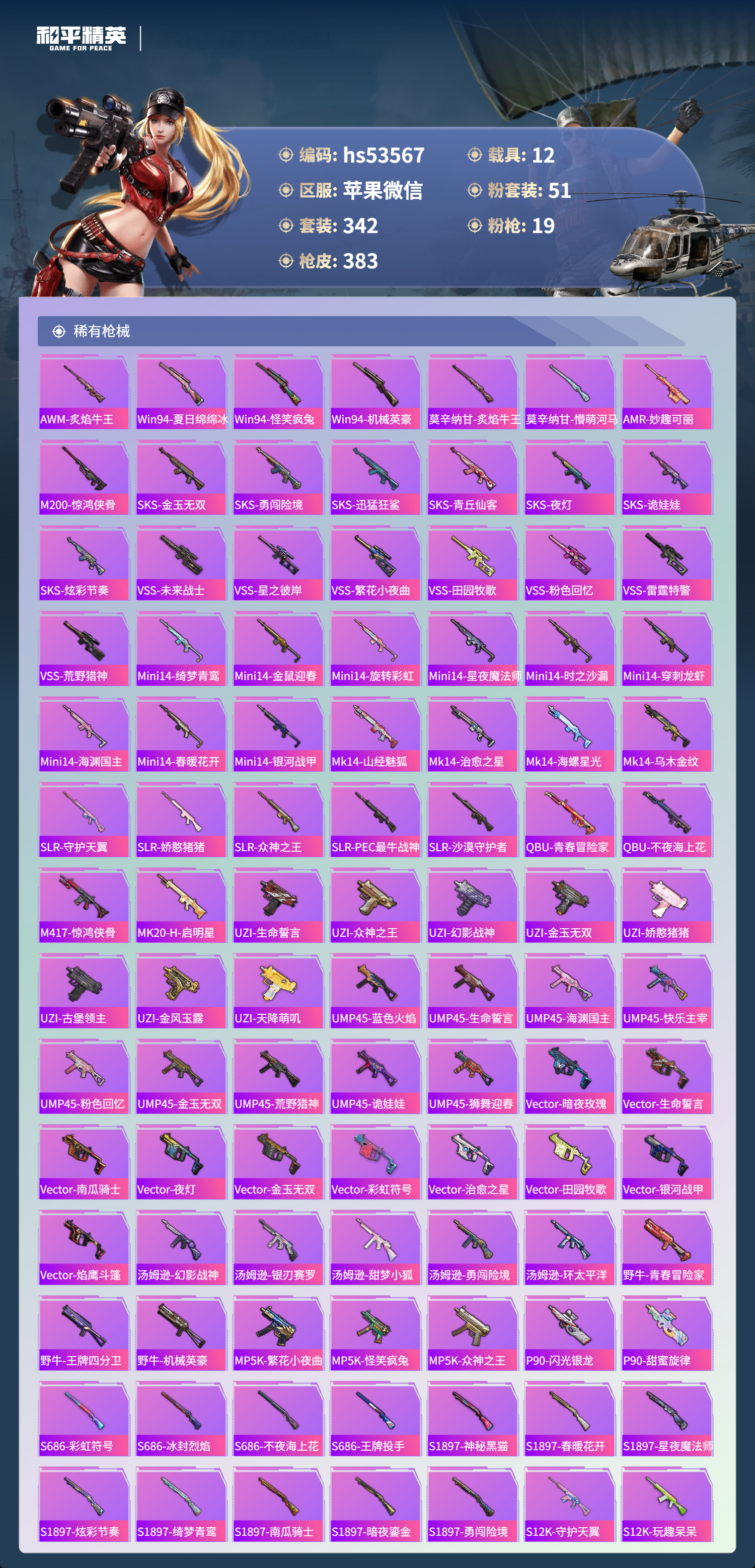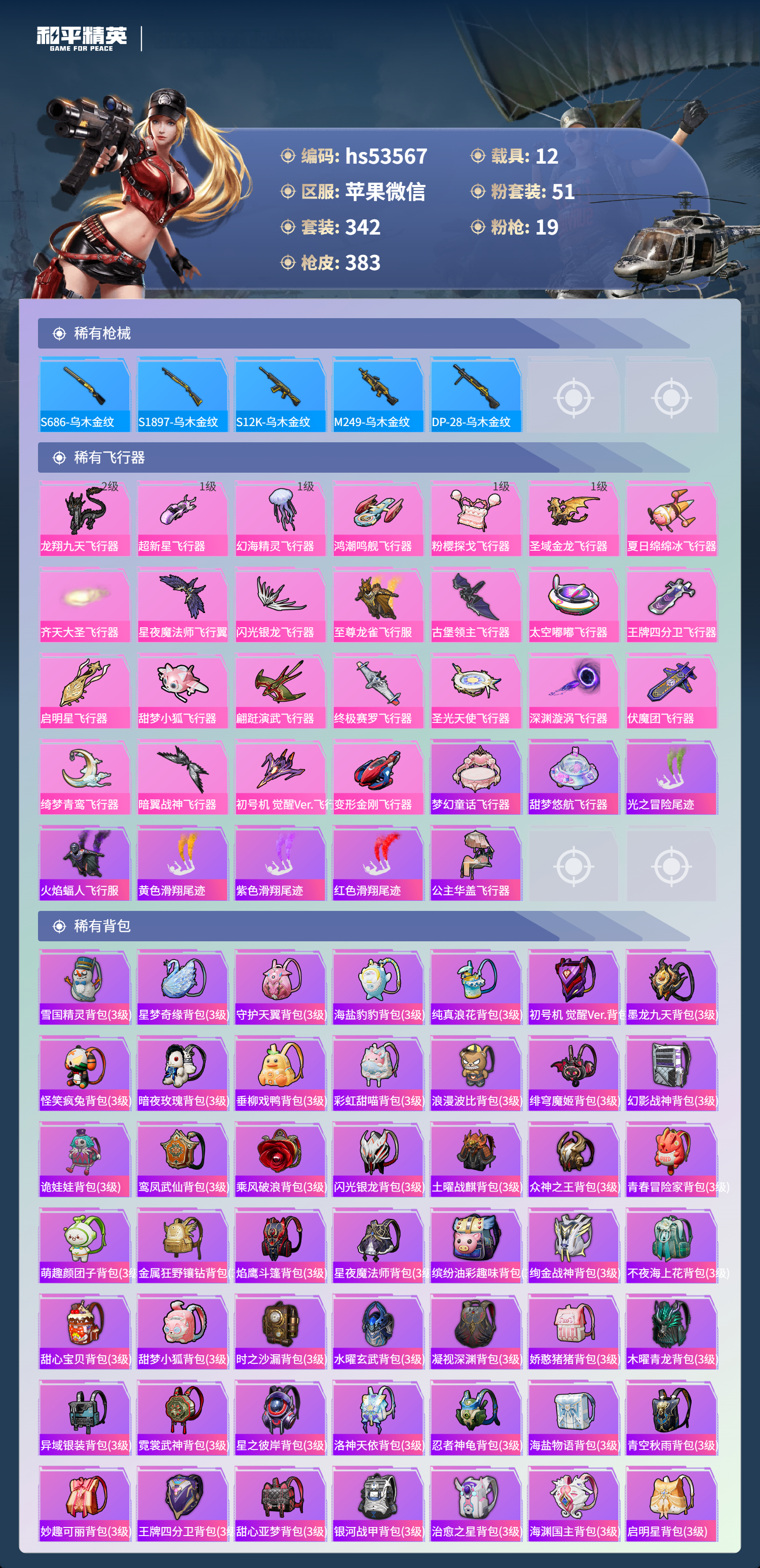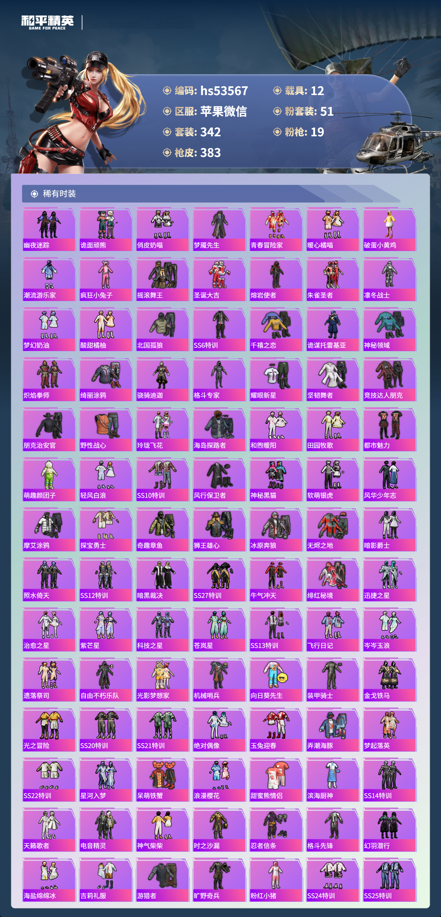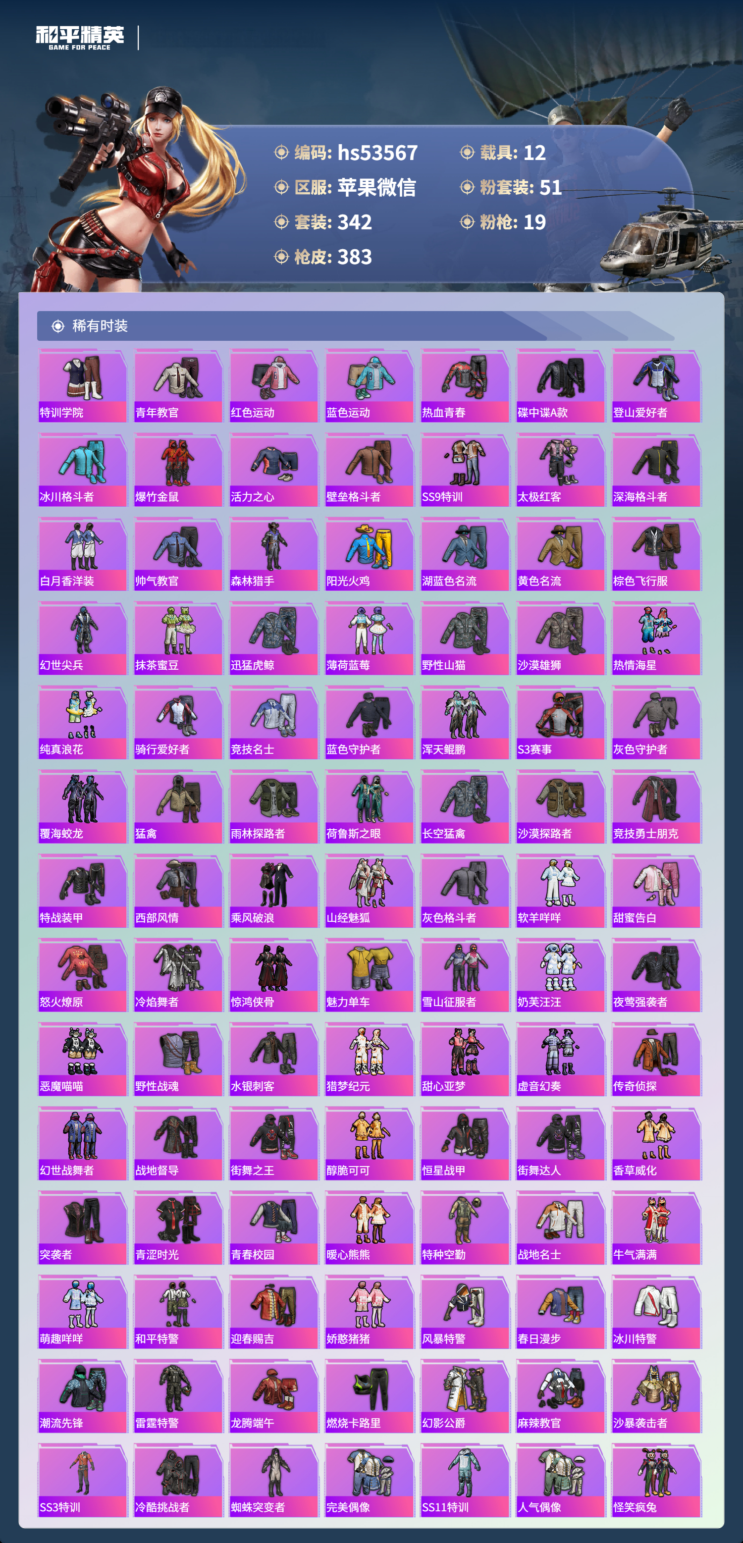hs53567 苹果微信-18王牌印记-2红装-51粉装-19特效呛-12载具-热力值-342套装-383呛皮-2卓越印记-1传奇印记【2红装】墨龙九天-敖渊/3级宇宙意志-塞卢姆/1级【51粉装】套装-精灵迷巫套装-寒光使者角色-守护天翼套装-银刃赛罗套装-火曜朱雀套装-金属狂野套装-木曜青龙套装-齐天大圣套装-王牌四分卫套装-妙趣可丽套装-水曜玄武套装-