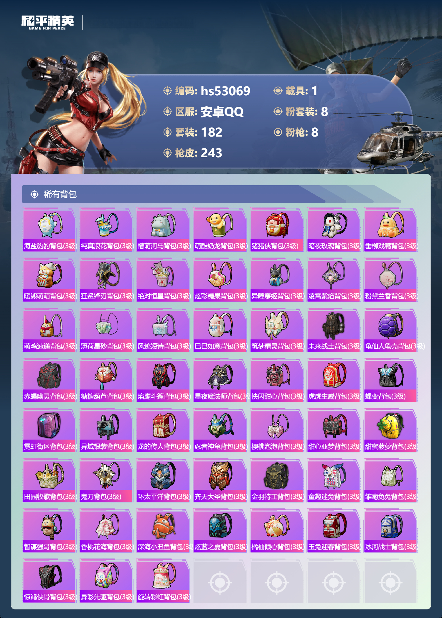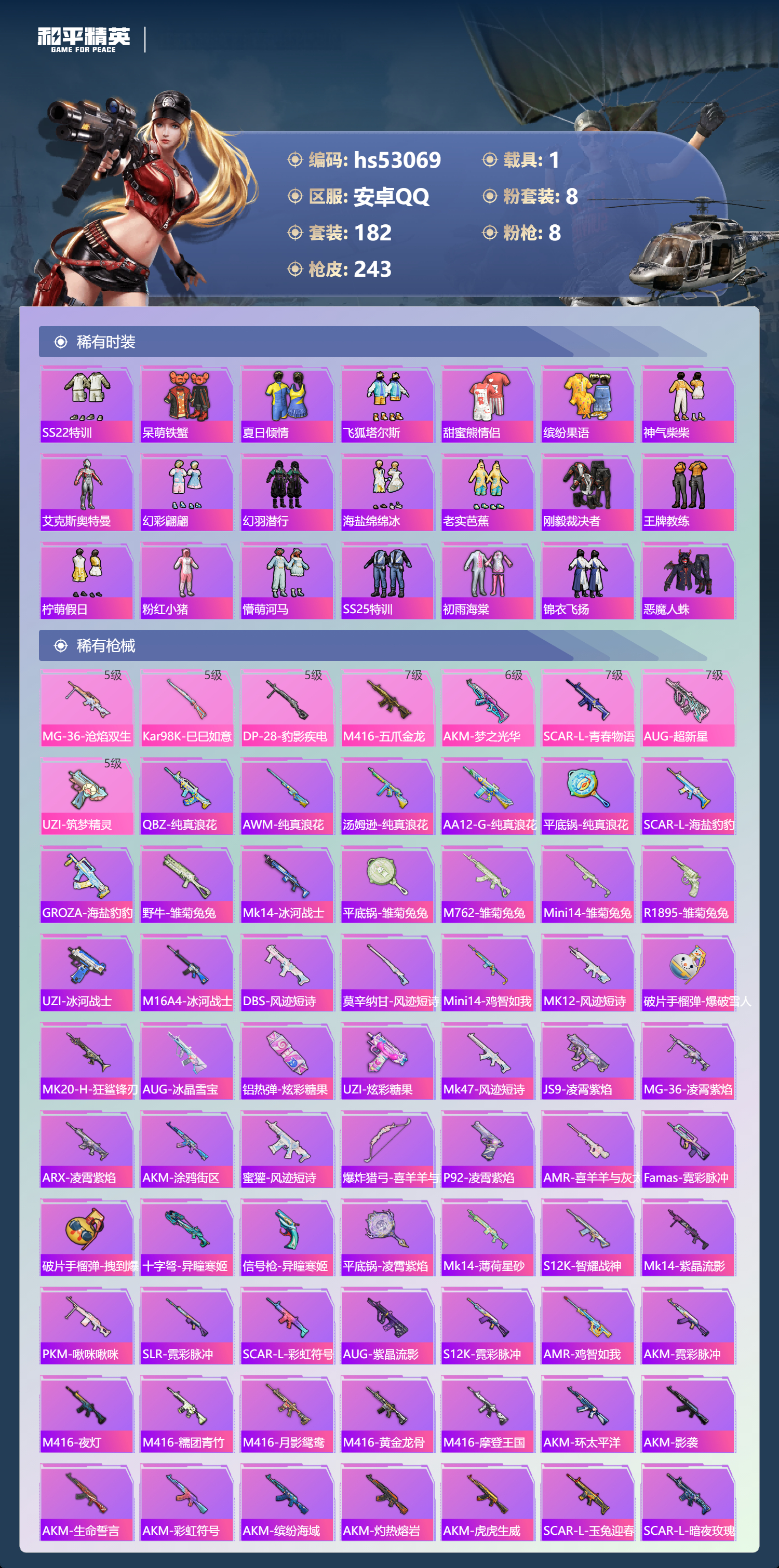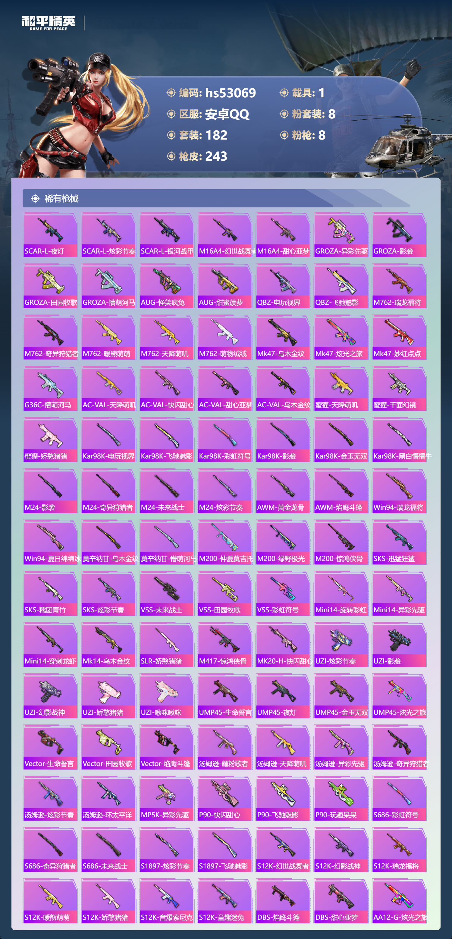 hs53069 安卓手q-13王牌印记-有战神框-8粉装-8特效呛-1载具-80137热力值-182套装-243呛皮-6卓越印记【8粉装】套装-新星烈龙角色-圣堂之誓套装-未来战士套装-梦幻火箭套装-天使彩虹糖角色-异瞳寒姬套装-绚金战神角色-月影灵韵【8特效呛】aug-超新星/7级dp-28-豹影疾电/5级akm-梦之光华/6级scar-l-青春物语/7级uzi-筑梦精