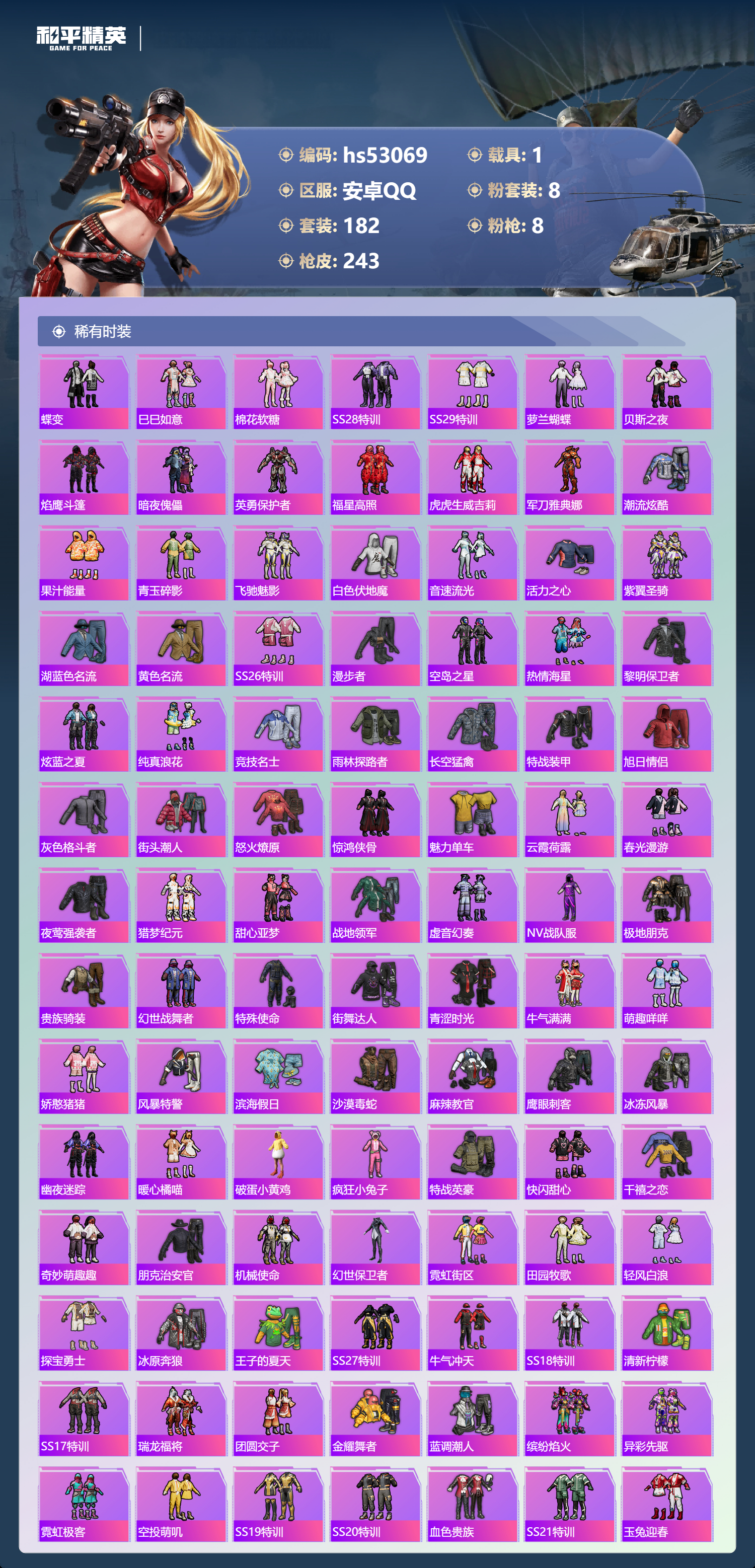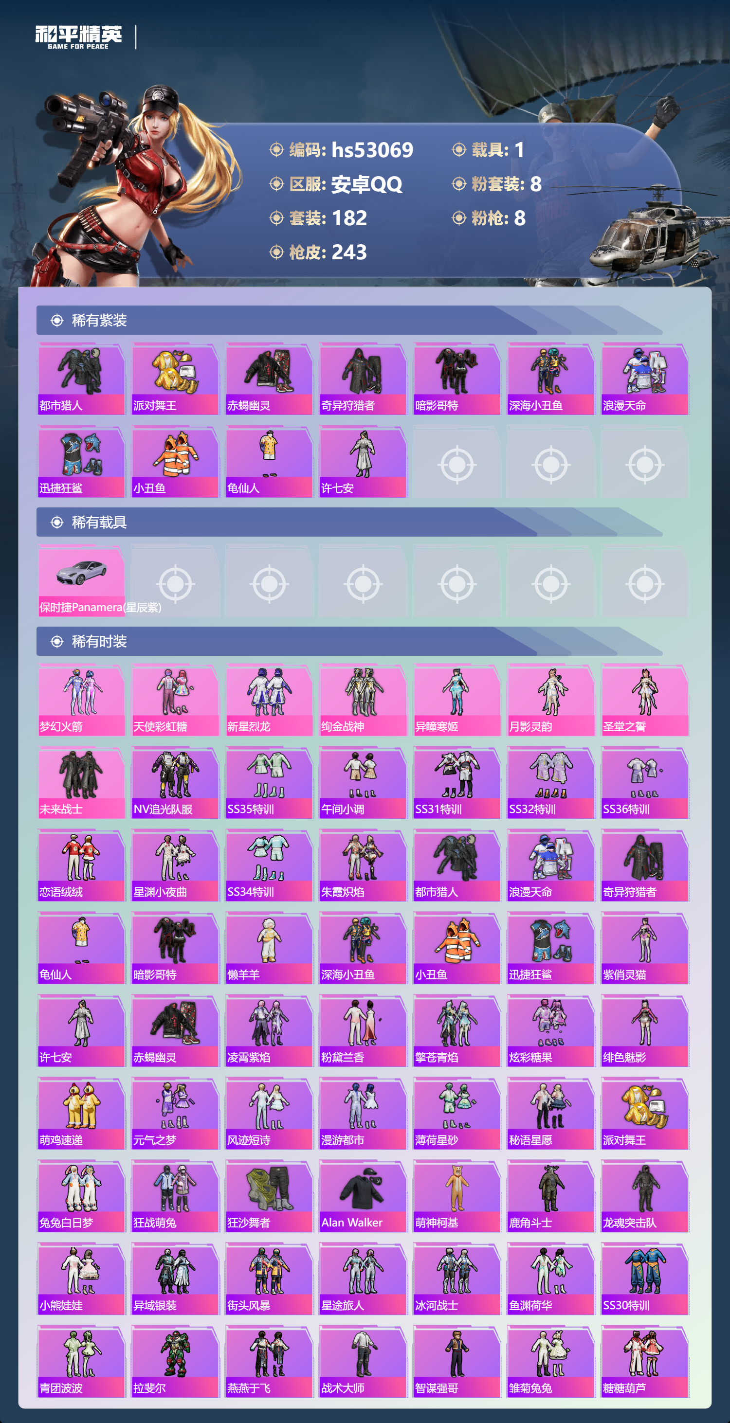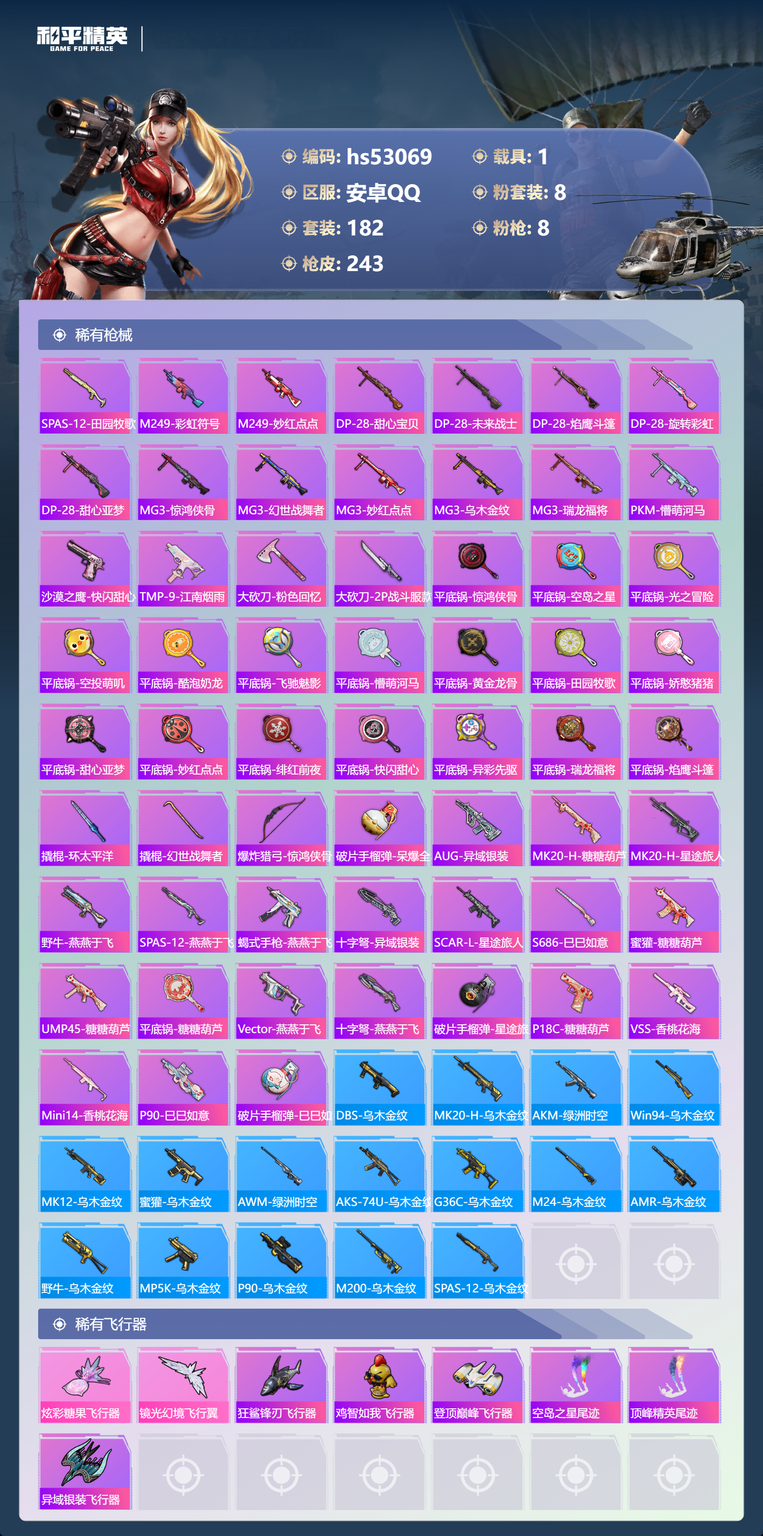 hs53069 安卓手q-13王牌印记-有战神框-8粉装-8特效呛-1载具-80137热力值-182套装-243呛皮-6卓越印记【8粉装】套装-新星烈龙角色-圣堂之誓套装-未来战士套装-梦幻火箭套装-天使彩虹糖角色-异瞳寒姬套装-绚金战神角色-月影灵韵【8特效呛】aug-超新星/7级dp-28-豹影疾电/5级akm-梦之光华/6级scar-l-青春物语/7级uzi-筑梦精