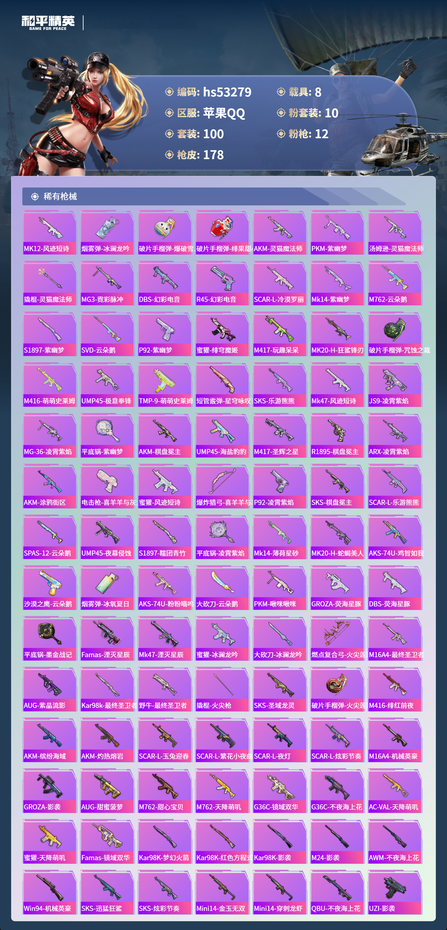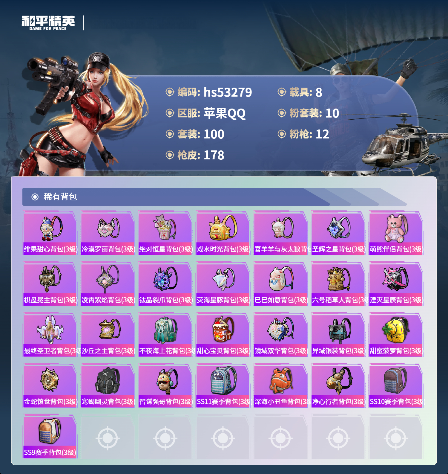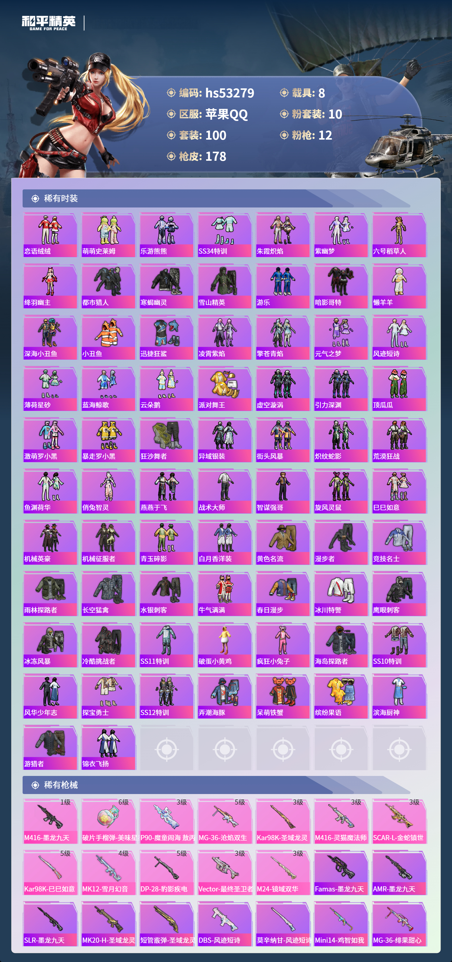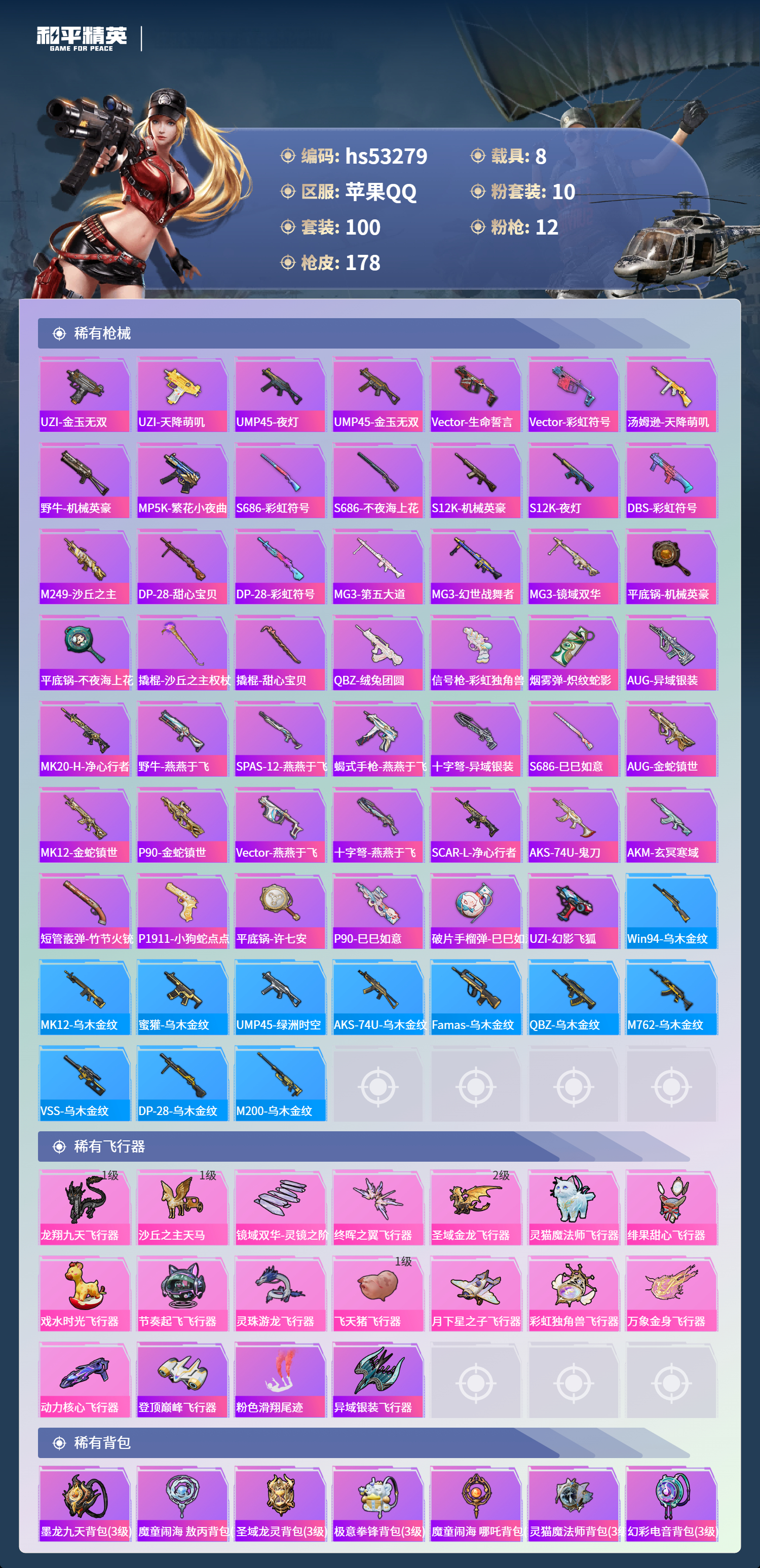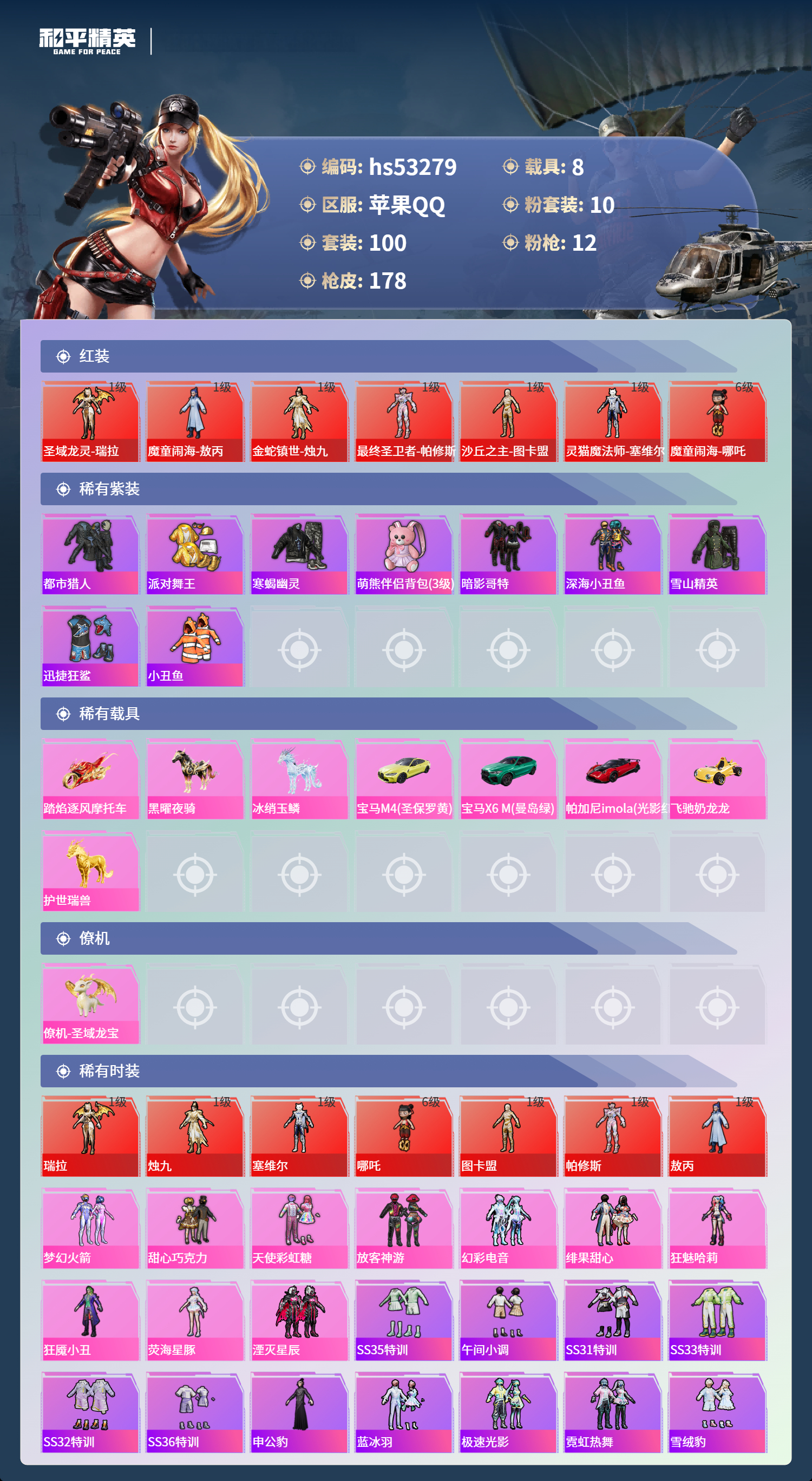 hs53279 苹果手q-6王牌印记-7红装-10粉装-12特效呛-8载具-86982热力值-100套装-178呛皮-5卓越印记-2传奇印记【7红装】魔童闹海-哪吒/6级灵猫魔法师-塞维尔/1级沙丘之主-图卡盟/1级金蛇镇世-烛九/1级圣域龙灵-瑞拉/1级最终圣卫者-帕修斯/1级魔童闹海-敖丙/1级【10粉装】套装-湮灭星辰套装-放客神游套装-梦幻火箭角色-狂魇小丑套装-绯