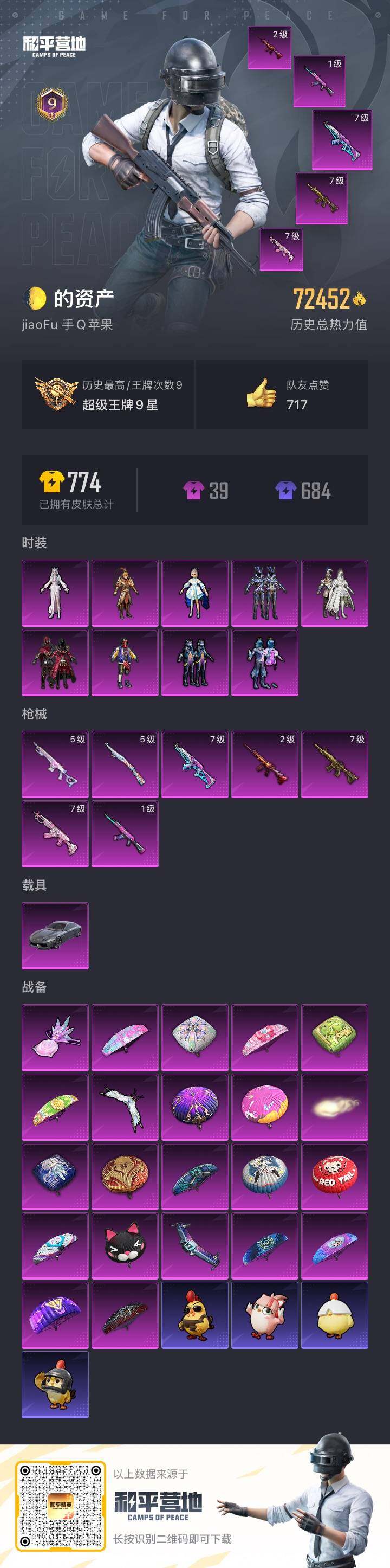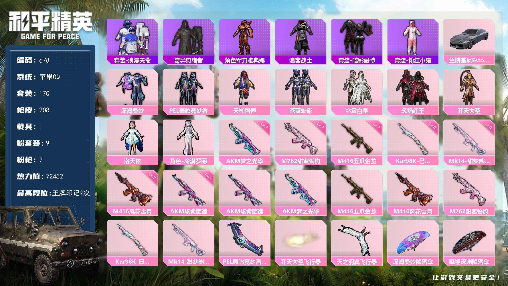 [14633377]苹果 手q-9粉装-7特效呛-1载具-4粉色飞行器-72452热力值-9王牌印记-170套装-208呛皮 【热门品类】:套装-浪漫天命,套装-奇异狩猎者,角色-军刀雅典娜,套装-浪客战士,套装-暗影哥特,套装-粉红小猪 【粉色载具】:兰博基尼estoque(银翼灰) 【粉色套装】:粉装-深海曼妙,粉装-pel轰鸣竞梦者,粉装-天禅智恒,粉装-苍蓝魅影,粉装-冰霜白皇,粉装-炙焰红王,粉装-齐天大圣,角色-洛天依,角色-冷漠罗丽 【粉色呛皮等级】:akm-炫紫旋律一级,akm-梦之光华七级,m416-五爪金龙七级,m416-风花雪月二级,m762-甜蜜誓约七级,kar98k-巳巳如意五级,mk14-甜梦熊击五级 【粉色呛皮】:akm-炫紫旋律,akm-梦之光华,m416-五爪金龙,m416-风花雪月,m762-甜蜜誓约,kar98k-巳巳如意,mk14-甜梦熊击 【粉色飞行器】:pel轰鸣竞梦者飞行器,齐天大圣飞行器,天之羽翼飞行器 【粉色降落伞】:深海曼妙降落伞,凝视深渊降落伞,天启纪元降落伞,pel轰鸣竞梦者降落伞,神秘黑猫降落伞,四圣焕新降落伞,阿狸红降落伞,银刃赛罗降落伞,暗夜玫瑰降落伞,齐天大圣降落伞,洛神天依降落伞,蓝莓炮弹降落伞,暗星紫秘降落伞,碧影闪光降落伞,恐龙拽拽降落伞,月下星之子降落伞,樱桃泡泡降落伞 【稀有套装】:套装-巳巳如意,角色-怀庆长公主,套装-燕燕于飞,套装-鱼渊荷华,套装-紫幽梦,套装-蓝冰羽,套装-极速光影,套装-云朵鹅,套装-雪绒豹,套装-炫彩糖果 【稀有呛皮】:aug-冰晶雪宝,akm-pel轰鸣竞梦者,akm-四圣焕新,akm-夜灯,akm-天启纪元,akm-奇异狩猎者,akm-彩虹符号,akm-恐龙拽拽,akm-玉龙,akm-虎虎生威,akm-霓虹街区,akm-龙的传人,m16a4-幻世战舞者,m16a4-甜心亚梦,scar-l-浪客战士,scar-l-炫彩节奏,scar-l-玉兔迎春,scar-l-甜蜜誓约,scar-l-黄金龙骨,m416-仓鼠灰灰,m416-神秘黑猫,groza-异彩先驱,groza-彩虹符号,groza-黑色刀锋,aug-甜蜜菠萝,aug-耀粉歌者,q-洛神天依,q-神秘黑猫,q-赛罗,q-飞驰魅影,m762-天降萌叽,m762-奇异狩猎者,m762-拳