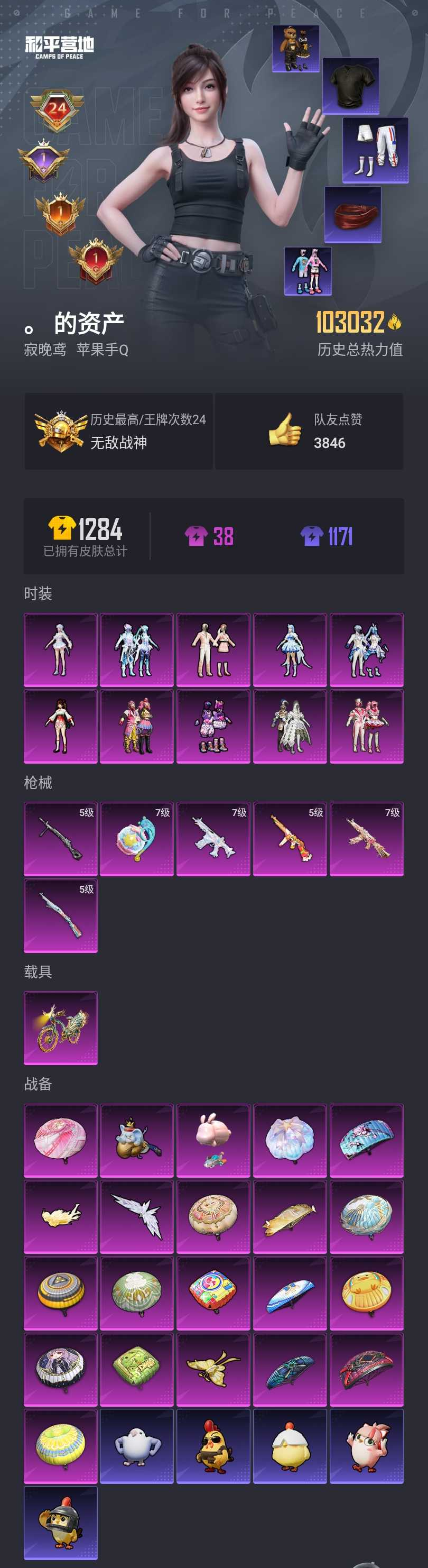 【和平精英】【lyhp17960】(高印记 ss24无敌战神框 附带一把2钻苏尔南手呛) 10w热力值 10粉装6特效呛2载具含1飞机 缤纷油彩 第五大道 荧海星豚 馨动时刻 满级手蕾 满级蜜獾 满级aks-74u 10粉装,6特效呛,1载具,历史最高段位:无敌战神 王牌印记24次 热力值:103032,267套装,318呛械,421装备,236战备;套装:套装-缤纷油彩,套装-馨动时刻,套装-冰霜白皇,套装-蓝莓炮弹,角色-小可学妹,套装-第五大道,套装-未来歌姬,角色-美琪,套装-幻彩电音,角色-荧海星豚,套装-特训学院,套装-猎鹰,套装-青年教官,套装-橘黑制服,套装-红色运动,套装-黄色运动,套装-蓝色运动,套装-黄色伏地魔,套装-白色伏地魔,套装-黑色伏地魔,套装-竞技名士,套装-深蓝色名流,套装-酒红色名流,套装-湖蓝色名流,套装-黄色名流,套装-猛禽,套装-棕色飞行服,套装-长空猛禽,套装-沙漠雄狮,套装-竞技勇士朋克,套装-蓝色守护者,套装-灰色守护者,套装-海岛探路者,套装-雨林探路者,套装-沙漠探路者,套装-西部风情,套装-旭日情侣,套装-冷焰舞者,套装-灼焰舞者,套装-浪漫天命,套装-特战装甲,套装-战地菁英,套装-战地督导,套装-青春校园,套装-灰色格斗者,套装-迎春赐吉,套装-春日漫步,套装-潮流先锋,套装-龙腾端午,套装-燃烧卡路里,套装-5.56爱好者,套装-暗黑骑手,套装-完美偶像,套装-人气偶像,套装-幻影武者,套装-街头潮人,套装-暗金炫舞,套装-蓝彩潮人,套装-怒火燎原,套装-决胜时刻,套装-魅力单车,套装-绮丽涂鸦,套装-耀眼新星,套装-坚韧舞者,套装-竞技达人朋克,套装-朋克治安官,套装-夜莺强袭者,套装-野性战心,套装-野性战魂,套装-破晓战魂,套装-都市魅力,套装-荣耀,套装-热血青春,套装-潮流炫酷,套装-丛林猎人,套装-雪山精英,套装-极地朋克,套装-幻世战舞者,套装-暗影哥特,套装-呆萌铁蟹,套装-甜蜜熊情侣,套装-青涩时光,套装-缤纷果语,套装-龙魂突击队,套装-和平特警,套装-冰川特警,套装-元素星魂,套装-胖达圆圆,套装-极速红龙,套装-格斗先锋,套装-海上生明月,套装-麻辣教官,套装-ss3特训,套装-梦魇先生,套装-黑夜传说,套装-粉红小猪,套装-破蛋小黄鸡,套装-疯狂小兔子,套装-深蓝冒险家,套装-迷域探索者,套装-爱崽白熊,套装-浪漫波比,套装-军械专家,套装-北国孤狼,套装-ss6特训,套装-淡雅花蕊,套装-跃动心情,套装-ss7特训,套装-黑色刀锋,套装-核芯基因,套装-精神漫游,套装-鹤鸣,套装-霓虹街区,套装-激萌罗小黑,套装-ss10特训,套装-潮萌小黄鸭,套装-ss8特训,套装-众神之王,套装-智慧之神,套装-神秘黑猫,套装-白熊同盟,套装-萌黄之夏,套装-夏日音浪,套装-ss9特训,套装-风华少年志,套装-白月香洋装,套装-探宝勇士,套装-牛气满满,套装-白糯汤圆,套装-韶华初心,套装-ss11特训,套装-青春冒险家,套装-潮流游乐家,套装-萌趣颜团子,套装-特种颜团子,套装-战术大师,套装-牛气冲天,套装-ss18特训,套装-镭射皇者,套装-银白舞王,套装-耀粉歌者,套装-治愈之星,套装-科技之星,套装-萌主吾皇,套装-飞行日记,套装-ss13特训,套装-光影梦想家,套装-梦起落英,套装-曼妙人鱼,套装-热情海星,套装-纯真浪花,套装-浪漫樱花,套装-ss14特训,套装-天籁歌者,套装-吉莉礼服,套装-微雨春柳,套装-ss15特训,套装-ss16特训,套装-暴风机械师,套装-时空追击者,套装-ss17特训,套装-瑞龙福将,套装-团圆交子,套装-福星高照,套装-虎虎生威吉莉,套装-缤纷焰火,套装-异彩先驱,套装-霓虹极客,套装-冰暴轰轰,套装-绿翡凌光,套装-空投萌叽,套装-ss19特训,套装-浓情蜜辣,套装-飞驰魅影,套装-音速流光,套装-ss20特训,套装-猎梦纪元,套装-甜心亚梦,套装-虚音幻奏,套装-ss21特训,套装-暖心熊熊,套装-萌趣咩咩,套装-娇憨猪猪,套装-俏皮奶喵,套装-玉兔迎春,套装-ss22特训,套装-田园牧歌,套装-轻风白浪,套装-光之冒险,套装-绯格组合,套装-ss23特训,套装-神气柴柴,套装-懵萌河马,套装-灵蜜圈圈,套装-妙红点点,套装-幻彩翩翩,套装-王牌教练,套装-柠萌假日,套装-ss24特训,套装-荧惑魅影,套装-龟仙人,套装-涂山之恋,套装-ss25特训,套装-金戈铁马,套装-惊鸿侠骨,套装-锦衣飞扬,套装-晨曦薄雾,套装-香桃花海,套装-龙的传人,套装-冰河战士,套装-ss26特训,套装-快闪甜心,套装-春光漫游,套装-云魄琉璃,套装-贝斯之夜,套装-焰鹰斗篷,套装-幽夜迷踪,套装-幻羽潜行,套装-ss27特训,套装-恋语绒绒,套装-老实芭蕉,套装-ss28特训,角色-湖雨初晴,角色-白光莹,套装-街头风暴,套装-海盐绵绵冰,套装-蝶变,套装-湖畔霞光,套装-粉日山川,套装-小熊娃娃,套装-ss29特训,套装-雏菊兔兔,套装-萝兰蝴蝶,角色-绯色魅影,角色-摩登魅猫,套装-星途旅人,角色-怀庆长公主,套装-青团波波,套装-糖糖葫芦,套装-果冻柠檬,套装-小鸟芋圆,套装-诡诞巡游,套装-ss31特训,套装-鱼渊荷华,套装-燕燕于飞,套装-紫幽梦,套装-粉恋花,套装-ss33特训,套装-云朵鹅,套装-ss32特训,套装-彩虹兔,套装-蓝冰羽,套装-顶瓜瓜,套装-雪绒豹,套装-大橘大利,角色-鲛海歌灵,套装-星渊小夜曲,套装-霓虹热舞,套装-蜜露汐语,套装-星影赞美诗,套装-蓝海鲸歌,套装-ss34特训,套装-擎苍青焰,套装-朱霞炽焰,套装-凌霄紫焰,套装-ss35特训,套装-ss36特训;呛皮:scar-l-红色方程式,scar-l-粉色回忆,scar-l-玉兔迎春,scar-l-海盐豹豹,scar-l-乌木金纹,m762-诡娃娃,m762-镭射皇者,m762-瑞龙福将,m762-彩虹符号,m762-彩虹甜喵,m762-第五大道,m762-天降萌叽,m762-雏菊兔兔,m762-云朵鹅,m762-