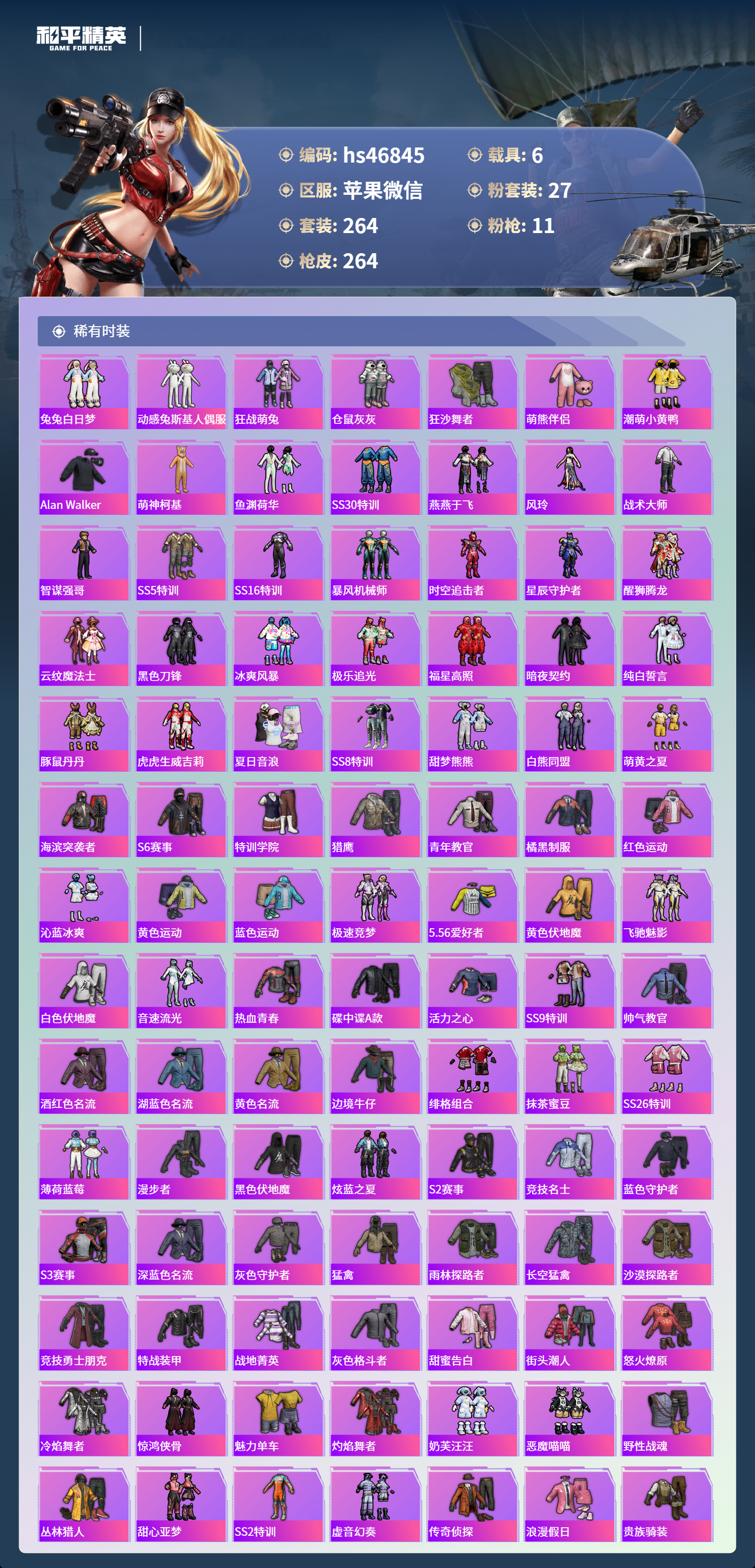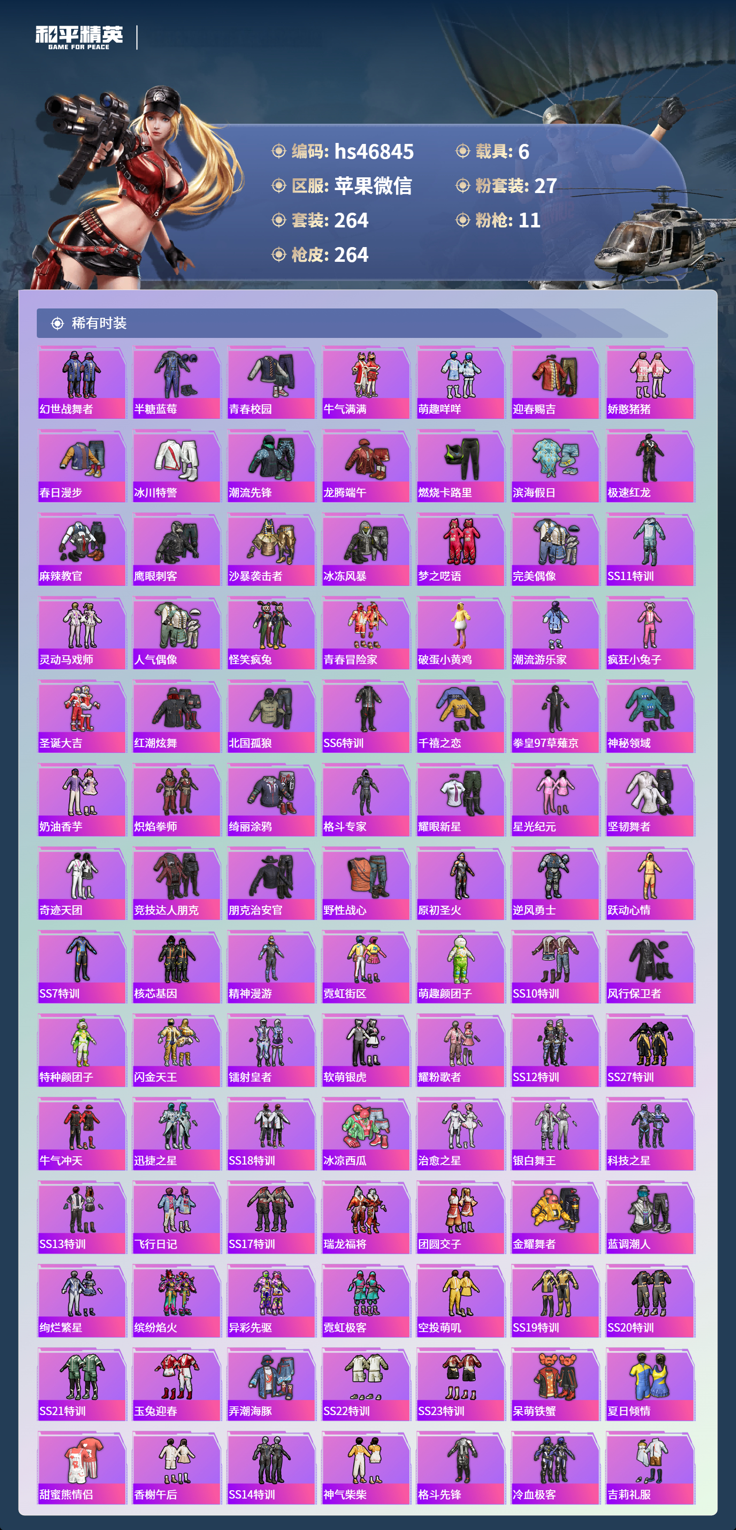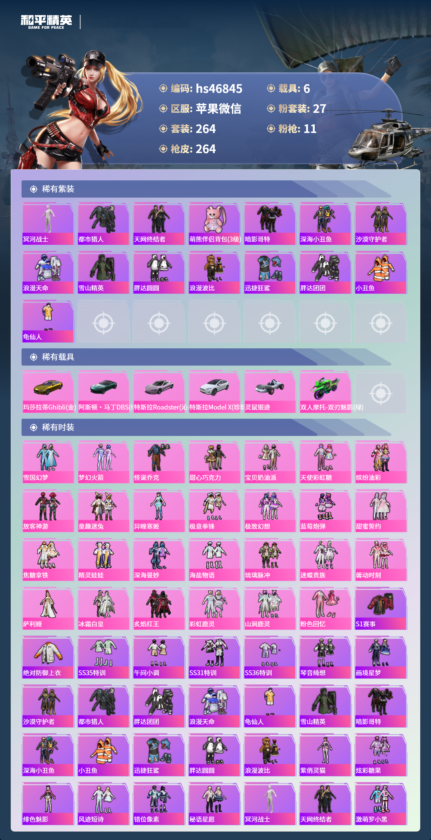 hs46845 苹果微信-26王牌印记-有战神框-27粉装-11特效呛-6载具-热力值-264套装-264呛皮-3卓越印记-2传奇印记【27粉装】套装-彩虹鹿灵套装-甜蜜誓约角色-萨利娅套装-深海曼妙套装-馨动时刻套装-放客神游套装-天使彩虹糖套装-琉璃脉冲套装-炙焰红王套装-极致幻想套装-焦糖拿铁套装-粉色回忆套装-迷蝶贵族套装-怪诞乔克角色-异瞳寒姬