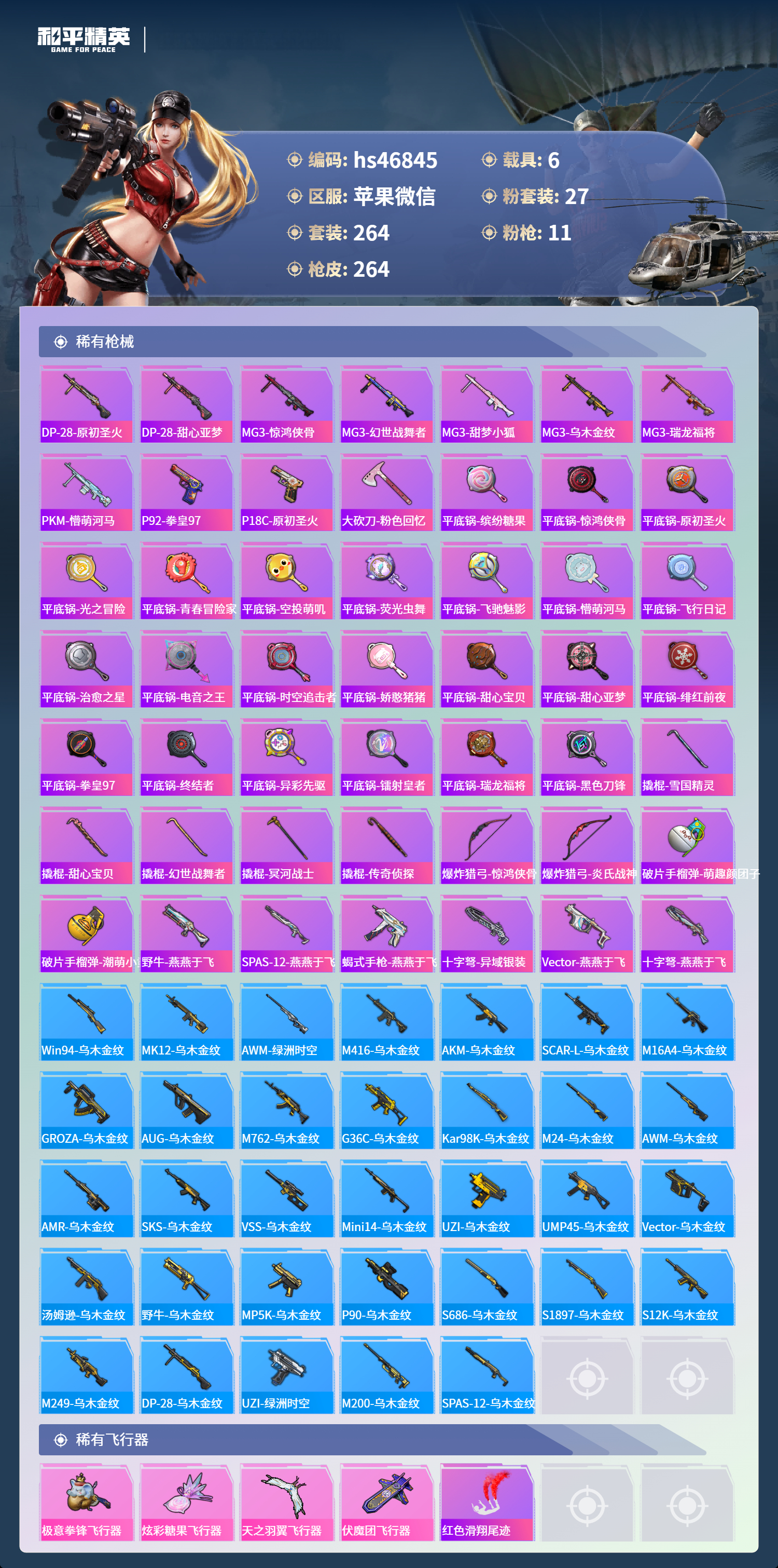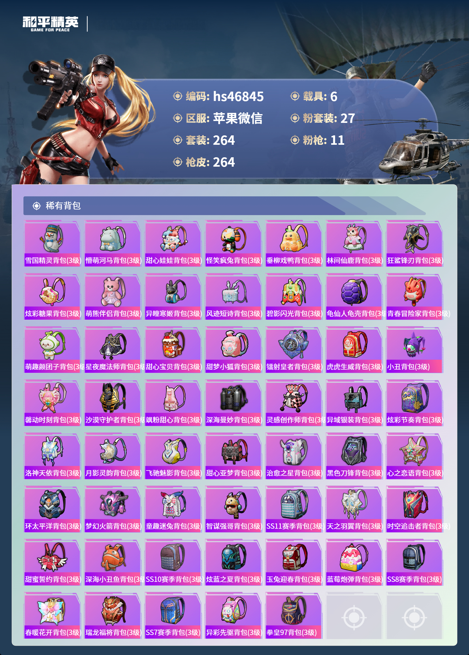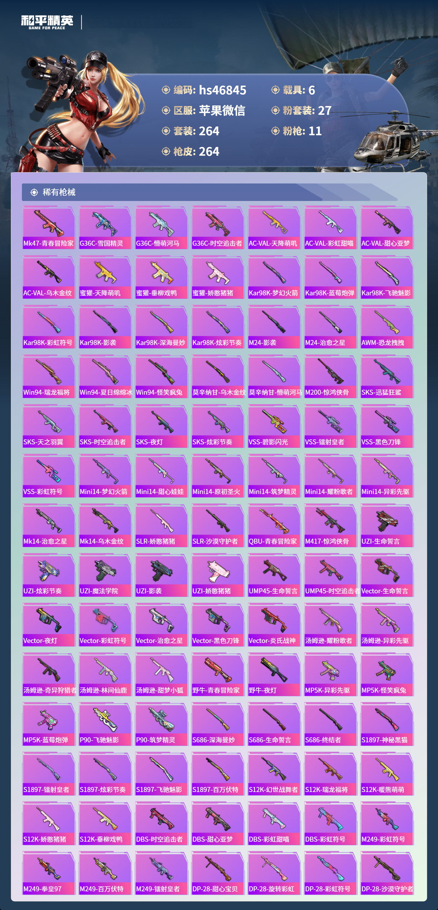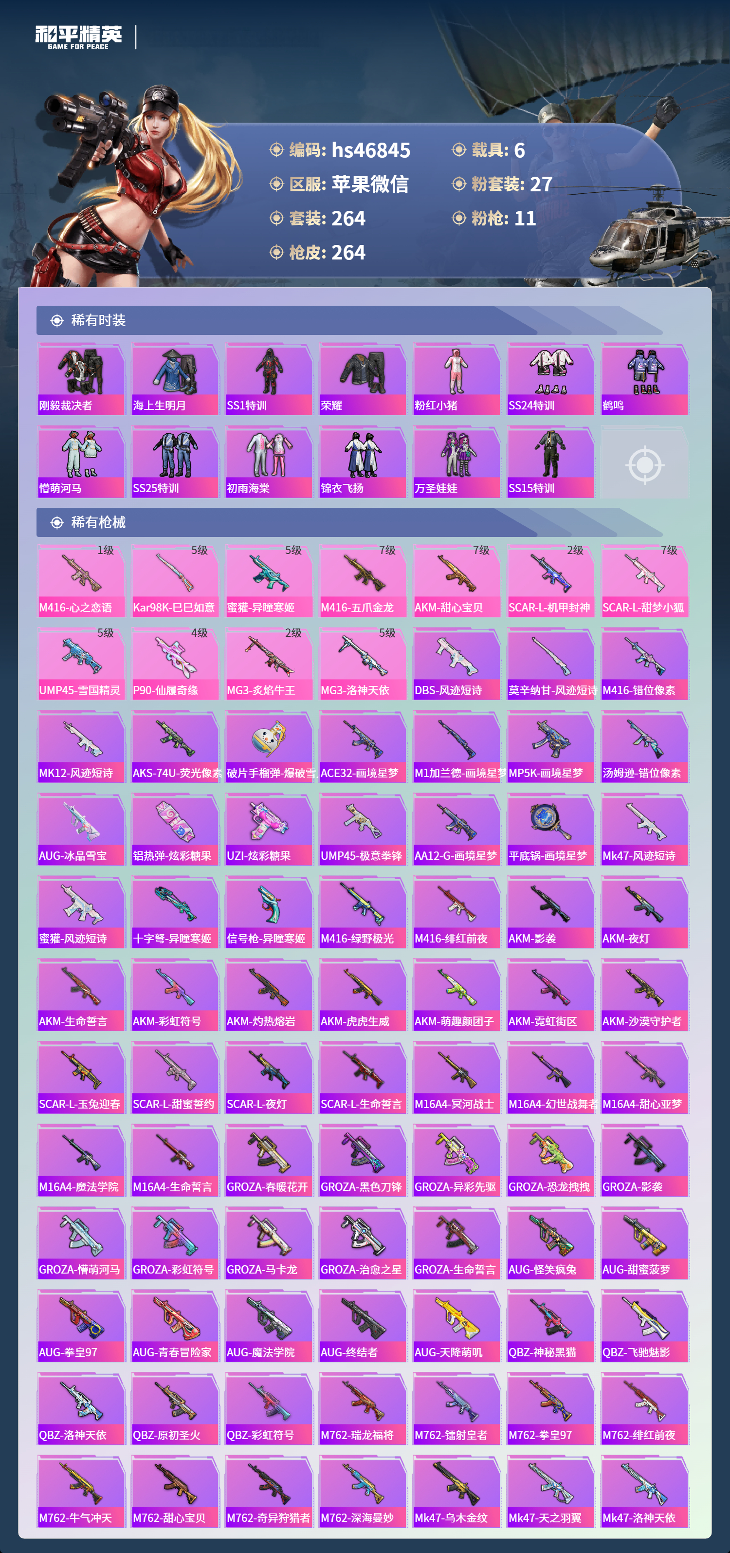 hs46845 苹果微信-26王牌印记-有战神框-27粉装-11特效呛-6载具-热力值-264套装-264呛皮-3卓越印记-2传奇印记【27粉装】套装-彩虹鹿灵套装-甜蜜誓约角色-萨利娅套装-深海曼妙套装-馨动时刻套装-放客神游套装-天使彩虹糖套装-琉璃脉冲套装-炙焰红王套装-极致幻想套装-焦糖拿铁套装-粉色回忆套装-迷蝶贵族套装-怪诞乔克角色-异瞳寒姬