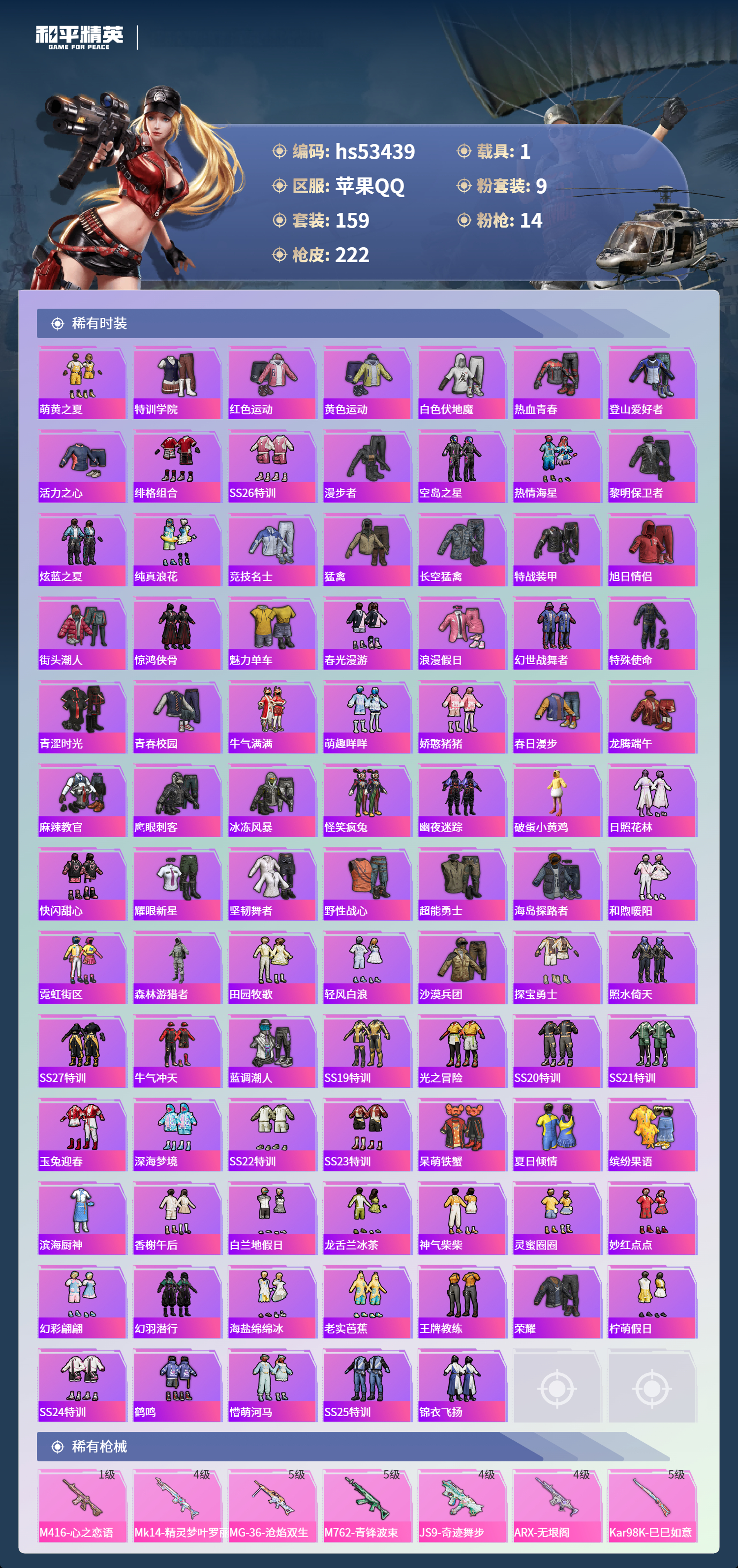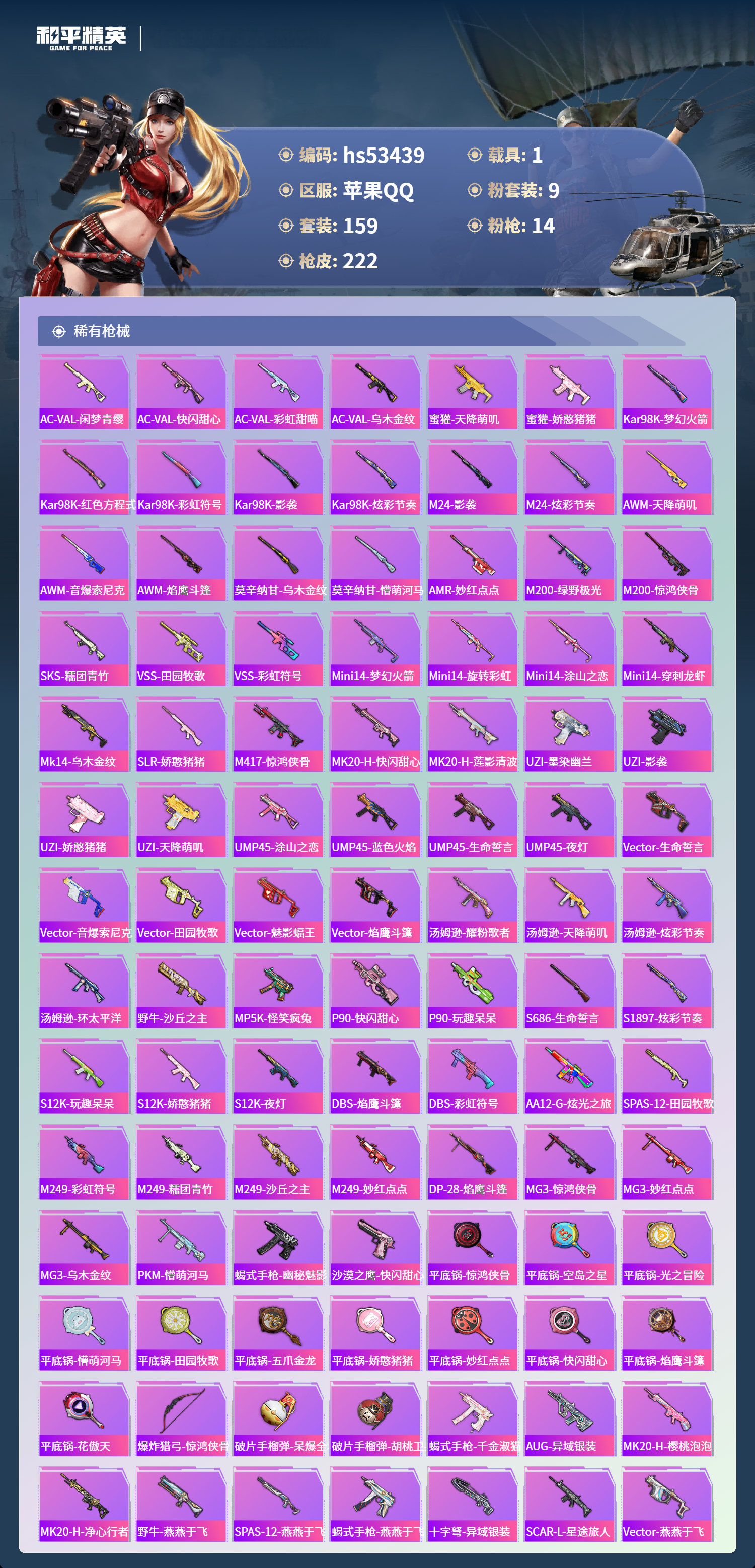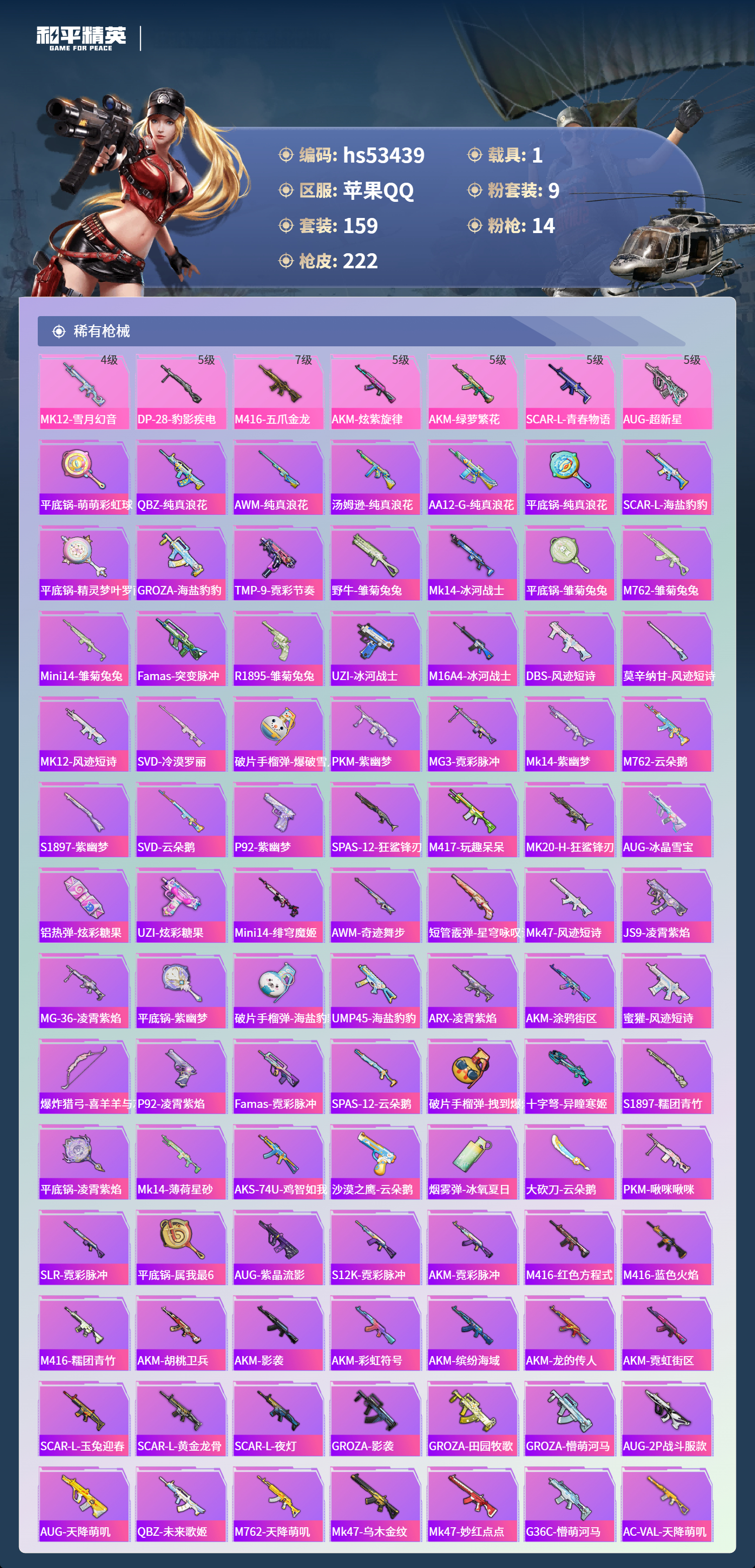 hs53439 苹果手q-11王牌印记-9粉装-14特效呛-1载具-72190热力值-159套装-222呛皮-4卓越印记【9粉装】角色-萨利娅套装-放客神游套装-傲傲奶龙套装-莲影清波角色-光极星套装-幻彩电音套装-梦幻火箭角色-奇迹舞步 美雪套装-音爆索尼克【14特效呛】mk14-精灵梦叶罗丽/4级arx-无垠阁/4级m762-青锋波束/5级mg-36-沧焰双生/5级