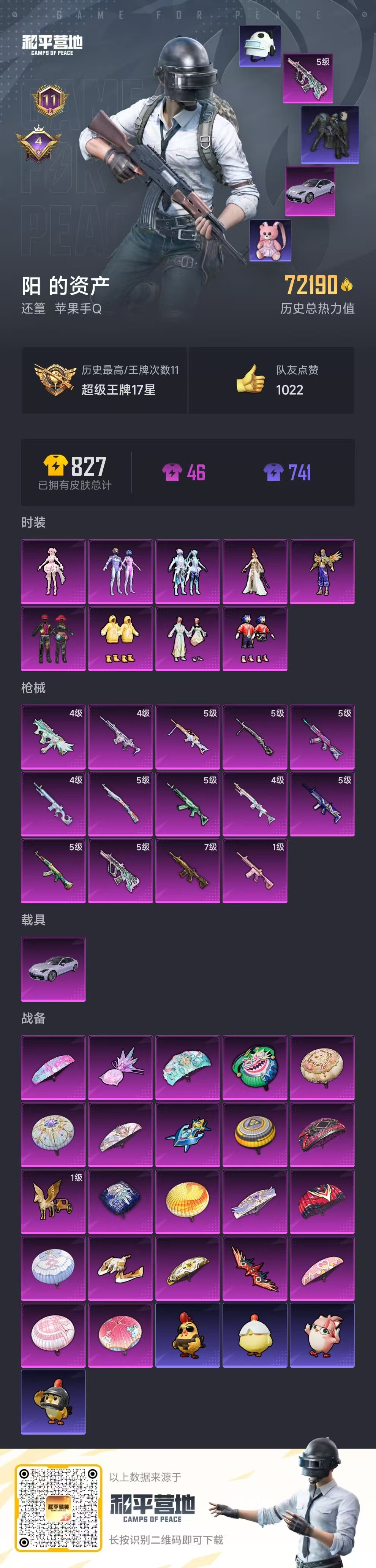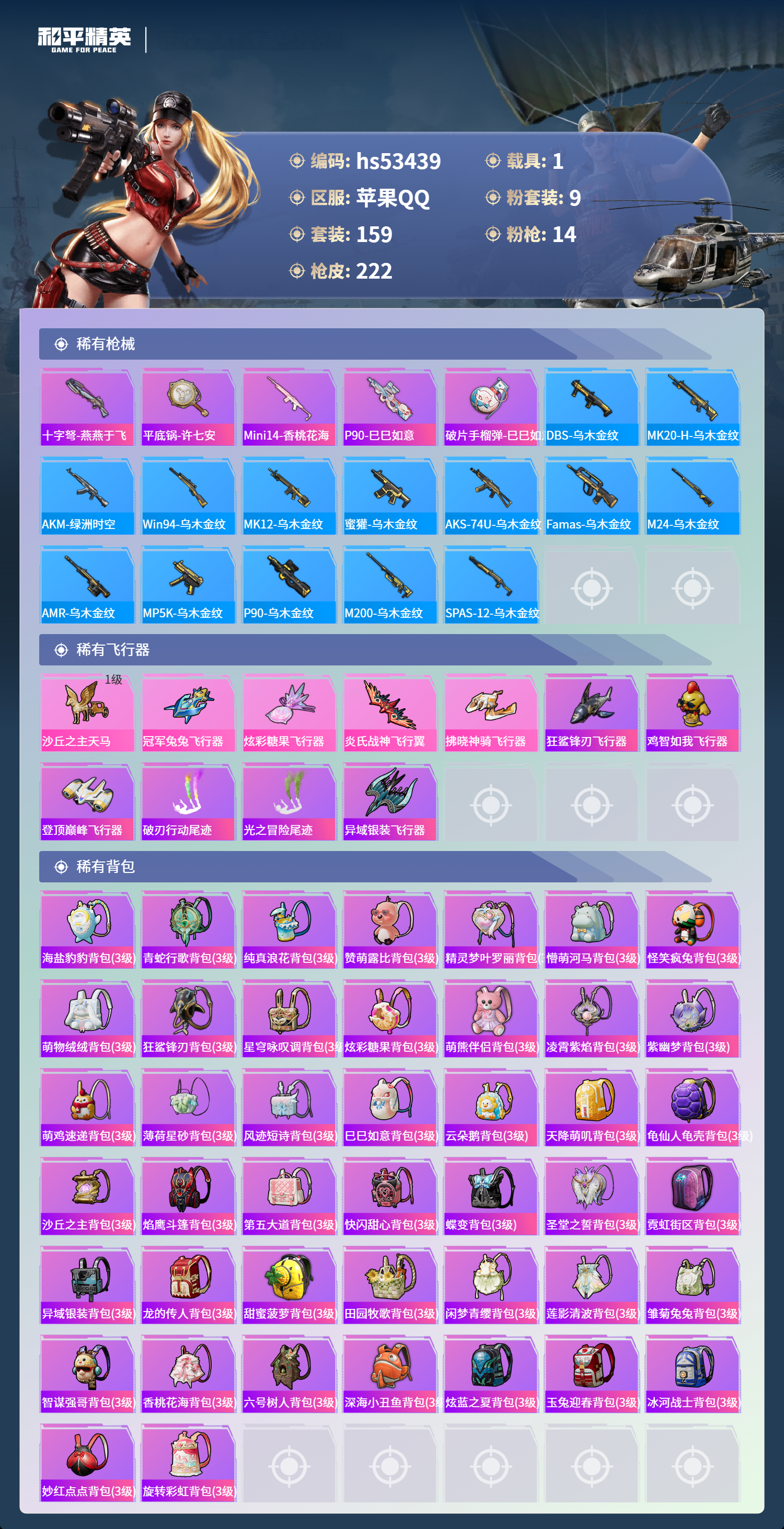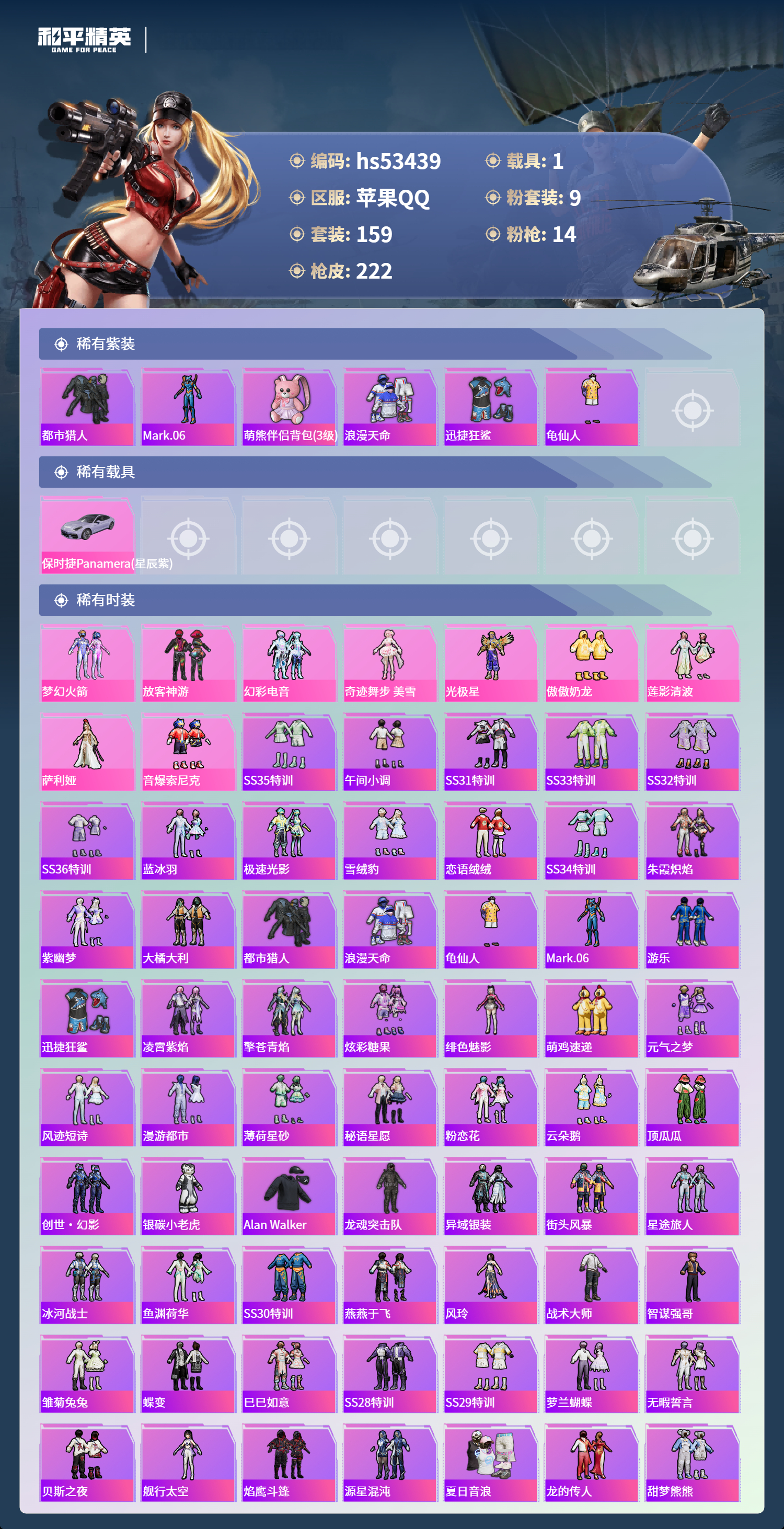 hs53439 苹果手q-11王牌印记-9粉装-14特效呛-1载具-72190热力值-159套装-222呛皮-4卓越印记【9粉装】角色-萨利娅套装-放客神游套装-傲傲奶龙套装-莲影清波角色-光极星套装-幻彩电音套装-梦幻火箭角色-奇迹舞步 美雪套装-音爆索尼克【14特效呛】mk14-精灵梦叶罗丽/4级arx-无垠阁/4级m762-青锋波束/5级mg-36-沧焰双生/5级