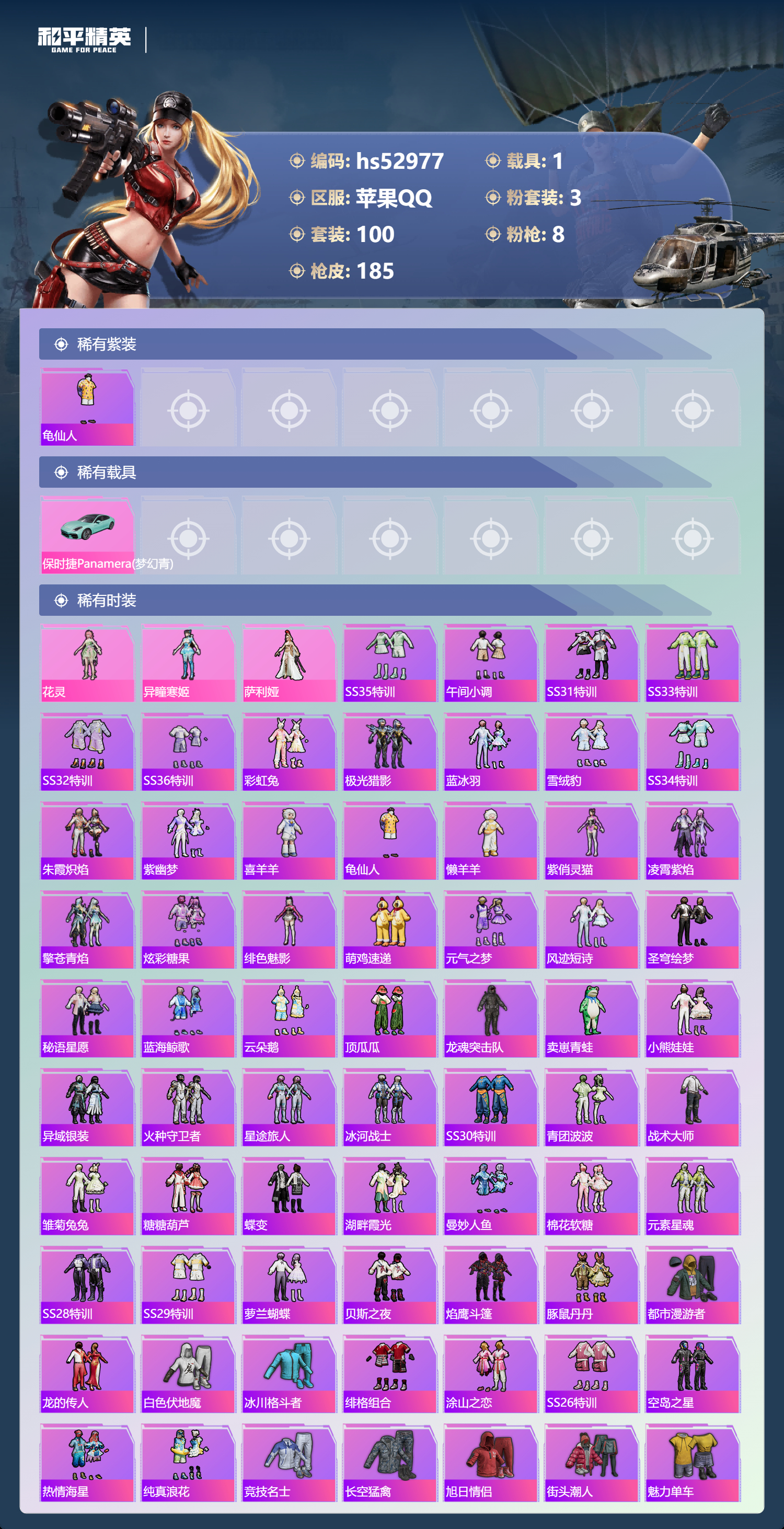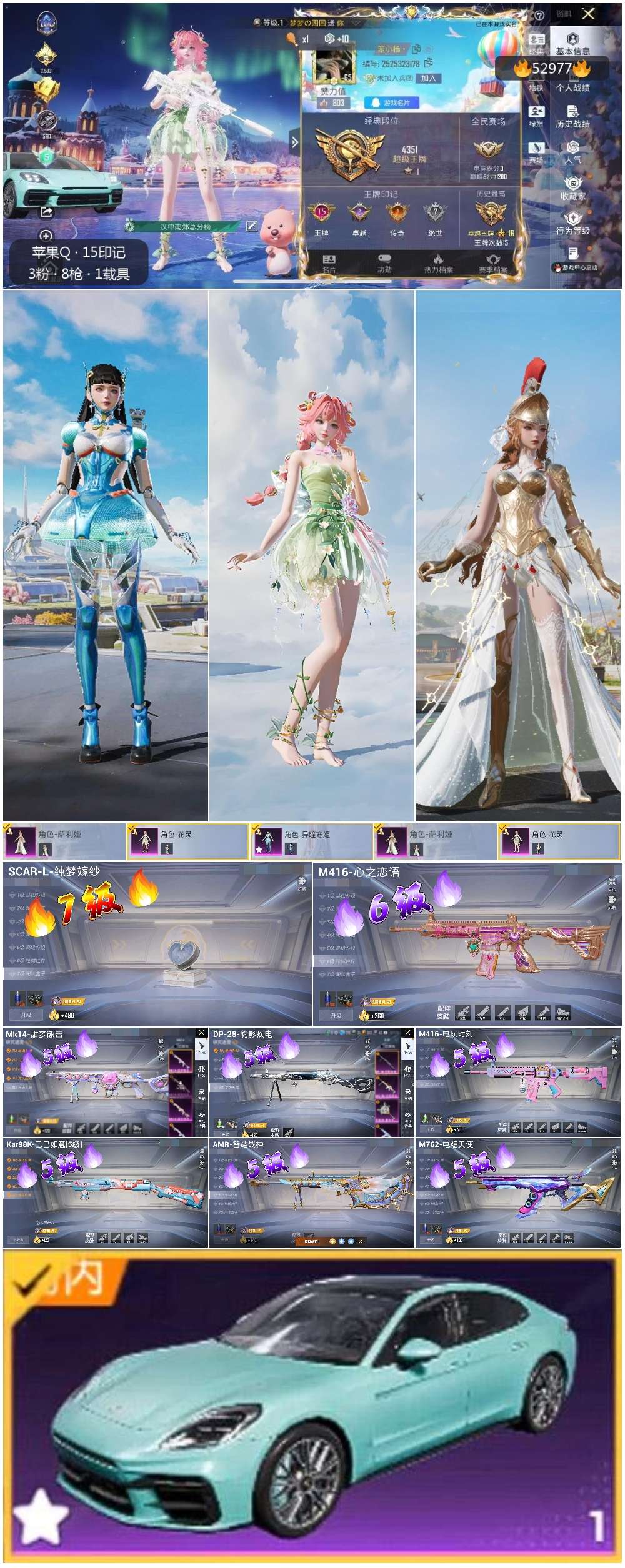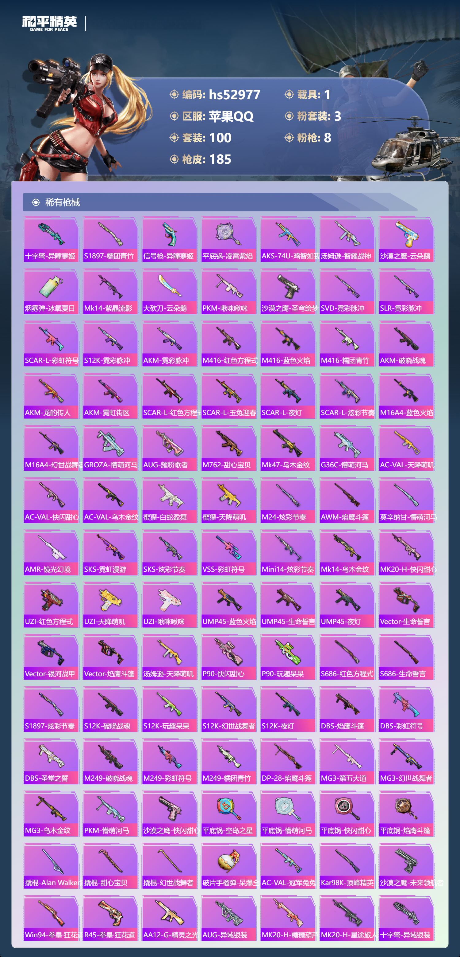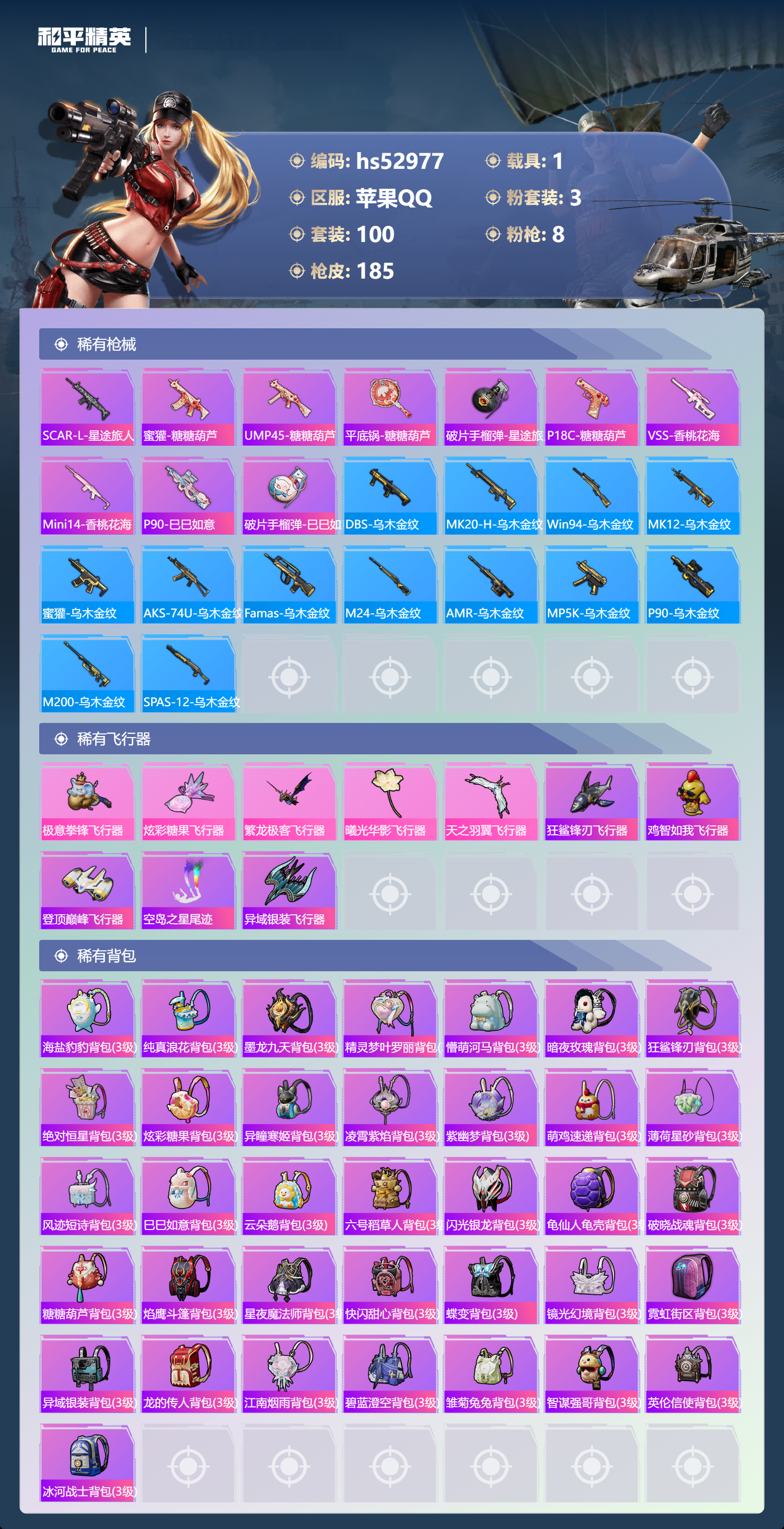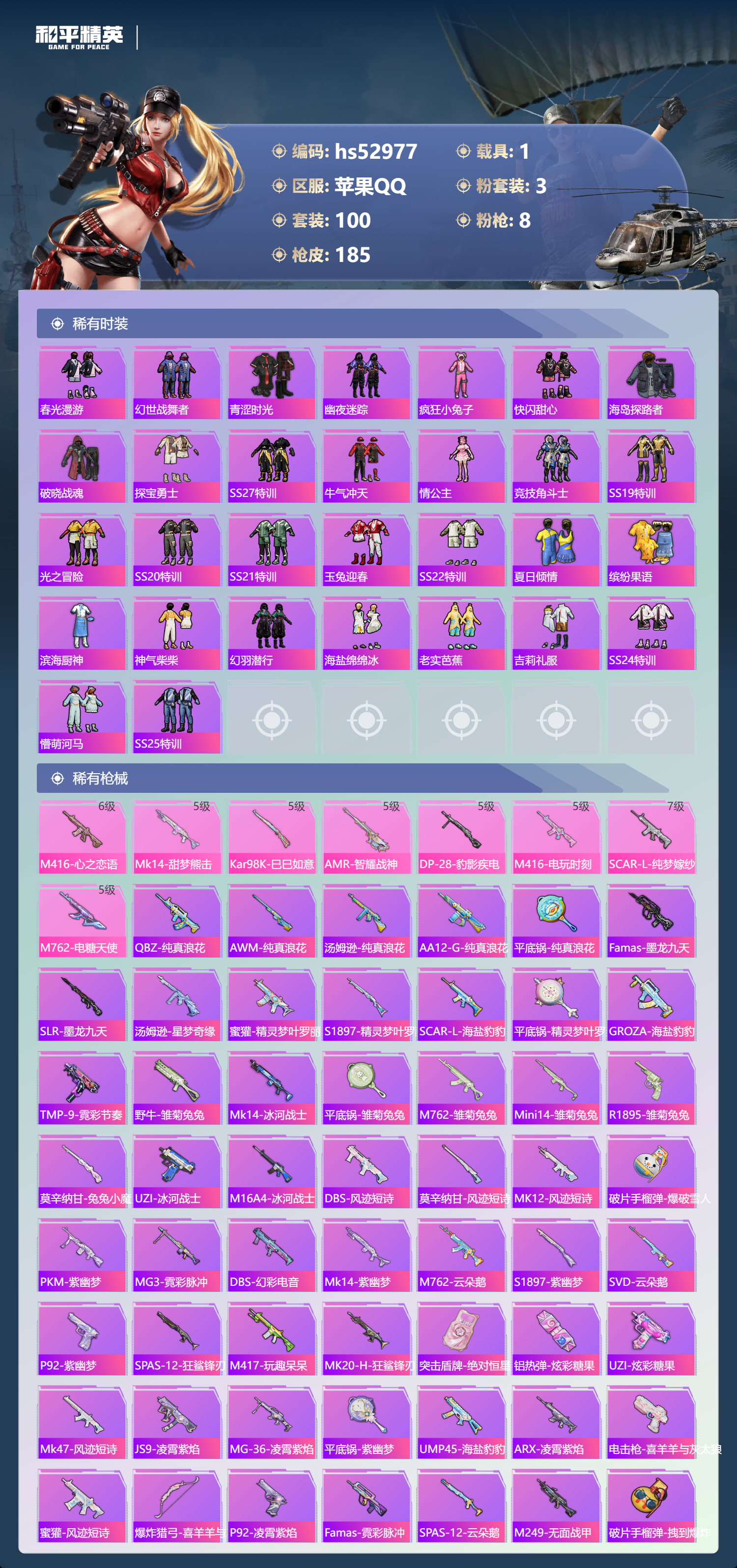 hs52977 苹果手q-15王牌印记-3粉装-8特效呛-1载具-57702热力值-100套装-185呛皮-2卓越印记-1传奇印记【3粉装】角色-异瞳寒姬角色-萨利娅角色-花灵【8特效呛】m762-电糖天使/5级kar98k-巳巳如意/5级dp-28-豹影疾电/5级m416-心之恋语/6级scar-l-纯梦嫁纱/7级m416-电玩时刻/5级mk14-甜梦熊击/5级amr-智耀