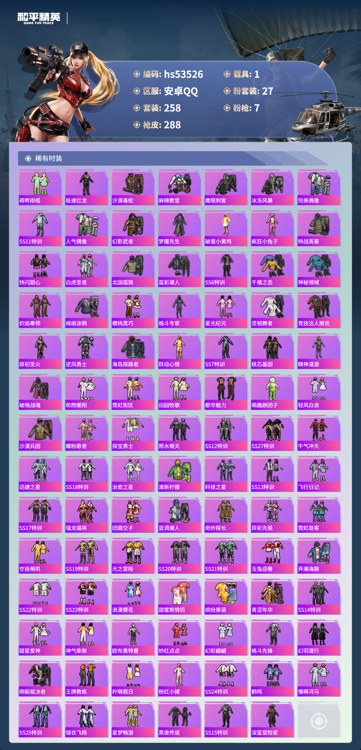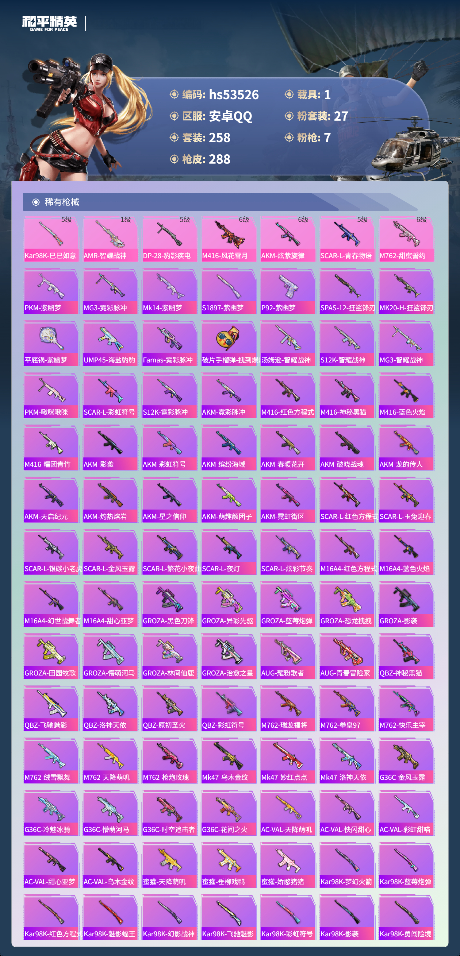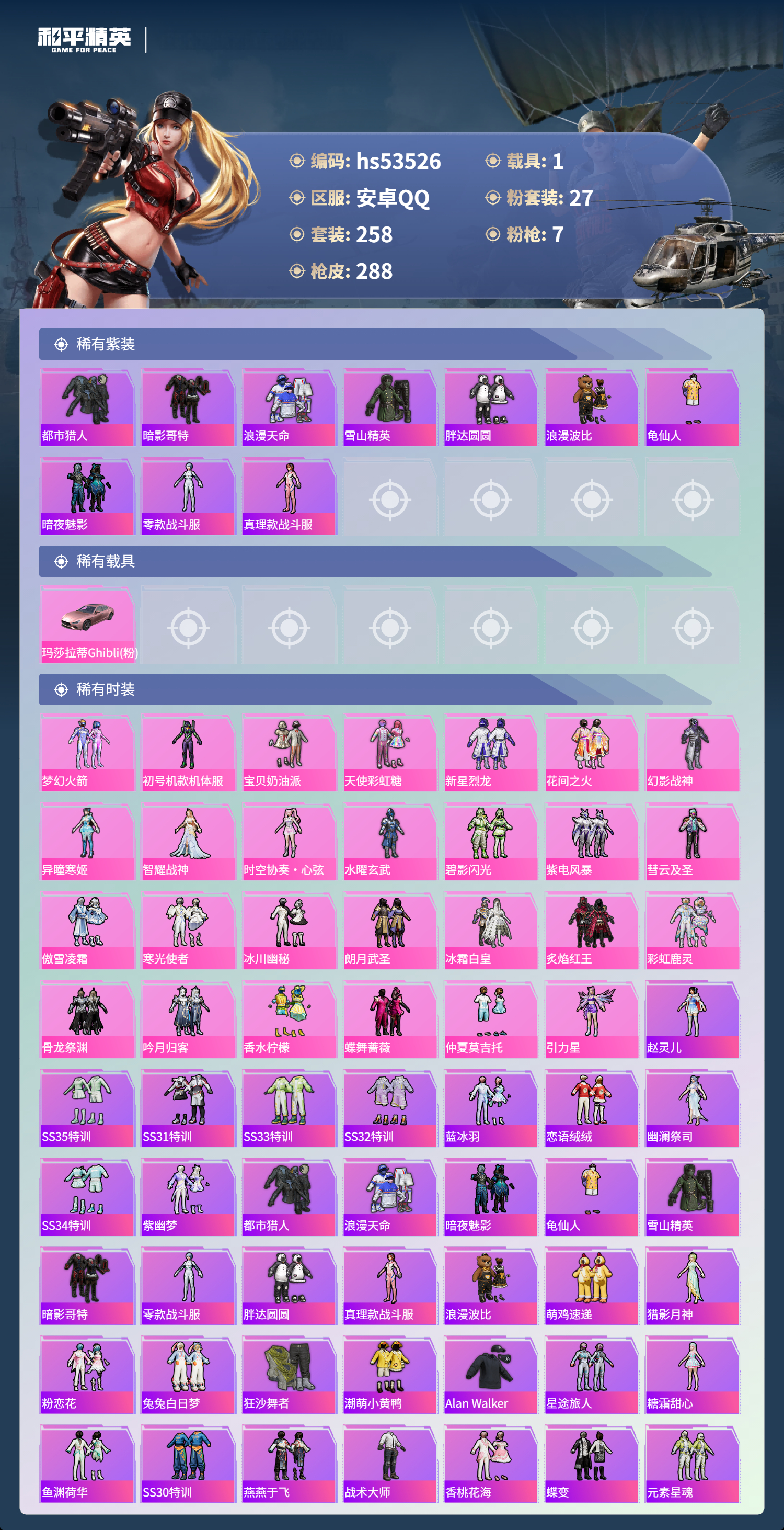 hs53526 安卓手q-13王牌印记-27粉装-7特效呛-1载具-热力值-258套装-288呛皮-3卓越印记【27粉装】套装-朗月武圣套装-宝贝奶油派套装-幻影战神角色-引力星套装-傲雪凌霜套装-新星烈龙角色-初号机款机体服套装-水曜玄武套装-梦幻火箭套装-紫电风暴套装-寒光使者套装-仲夏莫吉托角色-异瞳寒姬角色-智耀战神套装-碧影闪光套装-天使彩虹糖