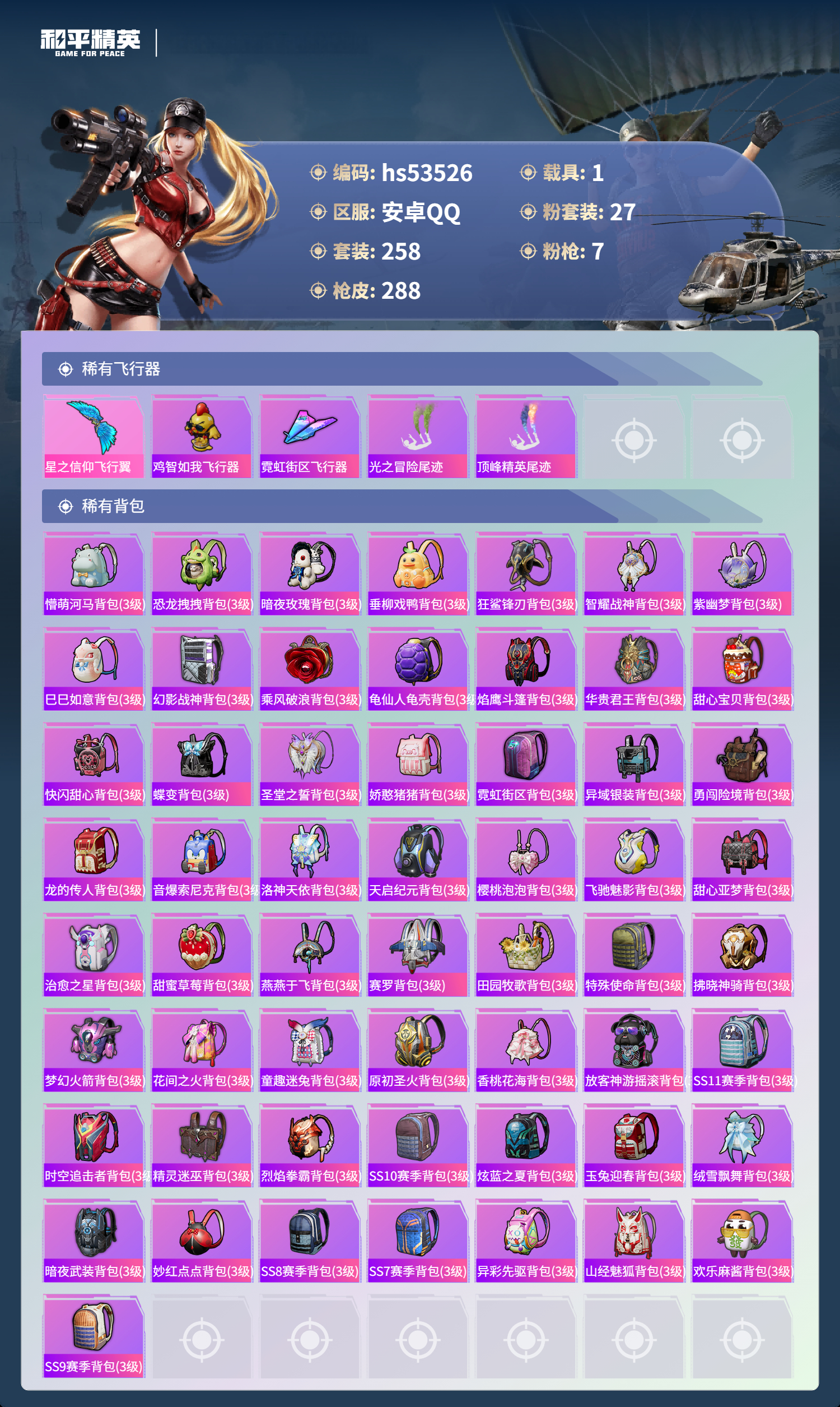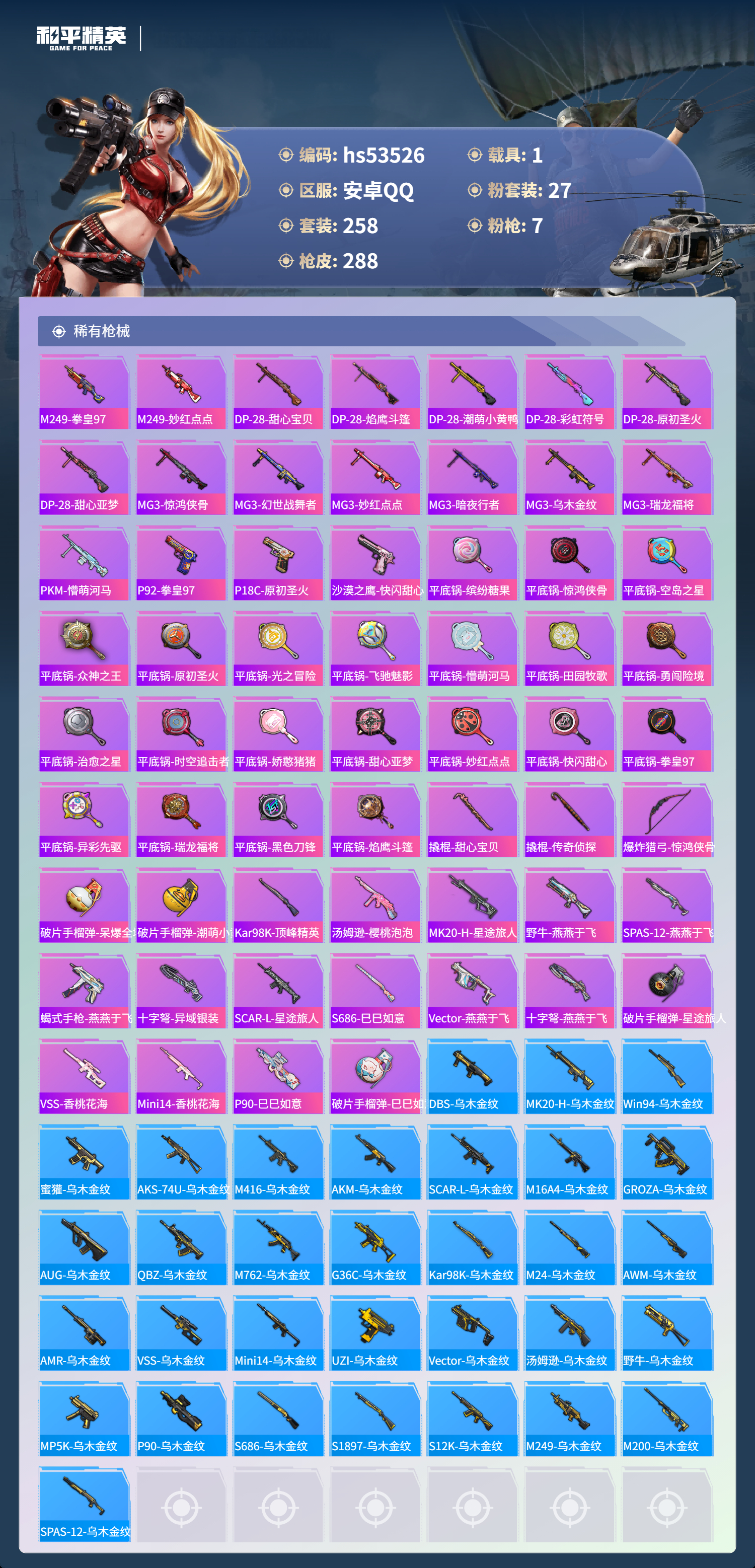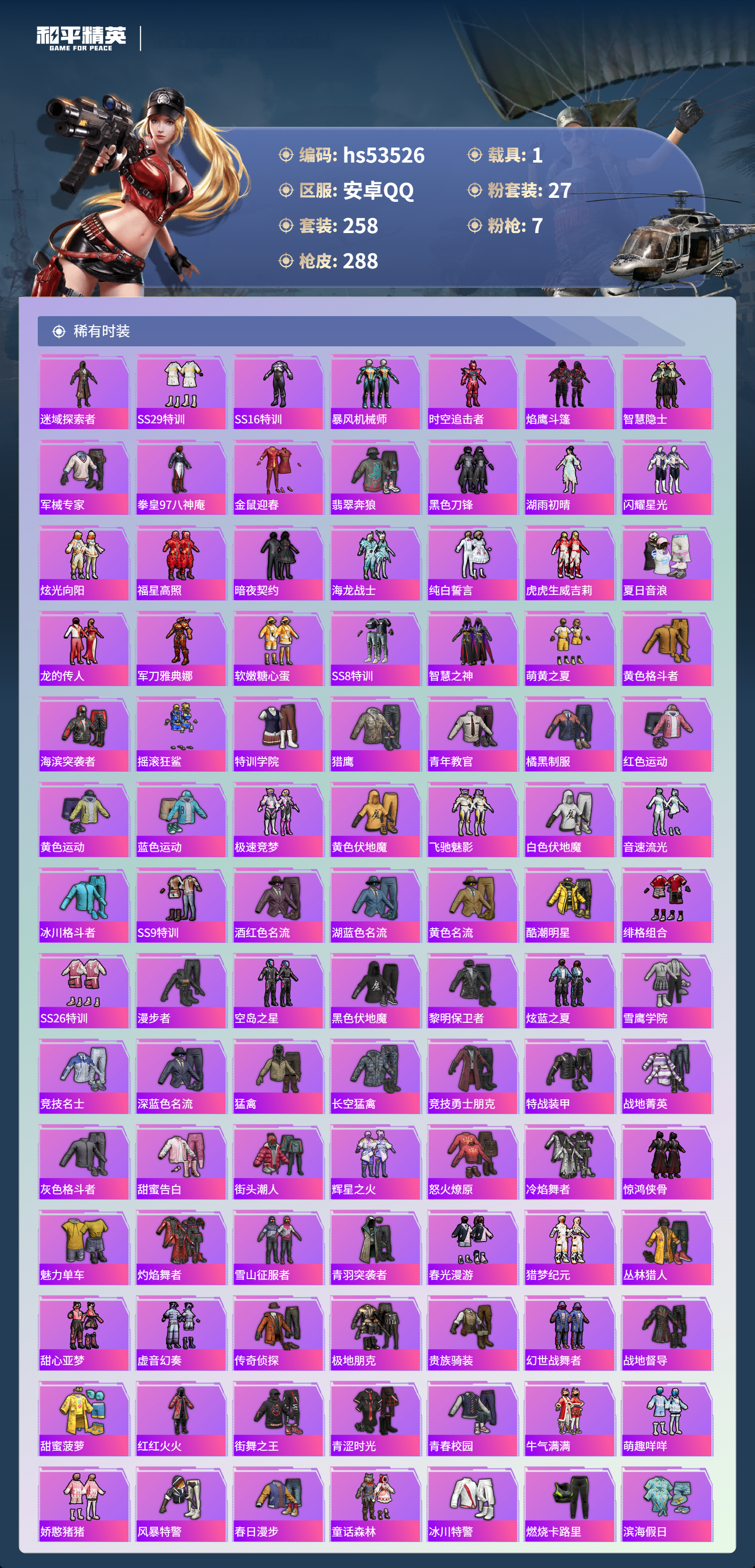 hs53526 安卓手q-13王牌印记-27粉装-7特效呛-1载具-热力值-258套装-288呛皮-3卓越印记【27粉装】套装-朗月武圣套装-宝贝奶油派套装-幻影战神角色-引力星套装-傲雪凌霜套装-新星烈龙角色-初号机款机体服套装-水曜玄武套装-梦幻火箭套装-紫电风暴套装-寒光使者套装-仲夏莫吉托角色-异瞳寒姬角色-智耀战神套装-碧影闪光套装-天使彩虹糖