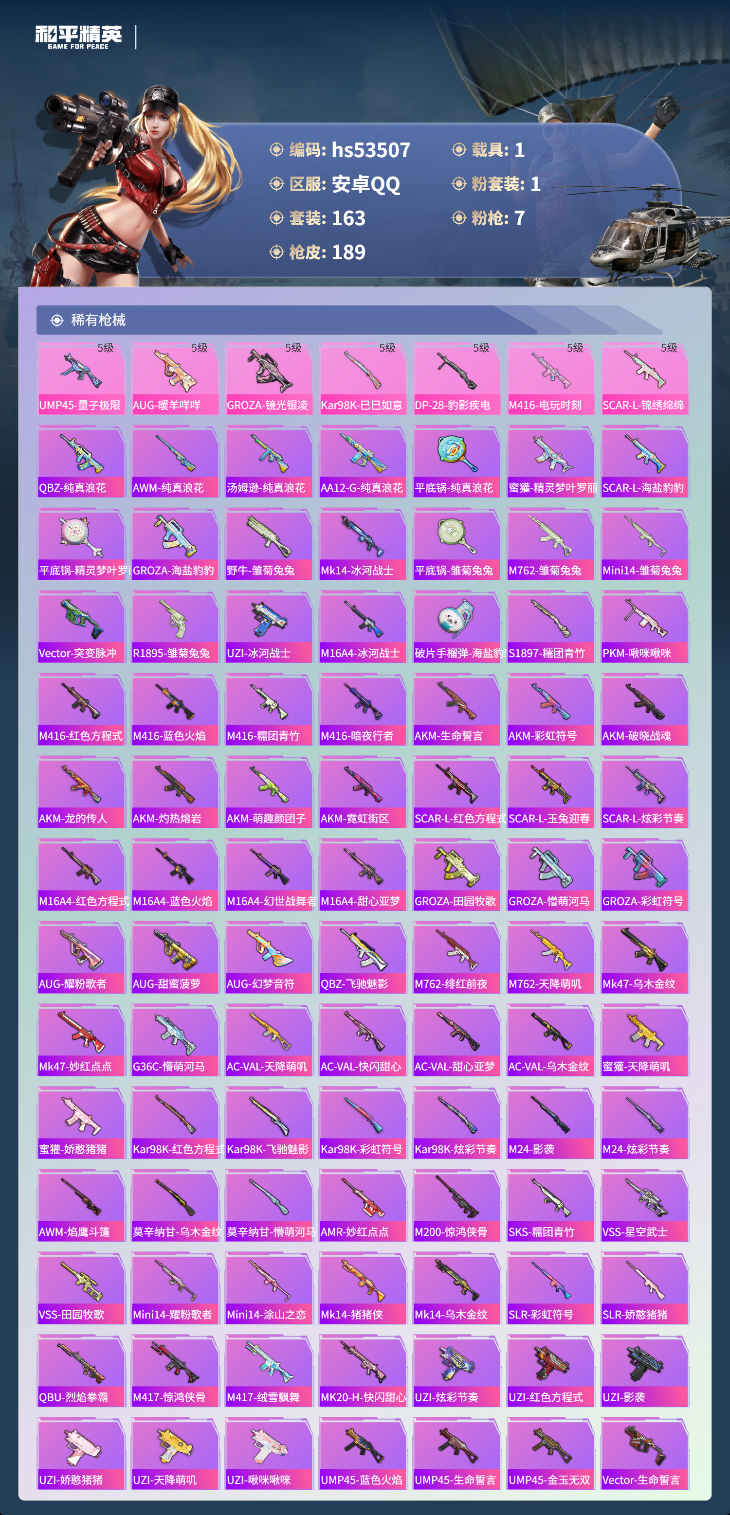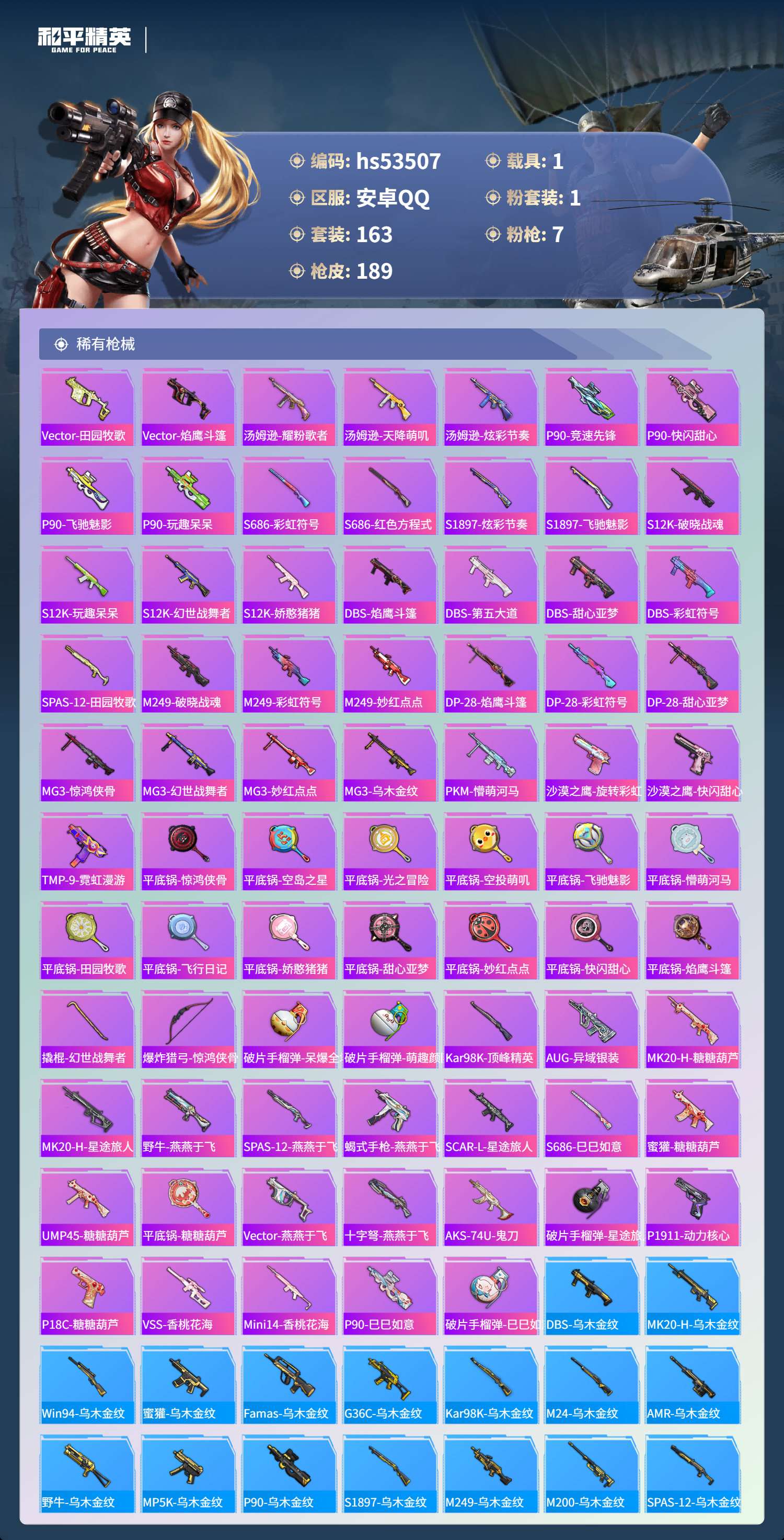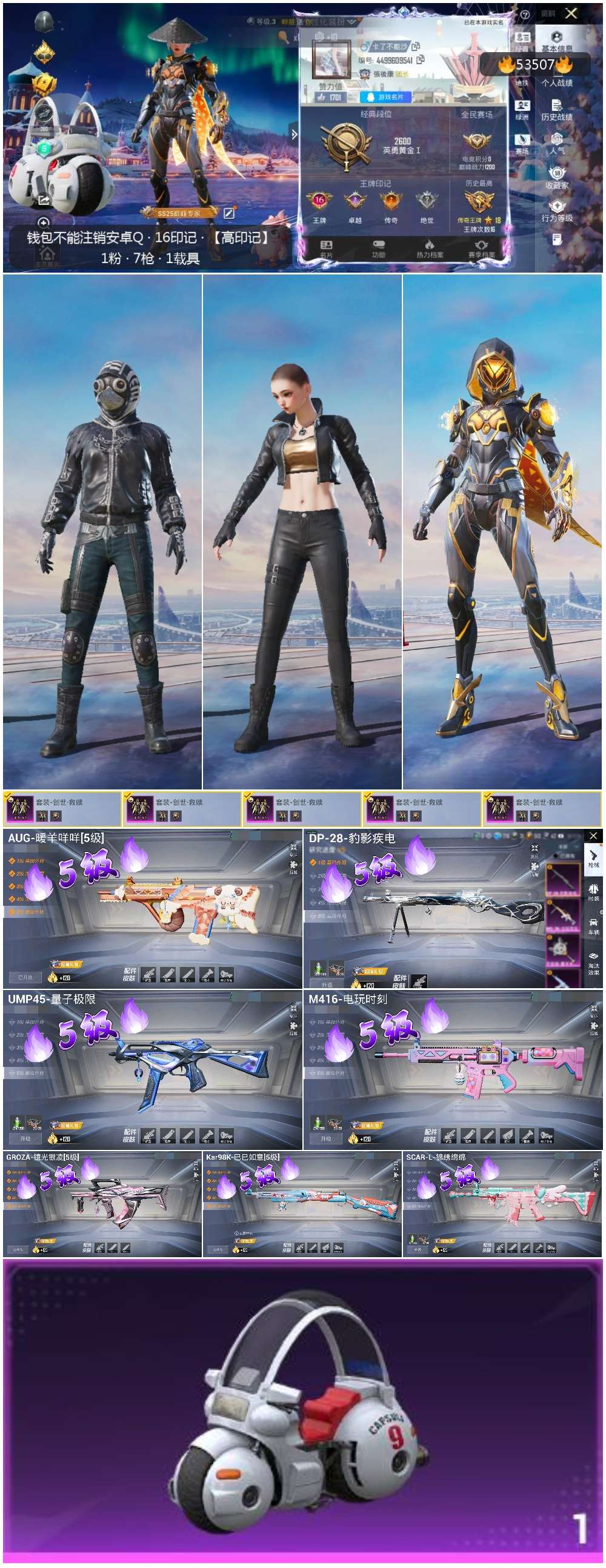 hs53507 安卓手q-16王牌印记-1粉装-7特效呛-1载具-57604热力值-163套装-189呛皮-3卓越印记-2传奇印记【1粉装】套装-创世·救赎【7特效呛】scar-l-锦绣绵绵/5级kar98k-巳巳如意/5级aug-暖羊咩咩/5级ump45-量子极限/5级m416-电玩时刻/5级groza-镜光银凌/5级dp-28-豹影疾电/5级【2稀有紫装】龟仙人怀庆长公主