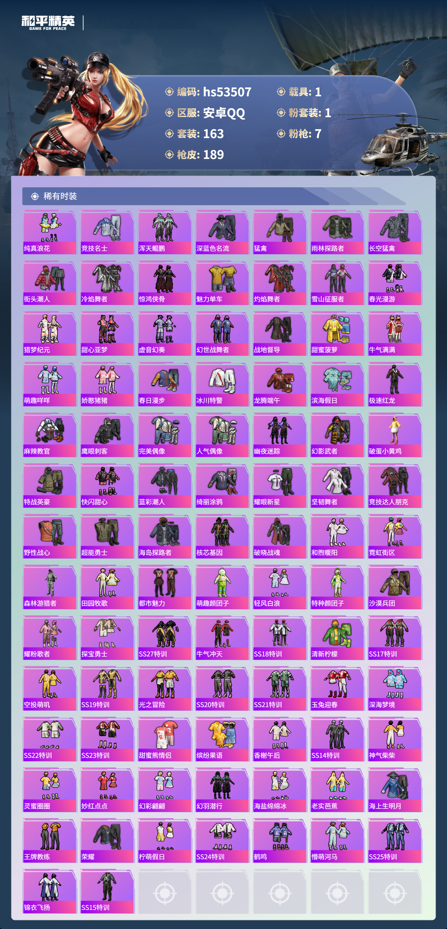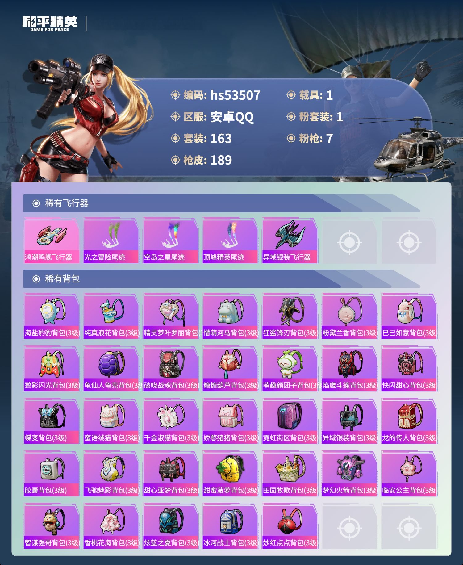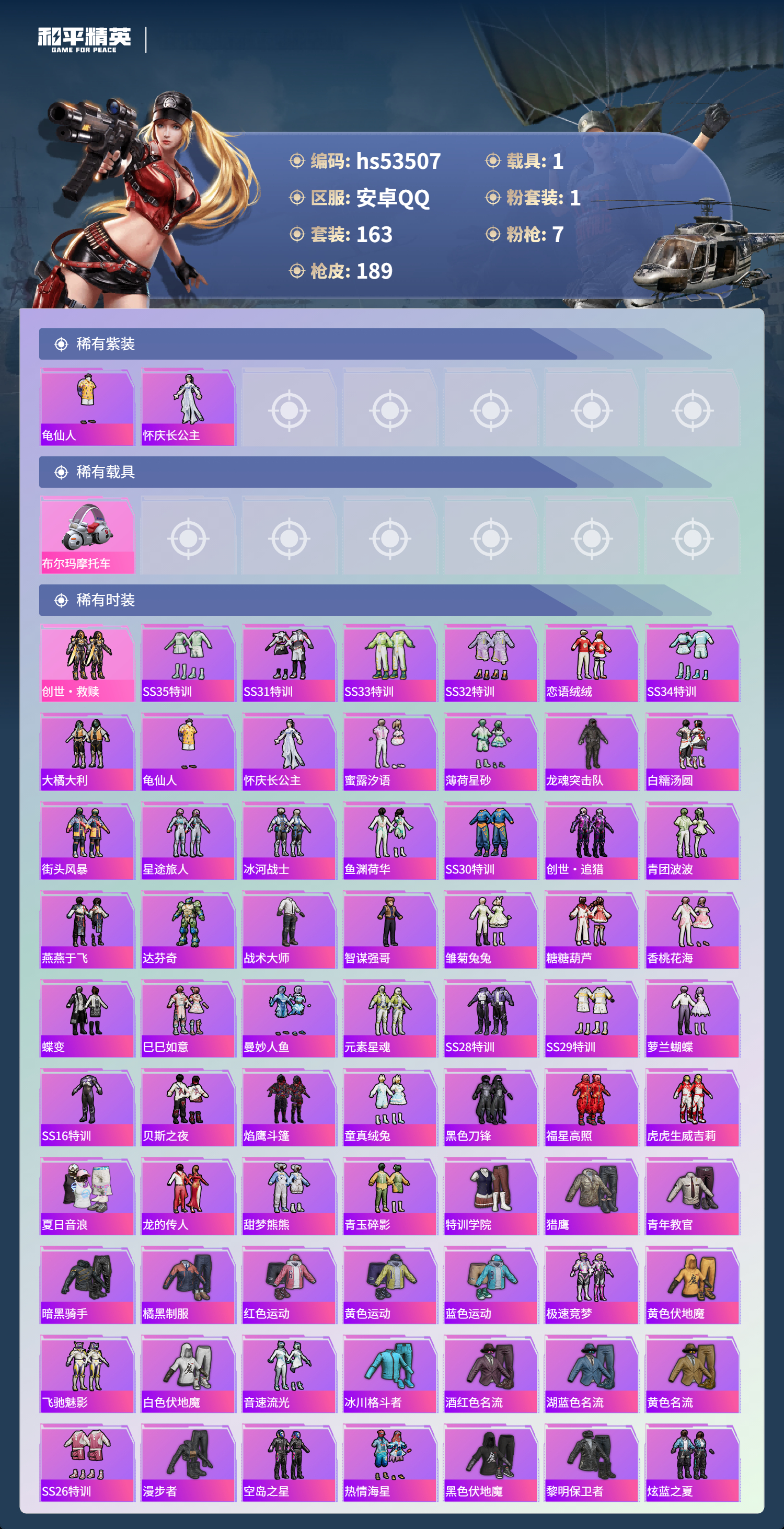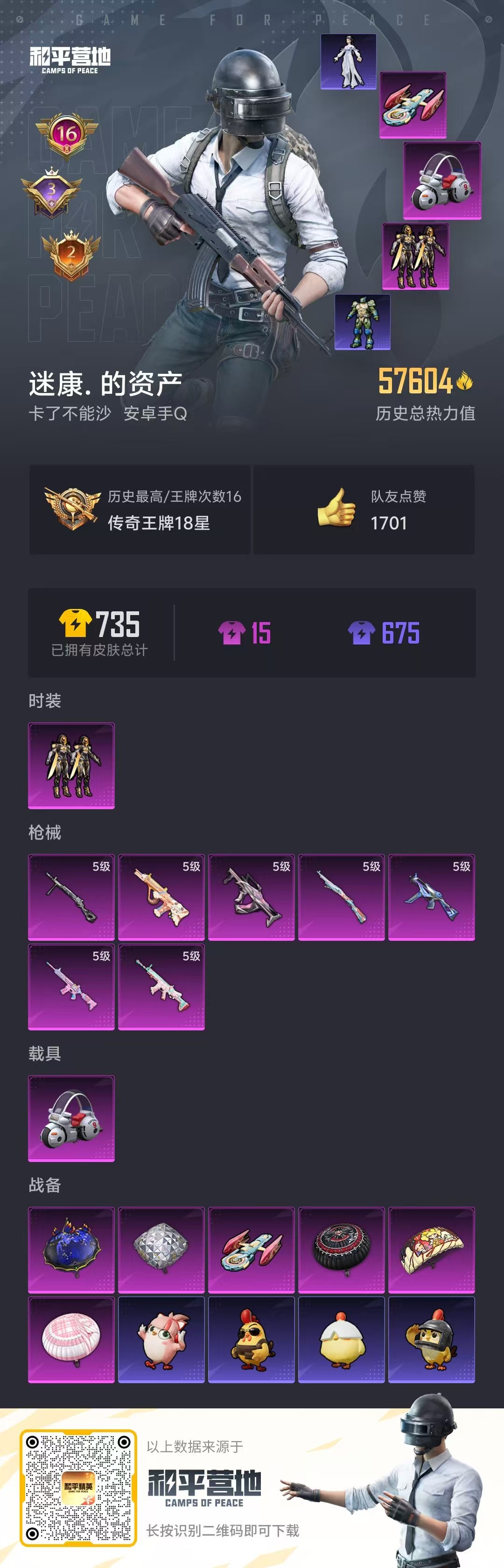 hs53507 安卓手q-16王牌印记-1粉装-7特效呛-1载具-57604热力值-163套装-189呛皮-3卓越印记-2传奇印记【1粉装】套装-创世·救赎【7特效呛】scar-l-锦绣绵绵/5级kar98k-巳巳如意/5级aug-暖羊咩咩/5级ump45-量子极限/5级m416-电玩时刻/5级groza-镜光银凌/5级dp-28-豹影疾电/5级【2稀有紫装】龟仙人怀庆长公主