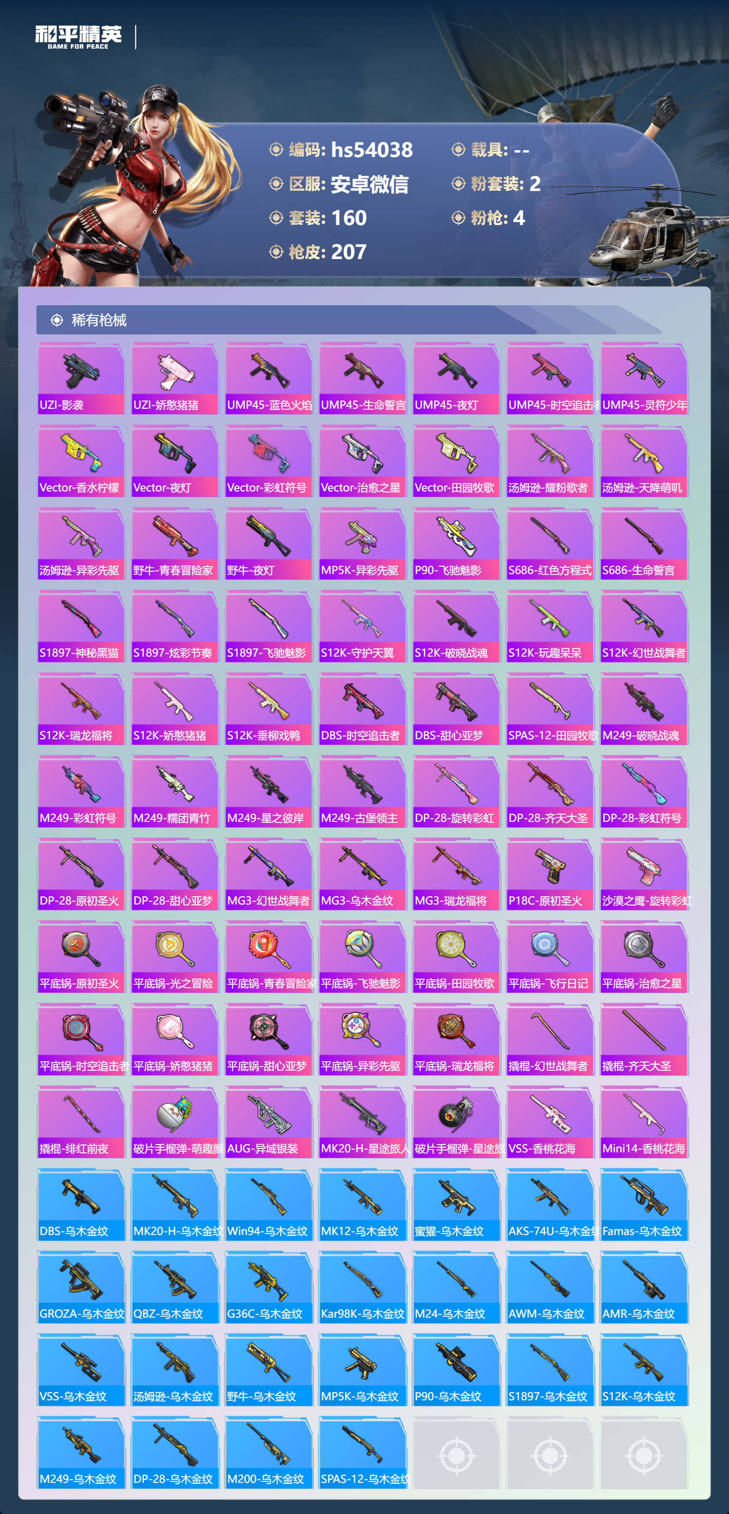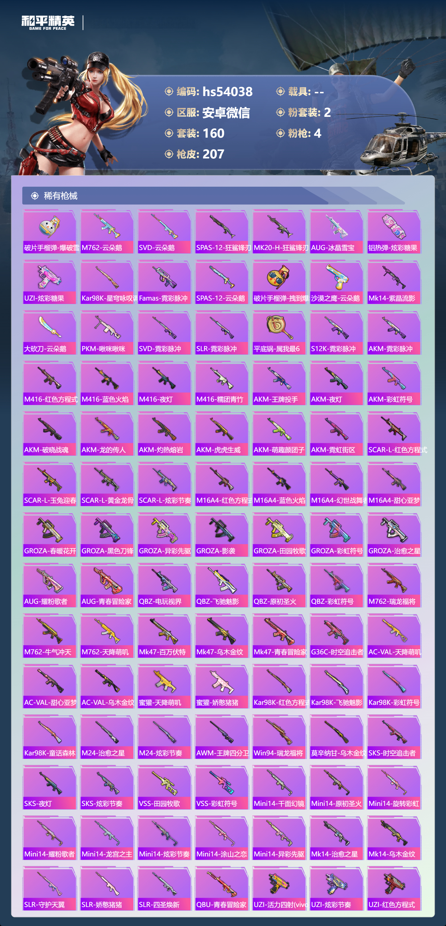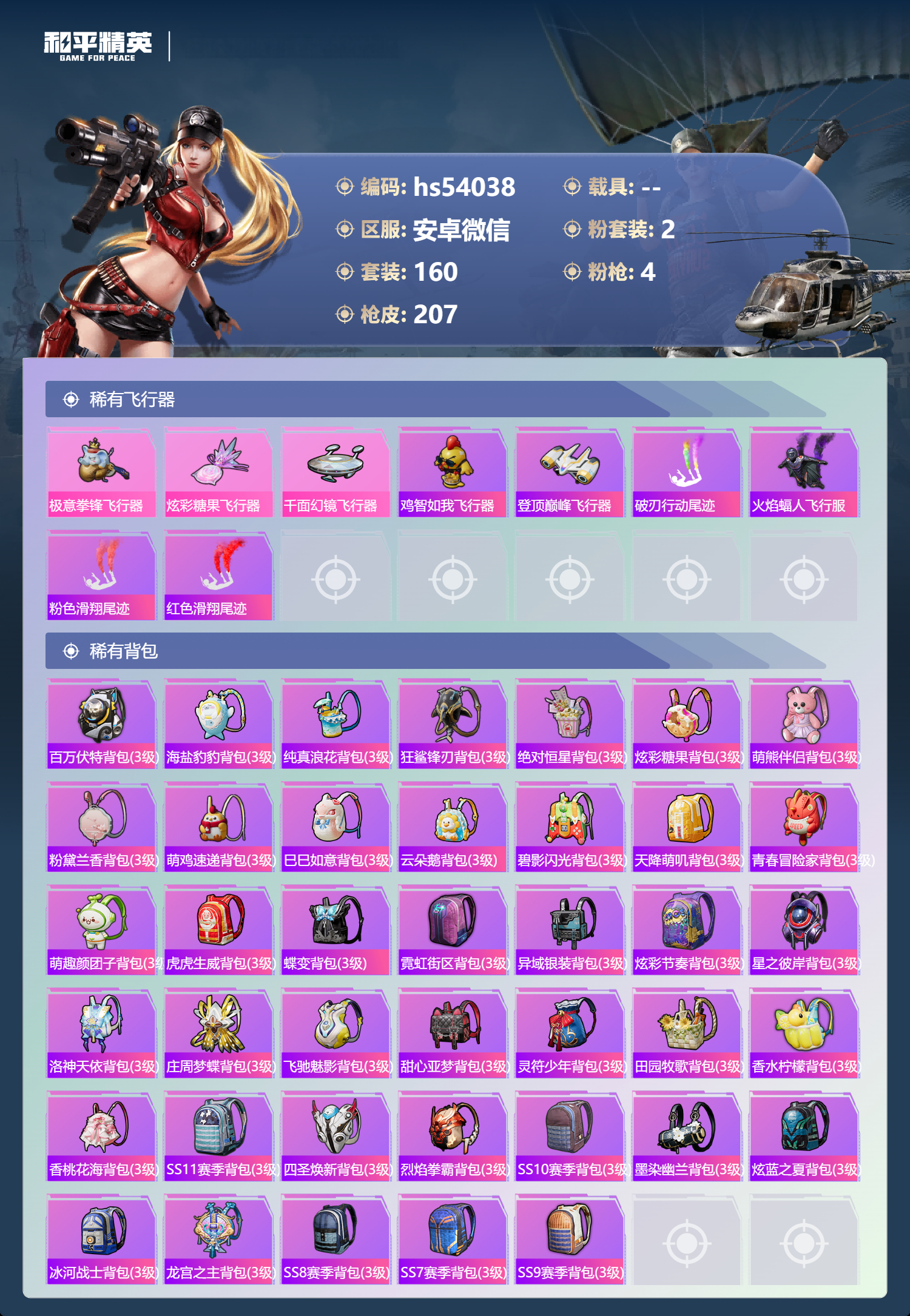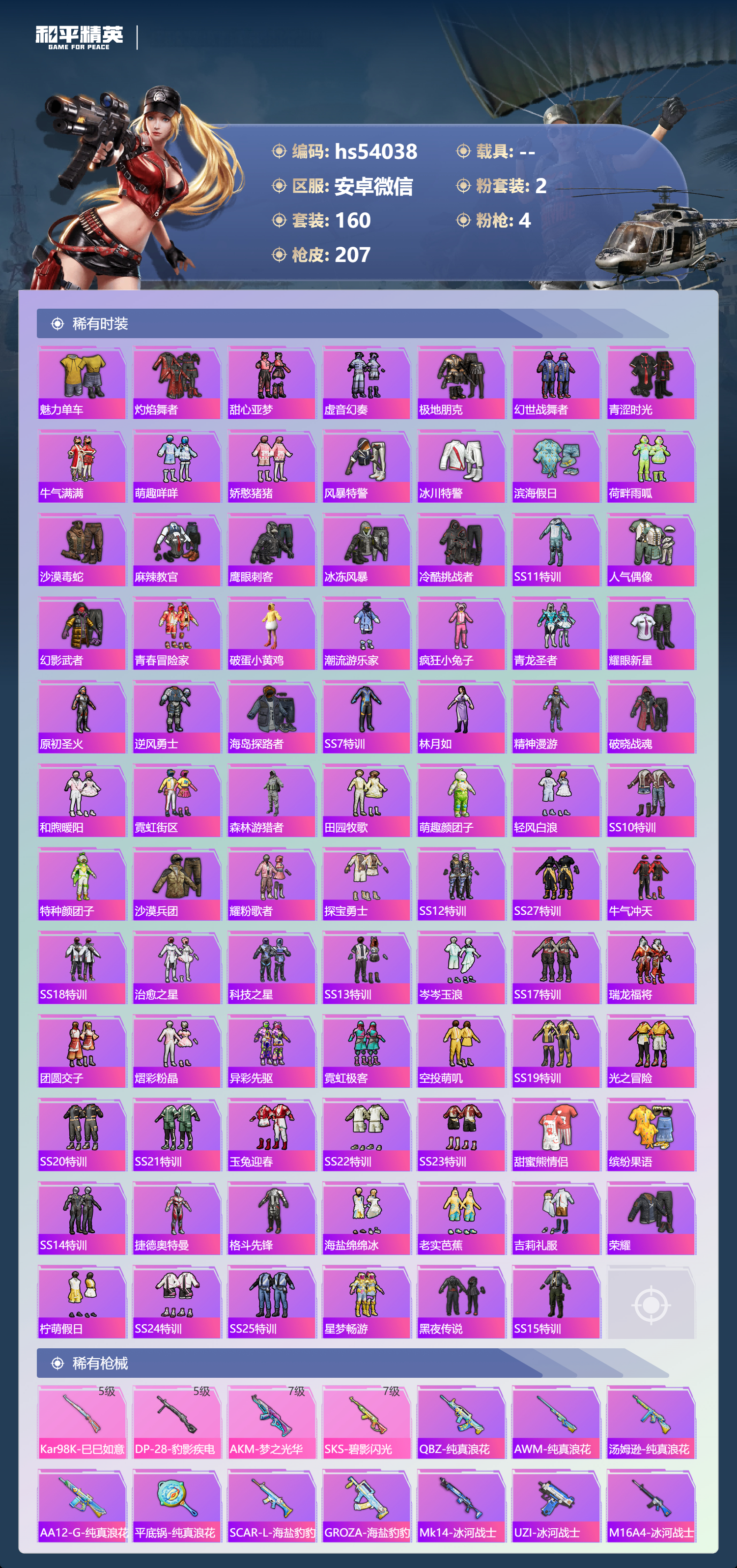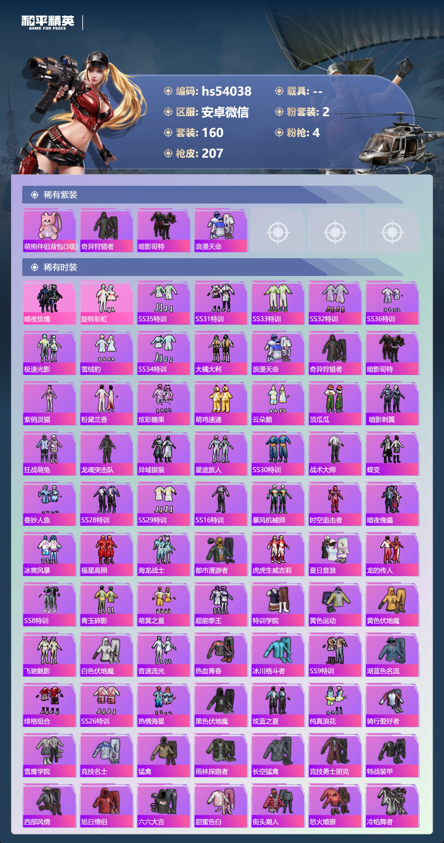 hs54038 安卓微信-16王牌印记-有战神框-2粉装-4特效呛-65230热力值-160套装-207呛皮【2粉装】套装-旋转彩虹套装-暗夜玫瑰【4特效呛】dp-28-豹影疾电/5级akm-梦之光华/7级sks-碧影闪光/7级kar98k-巳巳如意/5级【4稀有紫装】萌熊伴侣背包3级奇异狩猎者暗影哥特浪漫天命【160稀有时装】ss35特训ss31特训ss33特训s