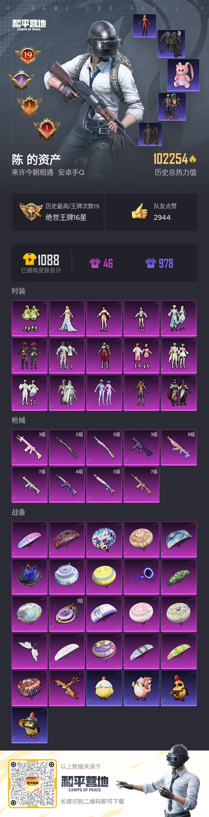 【和平精英】【txhp4943】15粉装,9特效呛,0载具,历史最高段位:绝世王牌16星 王牌印记19次 热力值:102254,213套装,289呛械,390装备,165战备;套装:套装-梦幻火箭,套装-智能音符,套装-放客神游,套装-冰霜白皇,角色-零号机款机体服,套装-沙场疾风,套装-恐龙拽拽,套装-圣光天使,套装-寒光使者,角色-小可学妹,套装-飒粉甜心,角色-阿尔茜,时空协奏·回响,套装-金丰海韵,角色-智耀战神,套装-特训学院,套装-黄色运动,套装-蓝色运动,套装-白色伏地魔,套装-骑行爱好者,套装-登山爱好者,套装-帅气教官,套装-竞技名士,套装-湖蓝色名流,套装-猛禽,套装-长空猛禽,套装-漫步者,套装-霸义无双,套装-竞技勇士朋克,套装-黎明保卫者,套装-雪鹰学院,套装-雨林探路者,套装-沙漠探路者,套装-旭日情侣,套装-灼焰舞者,套装-都市猎人,套装-浪漫天命,套装-贵族骑装,套装-特殊使命,套装-灰色格斗者,套装-迎春赐吉,套装-龙腾端午,套装-燃烧卡路里,套装-滨海假日,套装-沙漠毒蛇,套装-鹰眼刺客,套装-冰冻风暴,套装-完美偶像,套装-人气偶像,套装-幻影武者,套装-魅力单车,套装-绮丽涂鸦,套装-坚韧舞者,套装-超能勇士,套装-森林游猎者,套装-荣耀,套装-热血青春,套装-沙漠兵团,套装-酷潮明星,套装-幻世战舞者,套装-清新柠檬,套装-奇异狩猎者,套装-迅捷狂鲨,套装-深海小丑鱼,套装-夏日倾情,套装-甜蜜熊情侣,套装-缤纷果语,套装-滨海厨神,套装-龙魂突击队,套装-幻影公爵,套装-格斗先锋,套装-海上生明月,套装-麻辣教官,套装-梦魇先生,套装-黑夜传说,套装-深蓝冒险家,套装-迷域探索者,套装-北国孤狼,套装-ss6特训,套装-跃动心情,套装-ss7特训,套装-鹤鸣,套装-霓虹街区,套装-ss10特训,套装-ss8特训,套装-萌黄之夏,套装-夏日音浪,套装-ss9特训,套装-探宝勇士,套装-牛气满满,套装-ss11特训,套装-诡面顽熊,套装-青春冒险家,套装-潮流游乐家,套装-萌趣颜团子,套装-特种颜团子,套装-战术大师,套装-ss12特训,套装-牛气冲天,套装-ss18特训,套装-治愈之星,套装-科技之星,套装-ss13特训,套装-曼妙人鱼,套装-热情海星,套装-纯真浪花,套装-闪银刀客,套装-ss14特训,角色-艾克斯奥特曼,套装-吉莉礼服,角色-明日香款战斗服,角色-真理款战斗服,套装-ss15特训,套装-ss16特训,套装-暴风机械师,套装-时空追击者,套装-ss17特训,套装-醒狮腾龙,套装-瑞龙福将,套装-团圆交子,套装-冰爽风暴,套装-虎虎生威吉莉,套装-缤纷焰火,套装-异彩先驱,套装-霓虹极客,套装-空投萌叽,套装-ss19特训,套装-极速竞梦,套装-飞驰魅影,套装-音速流光,套装-ss20特训,套装-甜心亚梦,套装-虚音幻奏,套装-ss21特训,套装-萌趣咩咩,套装-娇憨猪猪,套装-玉兔迎春,套装-ss22特训,套装-和煦暖阳,套装-田园牧歌,套装-轻风白浪,套装-碧波幻想,套装-光之冒险,套装-绯格组合,套装-ss23特训,套装-香榭午后,套装-甜梦熊熊,套装-神气柴柴,套装-懵萌河马,套装-灵蜜圈圈,套装-妙红点点,套装-幻彩翩翩,套装-王牌教练,套装-柠萌假日,套装-青玉碎影,套装-ss24特训,套装-日照花林,套装-不羁荧光,套装-龟仙人,套装-涂山之恋,套装-ss25特训,套装-金戈铁马,套装-惊鸿侠骨,套装-锦衣飞扬,套装-绝对偶像,套装-香桃花海,套装-龙的传人,套装-冰河战士,套装-ss26特训,套装-快闪甜心,套装-春光漫游,套装-空岛之星,套装-贝斯之夜,套装-恋语绒绒,套装-ss28特训,角色-拉斐尔,套装-街头风暴,套装-蝶变,套装-粉日山川,套装-小熊娃娃,套装-ss29特训,套装-雏菊兔兔,套装-萝兰蝴蝶,套装-异域银装,套装-星途旅人,角色-许七安,套装-ss30特训,套装-青团波波,套装-棉花软糖,套装-糖糖葫芦,套装-ss31特训,套装-紫幽梦,套装-粉恋花,套装-ss33特训,角色-猎影月神,套装-云朵鹅,套装-巳巳如意,套装-ss32特训,套装-彩虹兔,套装-蓝冰羽,套装-顶瓜瓜,套装-雪绒豹,套装-大橘大利,角色-时希公主,套装-星渊小夜曲,套装-元气之梦,套装-ss34特训,套装-朱霞炽焰,套装-凌霄紫焰,套装-薄荷星砂,套装-ss35特训,套装-ss36特训,套装-萌鸡速递;呛皮:7级scar-l-纯梦嫁纱,scar-l-炫彩节奏,scar-l-碧影闪光,scar-l-玉兔迎春,scar-l-是爱神辣,scar-l-粉锦千层,scar-l-乌木金纹,aug-耀粉歌者,aug-青春冒险家,aug-怪笑疯兔,aug-天降萌叽,aug-异域银装,aug-乌木金纹,groza-影袭,groza-治愈之星,groza-彩虹符号,groza-异彩先驱,groza-紫翼圣骑,groza-田园牧歌,groza-懵萌河马,groza-乌木金纹,m762-牛气冲天,m762-瑞龙福将,m762-彩虹符号,m762-天降萌叽,m762-雏菊兔兔,m762-云朵鹅,m762-乌木金纹,ac-val-甜心亚梦,ac-val-乌木金纹,ac-val-天降萌叽,ac-val-闲梦青缨,ac-val-快闪甜心,ac-val-宇宙意志,4级akm-梦之光华,9级akm-魔法神域,akm-灼热熔岩,akm-影袭,akm-破晓战魂,akm-霓虹街区,akm-夜灯,akm-星之彼岸,akm-萌趣颜团子,akm-虎虎生威,akm-龙的传人,akm-霓彩脉冲,akm-乌木金纹,7级m416-心之恋语,m416-夜灯,m416-红色方程式,m416-滑板小狐,m416-暗夜行者,m416-糯团青竹,m416-乌木金纹,q-彩虹符号,q-飞驰魅影,q-纯真浪花,q-乌木金纹,g36c-时空追击者,g36c-懵萌河马,g36c-星穹咏叹调,g36c-乌木金纹,m16a4-蓝色火焰,m16a4-夜灯,m16a4-甜心亚梦,m16a4-幻世战舞者,m16a4-冰河战士,m16a4-千金淑猫,famas-突变脉冲,famas-涂鸦旋风,famas-霓彩脉冲,famas-乌木金纹,蜜獾-娇憨猪猪,蜜獾-垂柳戏鸭,蜜獾-天降萌叽,蜜獾-糖糖葫芦,蜜獾-乌木金纹,arx-凌霄紫焰,mk47-青春冒险家,mk47-乌木金纹,mk47-妙红点点,5级kar98k-巳巳如意,kar98k-红色方程式,kar98k-影袭,kar98k-幻影