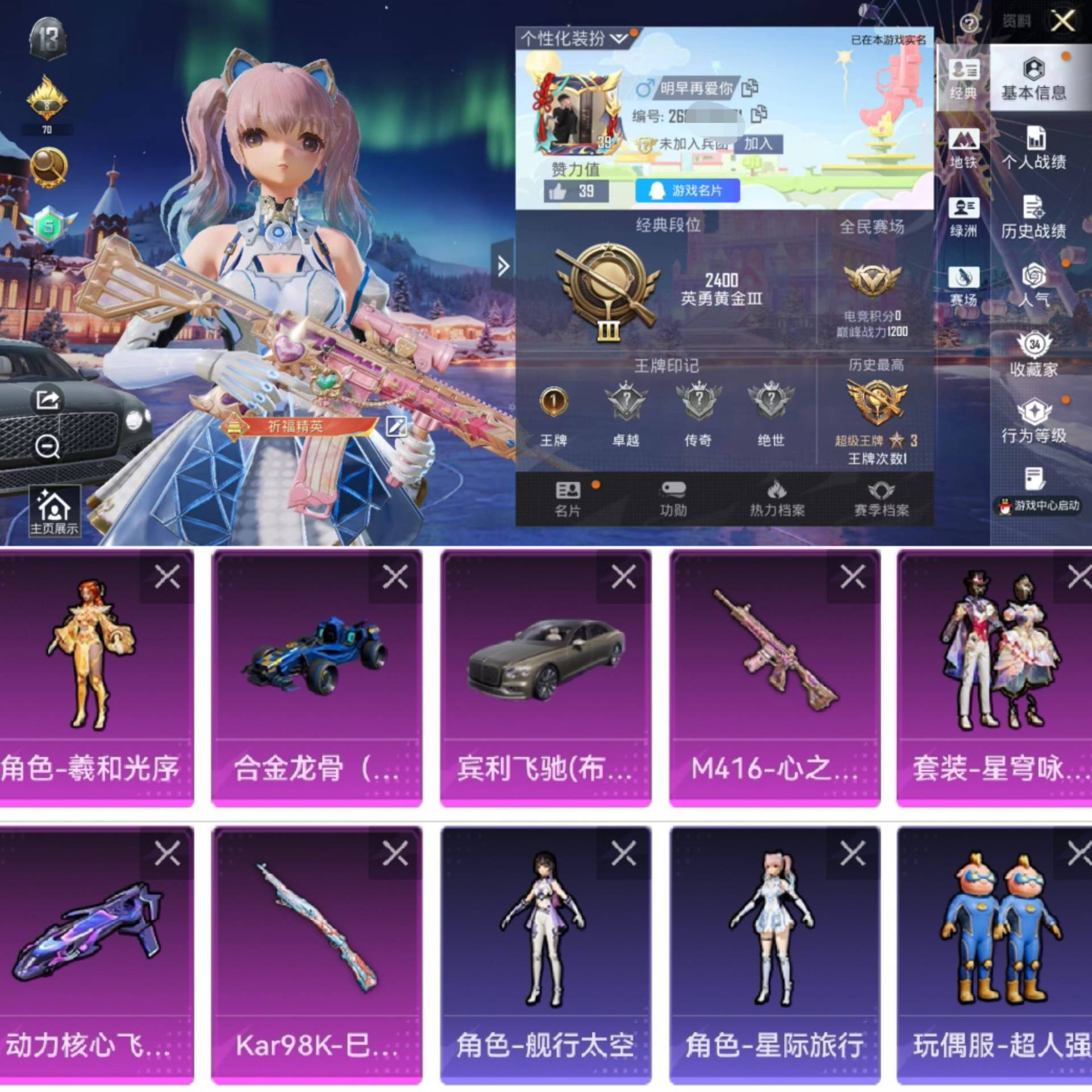[14693860]"h6522有二次 苹果q-段位黄金 1印记38套装59呛皮 【2载具】 宾利飞驰布罗德盖棕双色 合金龙骨蓝 【2特效呛】 m416-心之恋雨 7级 kar98k-巳巳如意 5级 【2粉装】 角色-羲和光序 星穹咏叹调 【热门】 角色-蝶吟花词 角色-星际旅行 角色-航行太空 角色-湖雨初晴 【1飞行器】 动力核心飞行器