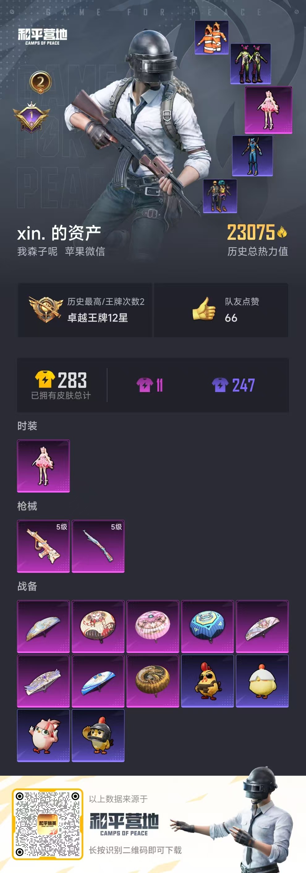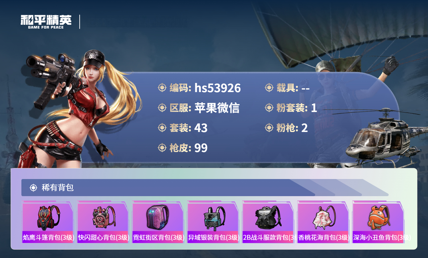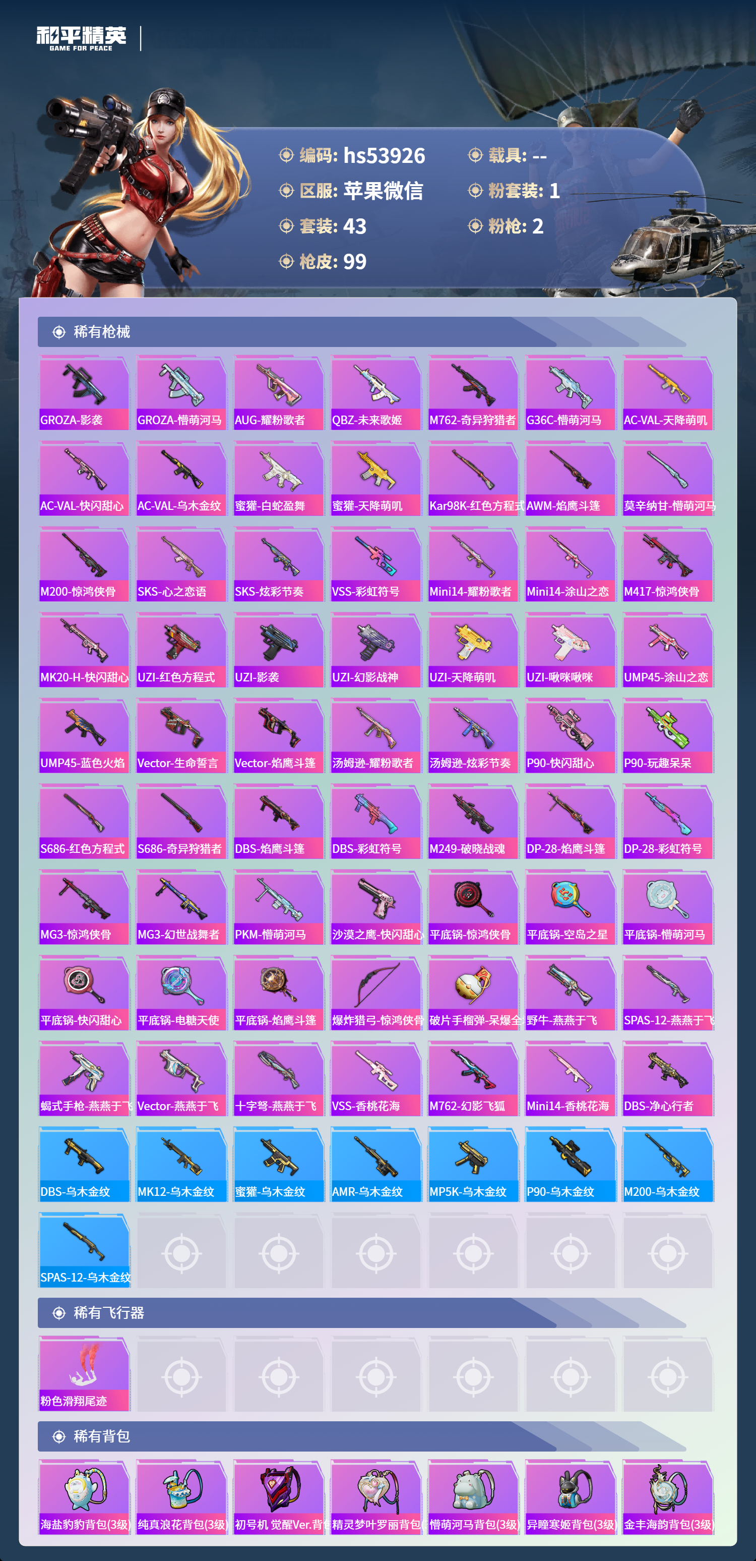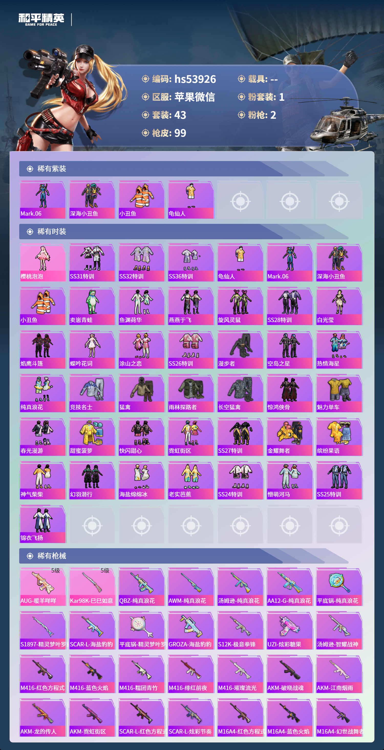 hs53926 苹果微信-2王牌印记-1粉装-2特效呛-23075热力值-43套装-99呛皮-1卓越印记【1粉装】角色-樱桃泡泡【2特效呛】kar98k-巳巳如意/5级aug-暖羊咩咩/5级【4稀有紫装】mark.06深海小丑鱼小丑鱼龟仙人【43稀有时装】ss31特训ss32特训ss36特训龟仙人mark.06深海小丑鱼小丑鱼樱桃泡泡卖崽青蛙鱼渊荷华燕燕于飞旋